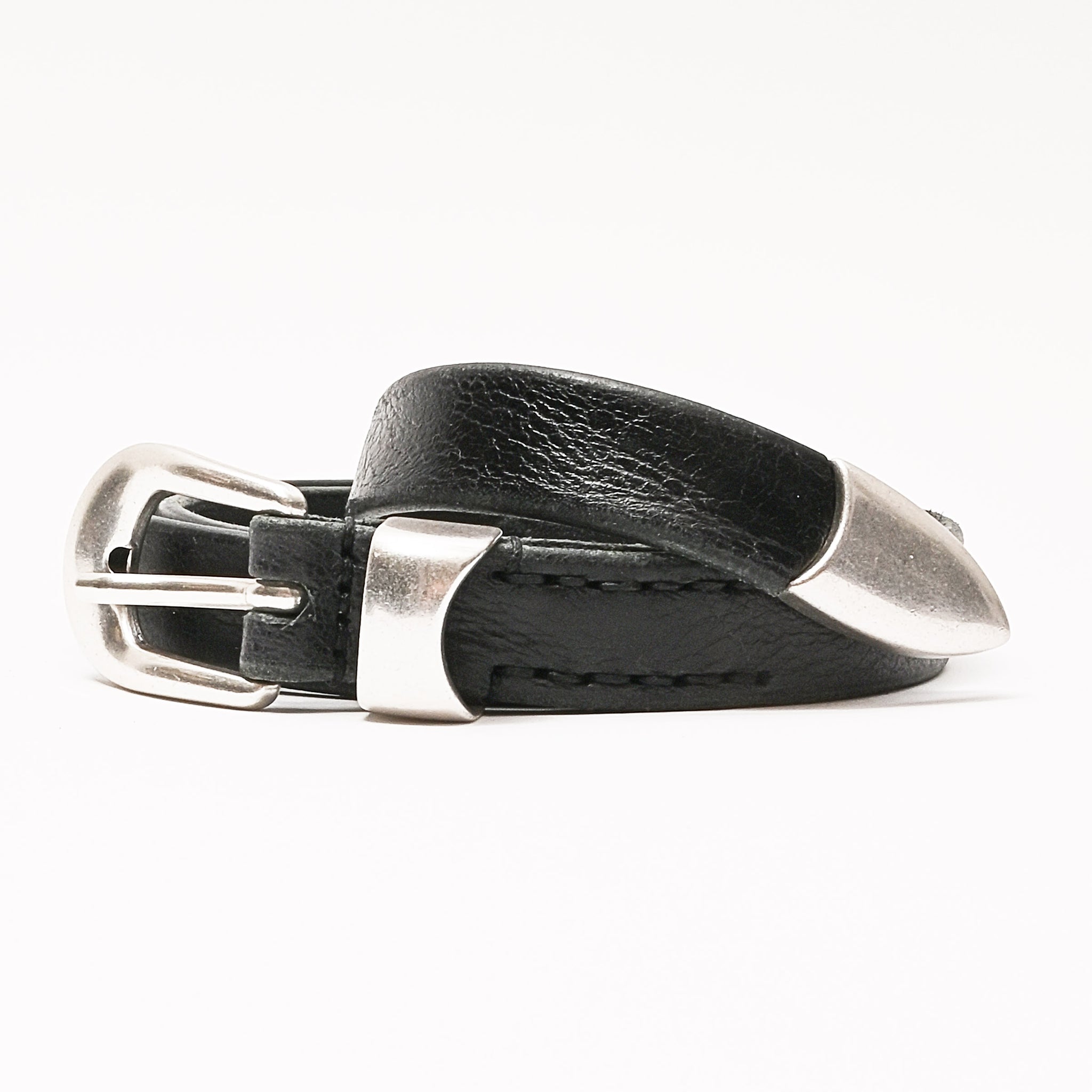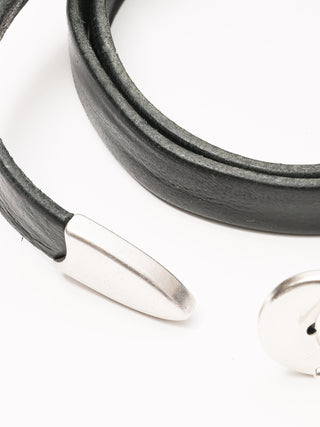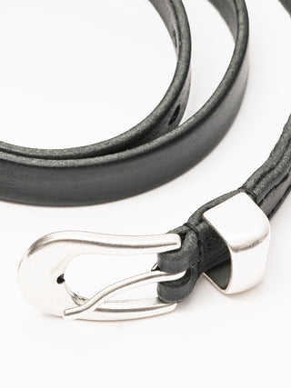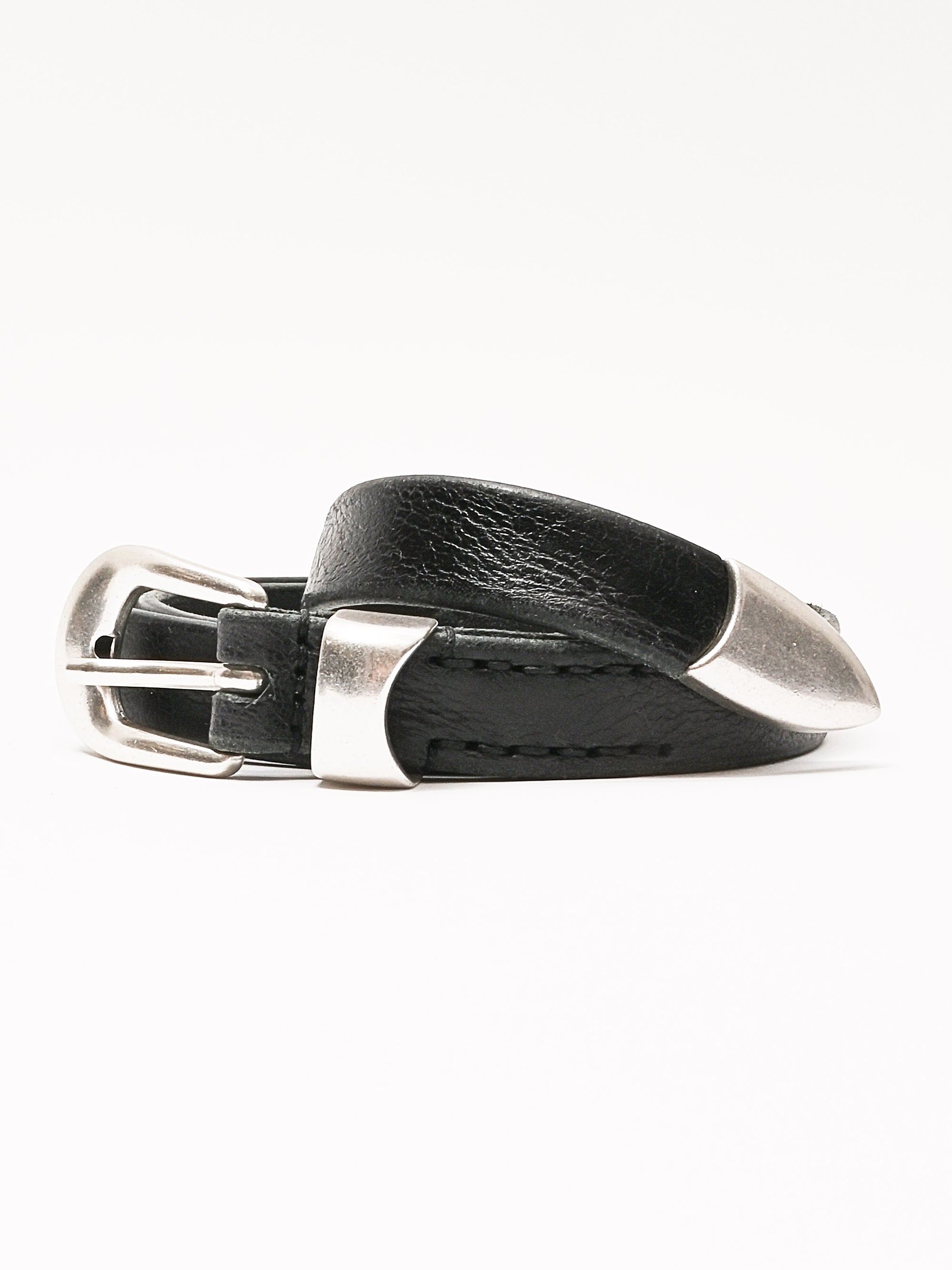 Our Legacy Belt 2 cm in Black Leather. Produced in an Italian calf leather, the belt is 2 cm wide and features a metal pin buckle closure, a metal keeper, a metal tip and a dust bag cover. The belt has a width of 2 cm and measures 80 cm, 90 cm or 100 cm from the end to the middle belt hole - including the buckle. This product is crafted from carefully sourced leather. As a natural material, leather carries subtle traces of the animal's life. These natural imperfections bring a unique character to each product, expressing an original and authentic look. The product shall be shaped by its wearer and naturally distress over time to complete the design process.