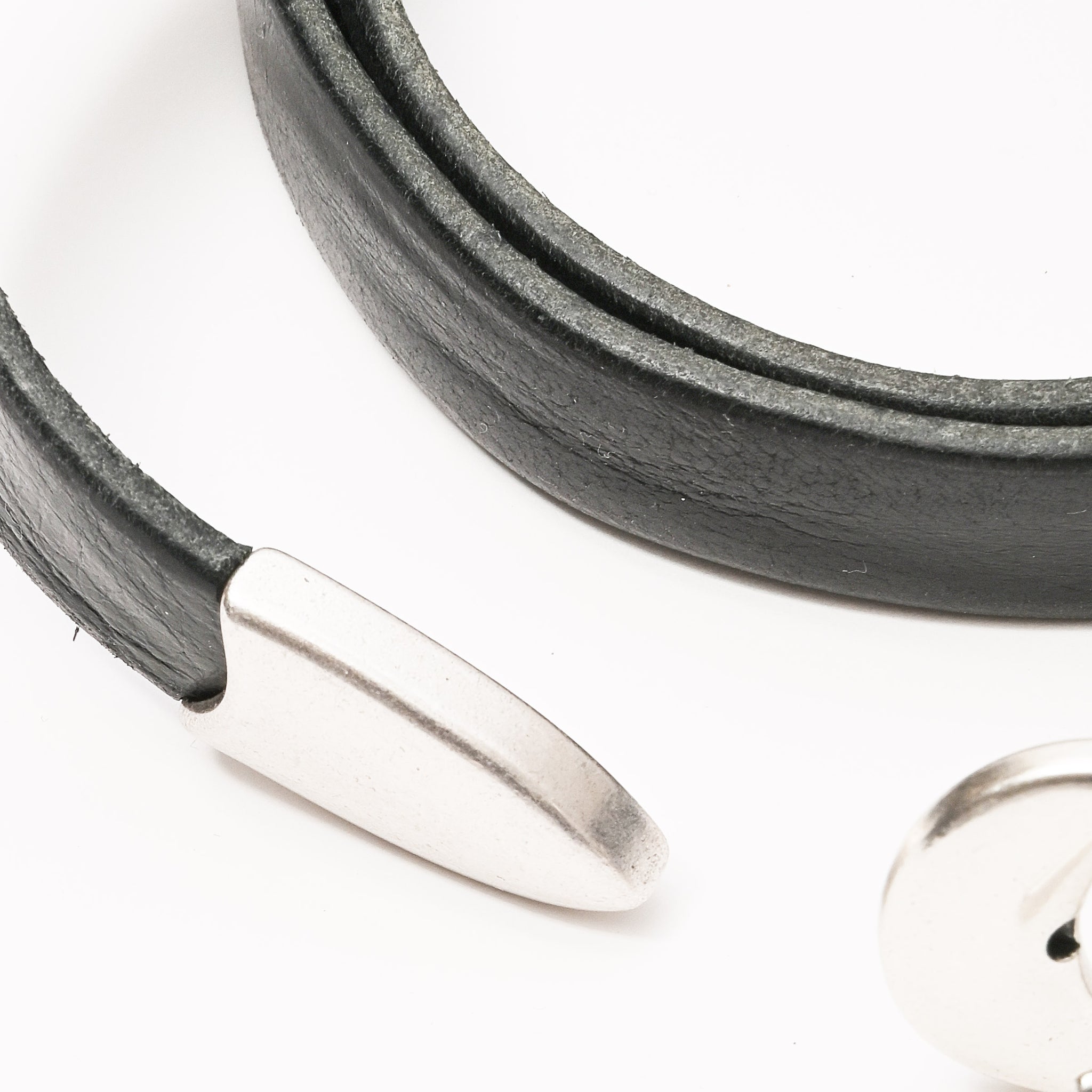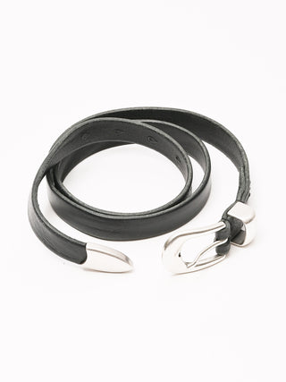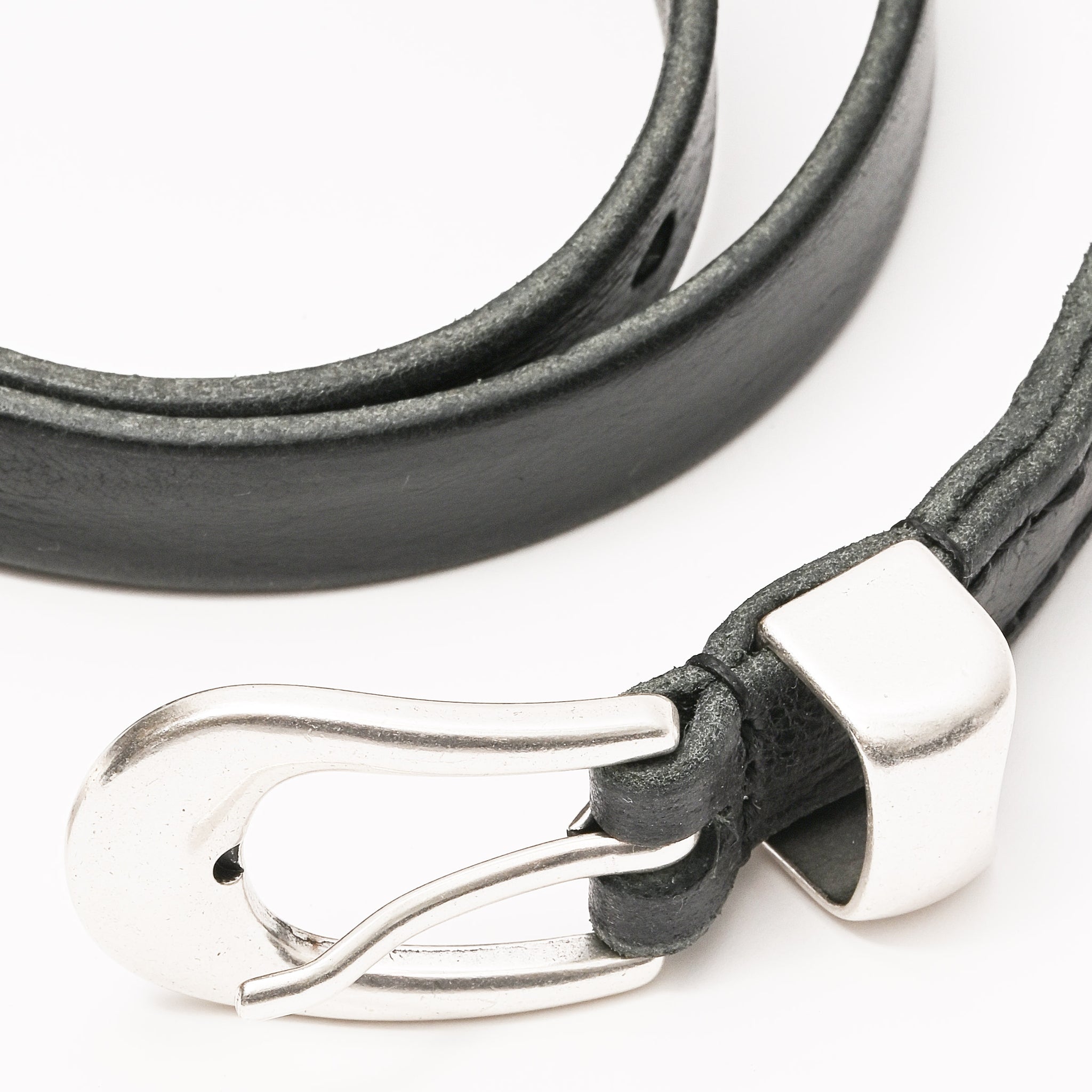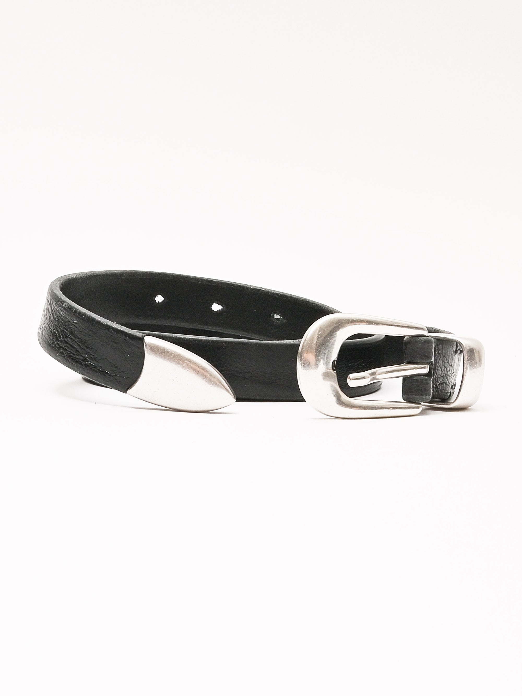 Our Legacy Belt 2 cm in Black Leather. Produced in an Italian calf leather, the belt is 2 cm wide and features a metal pin buckle closure, a metal keeper, a metal tip and a dust bag cover. The belt has a width of 2 cm and measures 80 cm, 90 cm or 100 cm from the end to the middle belt hole - including the buckle. This product is crafted from carefully sourced leather. As a natural material, leather carries subtle traces of the animal's life. These natural imperfections bring a unique character to each product, expressing an original and authentic look. The product shall be shaped by its wearer and naturally distress over time to complete the design process.