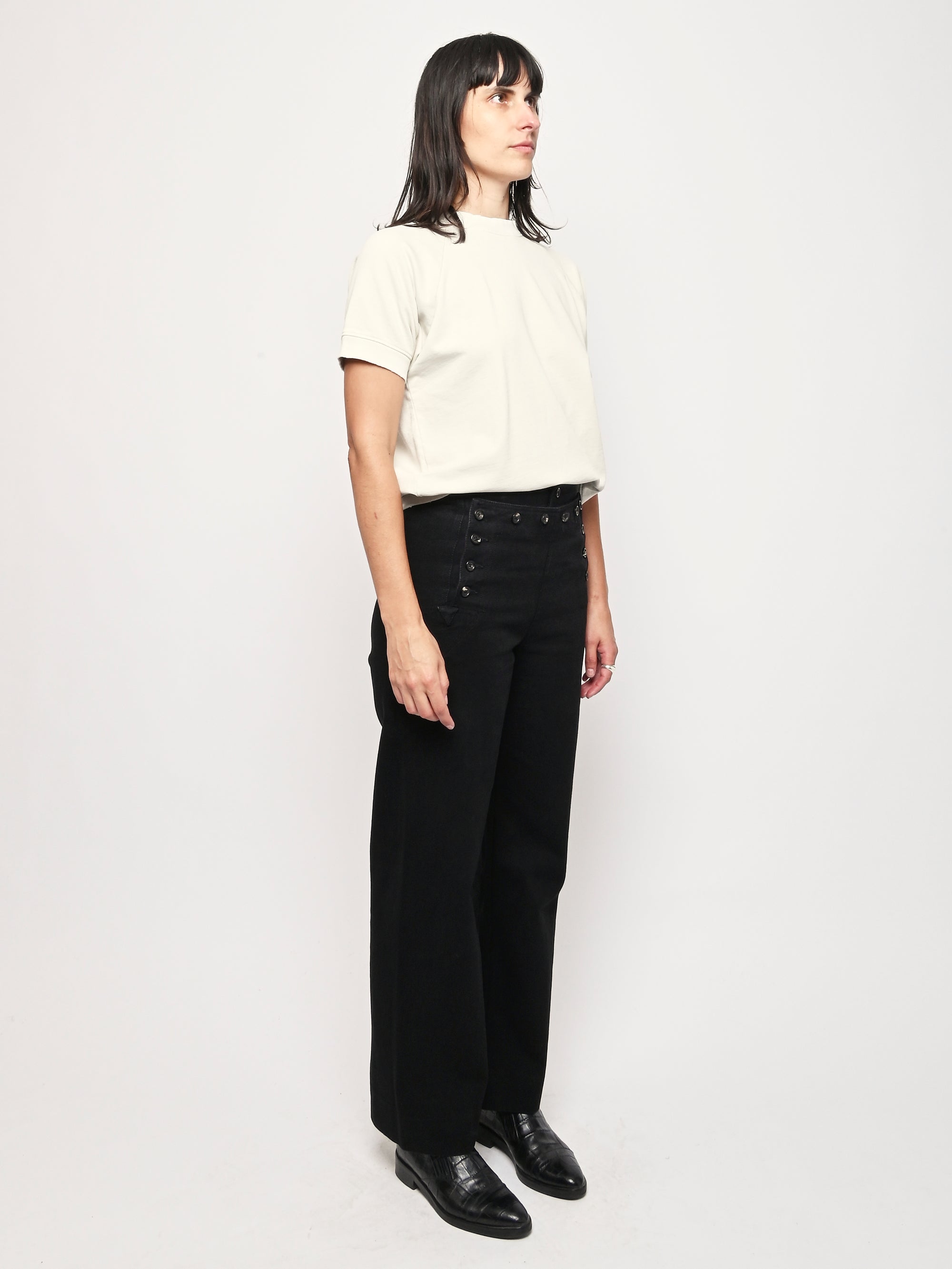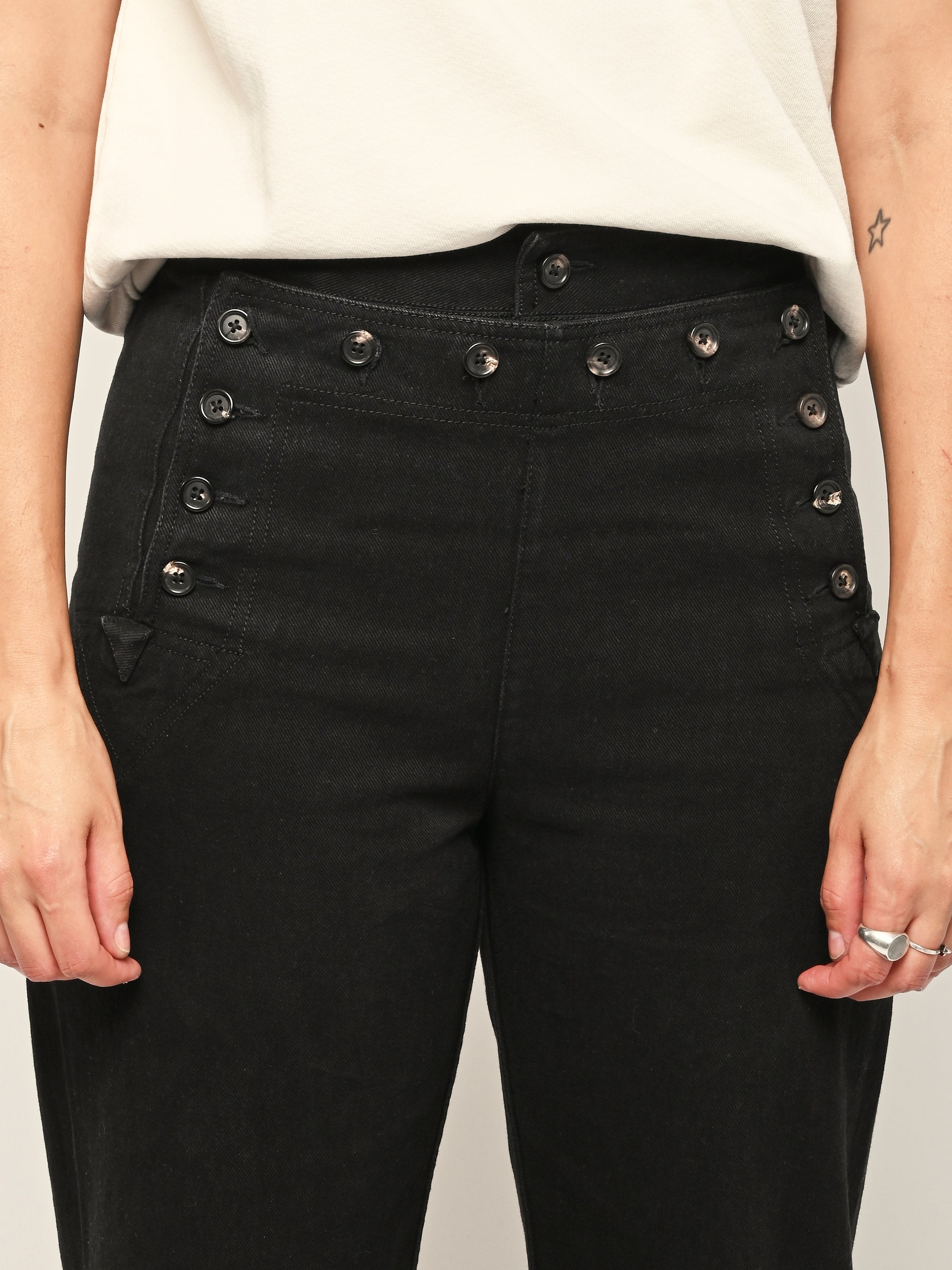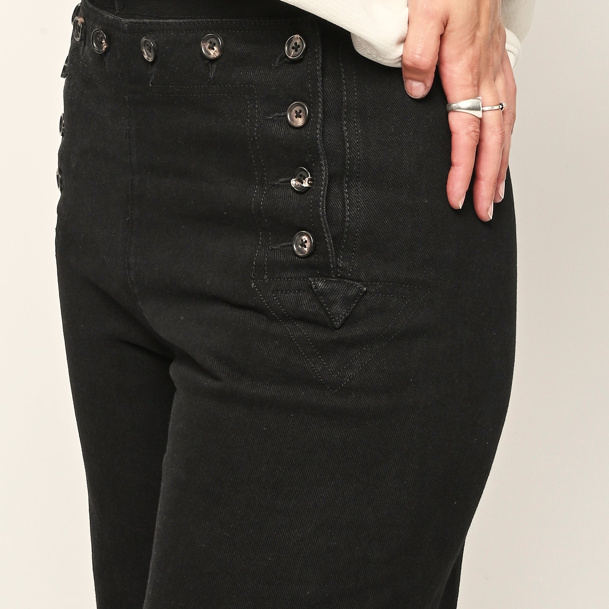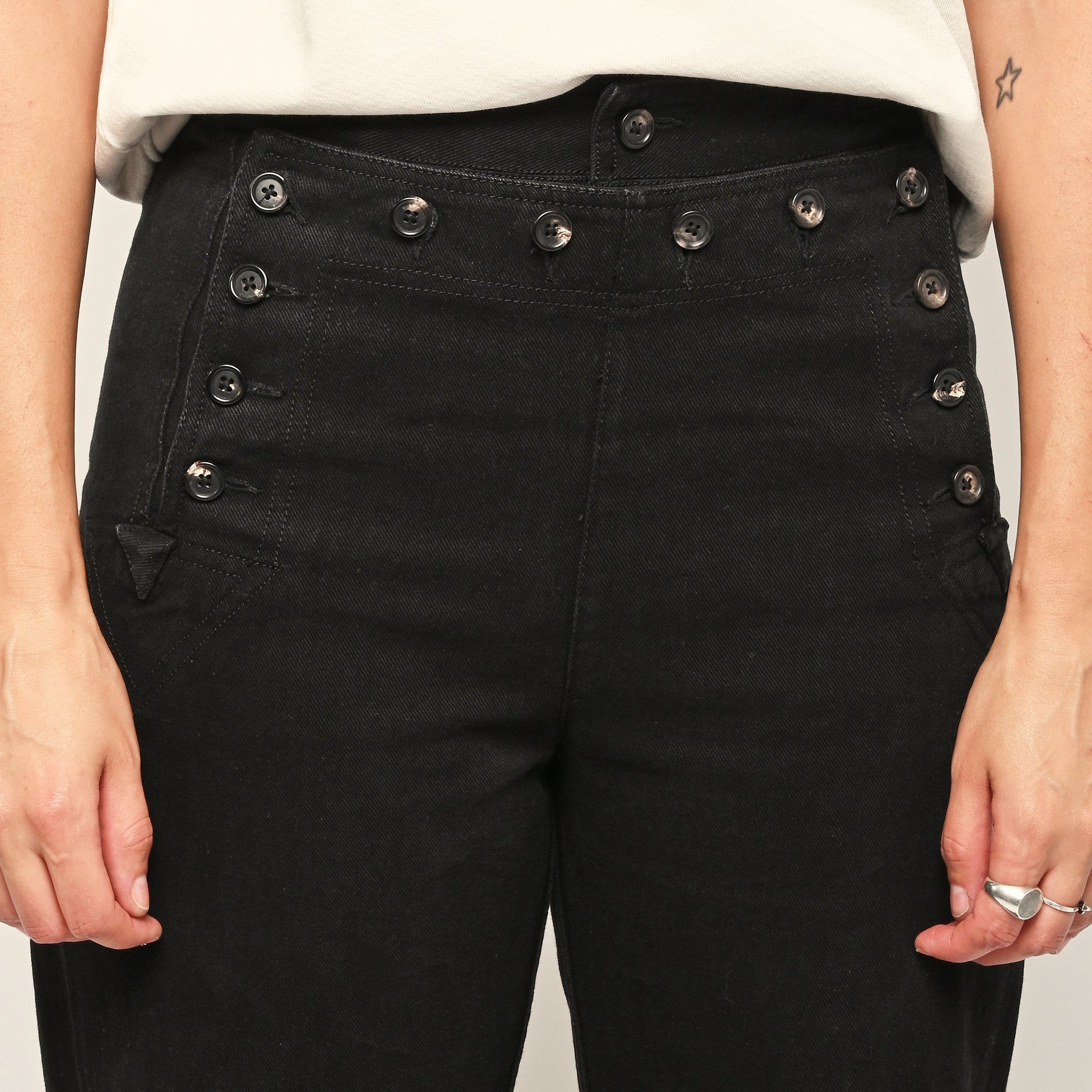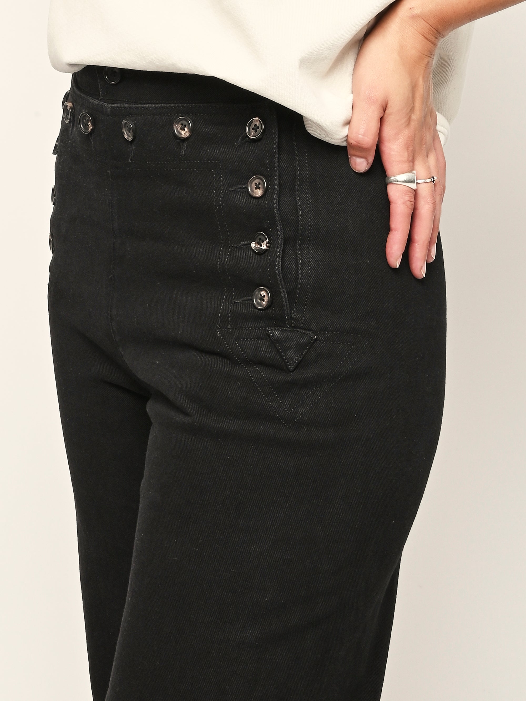 These trousers have a traditional sailor placket. They are cut from midweight black denim and feature tonal zig-zag embroidery.