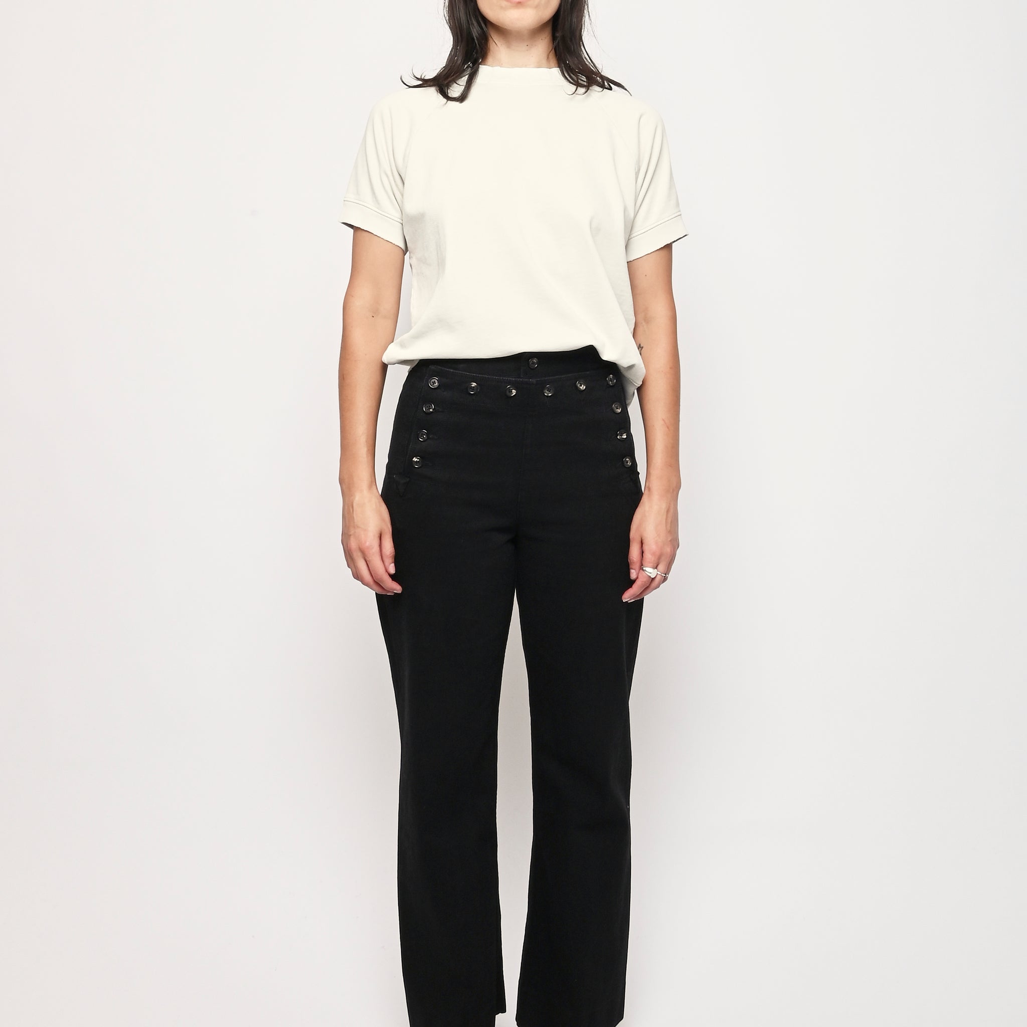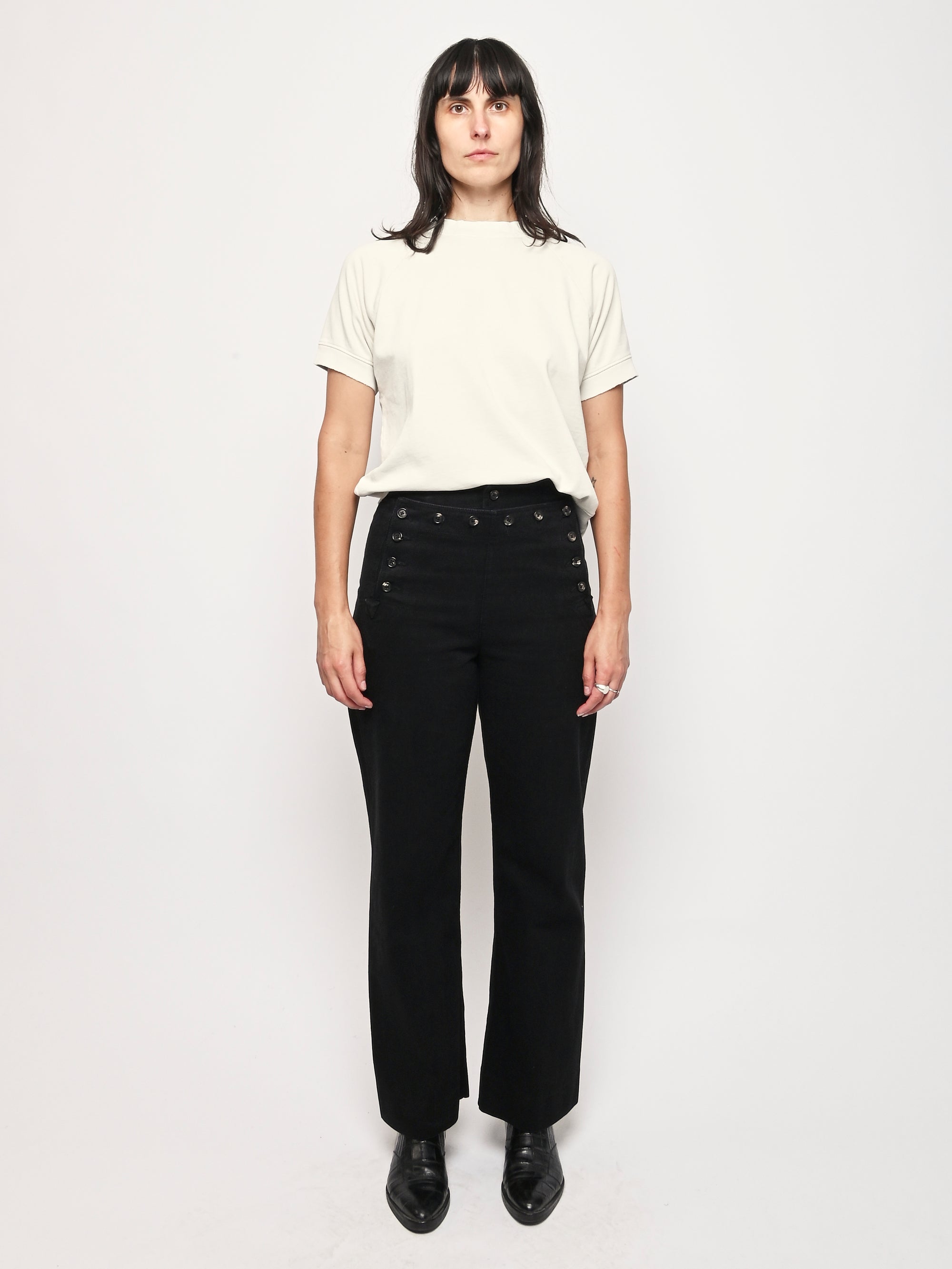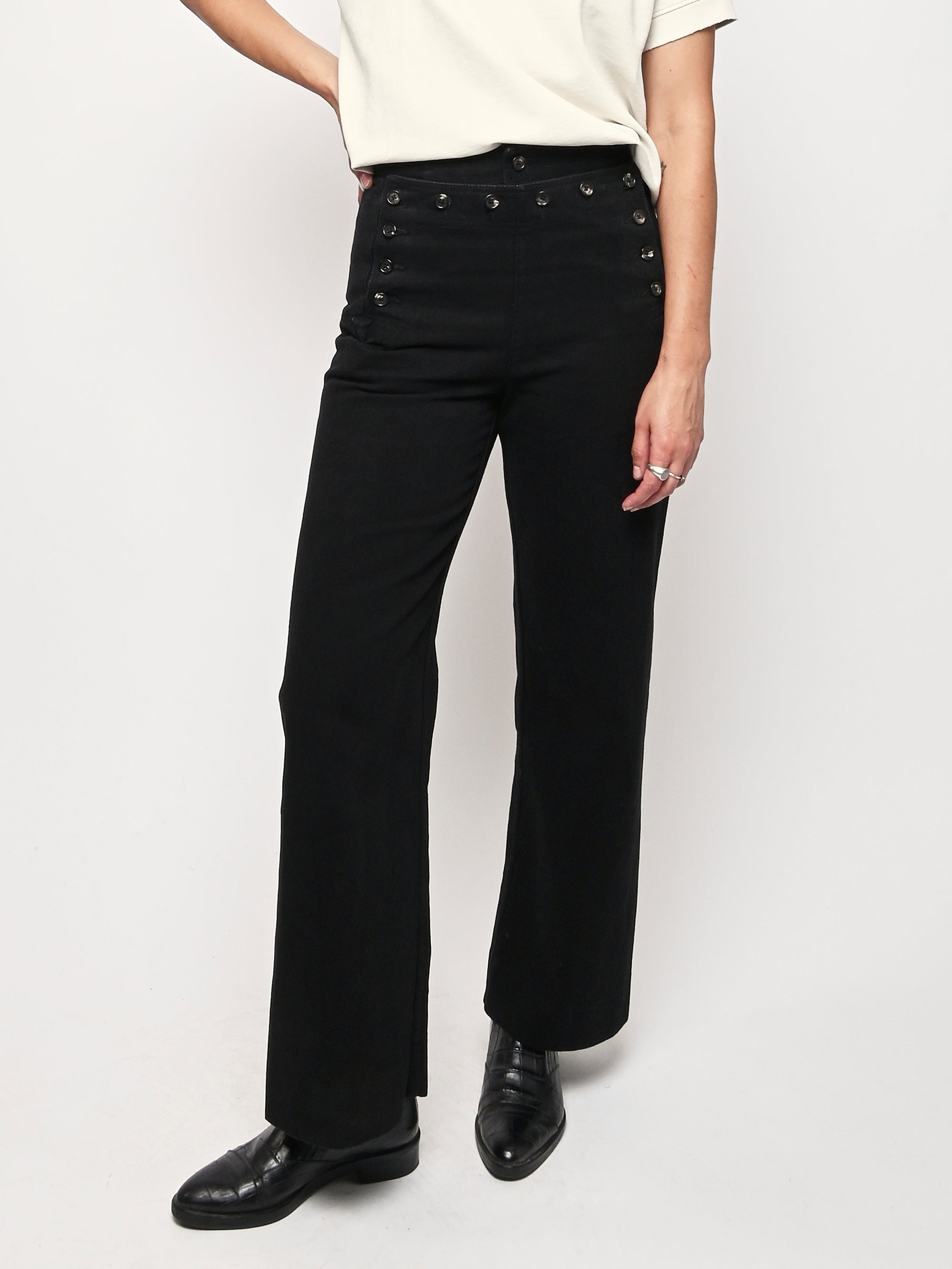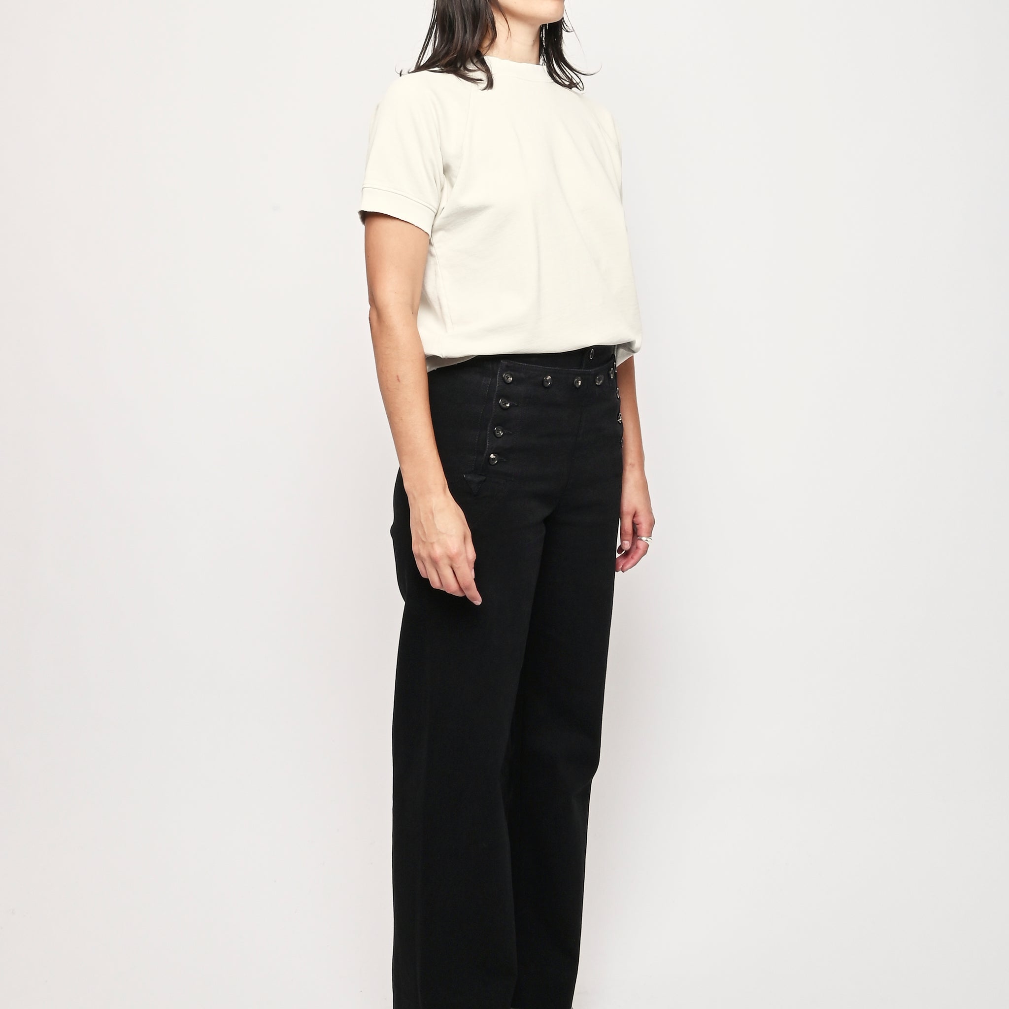 These trousers have a traditional sailor placket. They are cut from midweight black denim and feature tonal zig-zag embroidery.