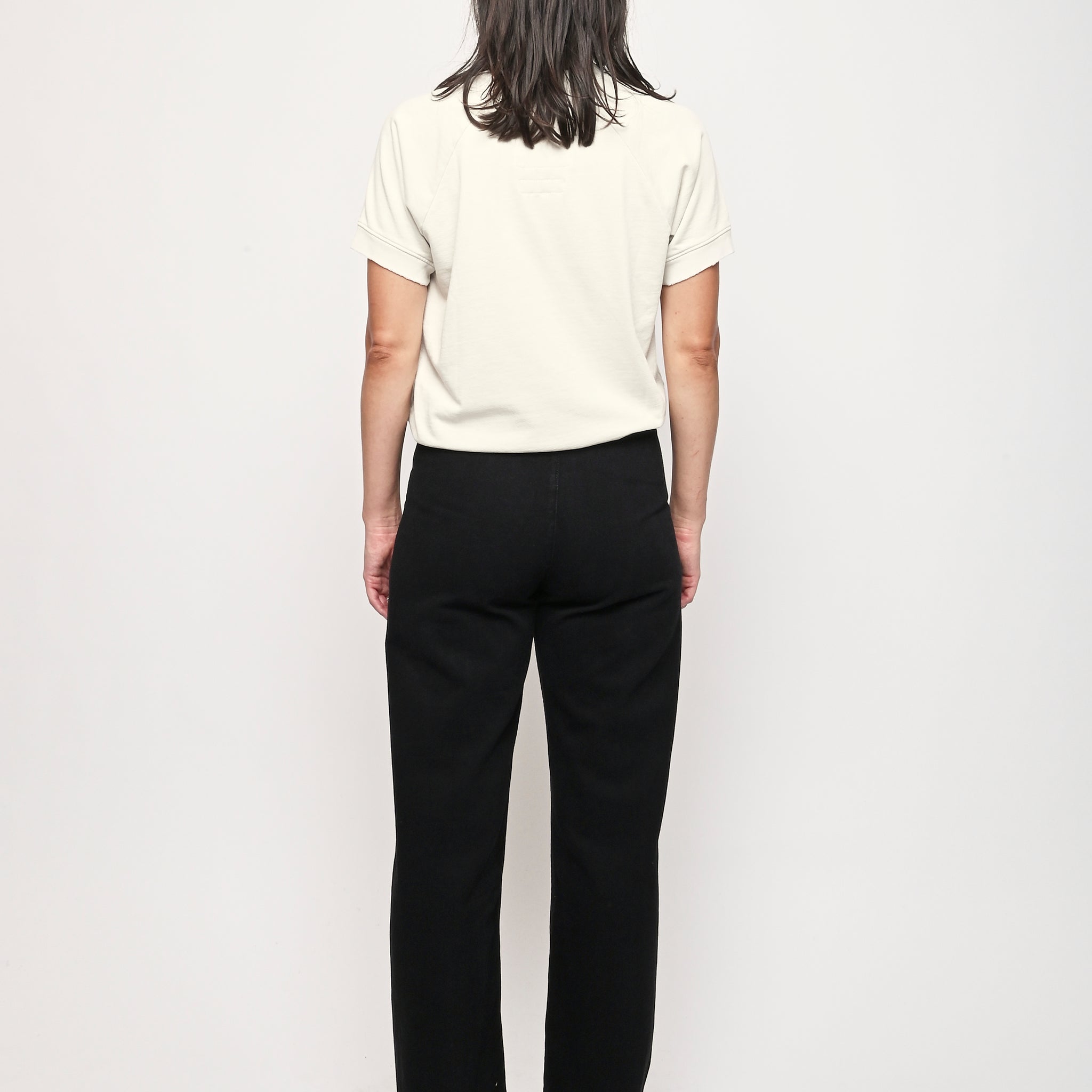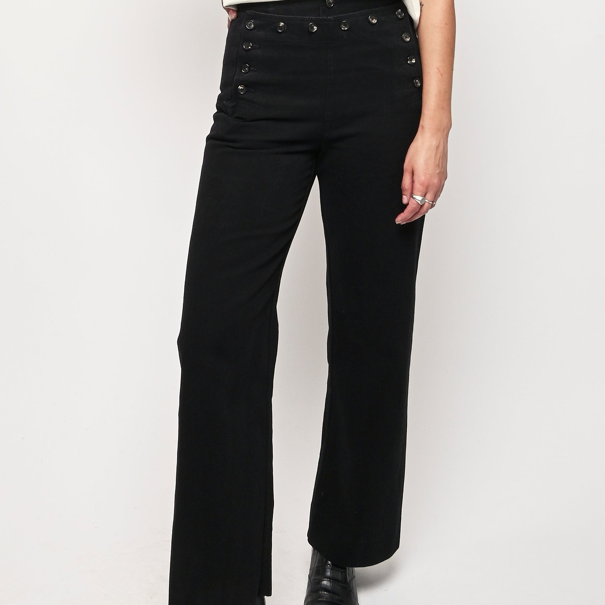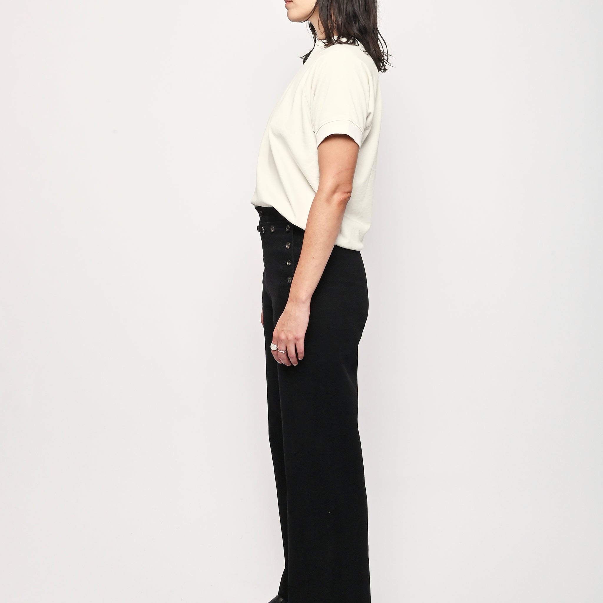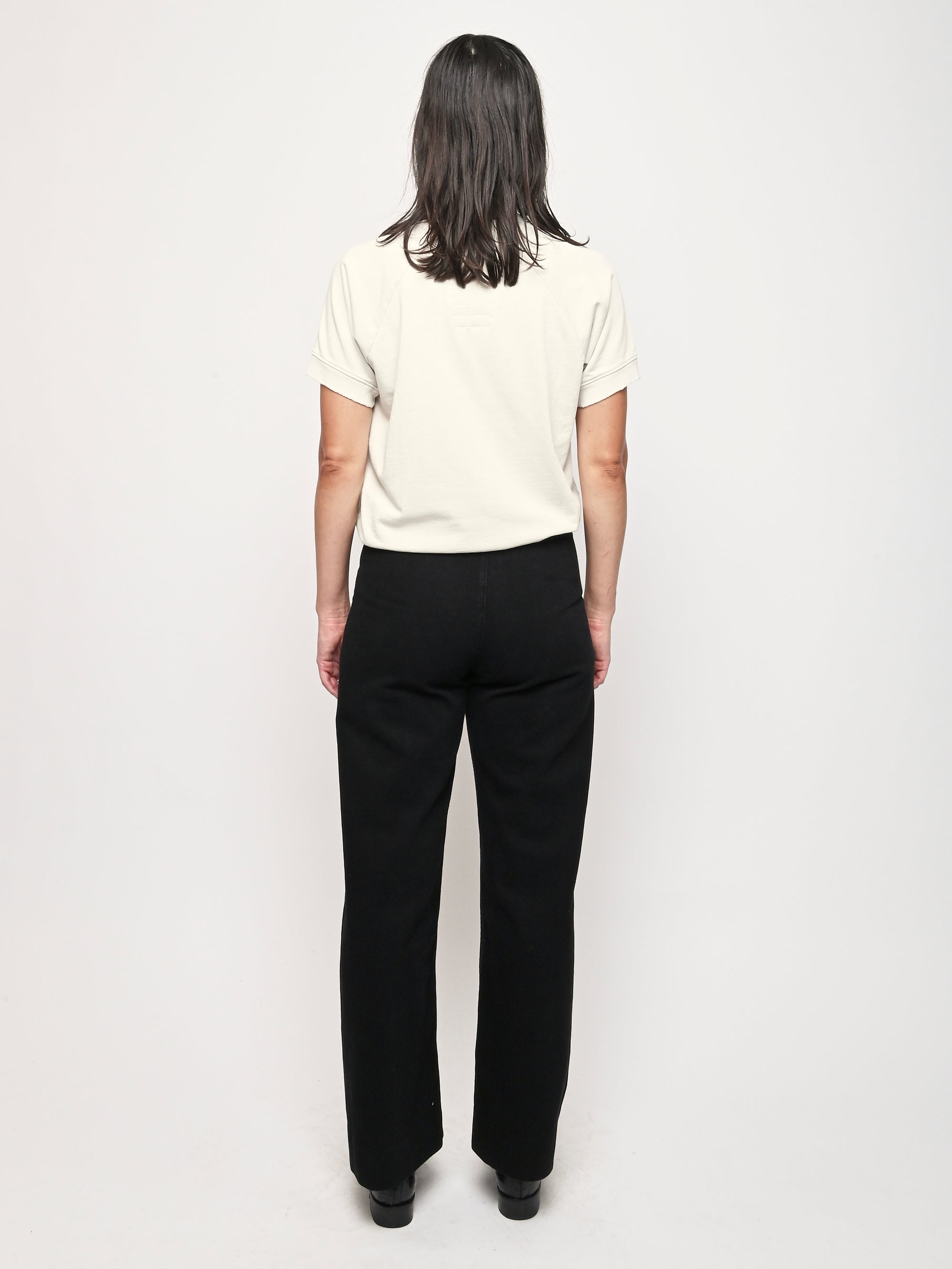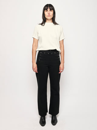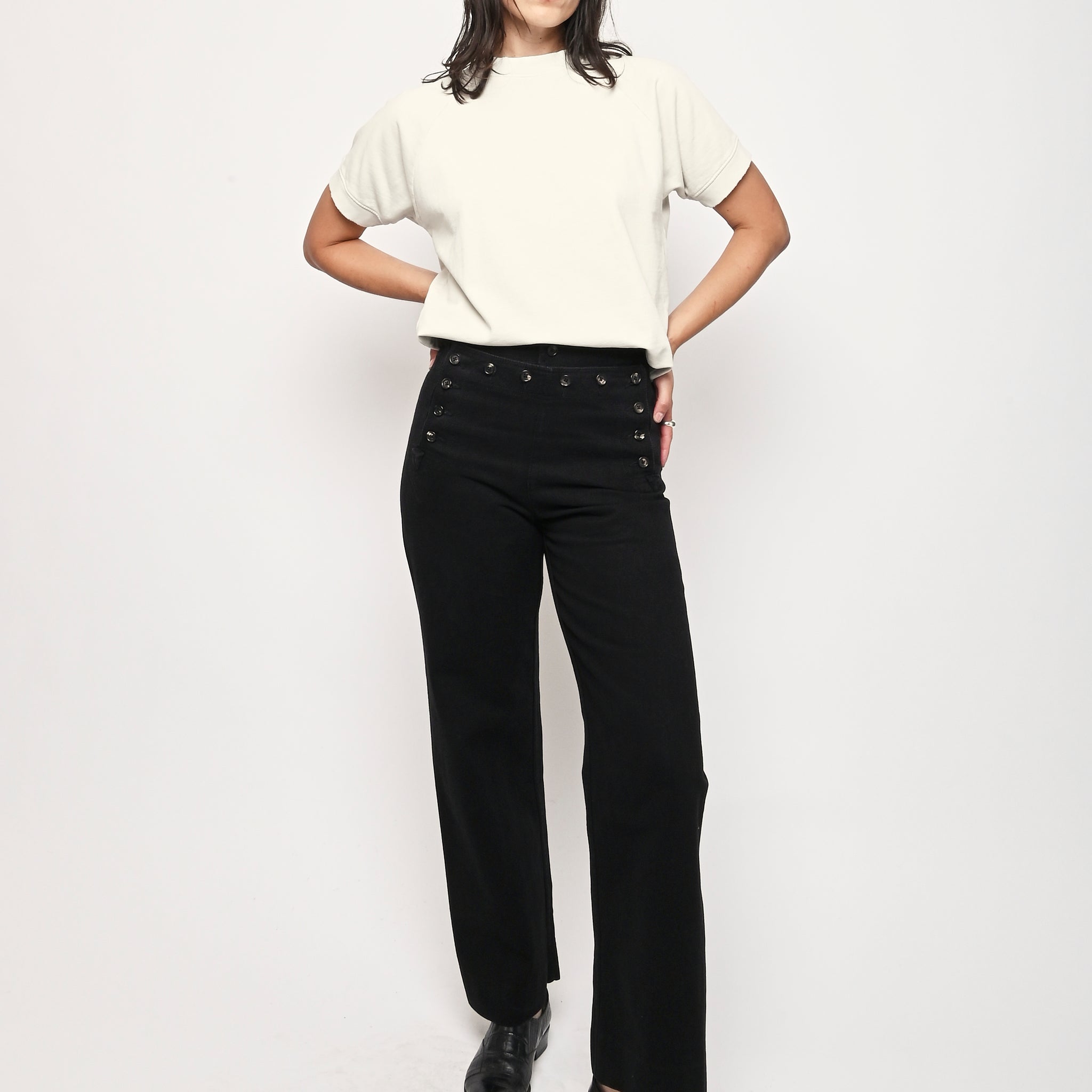 These trousers have a traditional sailor placket. They are cut from midweight black denim and feature tonal zig-zag embroidery.