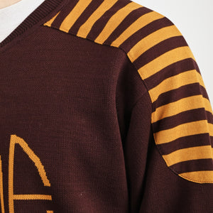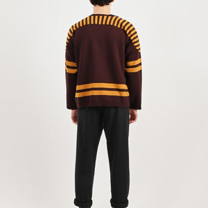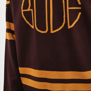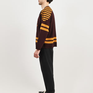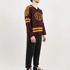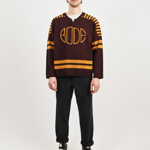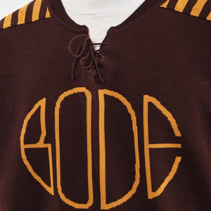 This sweater is inspired by a hockey jersey from the 1970s-1980s. Bode reproduced the striping and lace-up neckline for this style, which is knit with a jacquard Bode logo.