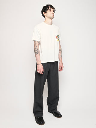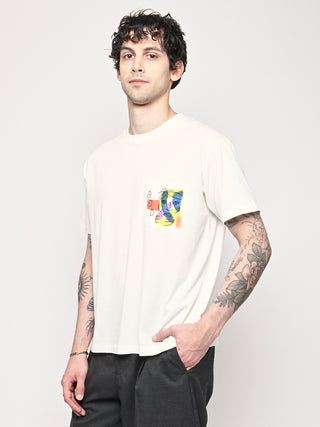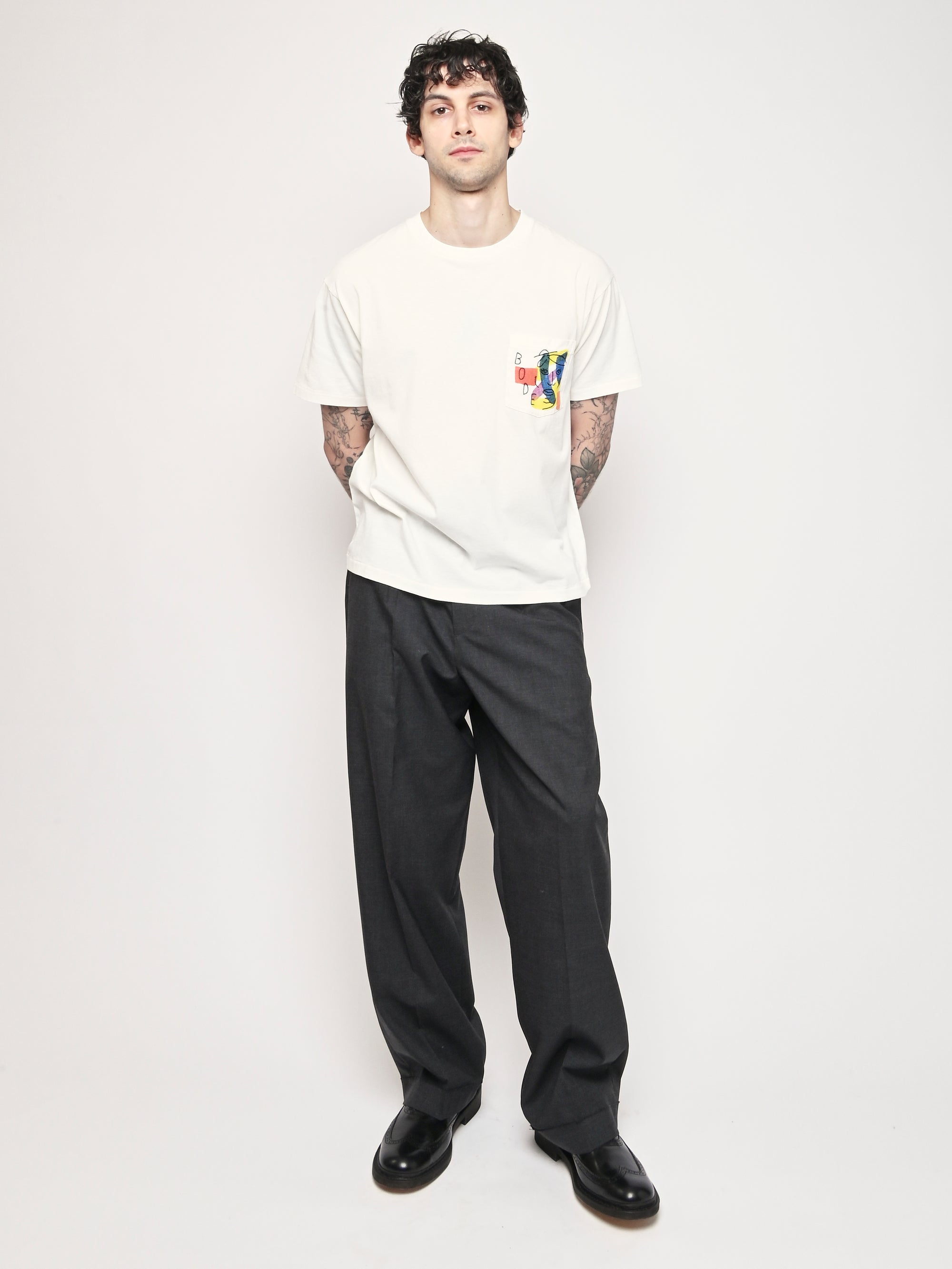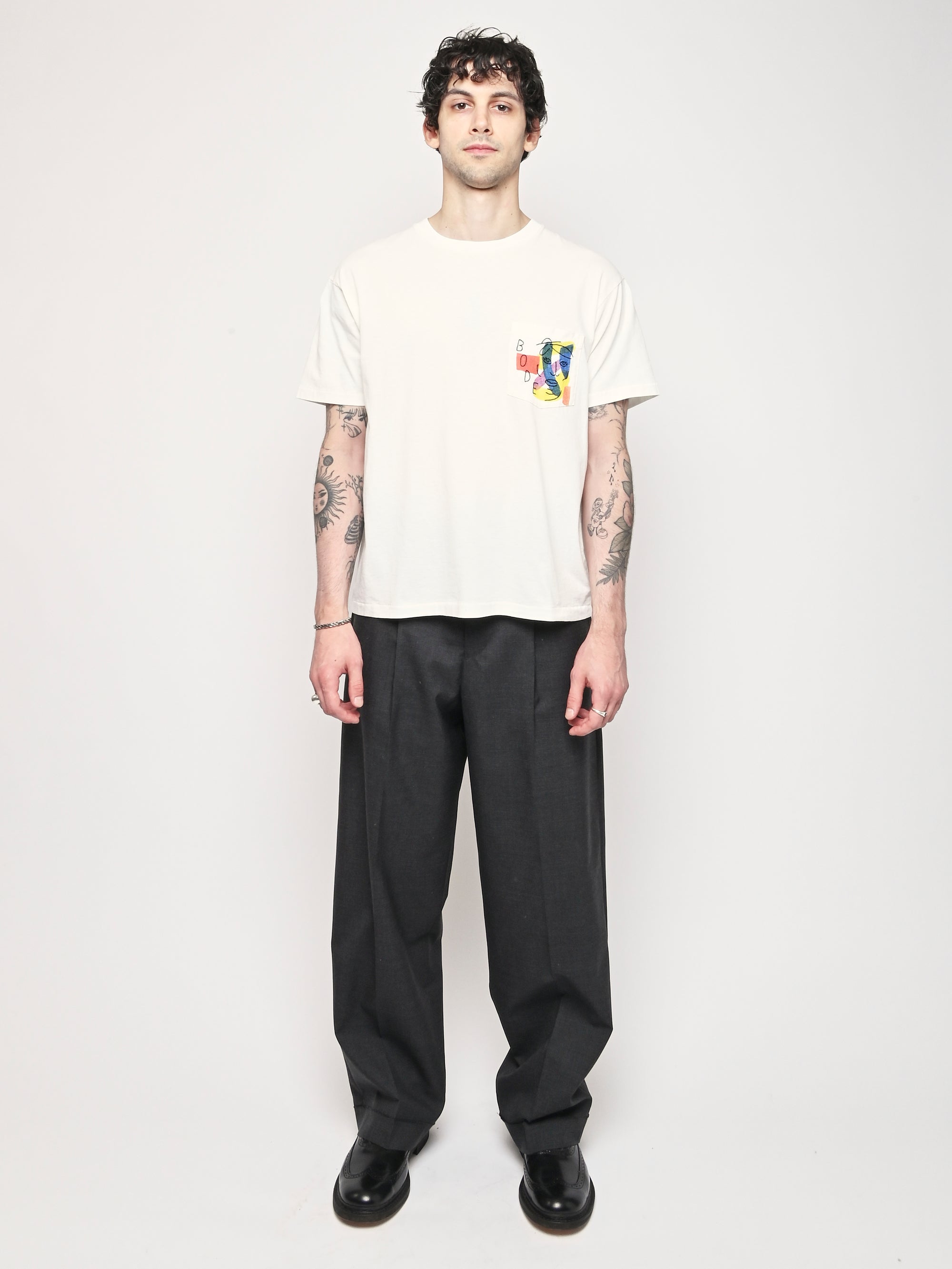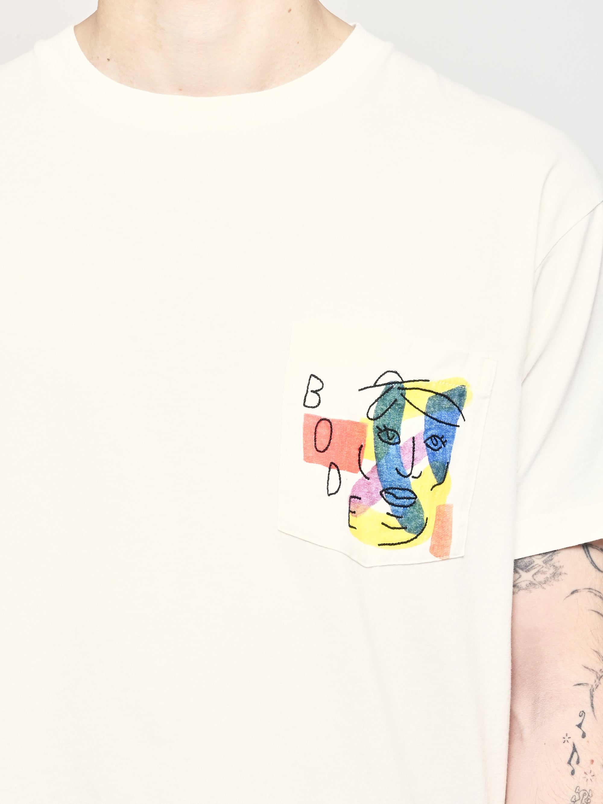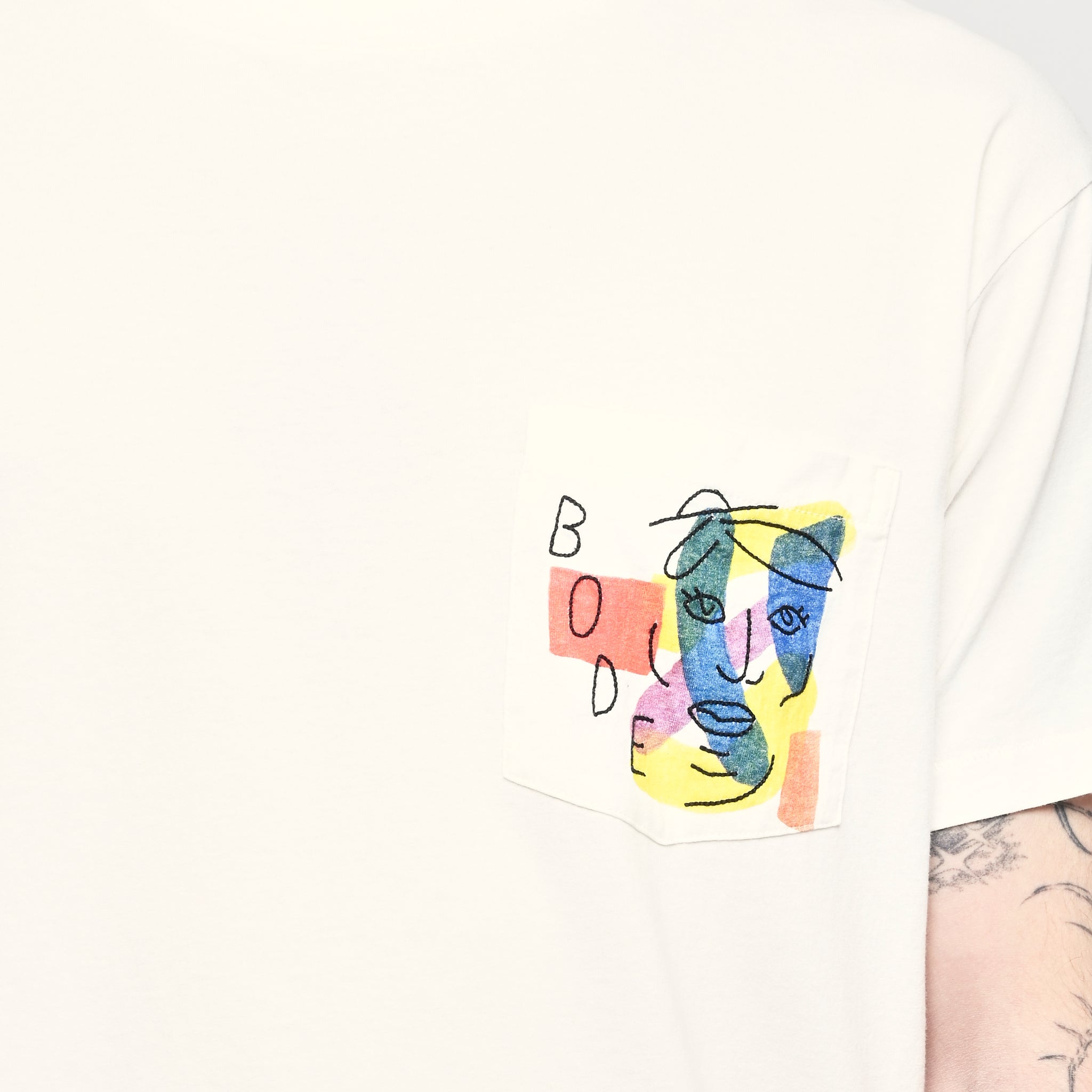Moose Charlap and his writing partner, Eddie Lawrence, shared an eye for Modernist art—Lawrence had studied painting under Fernand Léger after the war, and both men filled their homes with art purchased from young artists in Paris. This Bode pocket tee, with its abstract colorblocking and illustrated face, is an homage to their art collections.