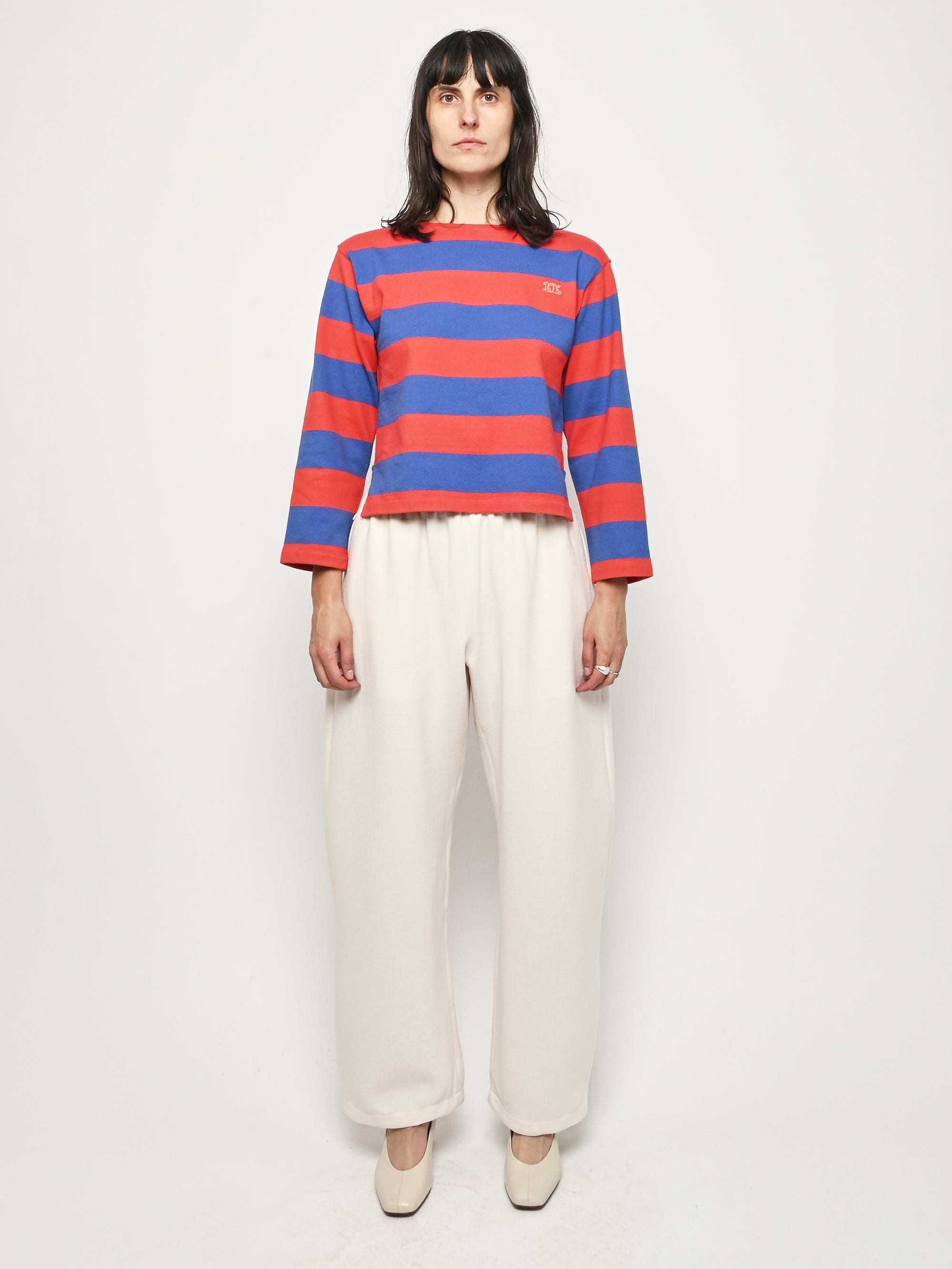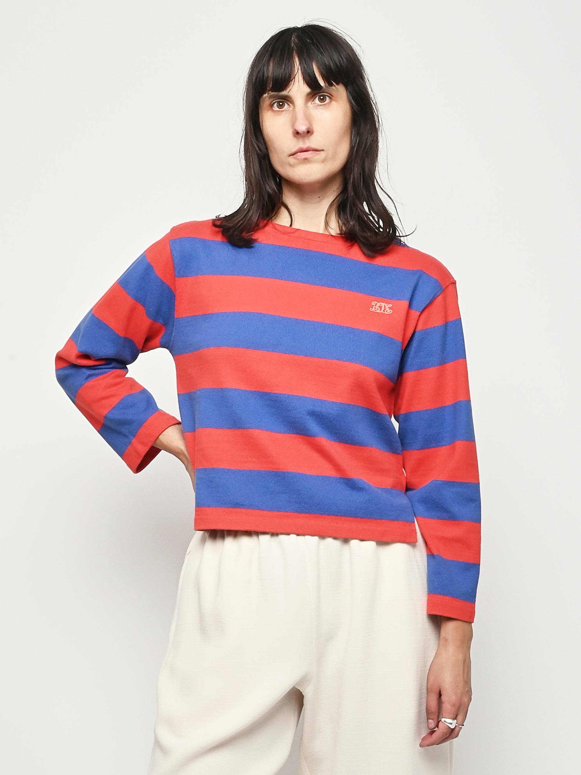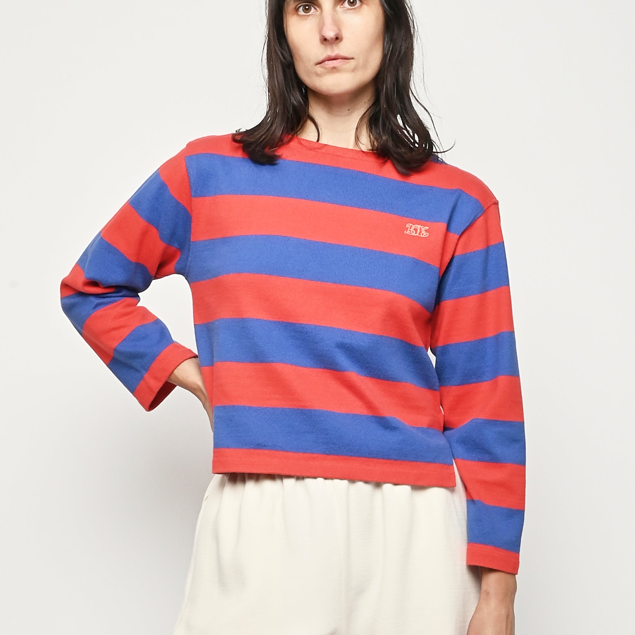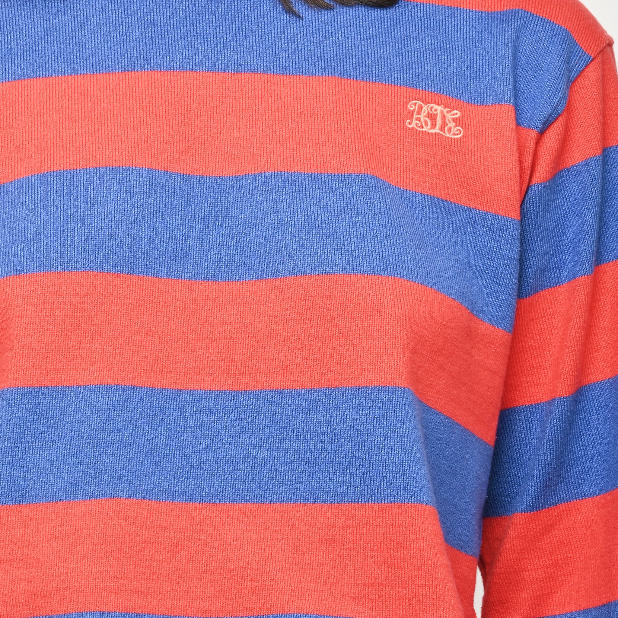 This tee is knit with wide red and blue stripes, inspired by an antique swimming costume from the 1930s. It is embroidered with a Bode monogram.