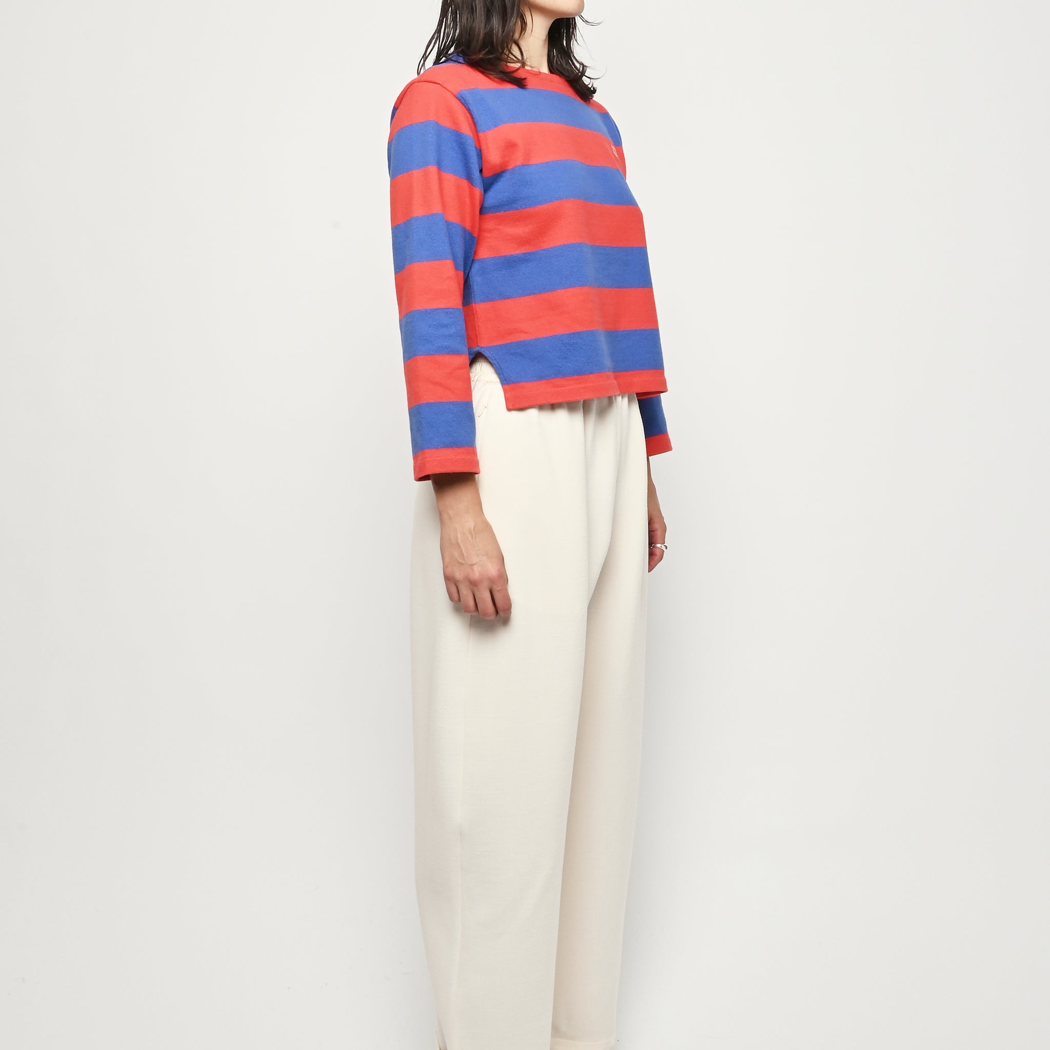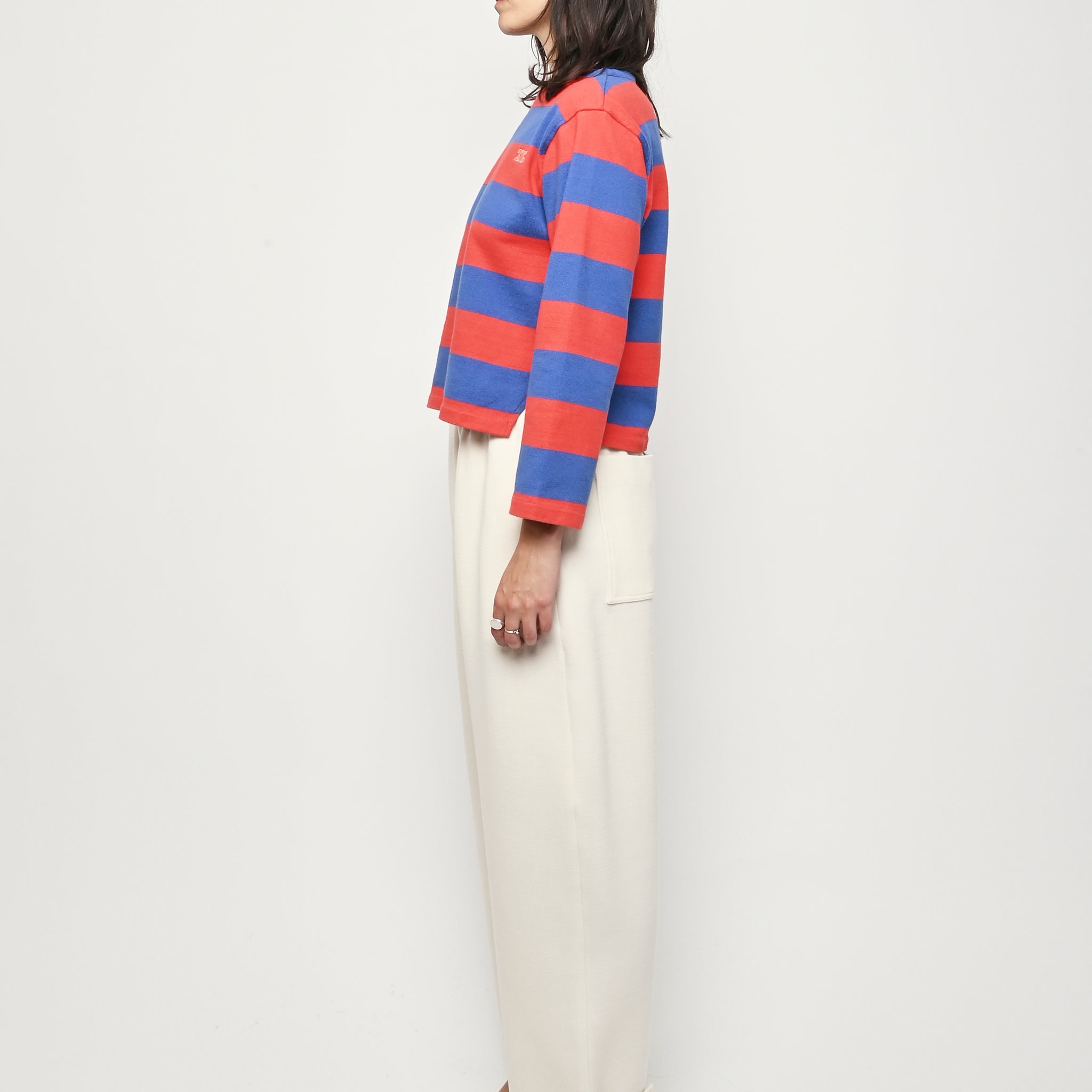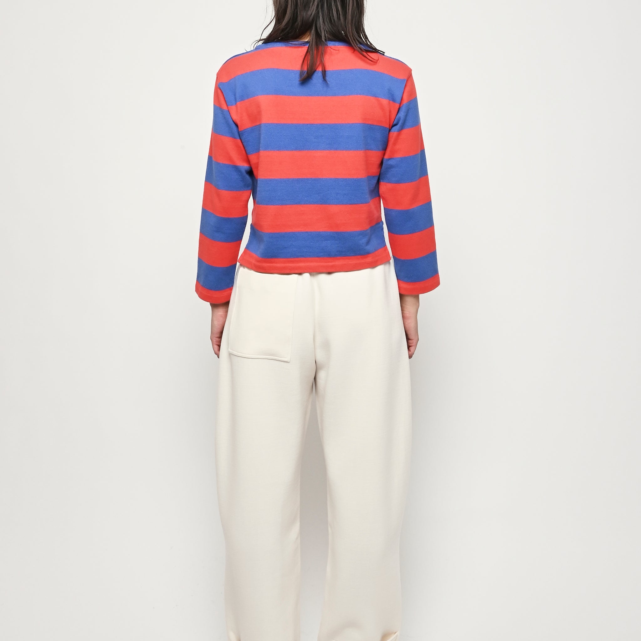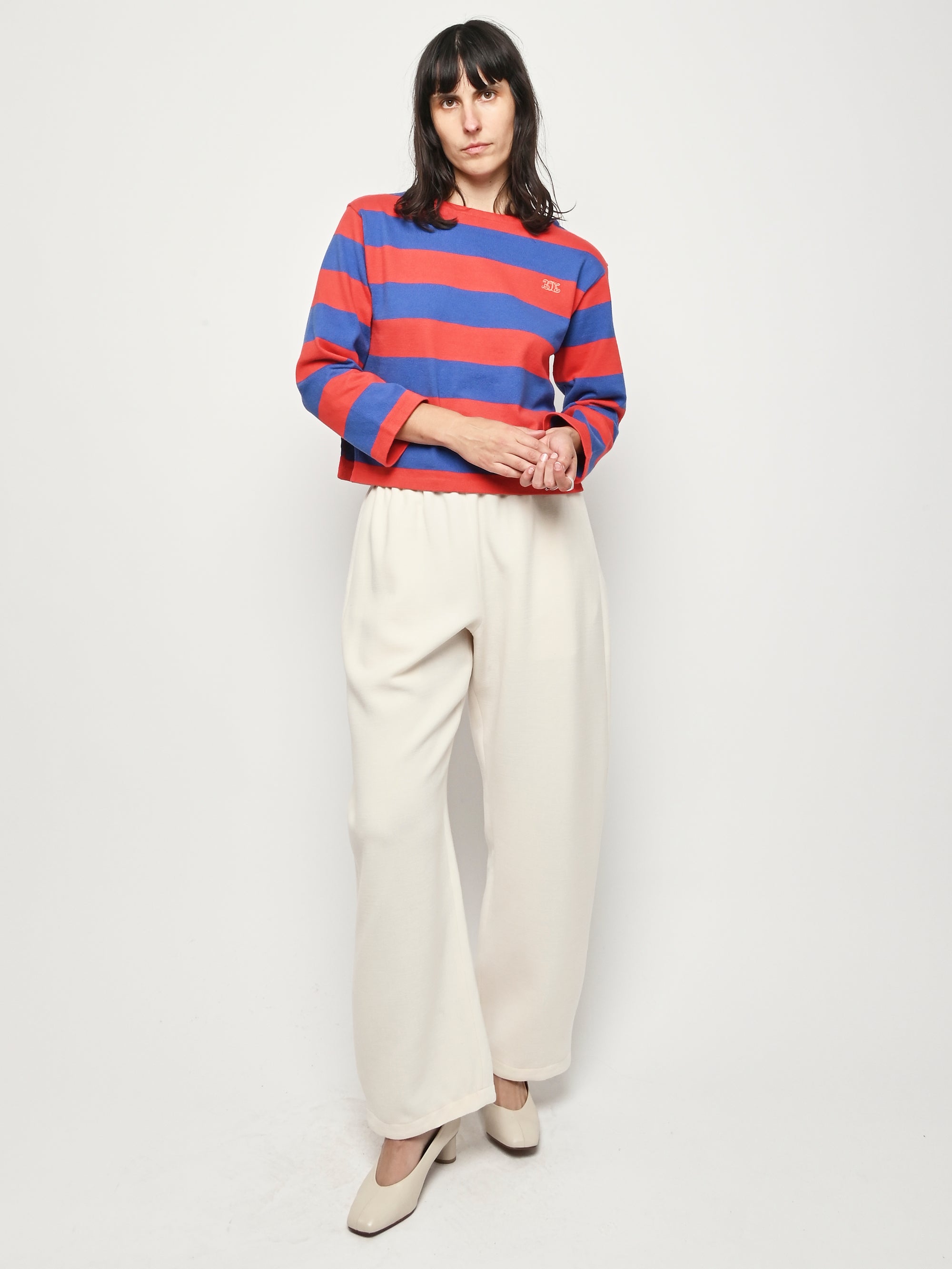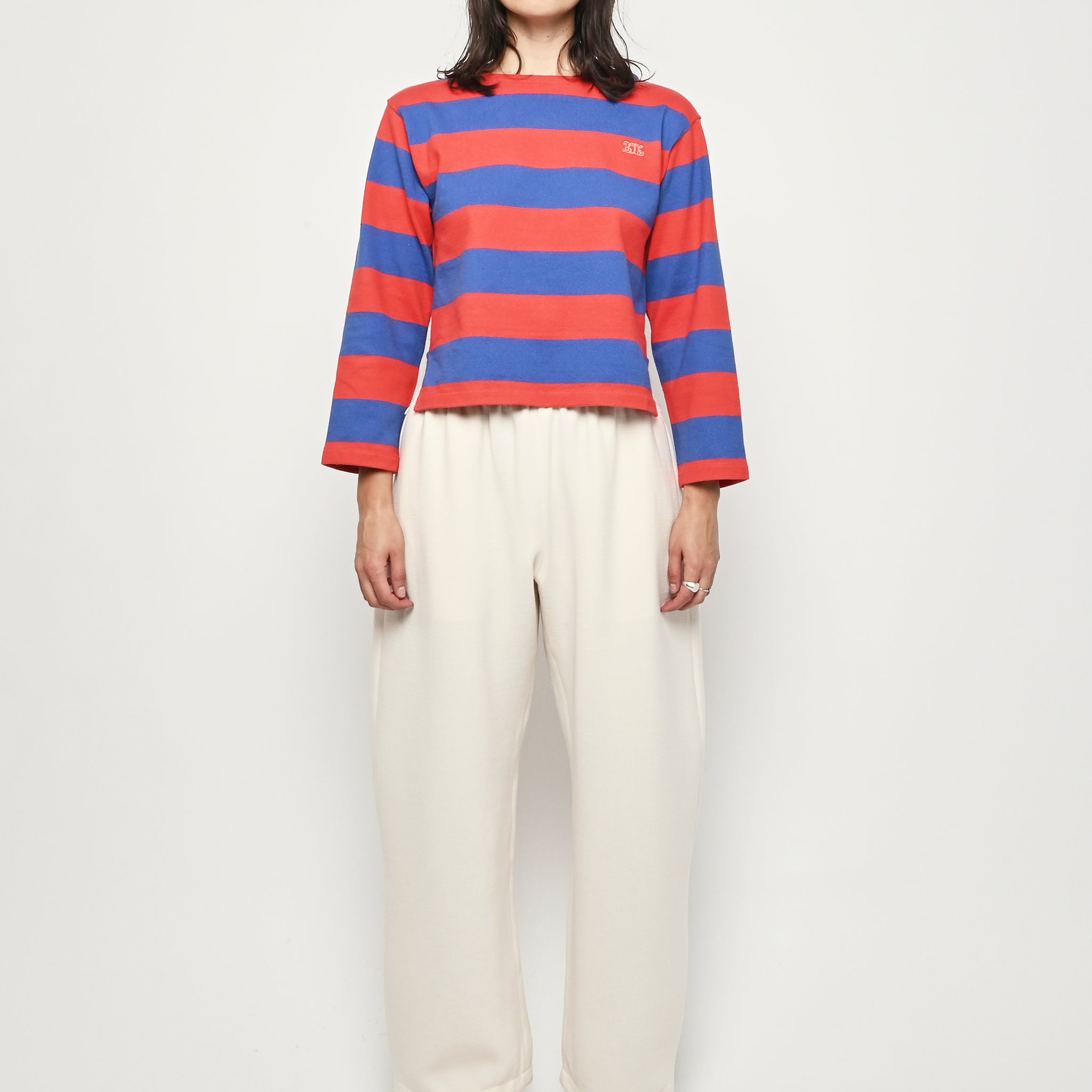 This tee is knit with wide red and blue stripes, inspired by an antique swimming costume from the 1930s. It is embroidered with a Bode monogram.