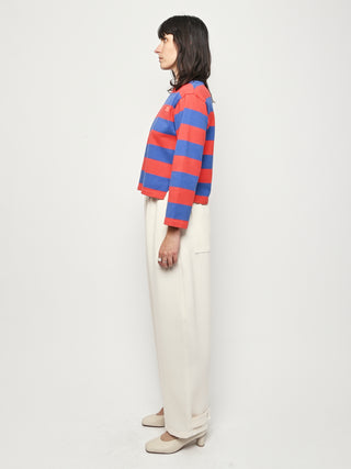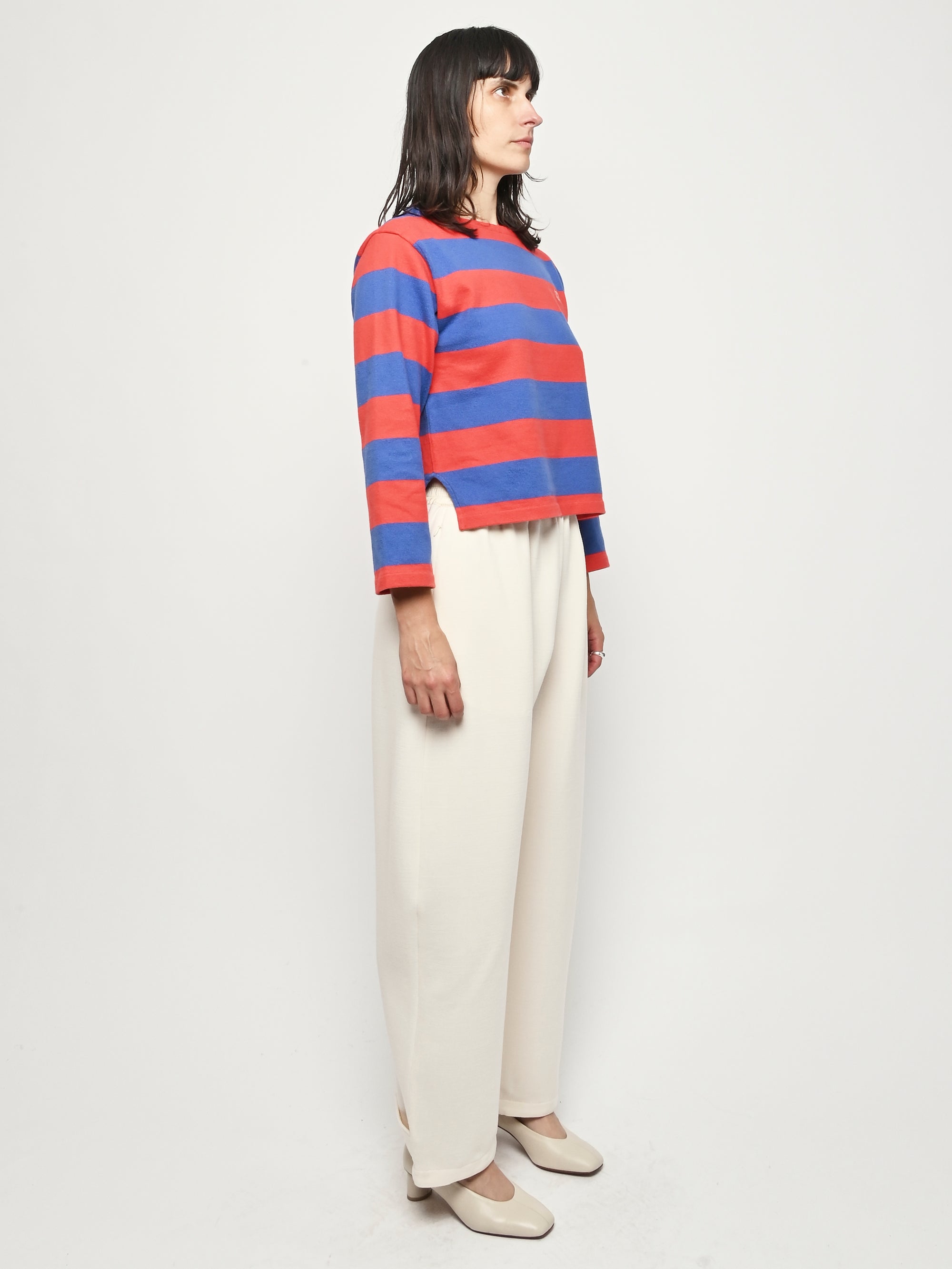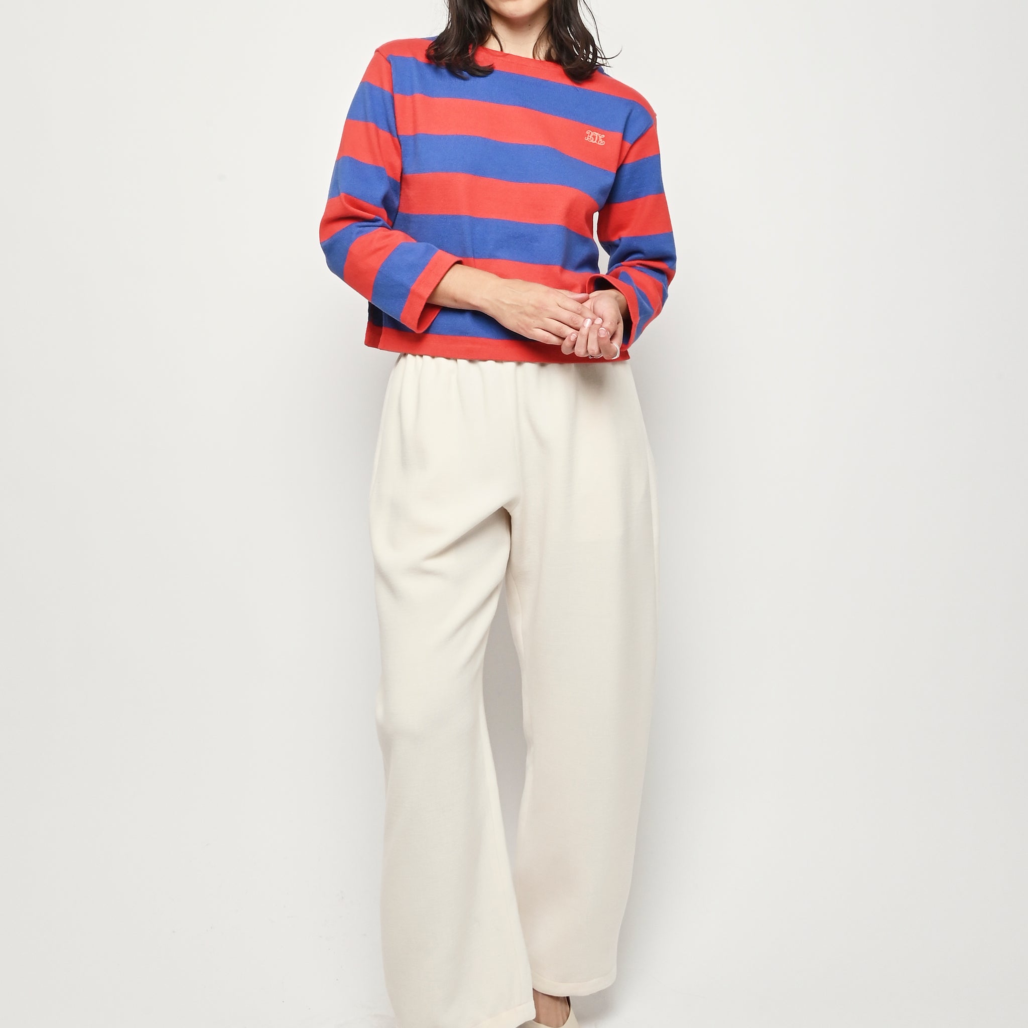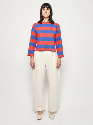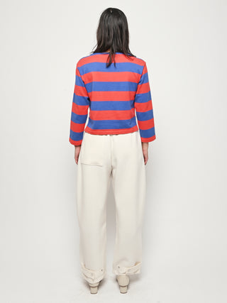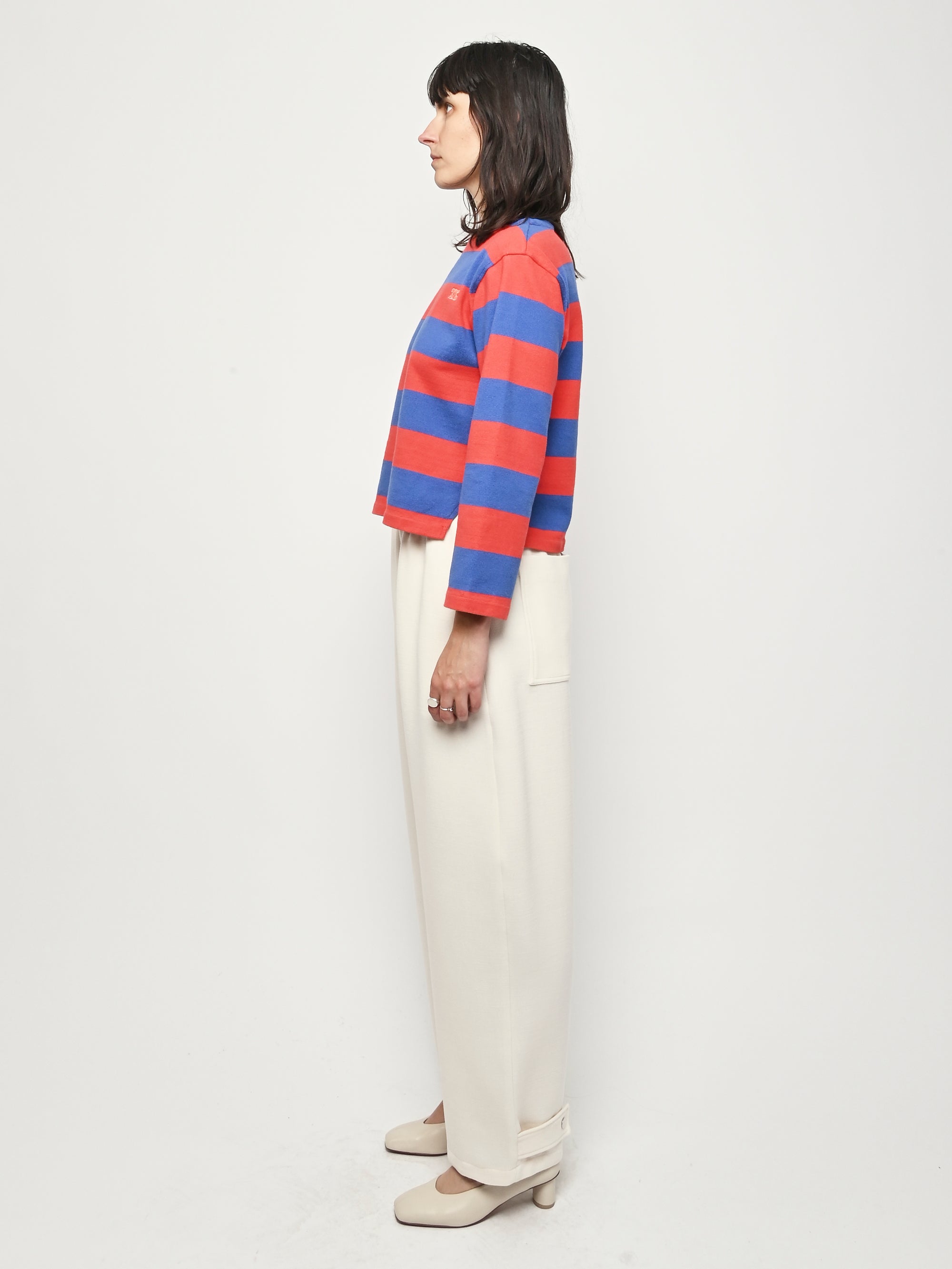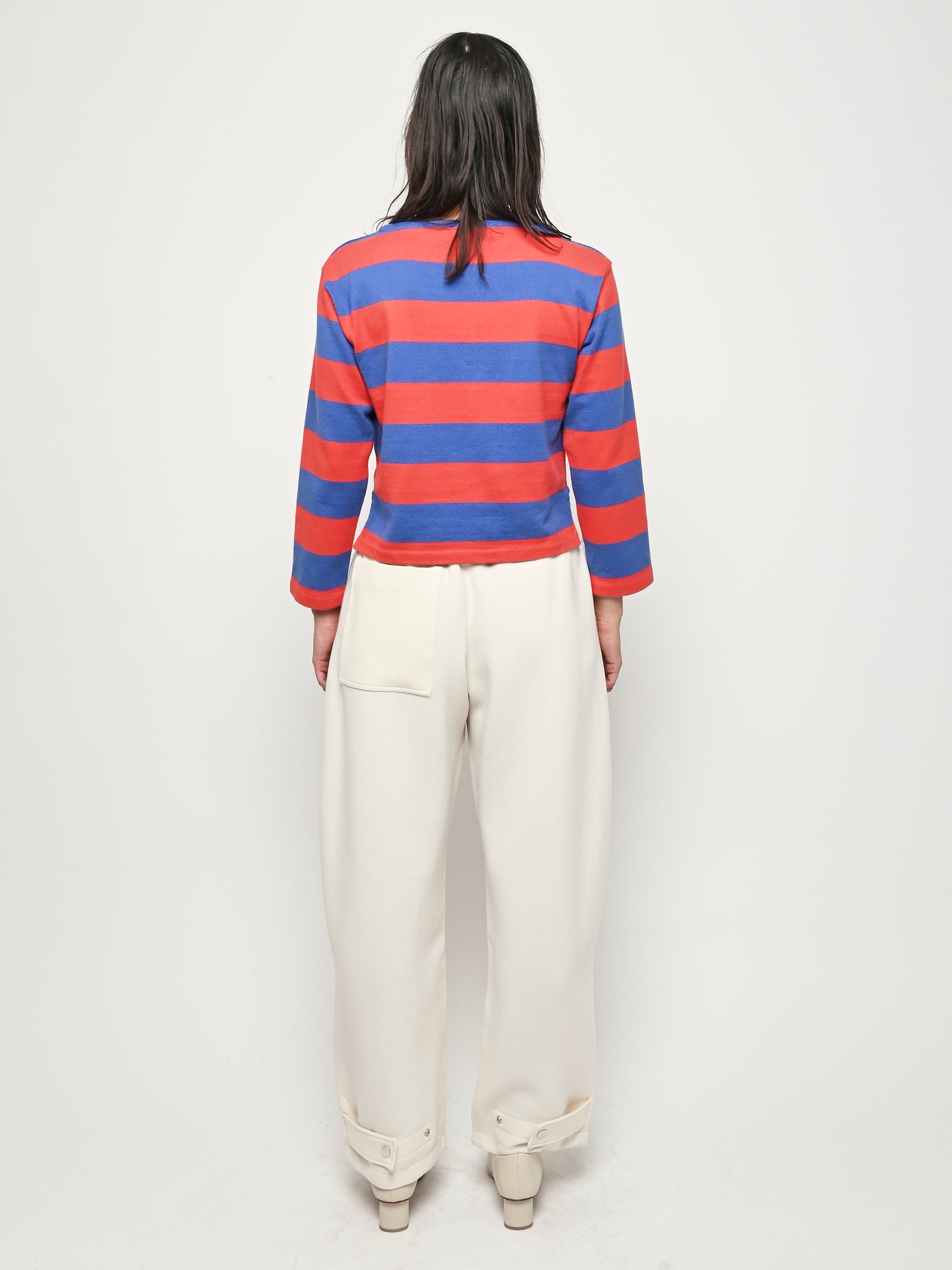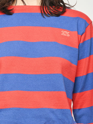 This tee is knit with wide red and blue stripes, inspired by an antique swimming costume from the 1930s. It is embroidered with a Bode monogram.