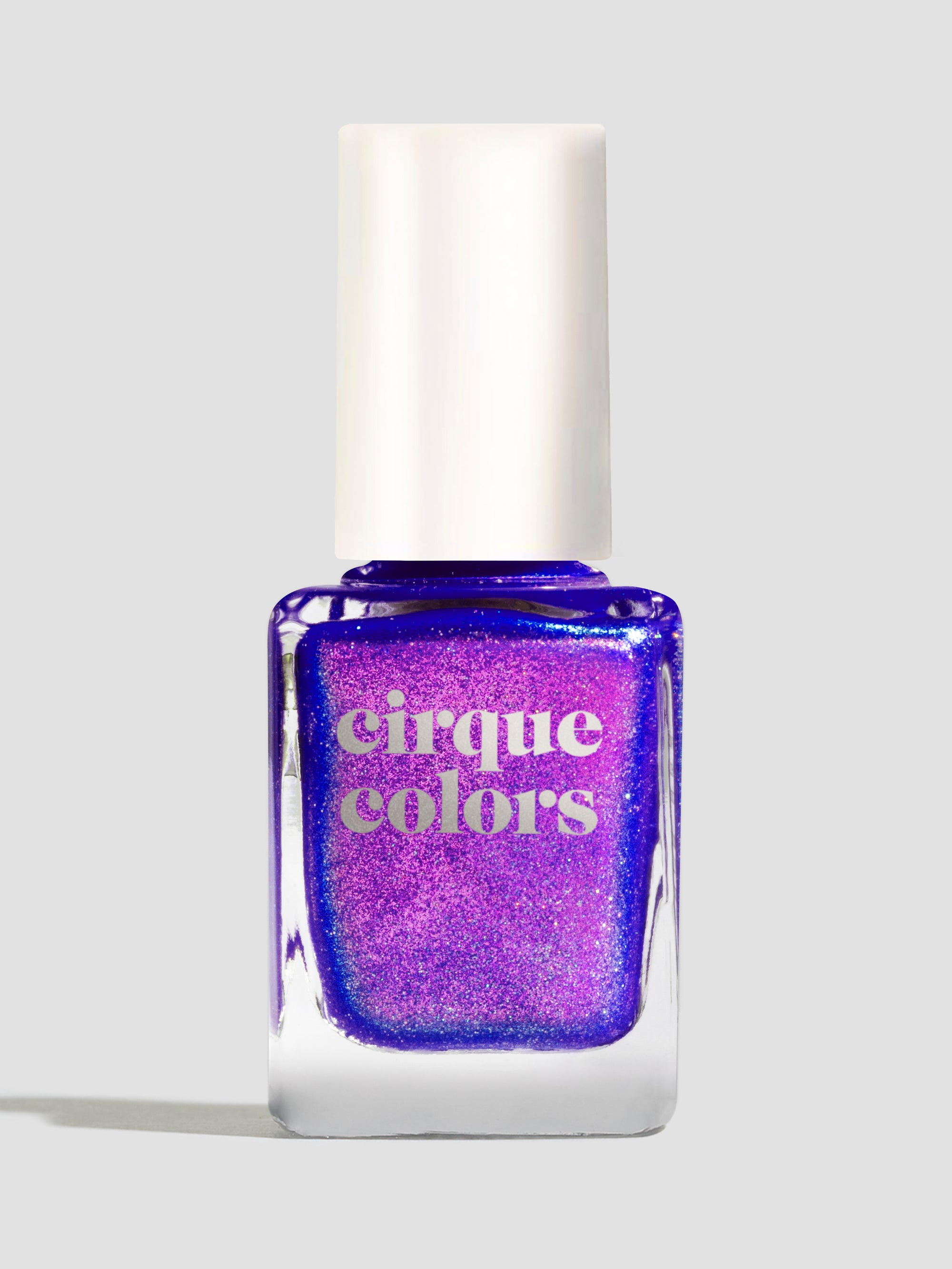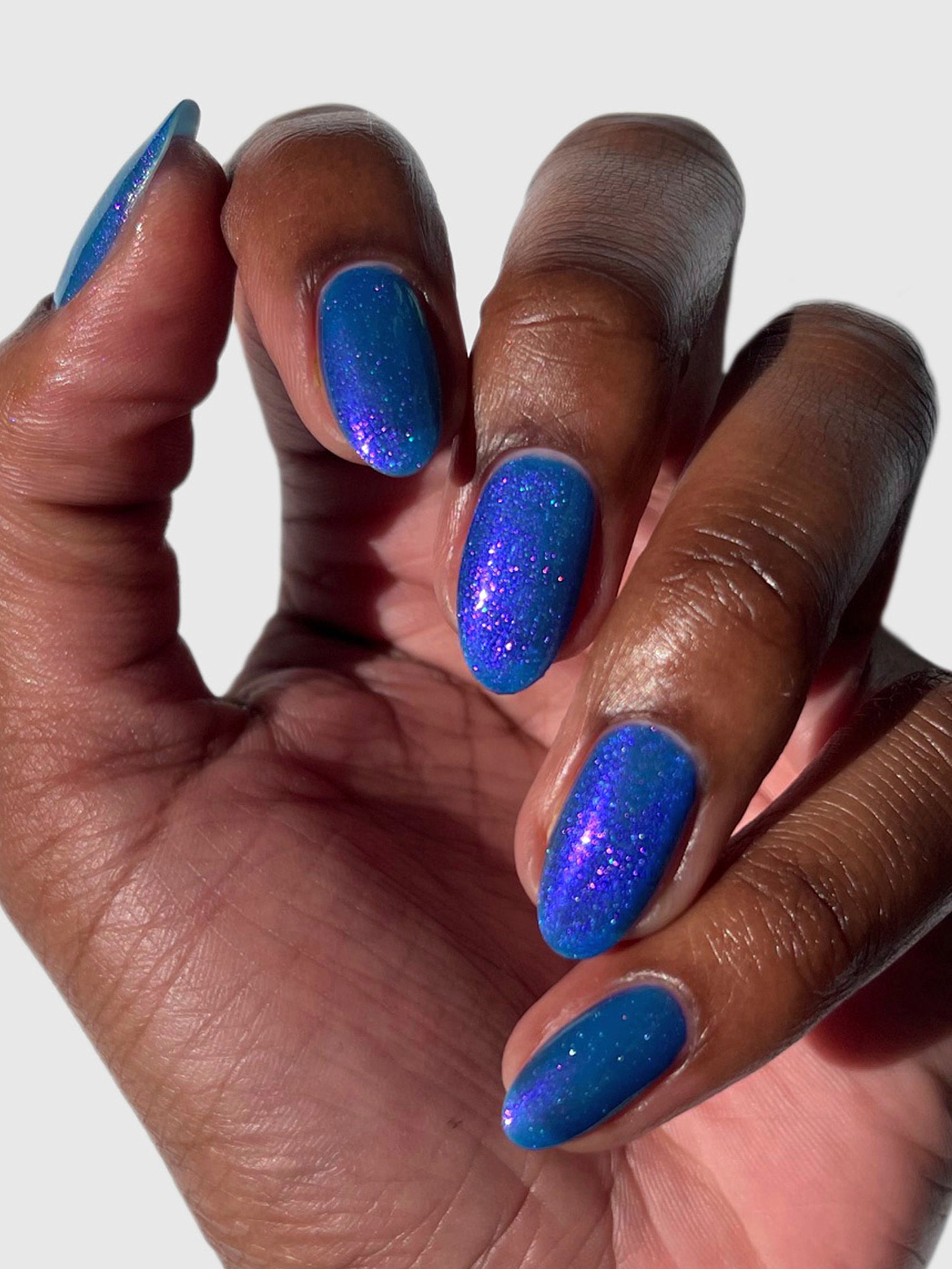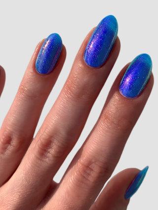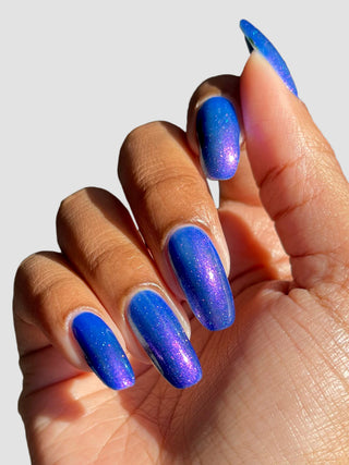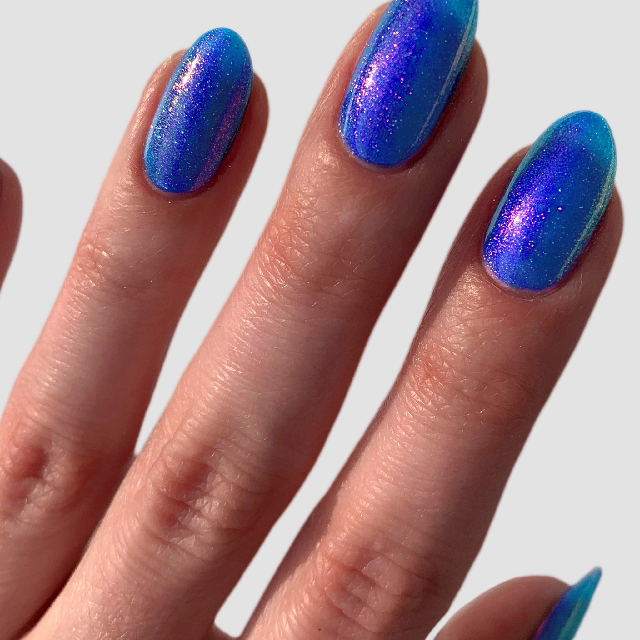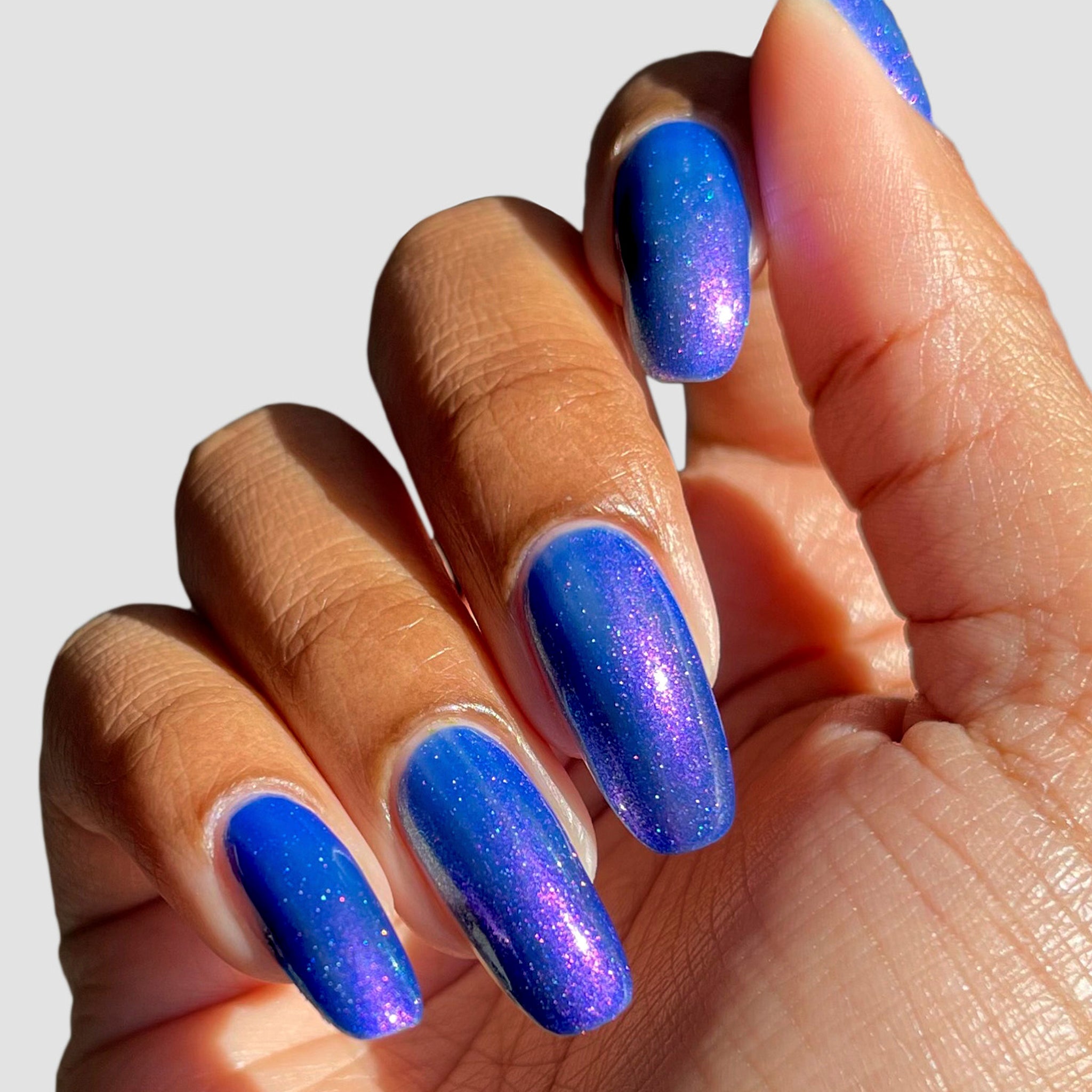 Heart of Glass is a cobalt blue nail polish with dazzling pink-gold-green color-shifting shimmer and delicate holographic sparkle.