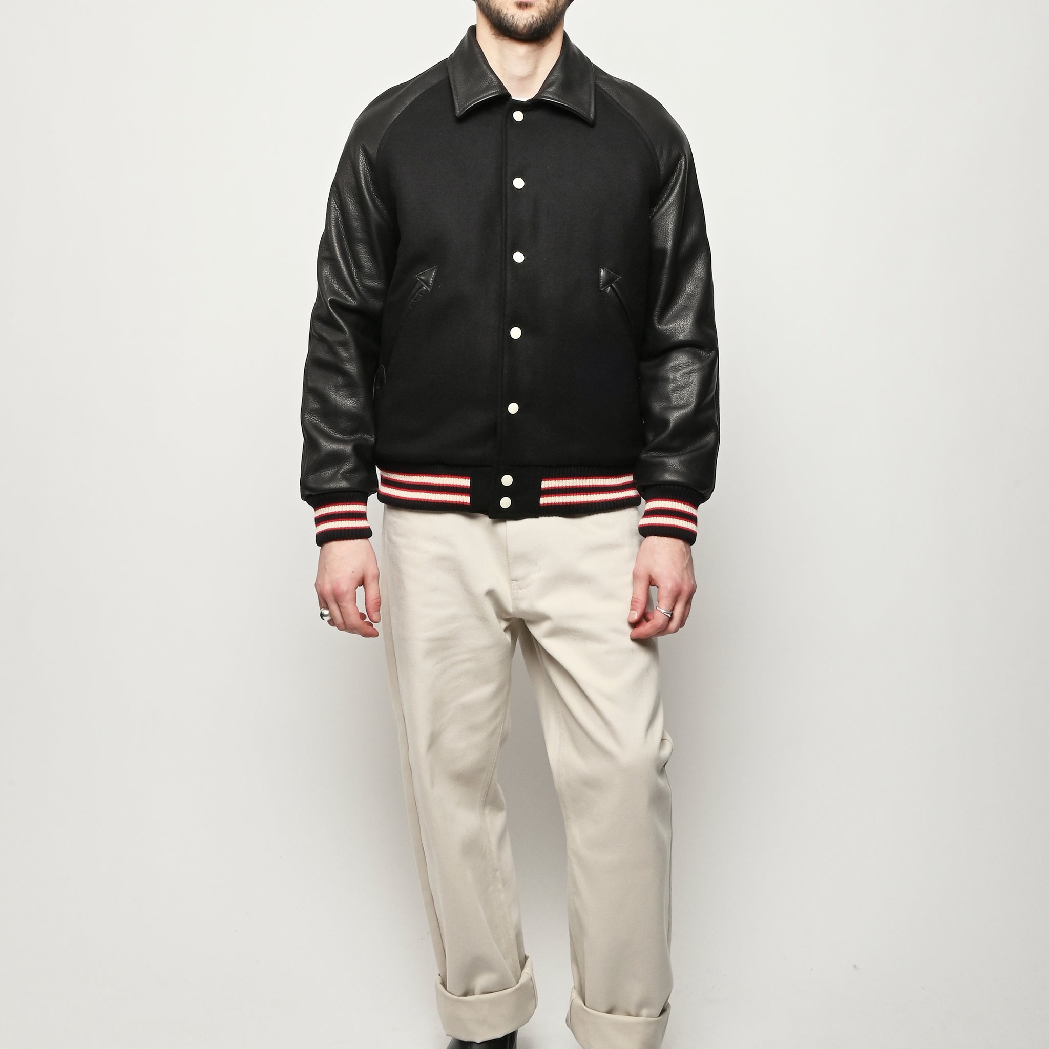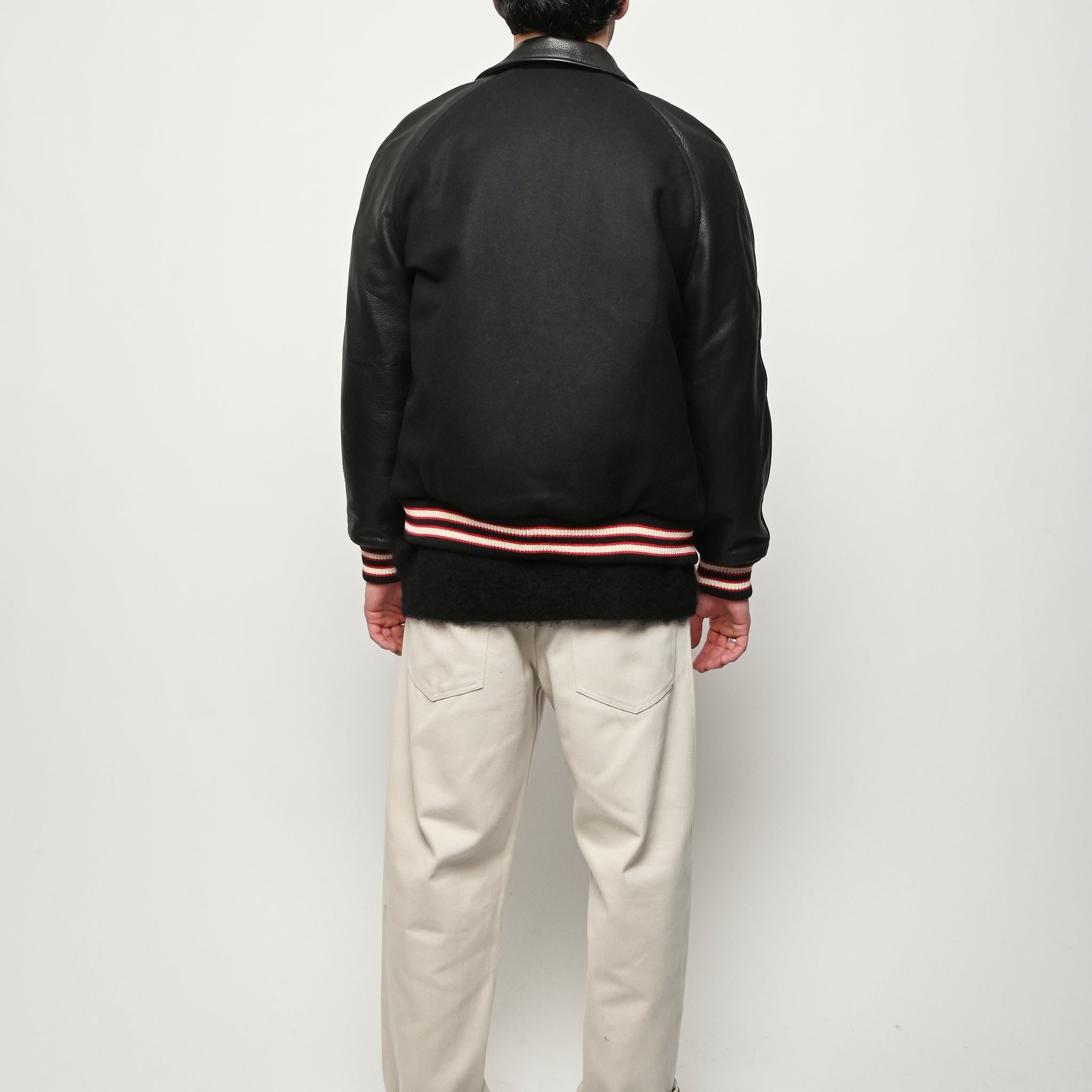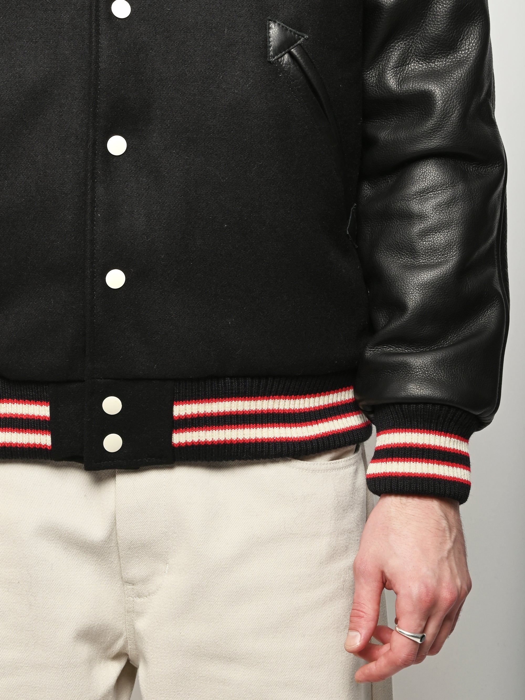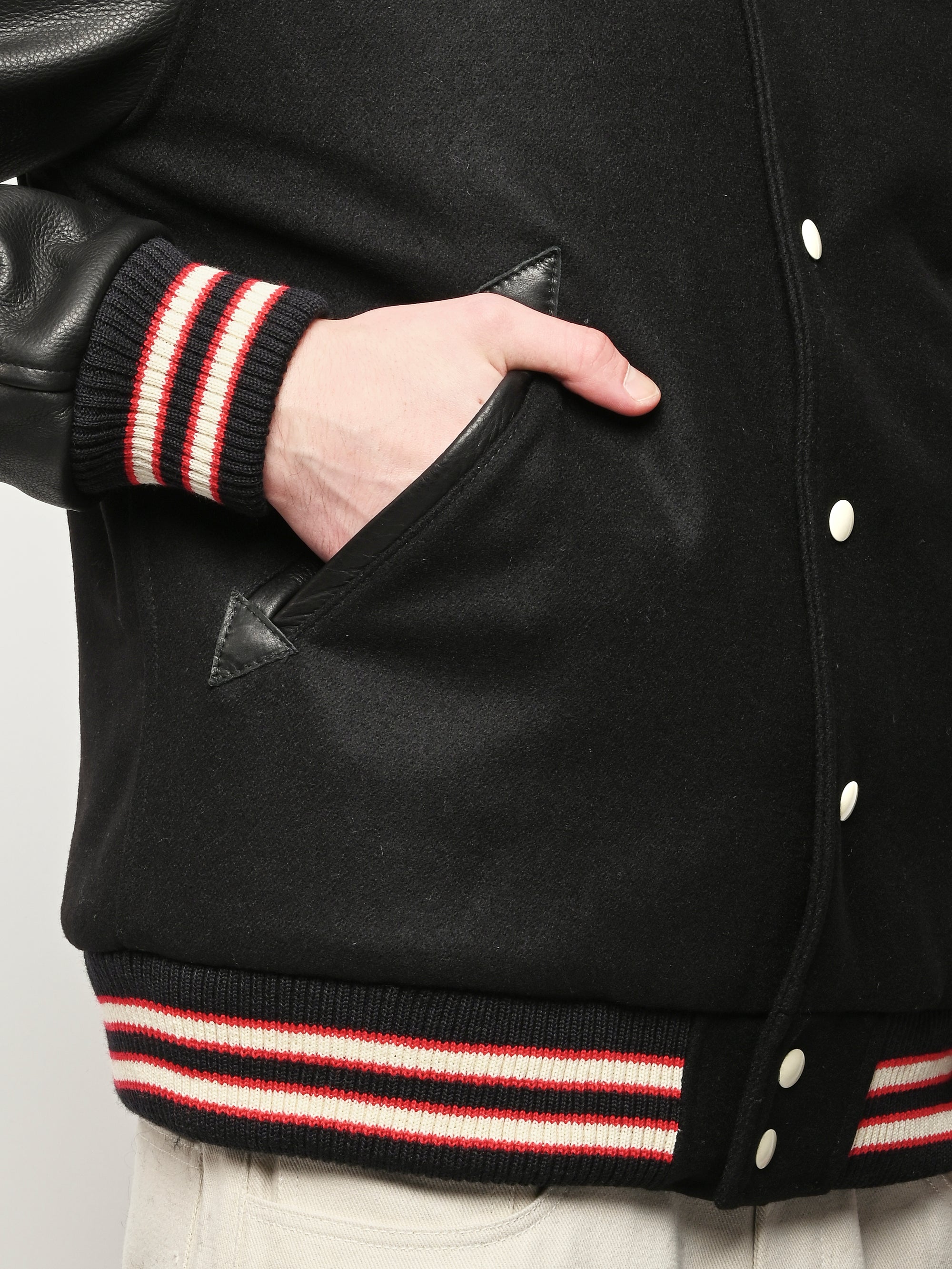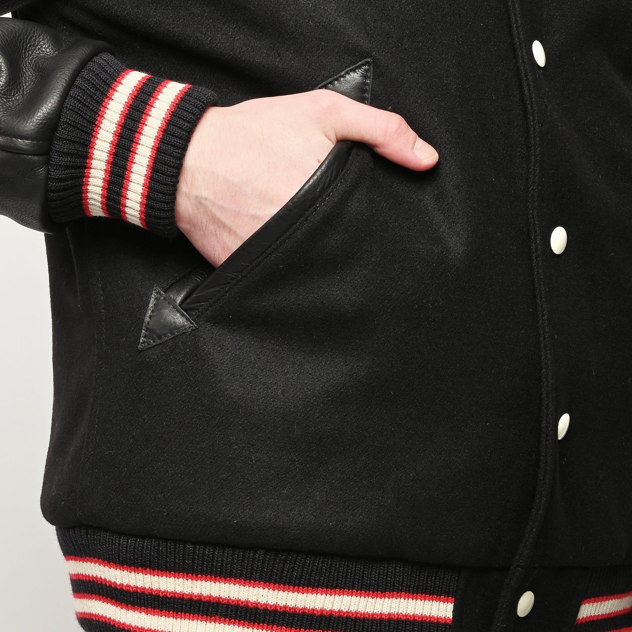 - Black leather raglan sleeves, pocket welts & arrows, locker loop