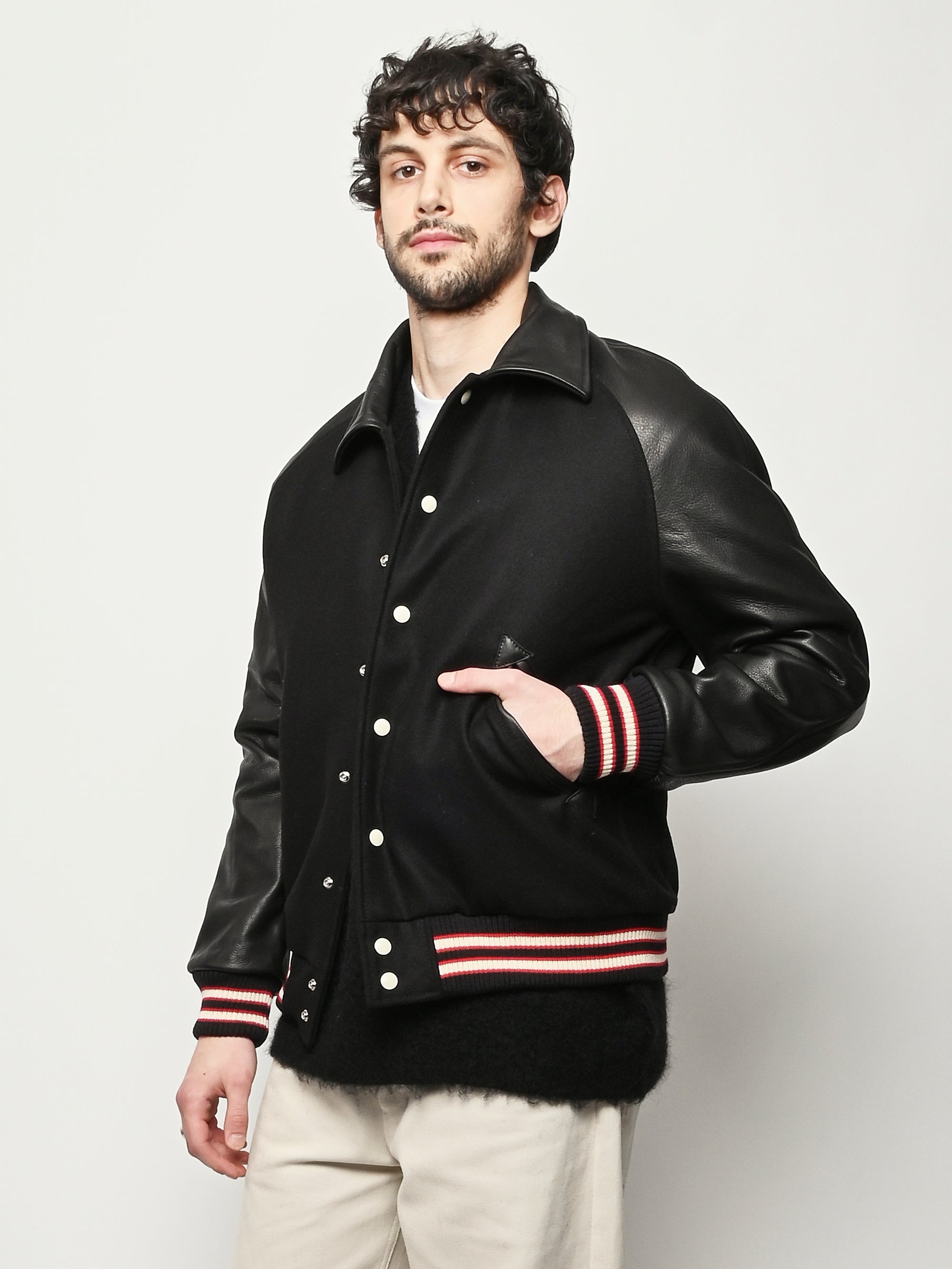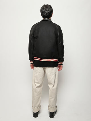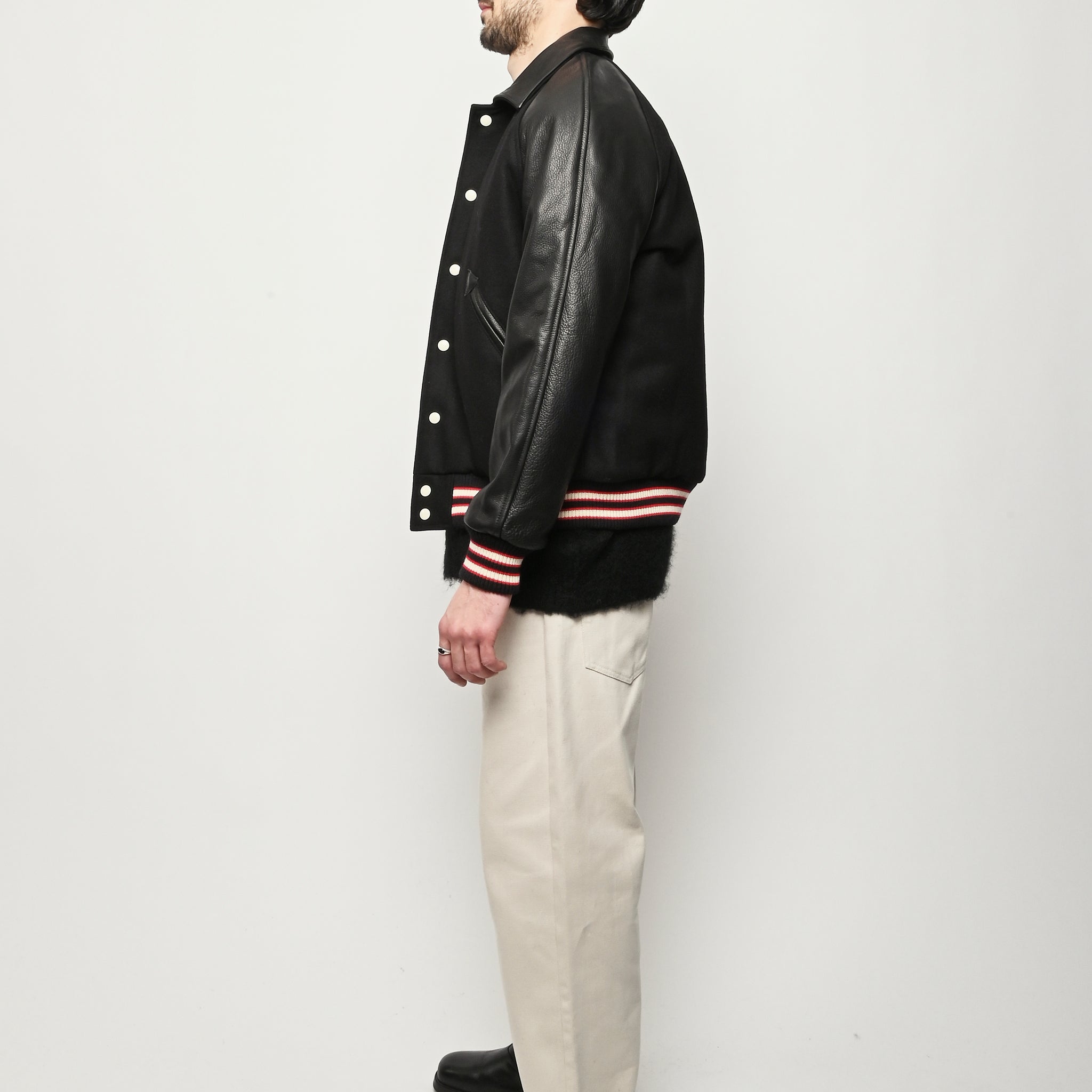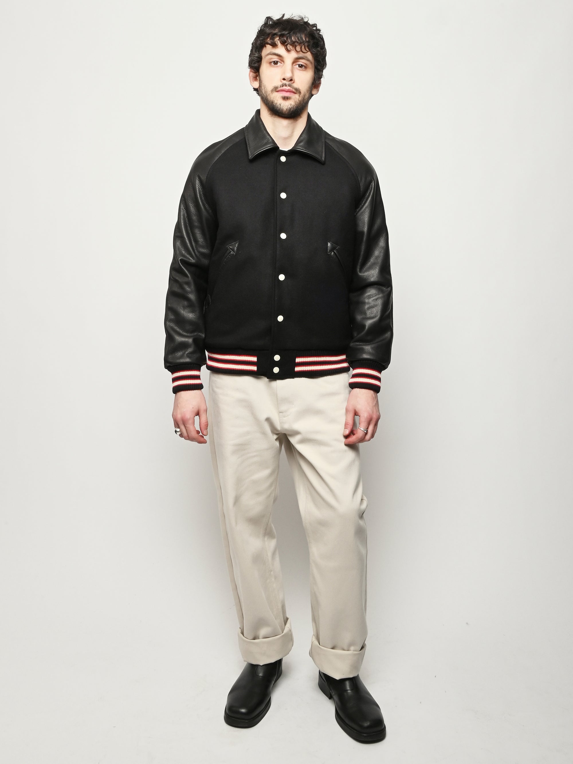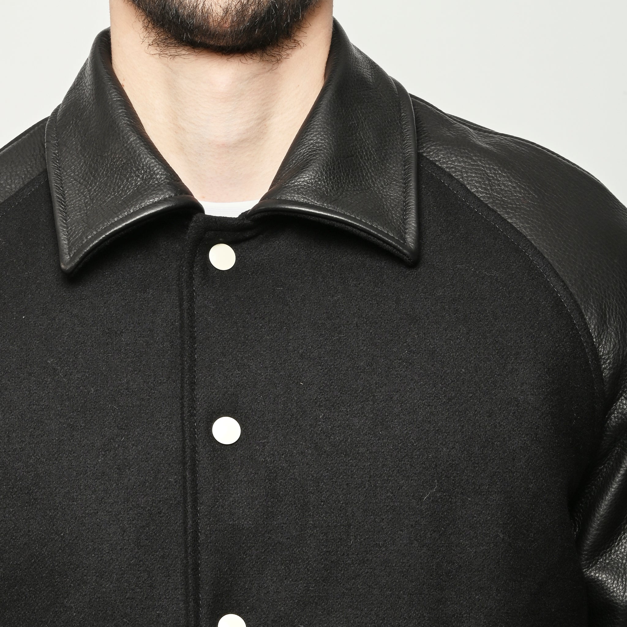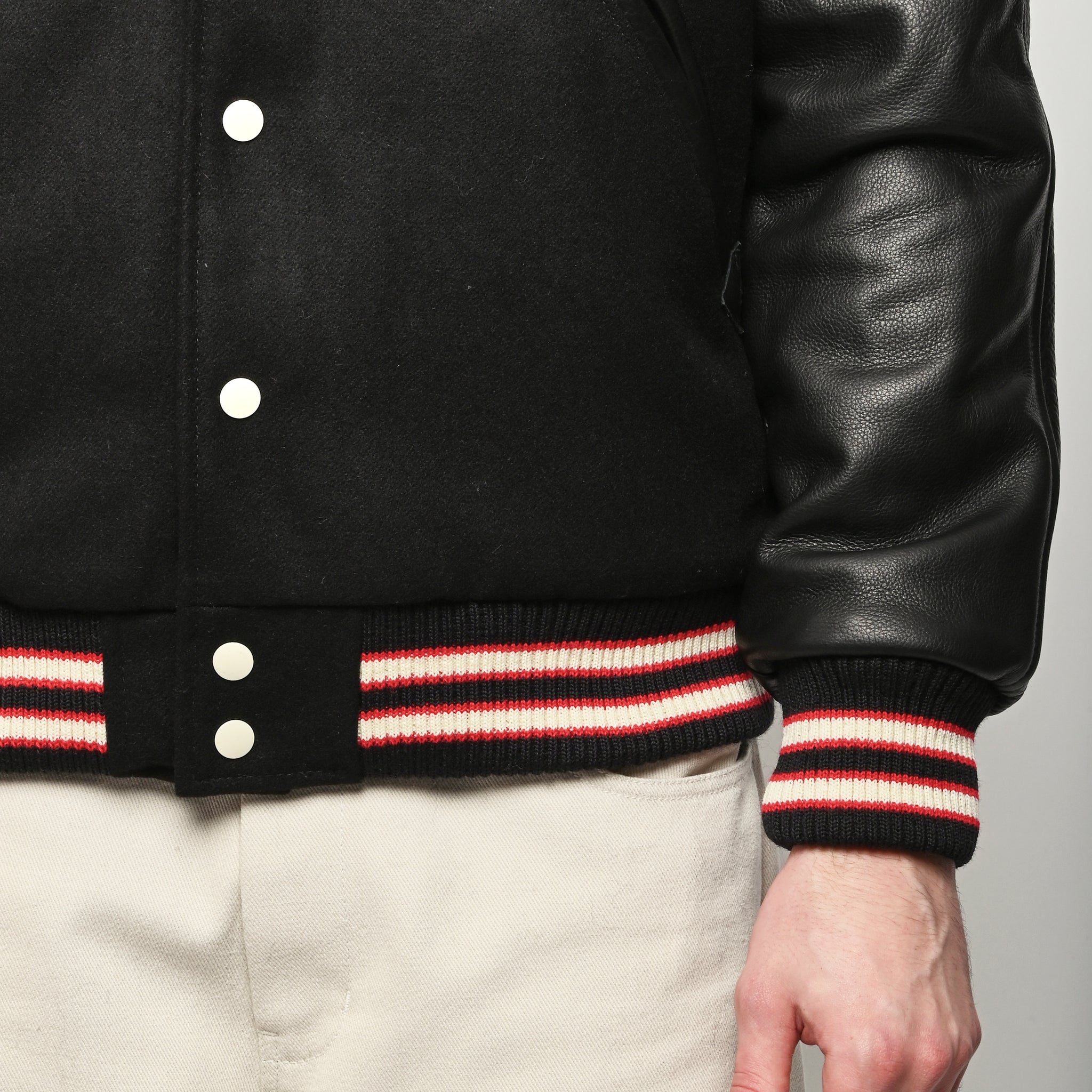 - Black leather raglan sleeves, pocket welts & arrows, locker loop