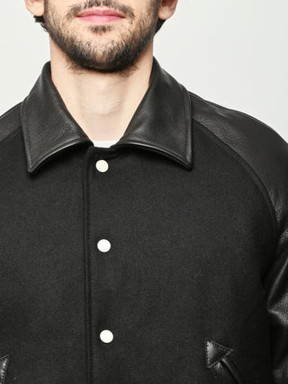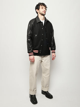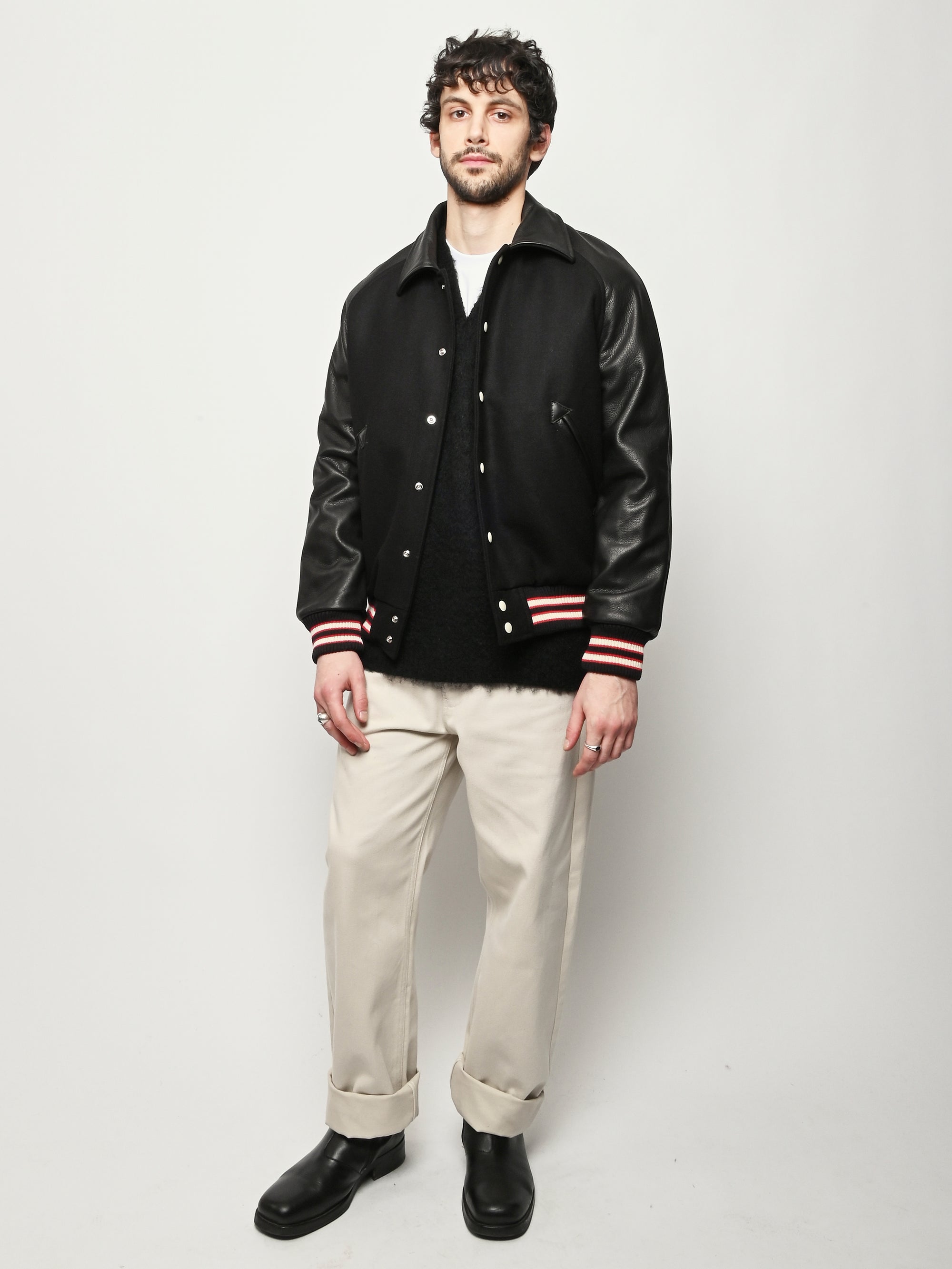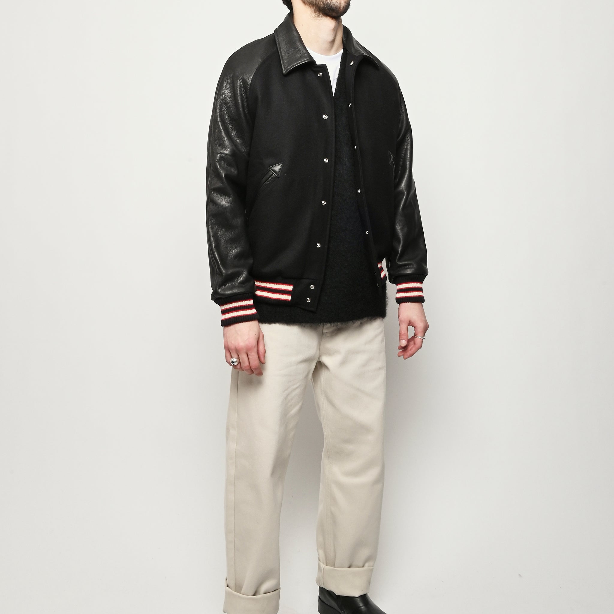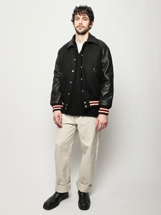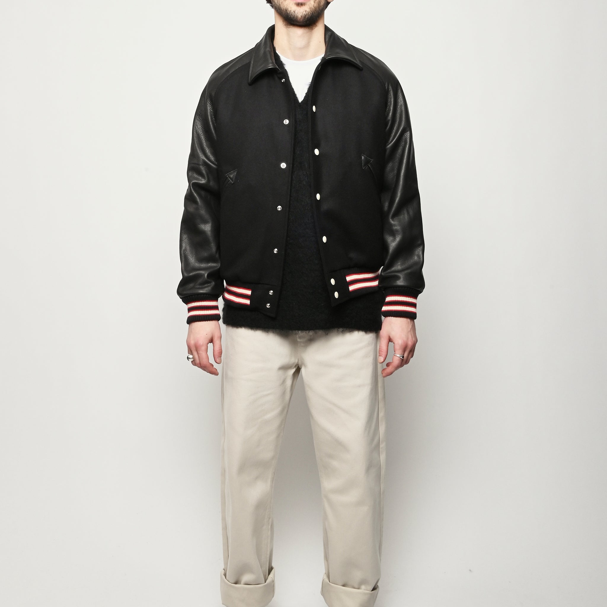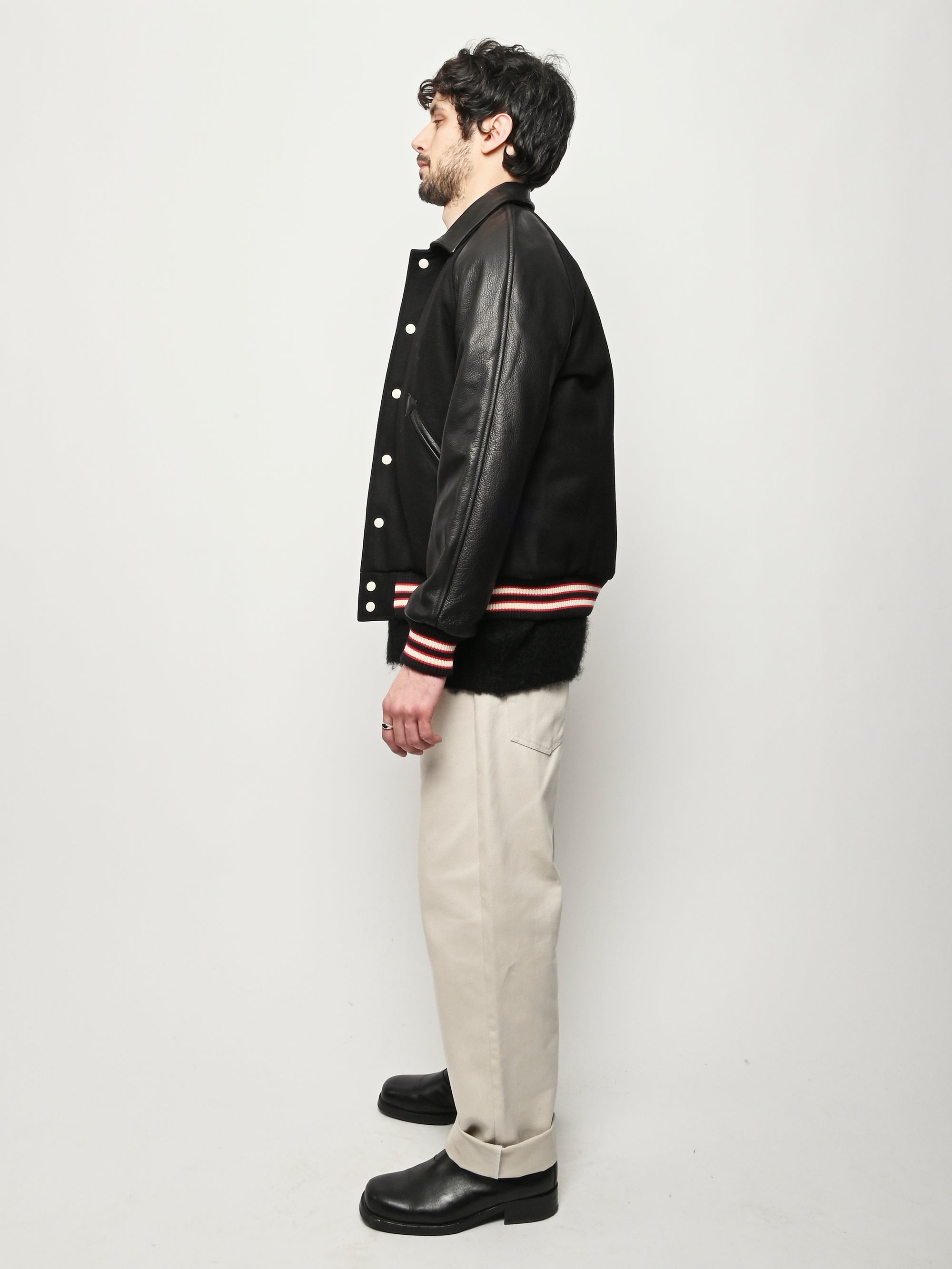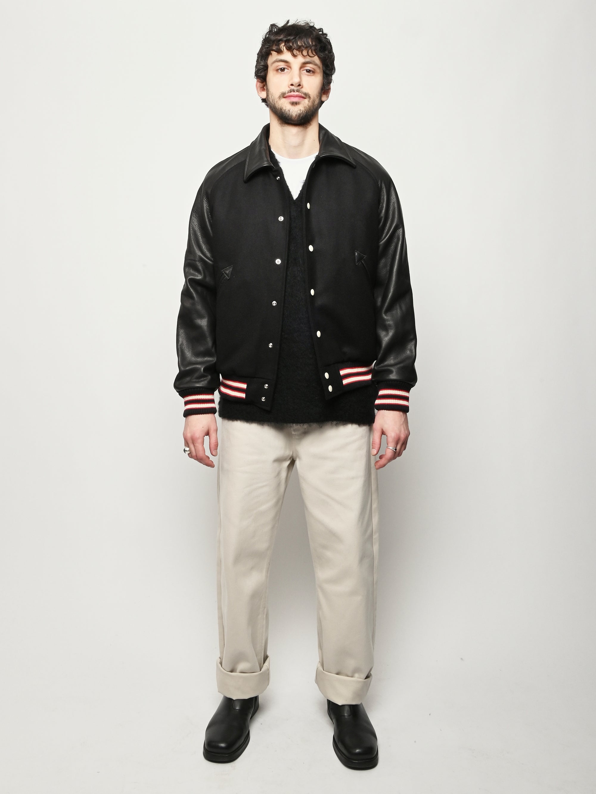 - Black leather raglan sleeves, pocket welts & arrows, locker loop