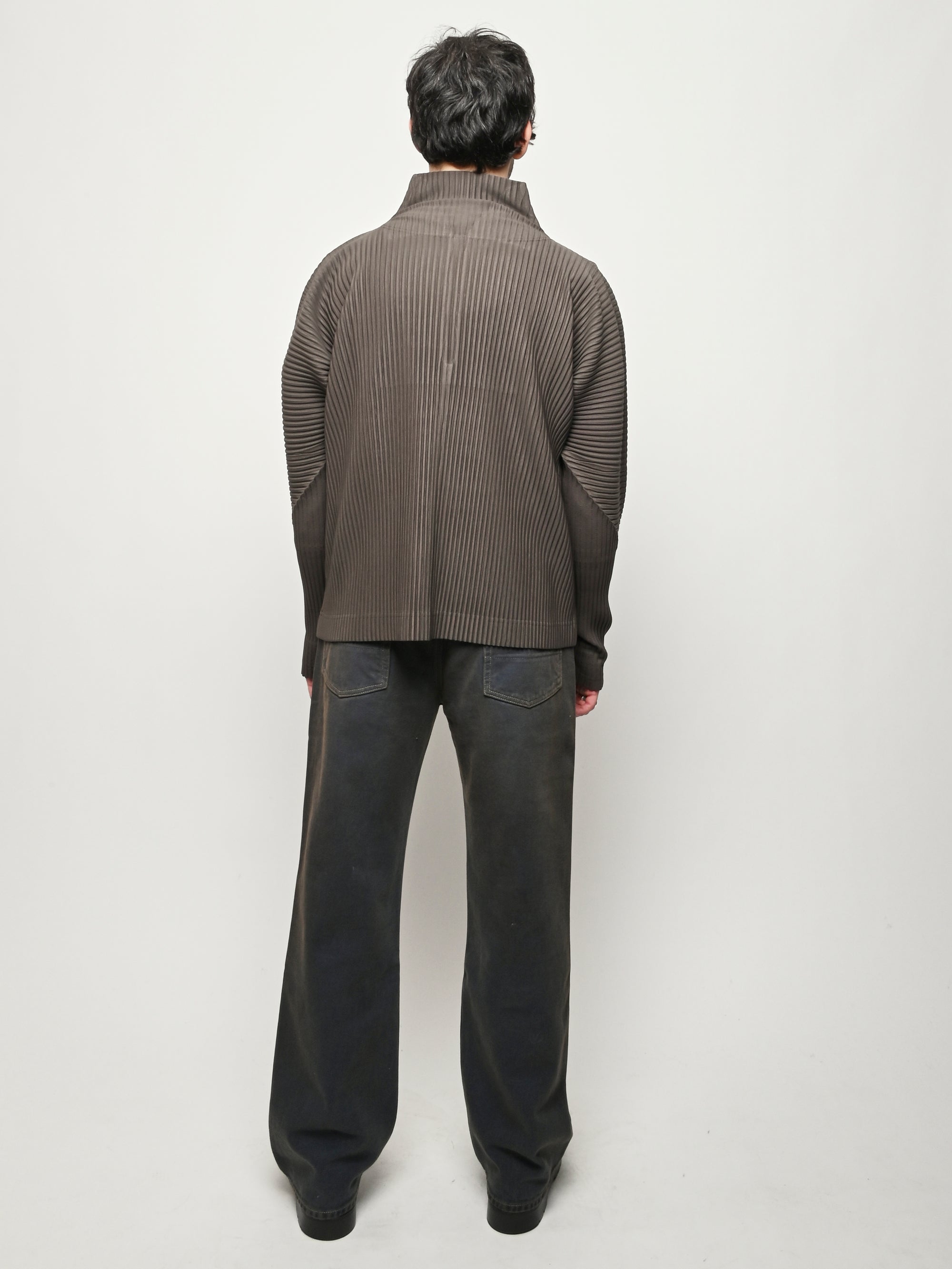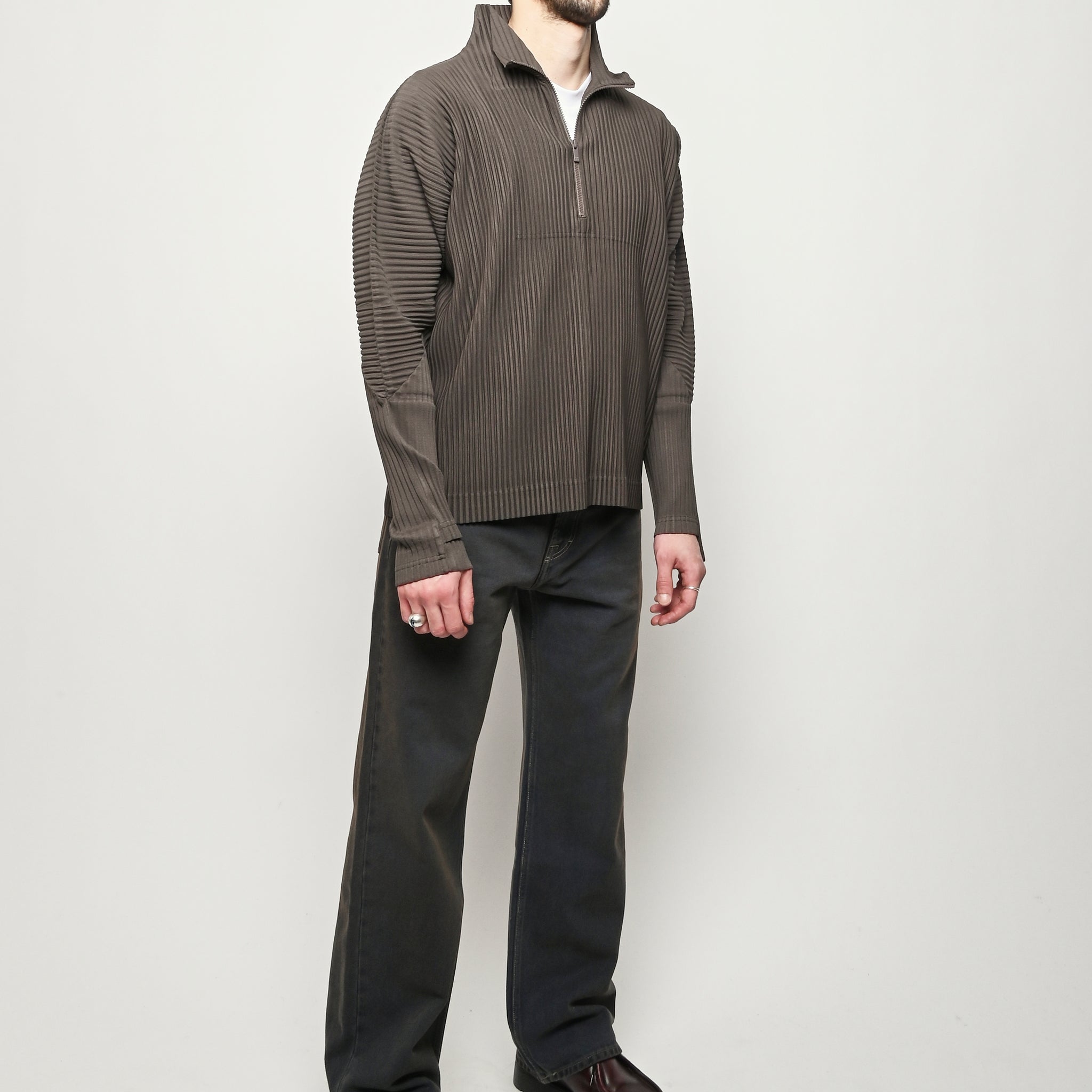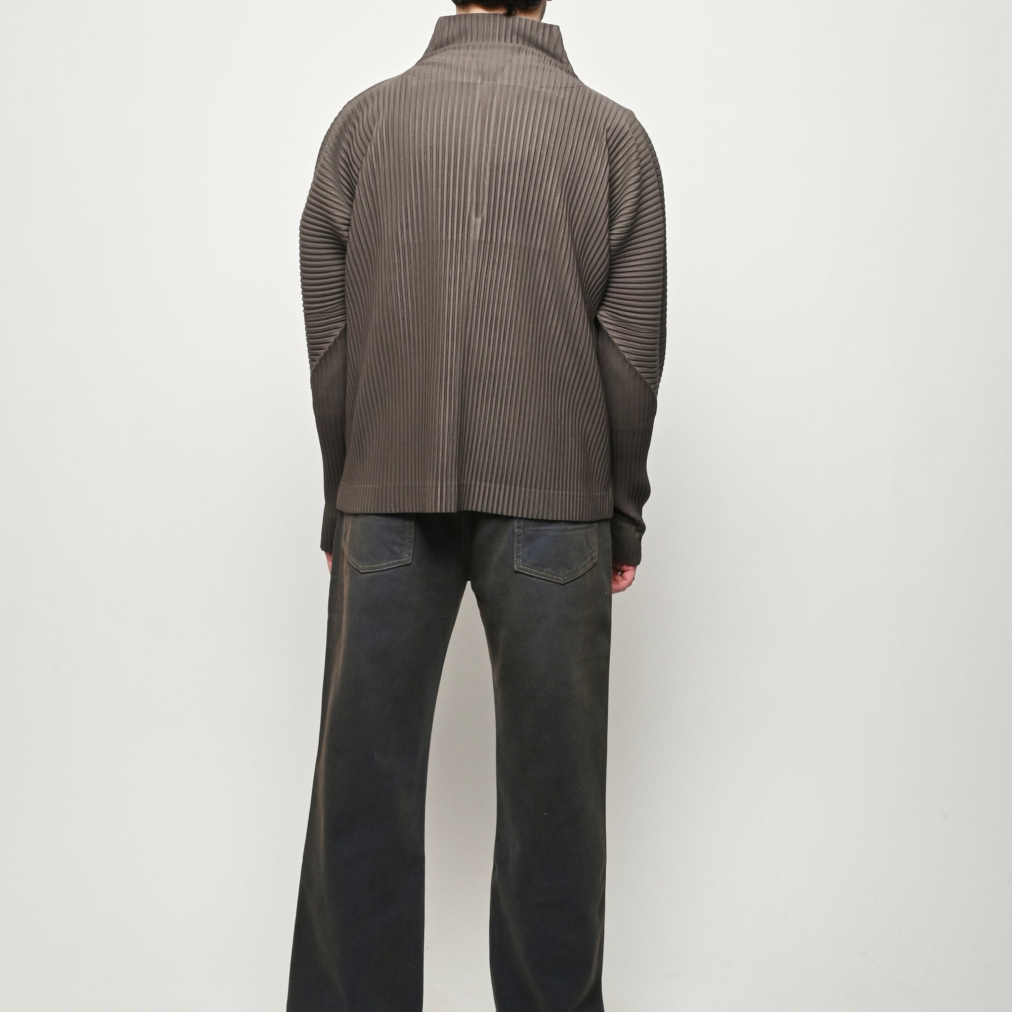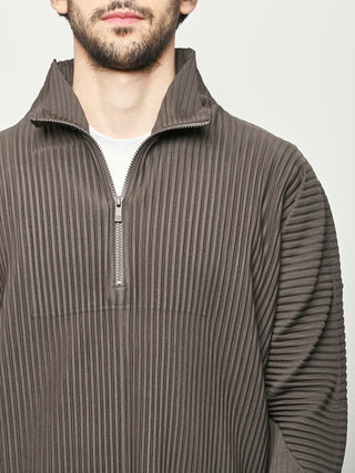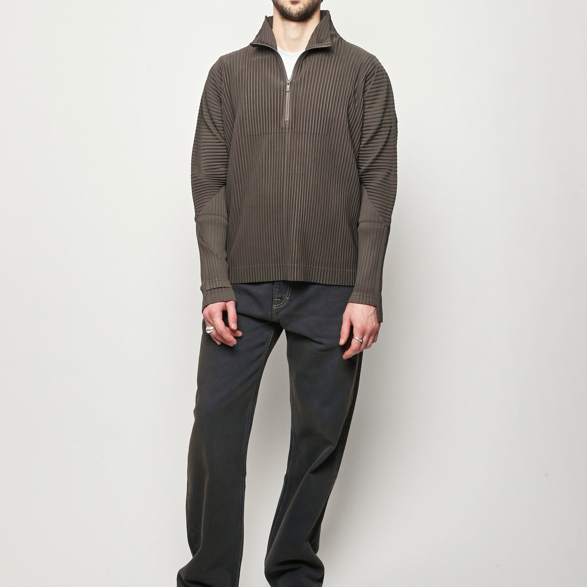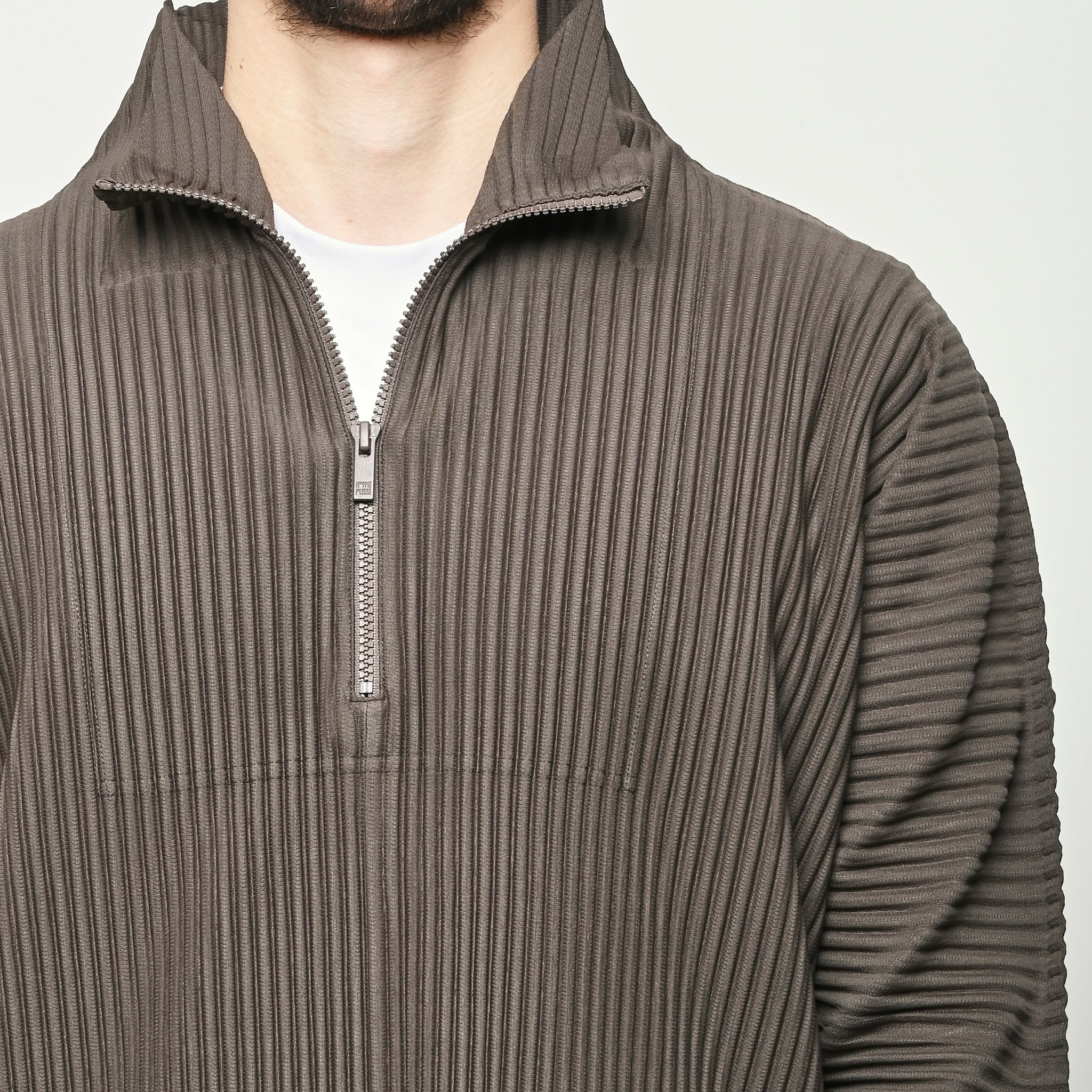 Homme Plisse Issey Miyake half-zippered parka characterized by its double-layered sleeves, which are designed so you can insert your thumbs through them like thumbholes. When worn under a coat or jacket with the sleeves showing, you can sense the pleated fabric's essence.