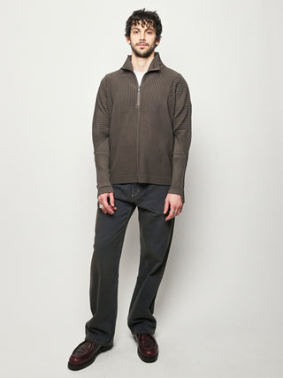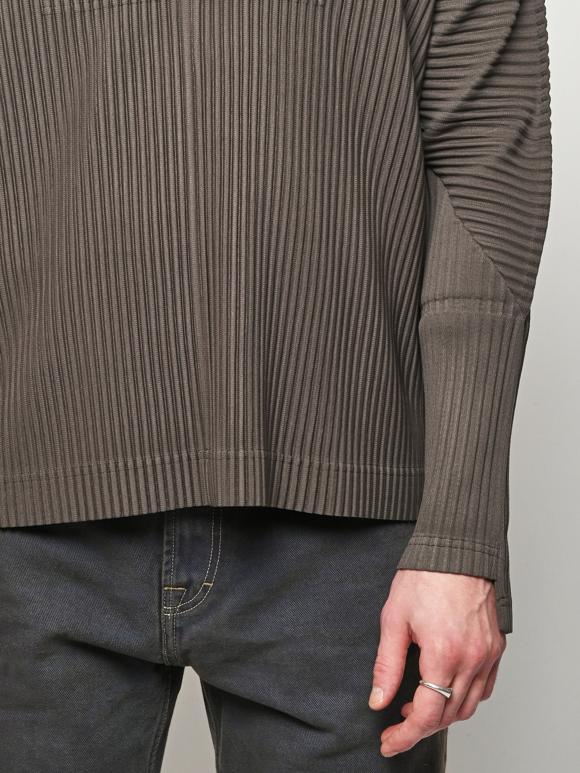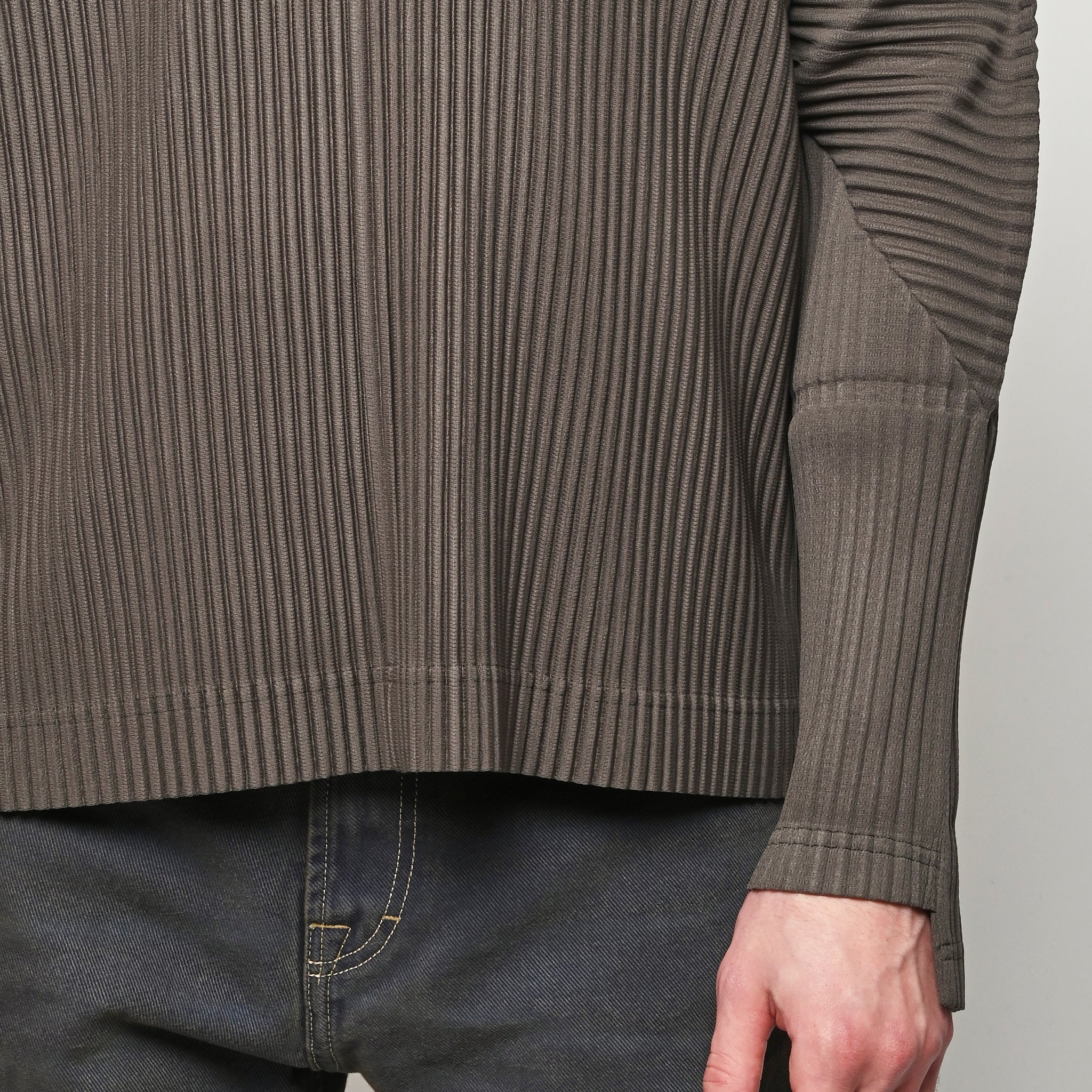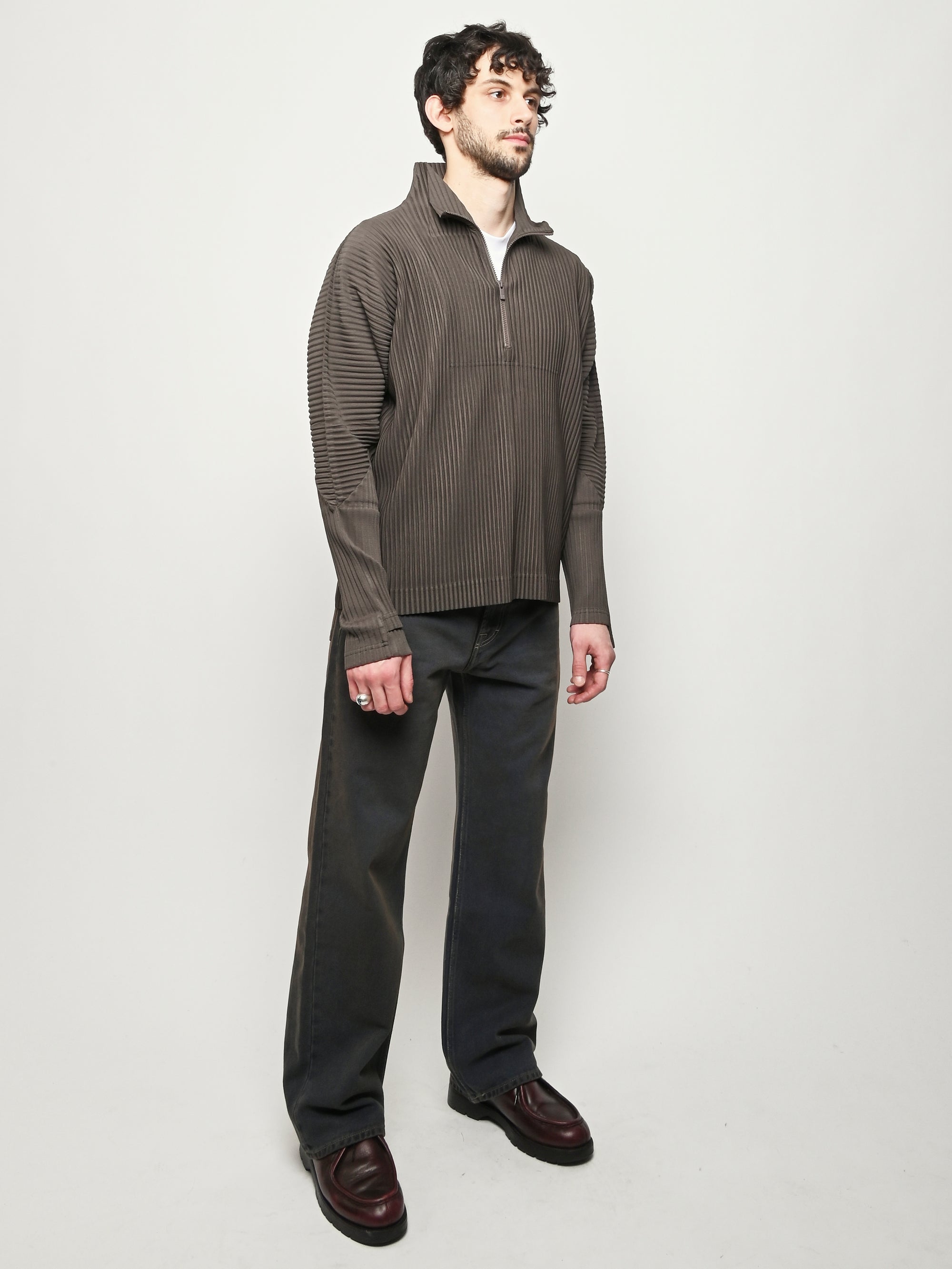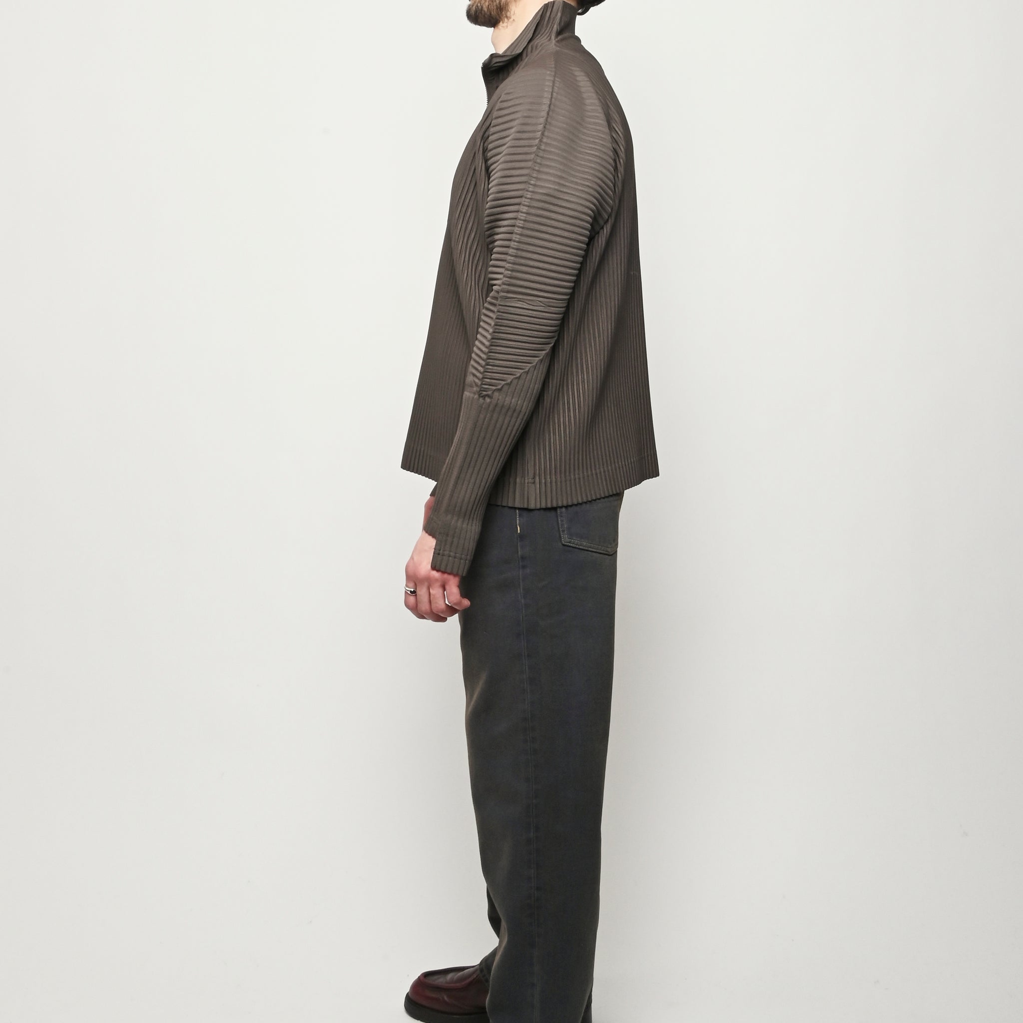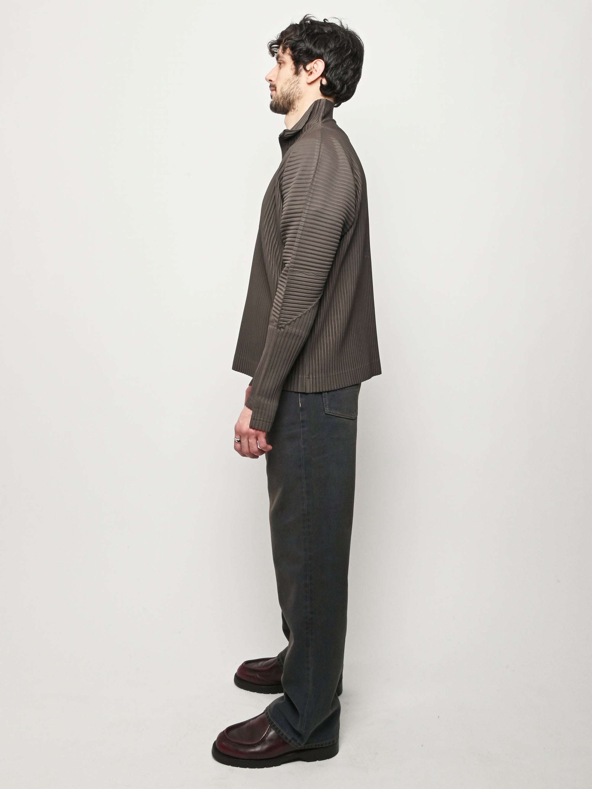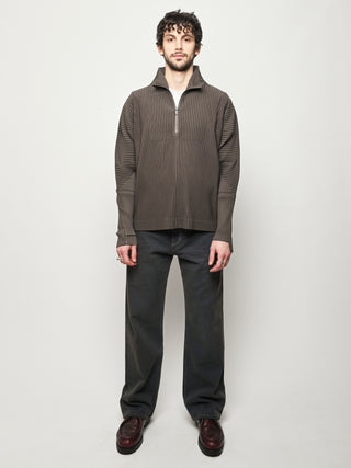 Homme Plisse Issey Miyake half-zippered parka characterized by its double-layered sleeves, which are designed so you can insert your thumbs through them like thumbholes. When worn under a coat or jacket with the sleeves showing, you can sense the pleated fabric's essence.