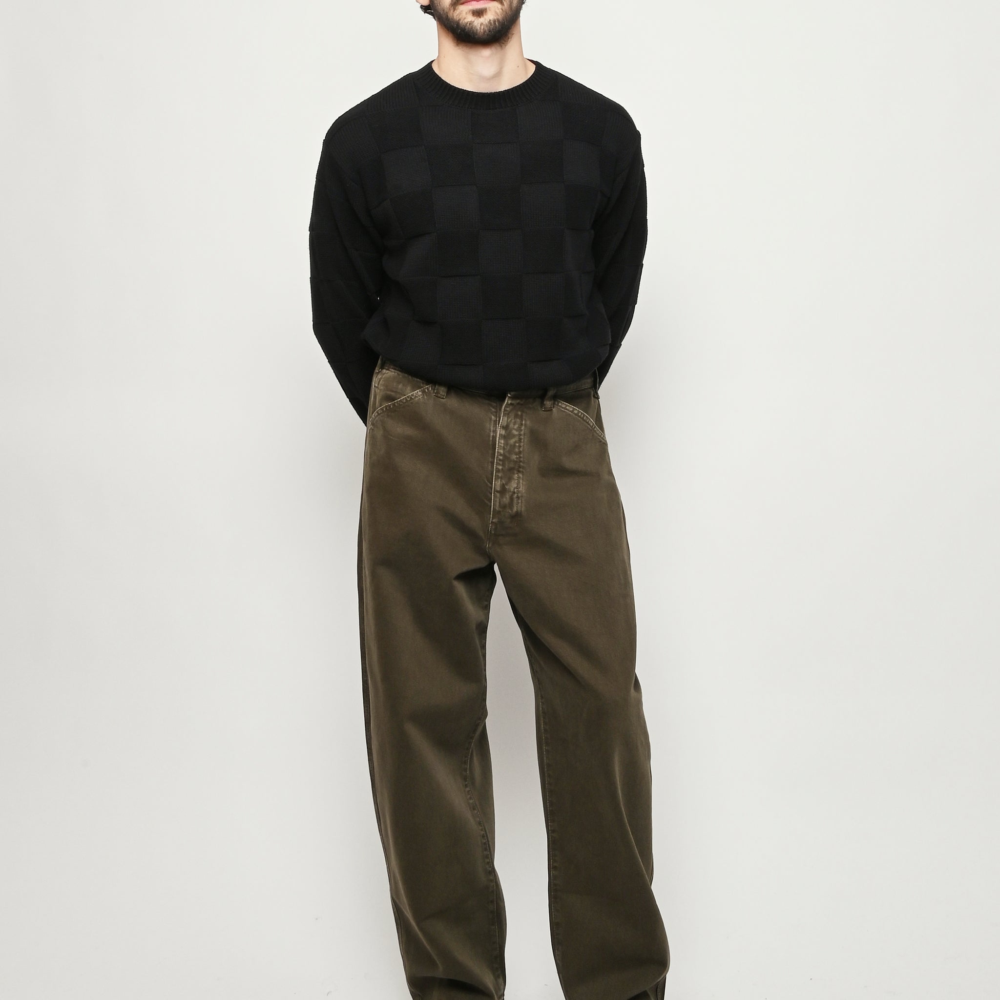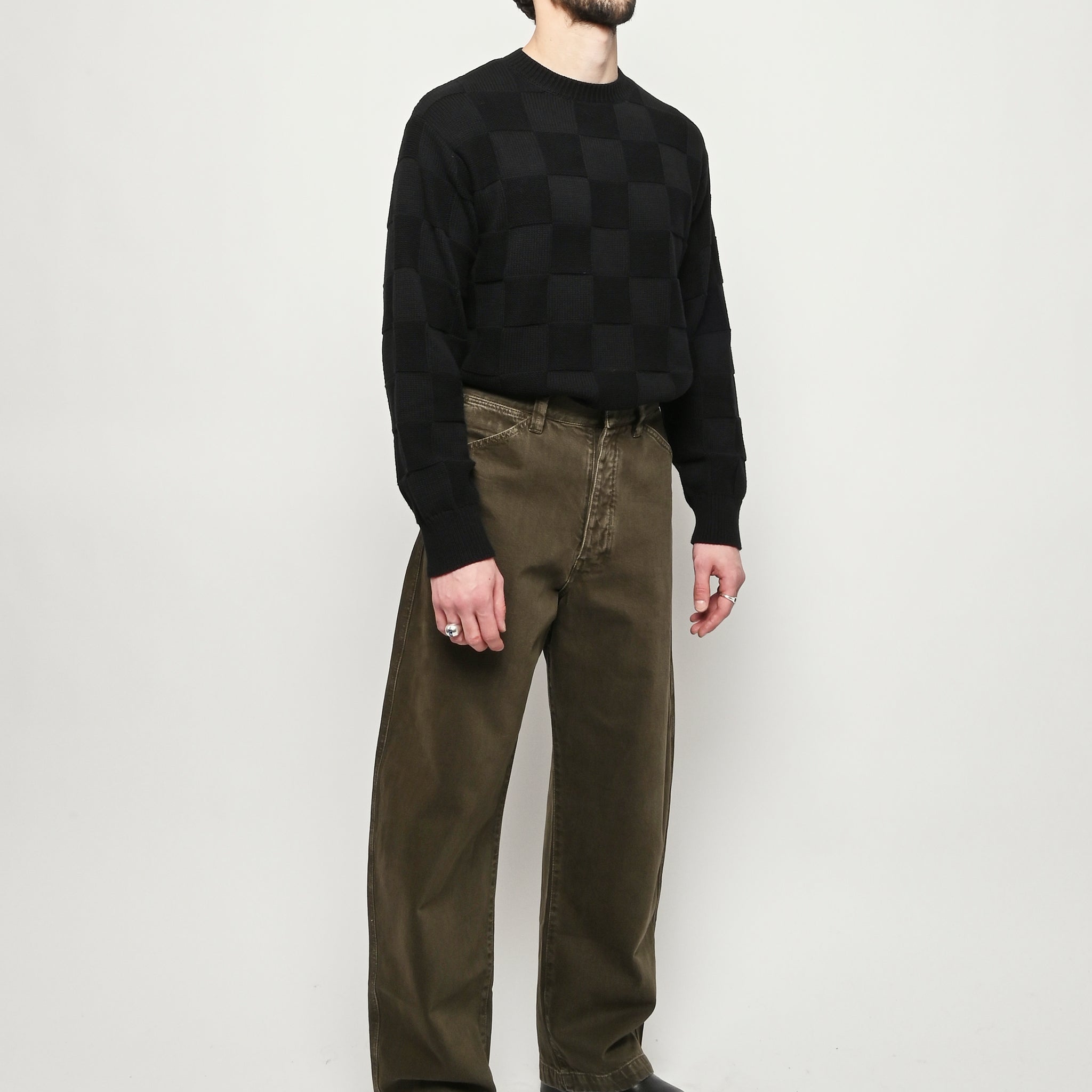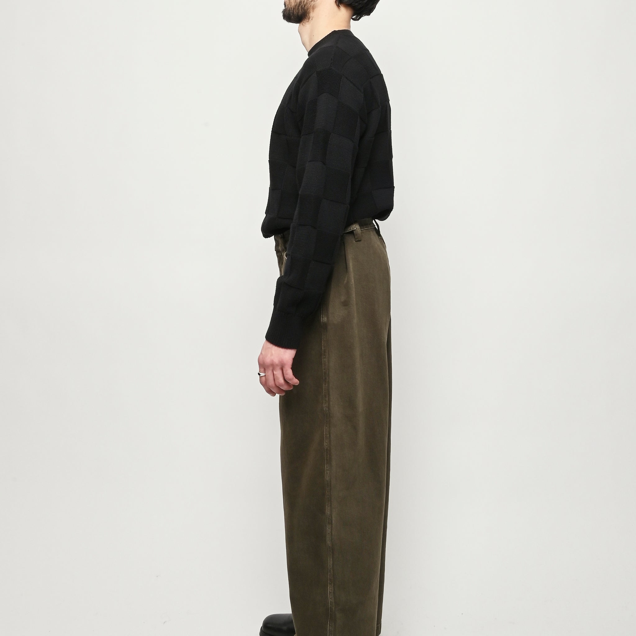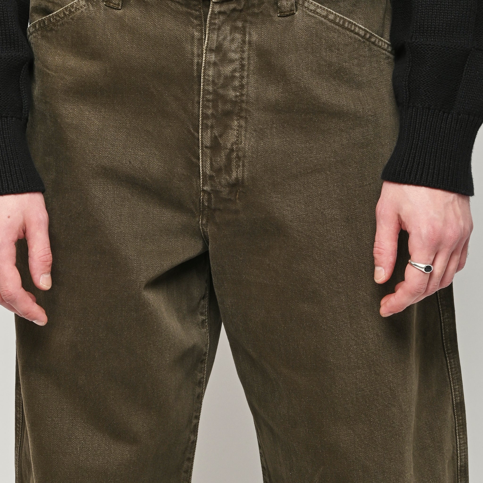 Oversized workwear pants by Lemaire that have been garment dyed to give them a snowy patina.
