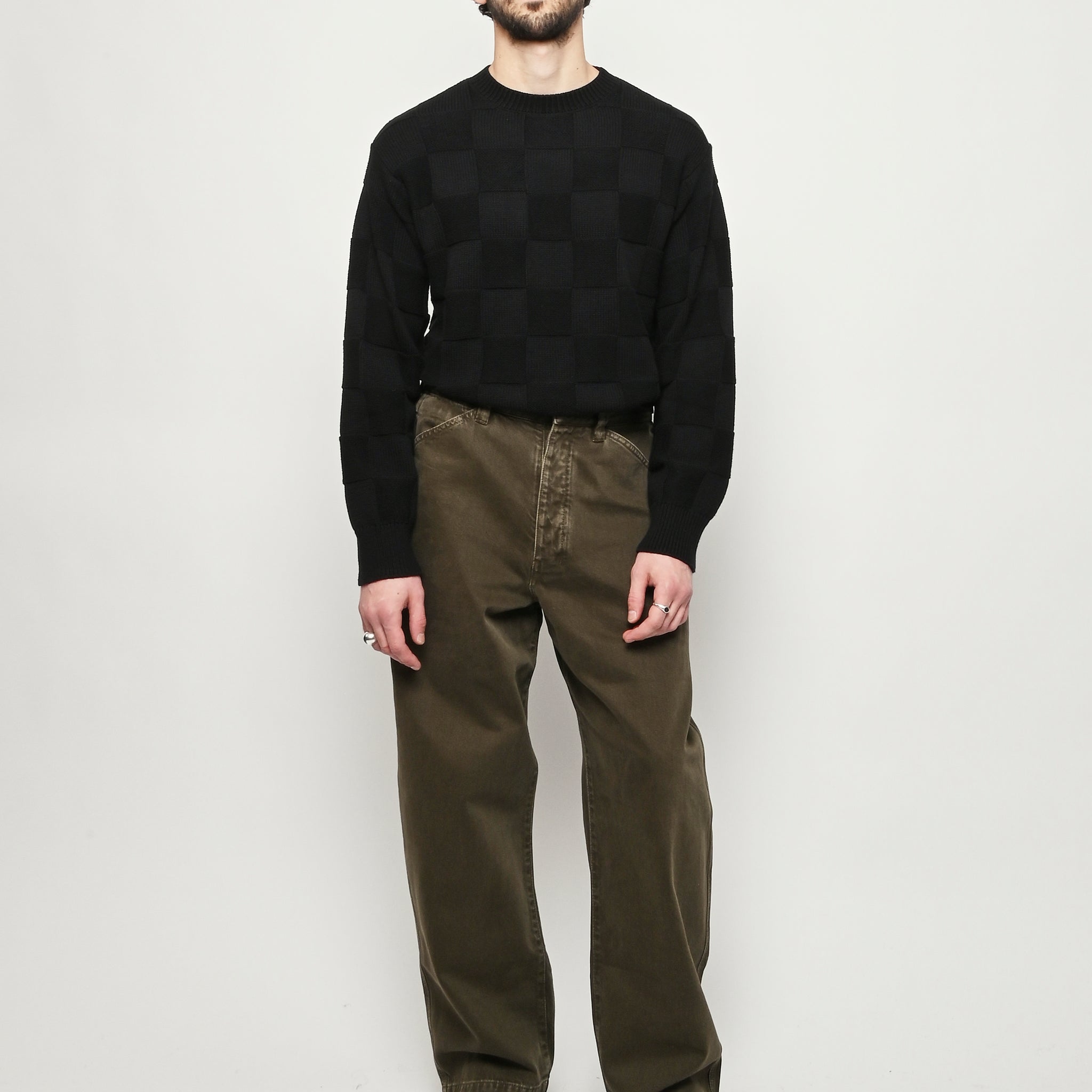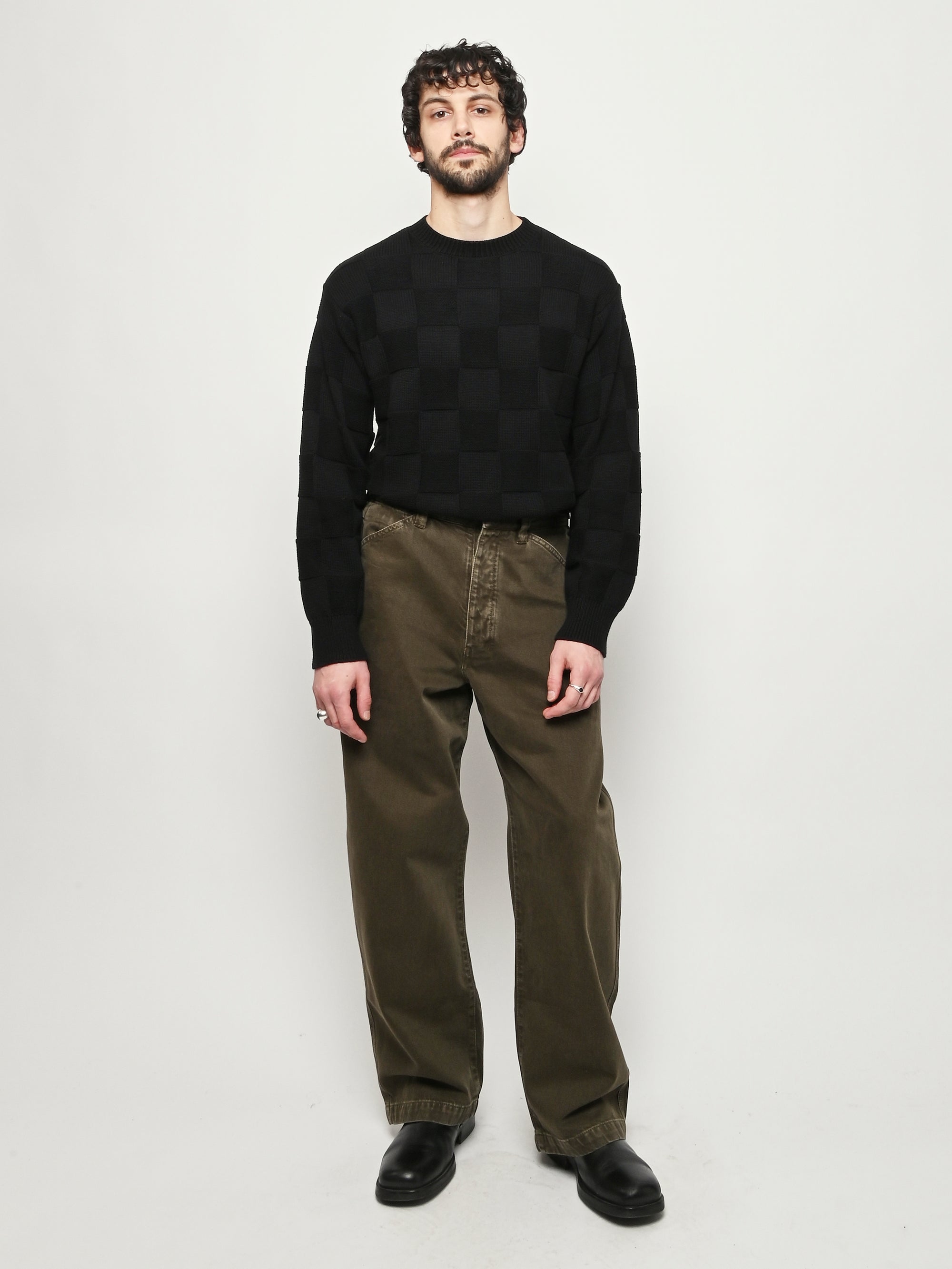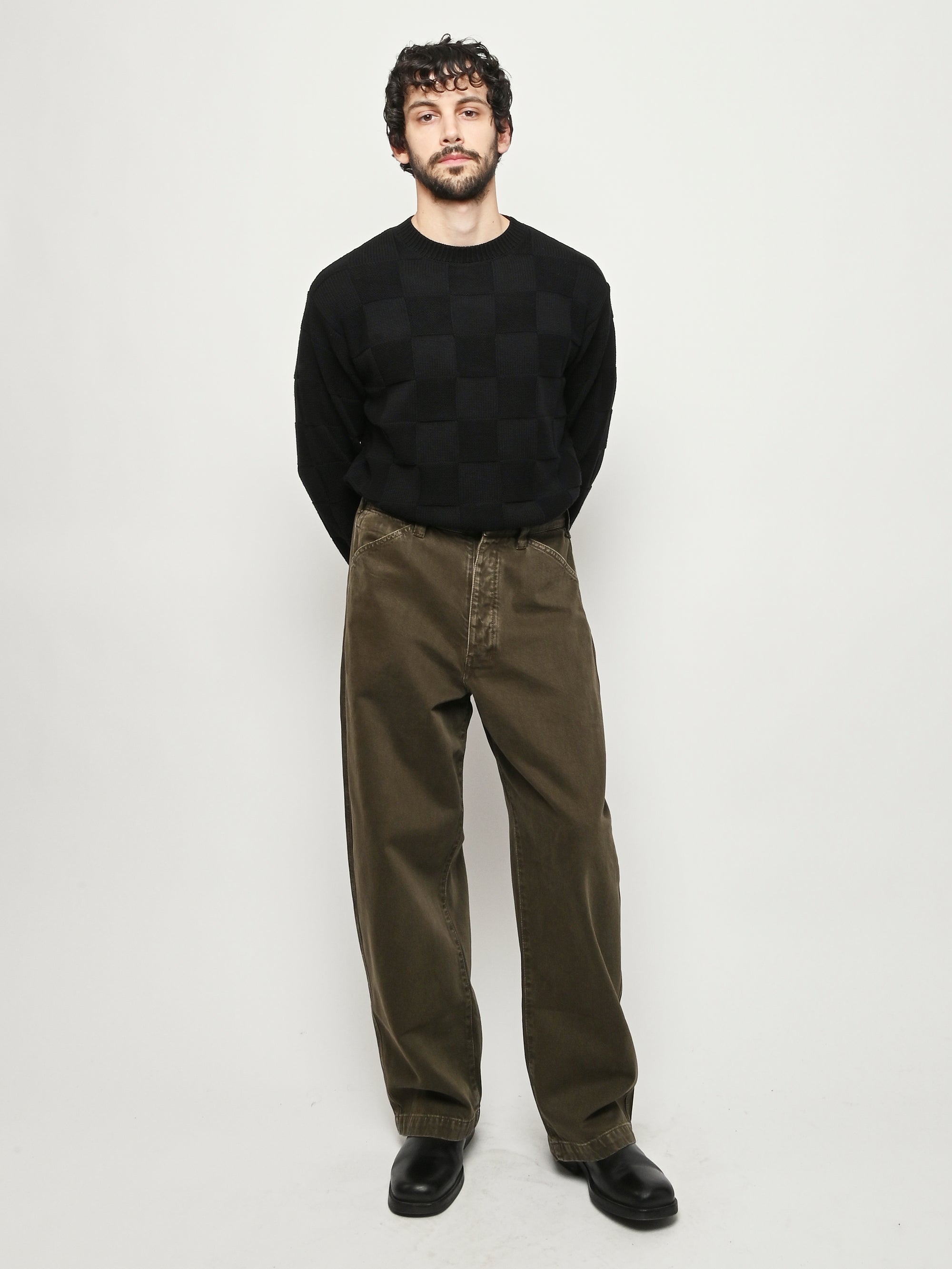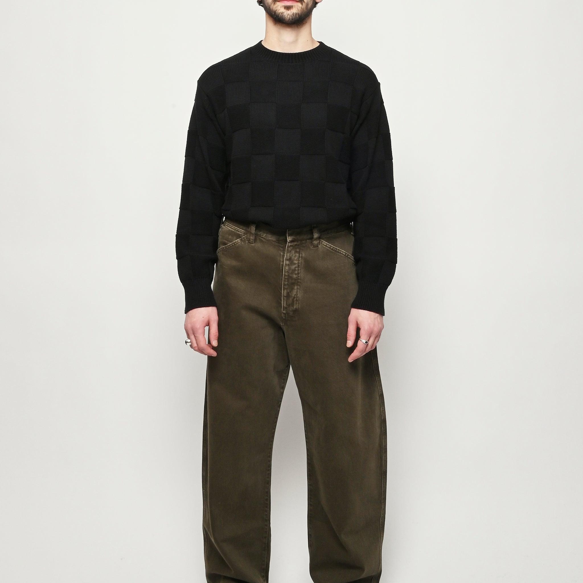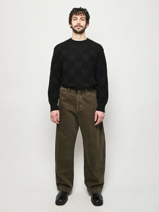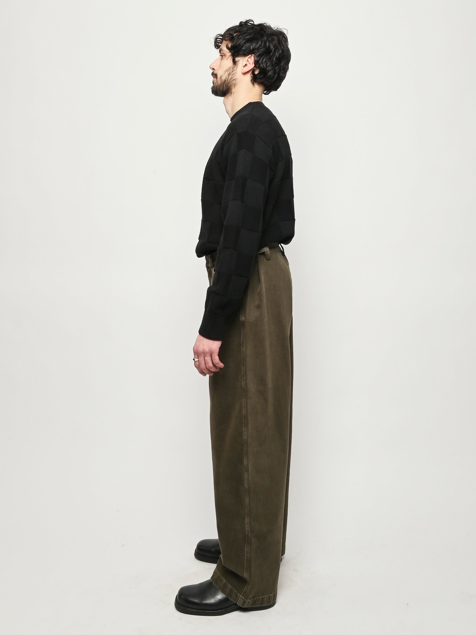 Oversized workwear pants by Lemaire that have been garment dyed to give them a snowy patina.