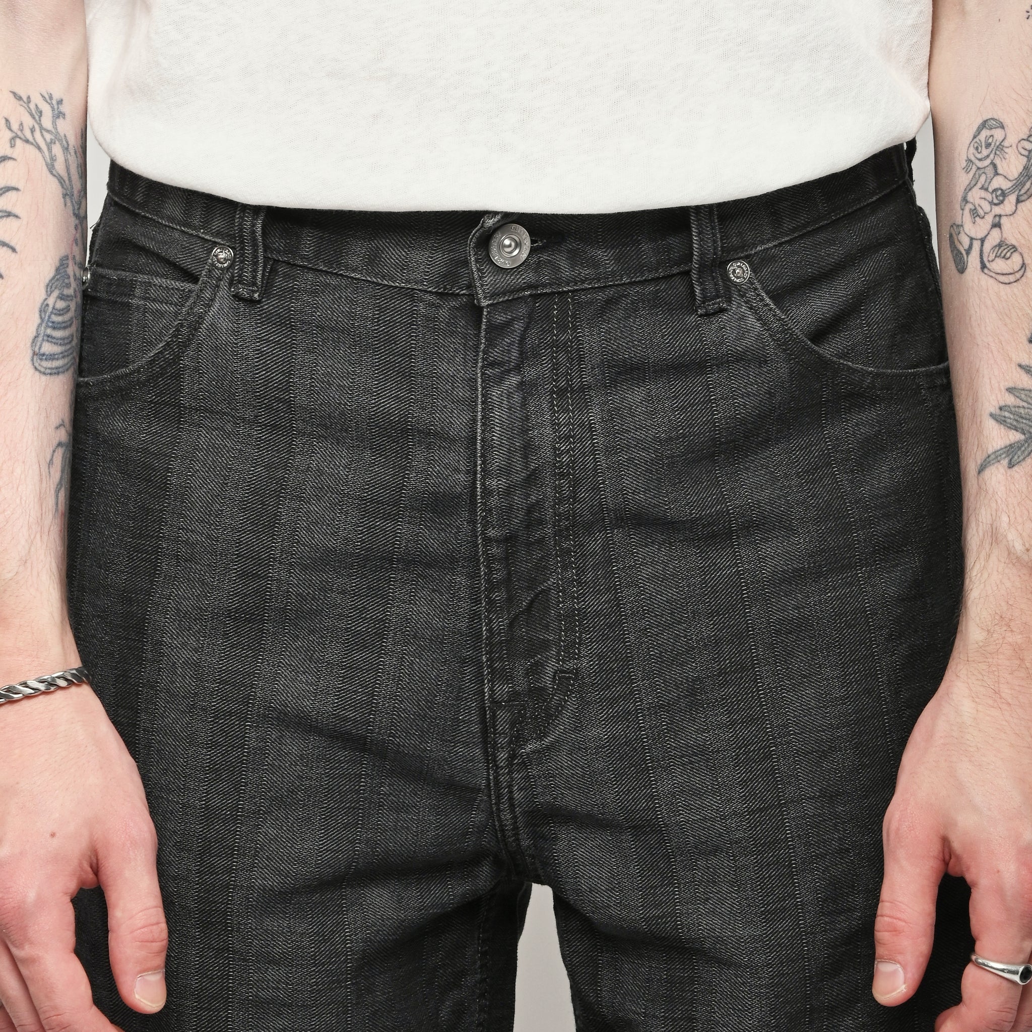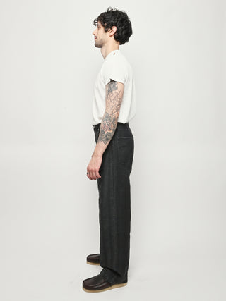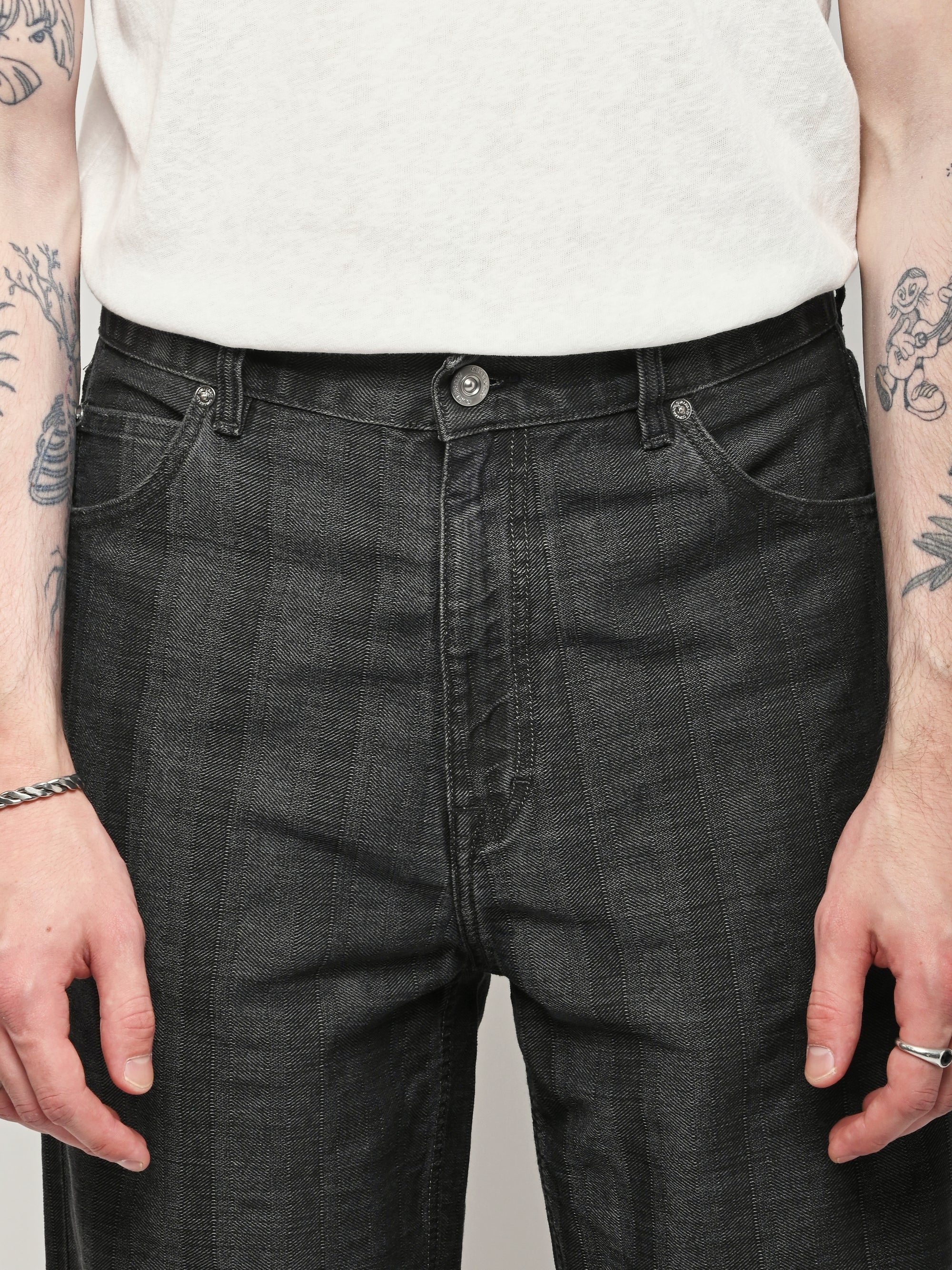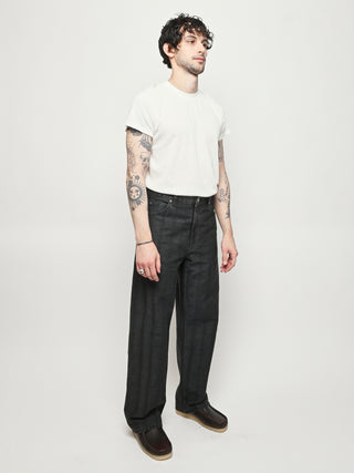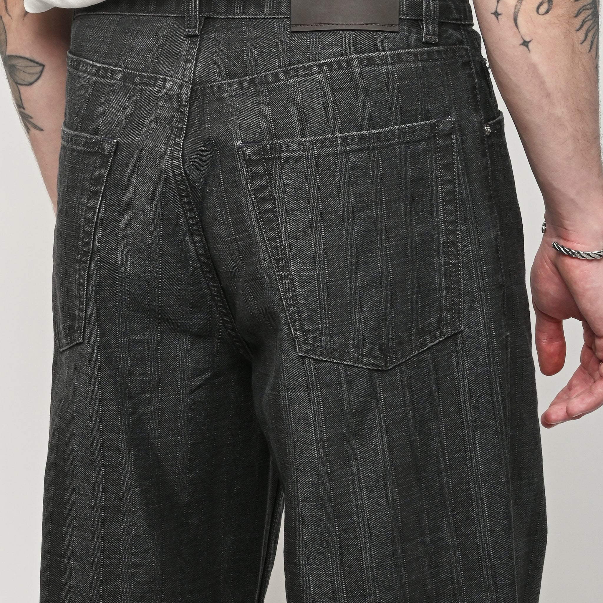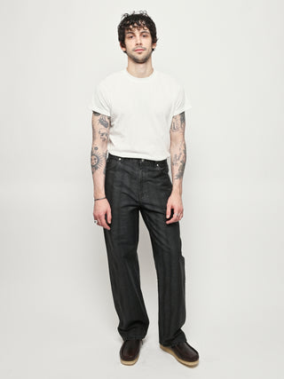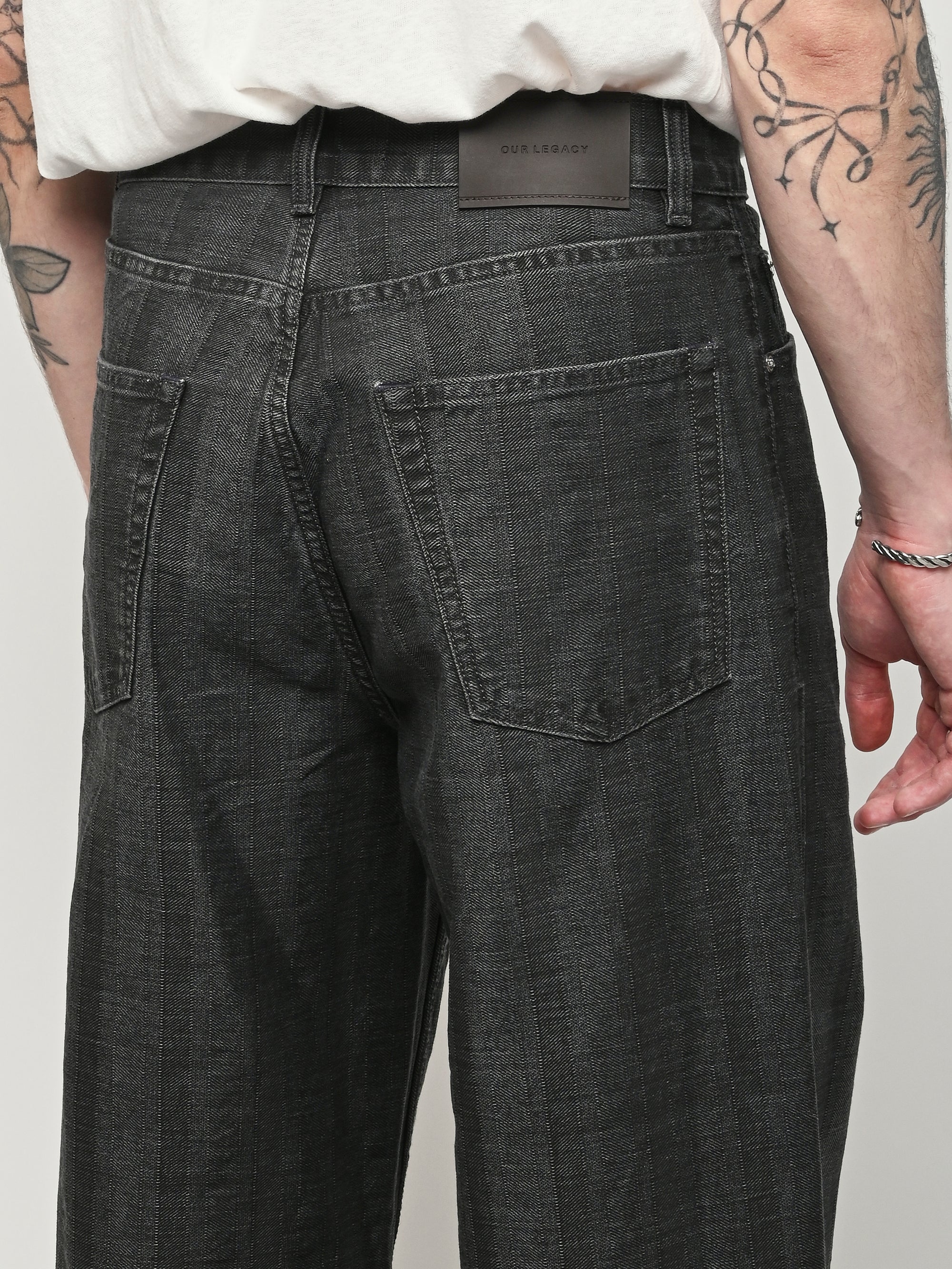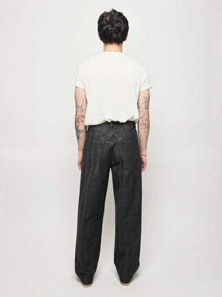 Our Legacy Vast Cut in Black Coated Herringbone. Produced in Italian denim with a pigment print layer, the men's Vast Cut has a wide loose cut with high waist and features a subtle stripe design, YKK zip fly, steel rivets, five pockets, and an embossed OUR LEGACY patch. This fabric starts with a grey denim base woven in a subtle stripe design. A pigment print is layered over the fabric, and through washing, it develops a unique, shadowy, and murky appearance. Over time, as the fabric fades, the underlying stripe design becomes more evident, adding depth and character to the garment.