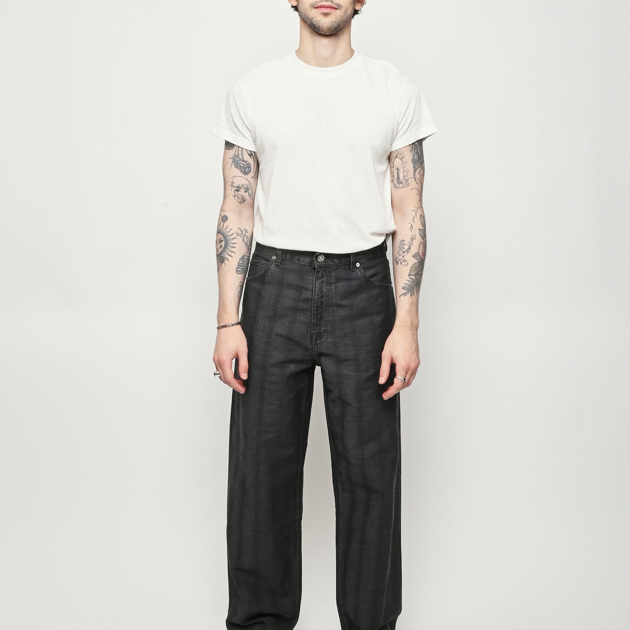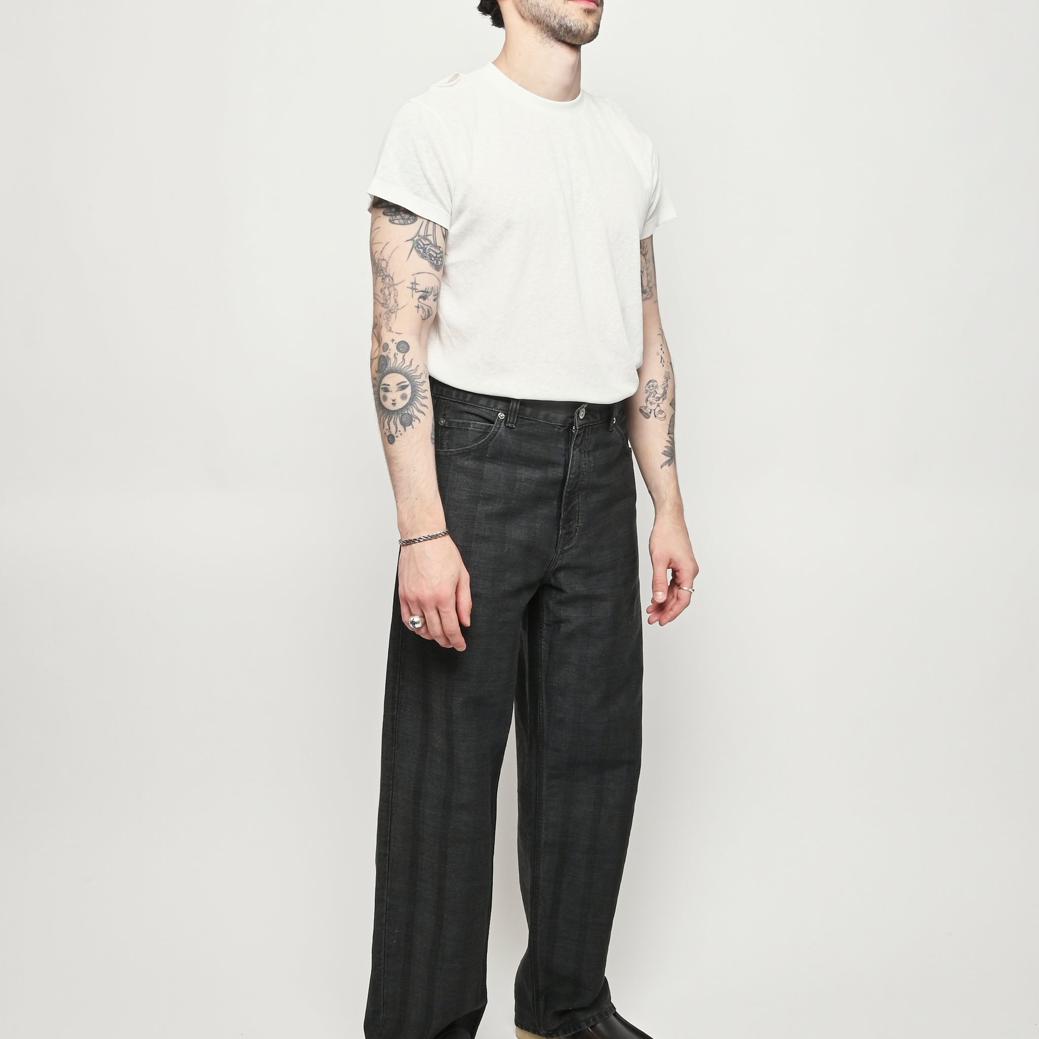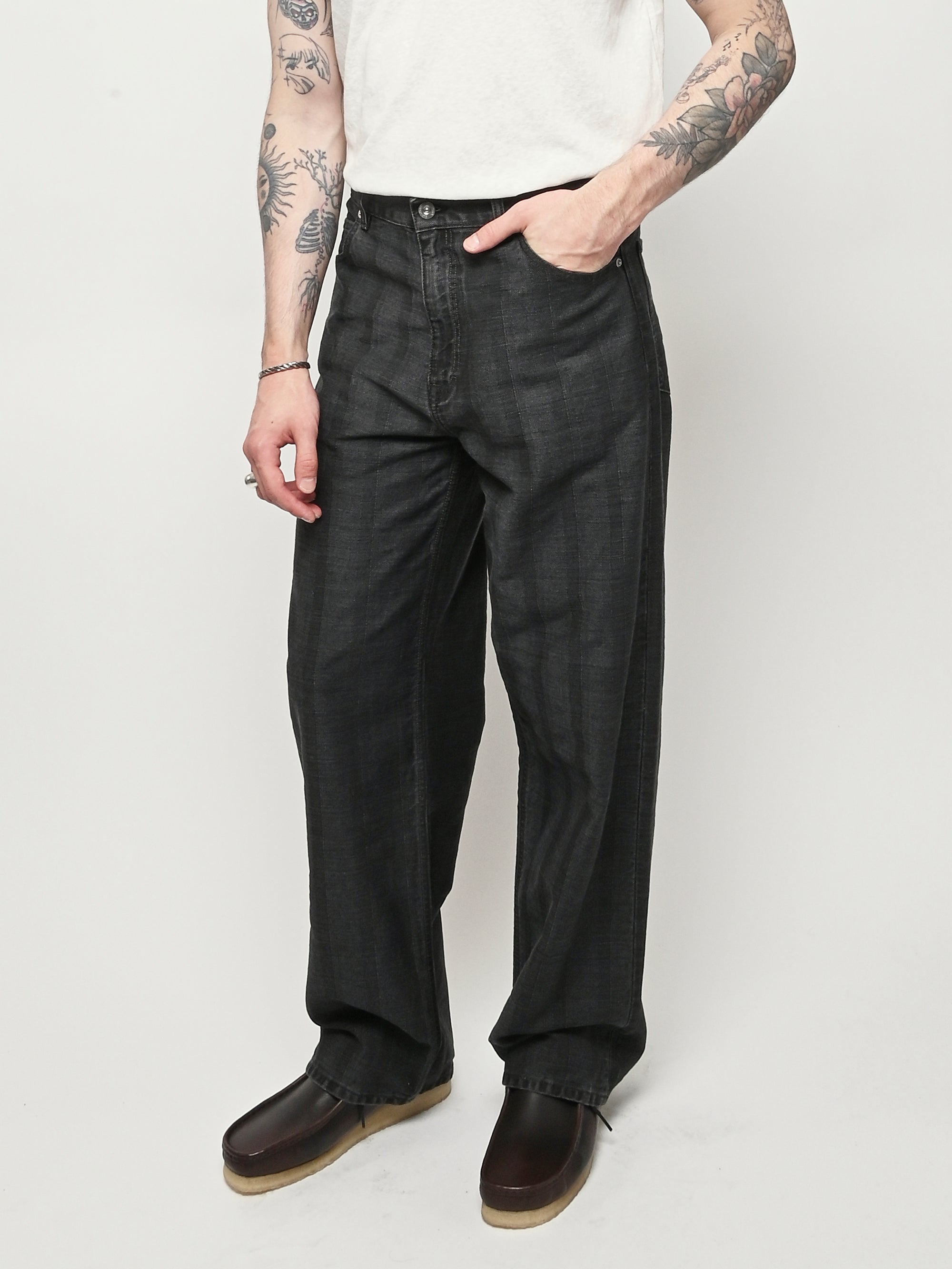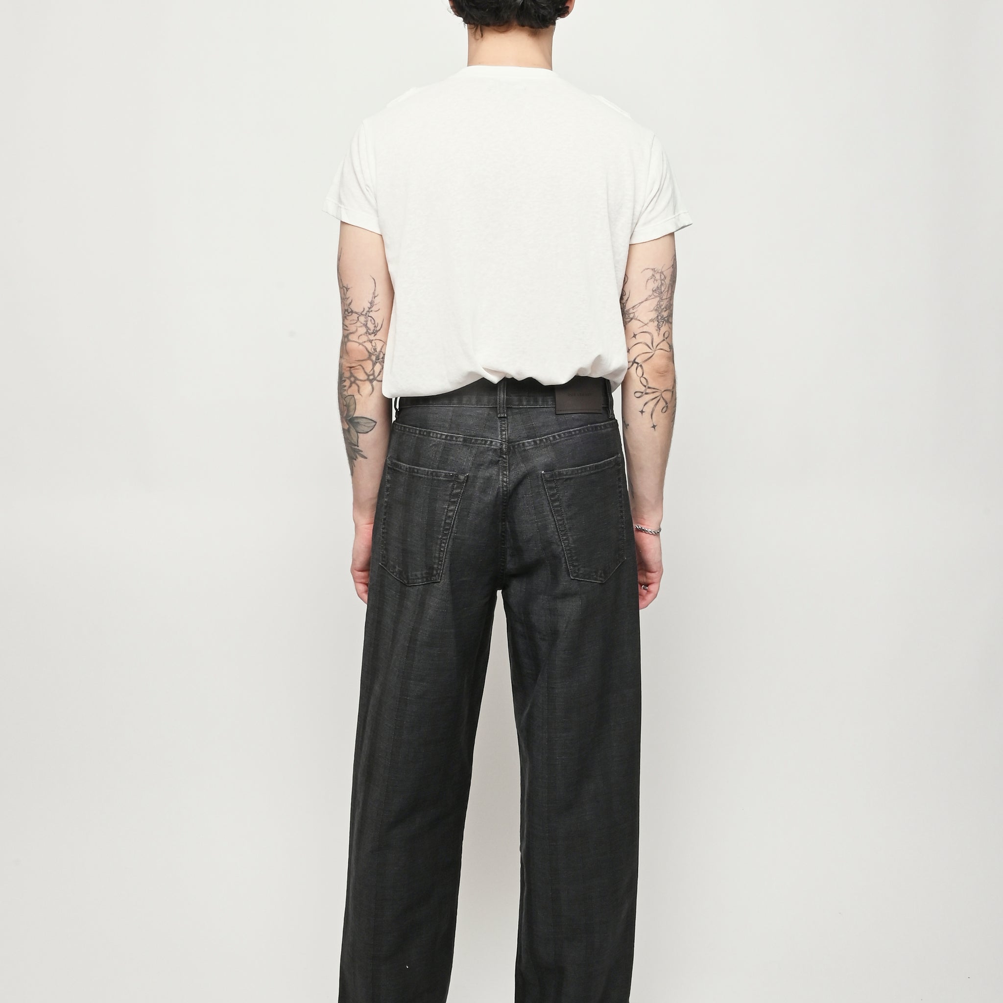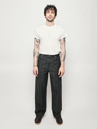 Our Legacy Vast Cut in Black Coated Herringbone. Produced in Italian denim with a pigment print layer, the men's Vast Cut has a wide loose cut with high waist and features a subtle stripe design, YKK zip fly, steel rivets, five pockets, and an embossed OUR LEGACY patch. This fabric starts with a grey denim base woven in a subtle stripe design. A pigment print is layered over the fabric, and through washing, it develops a unique, shadowy, and murky appearance. Over time, as the fabric fades, the underlying stripe design becomes more evident, adding depth and character to the garment.