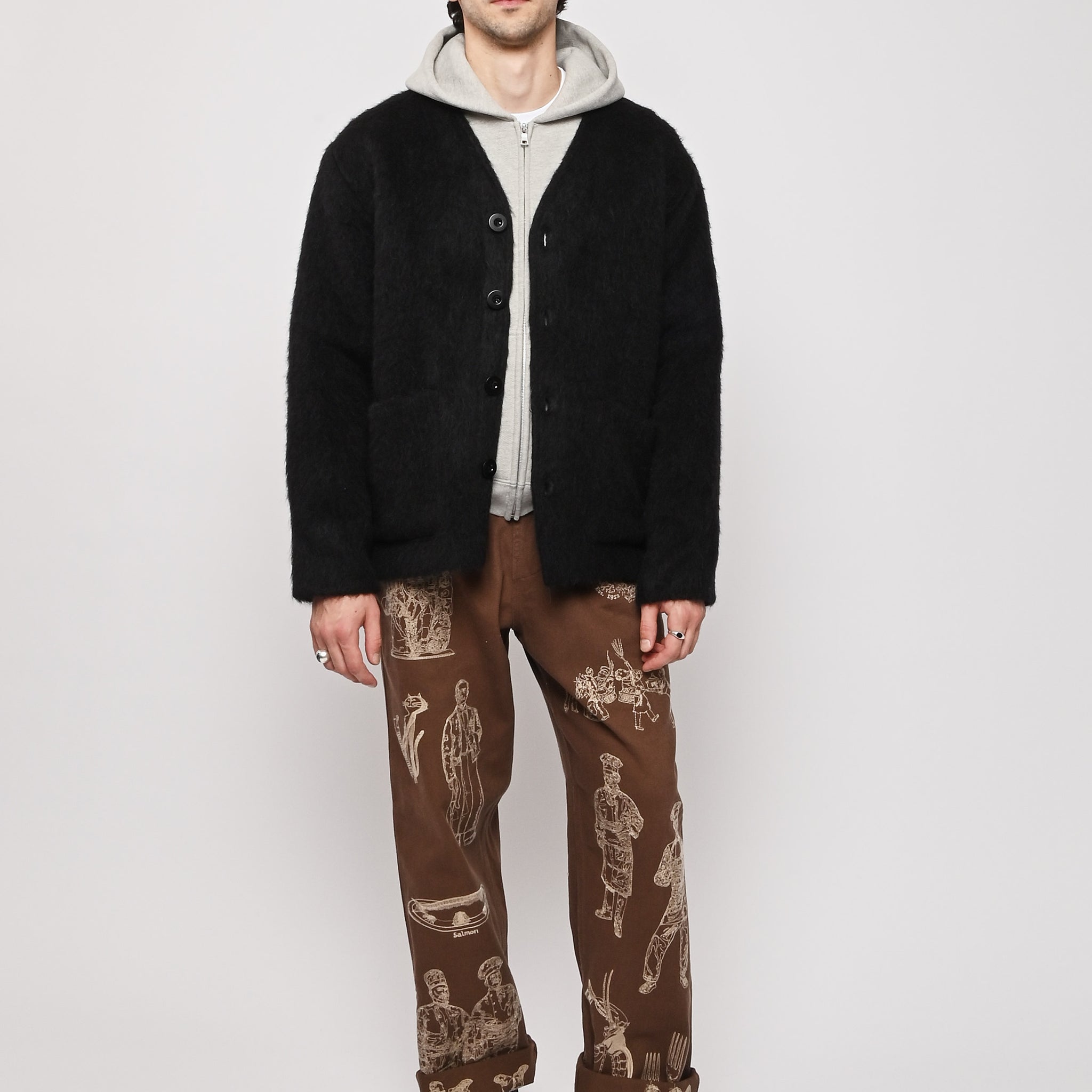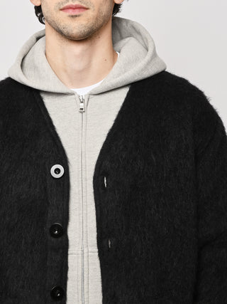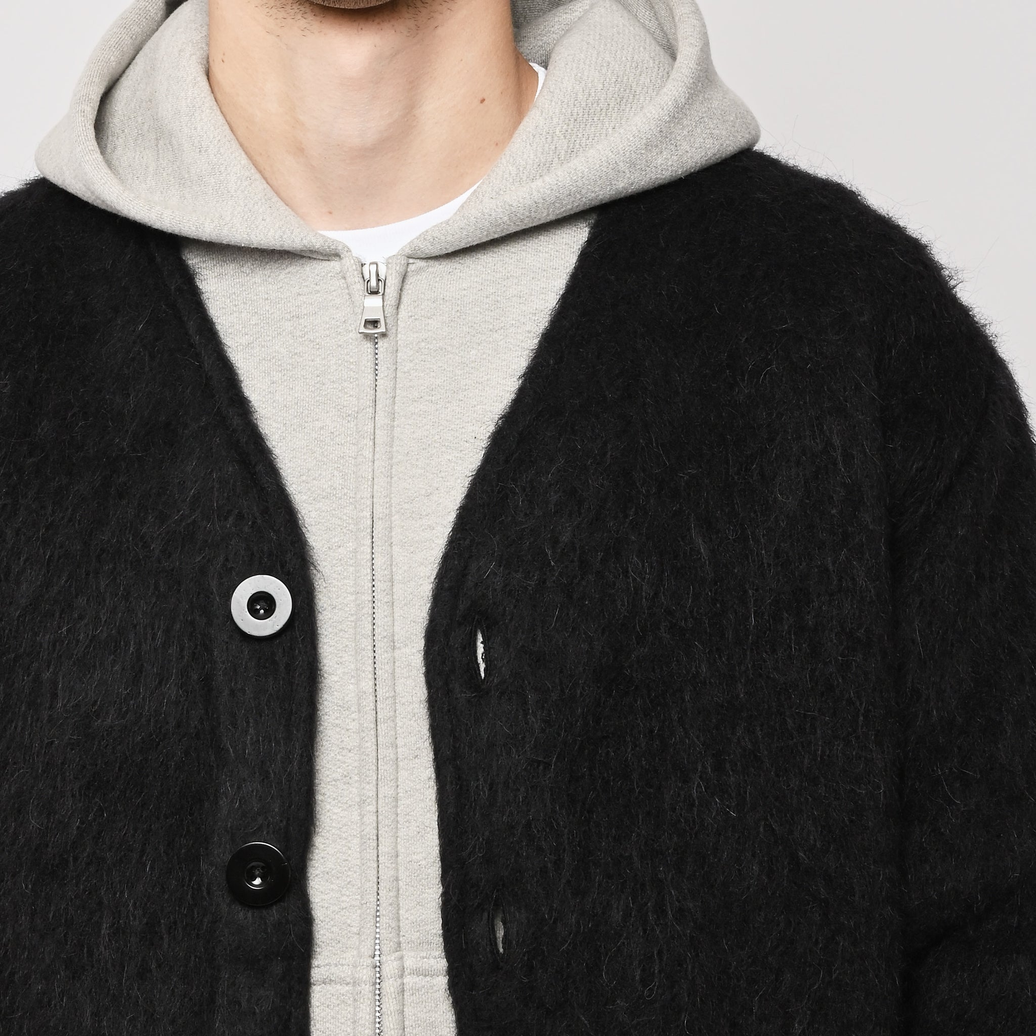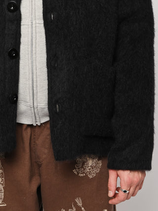 Our Legacy's Cardigan in Black Mohair. Produced in a soft Italian wool blend fabric with a hairy texture, the versatile mens Cardigan has a relaxed, boxy fit and features a v-neck collar, two front pockets and bone buttons.