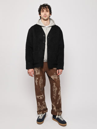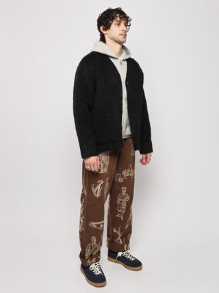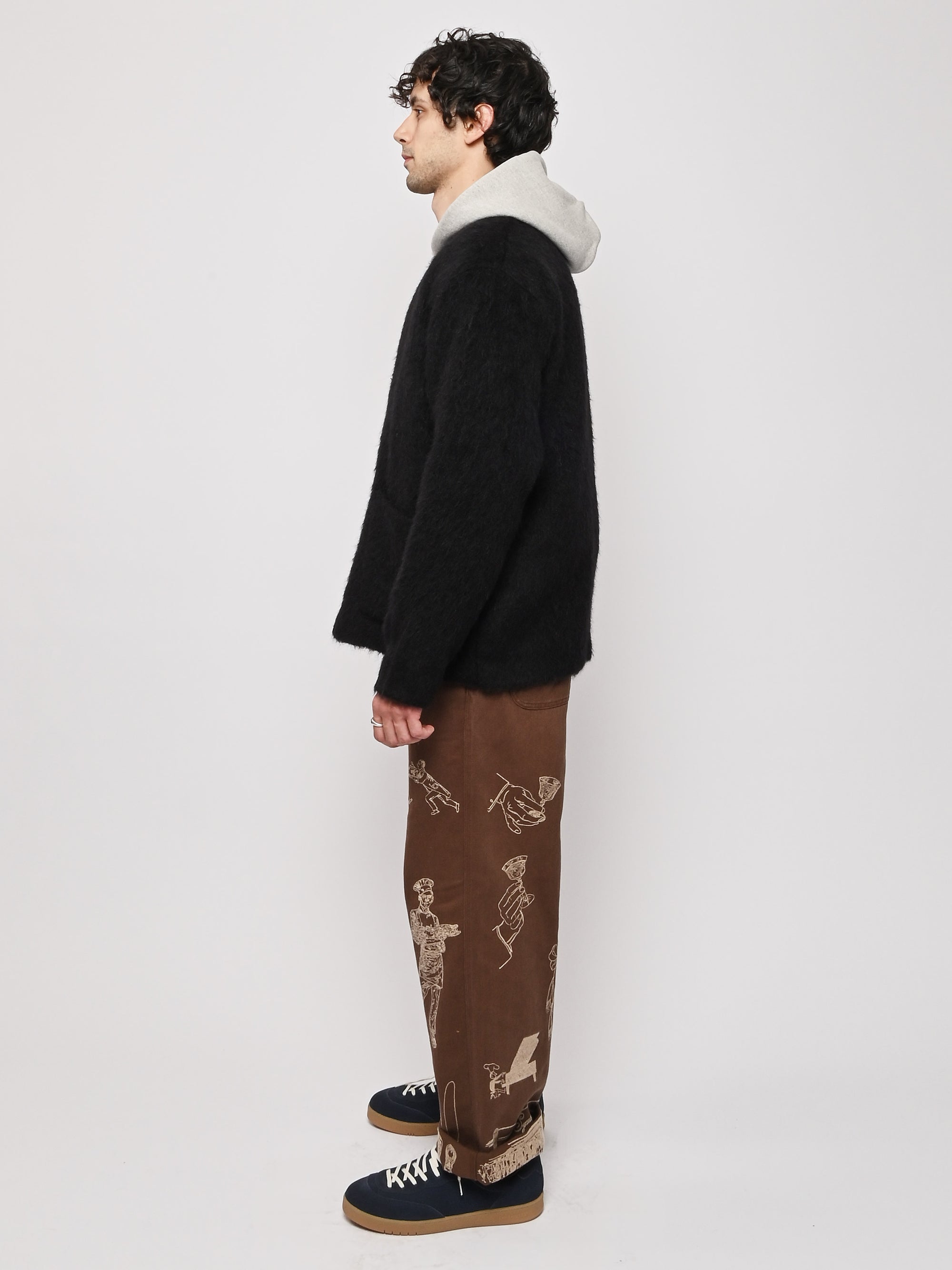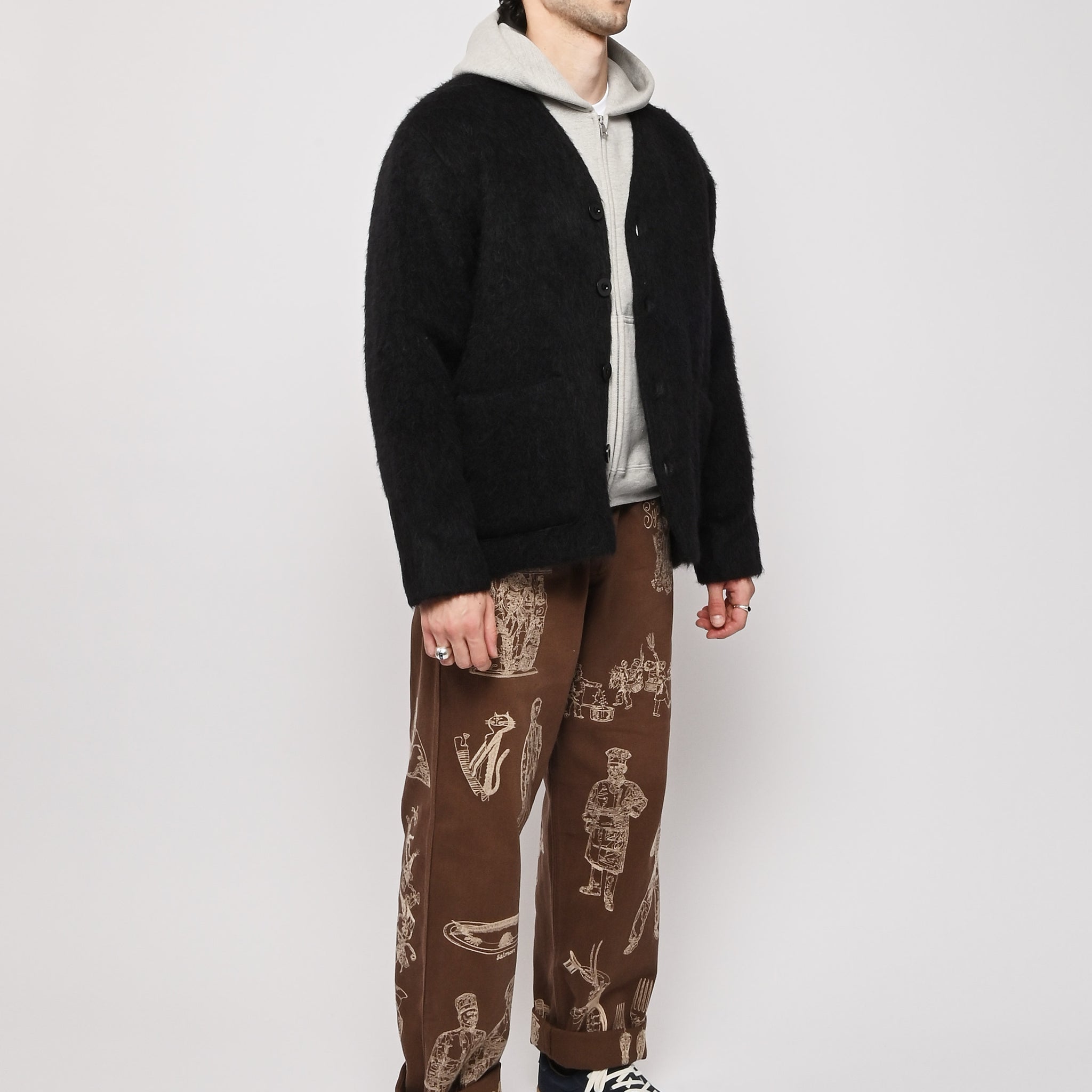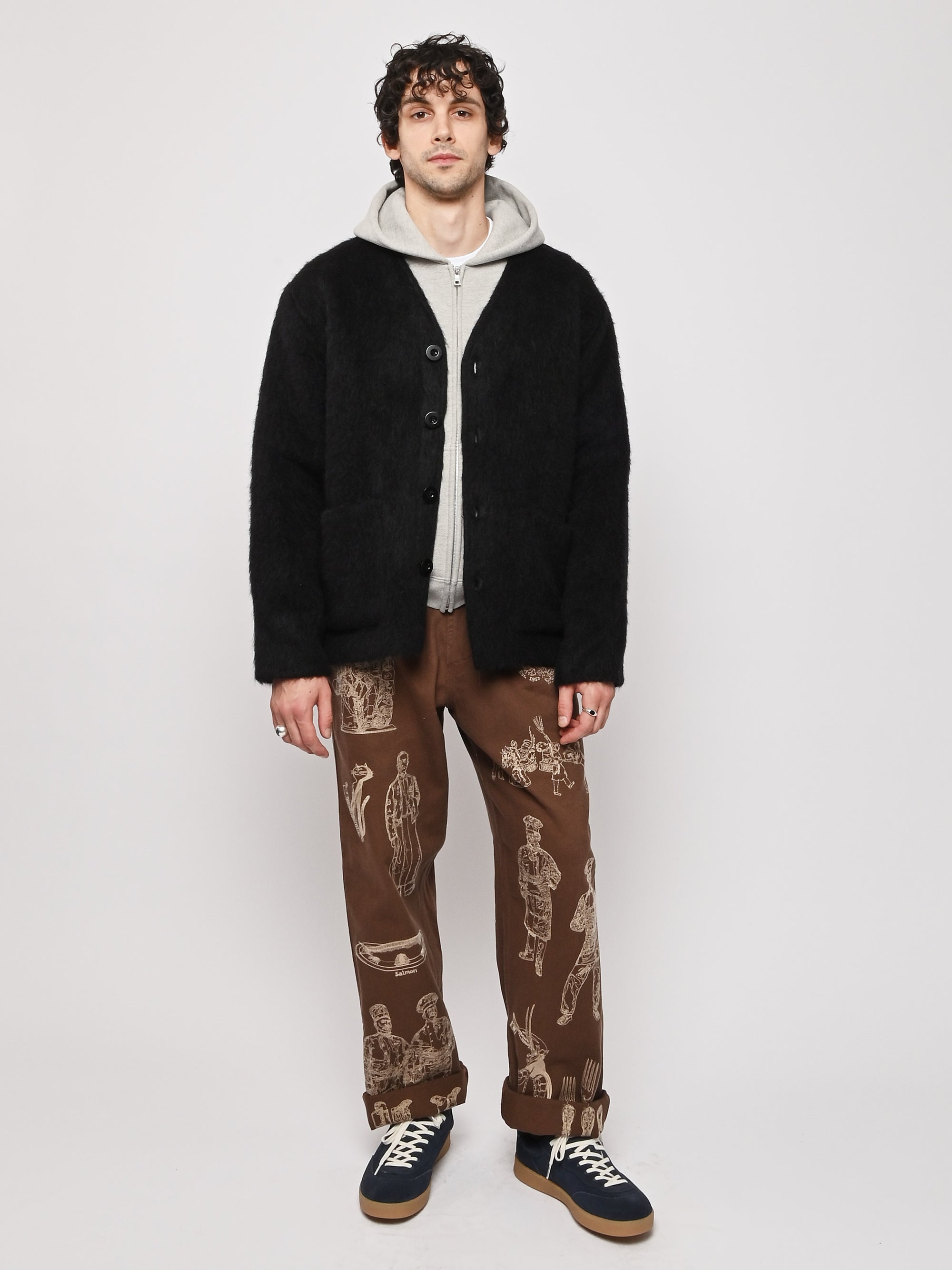 Our Legacy's Cardigan in Black Mohair. Produced in a soft Italian wool blend fabric with a hairy texture, the versatile mens Cardigan has a relaxed, boxy fit and features a v-neck collar, two front pockets and bone buttons.