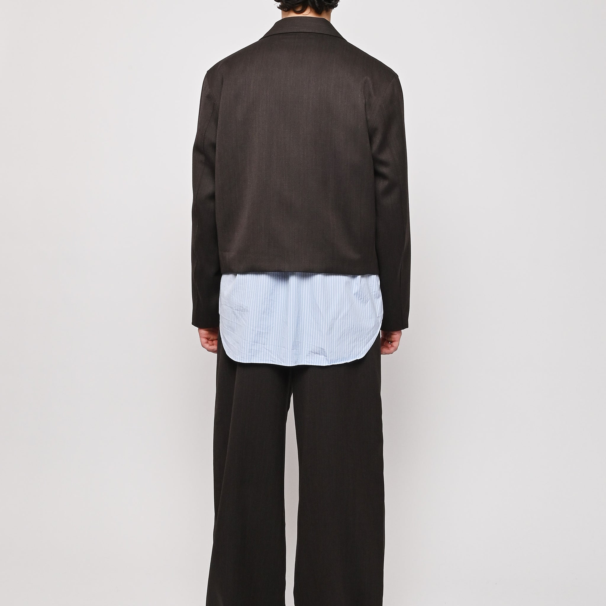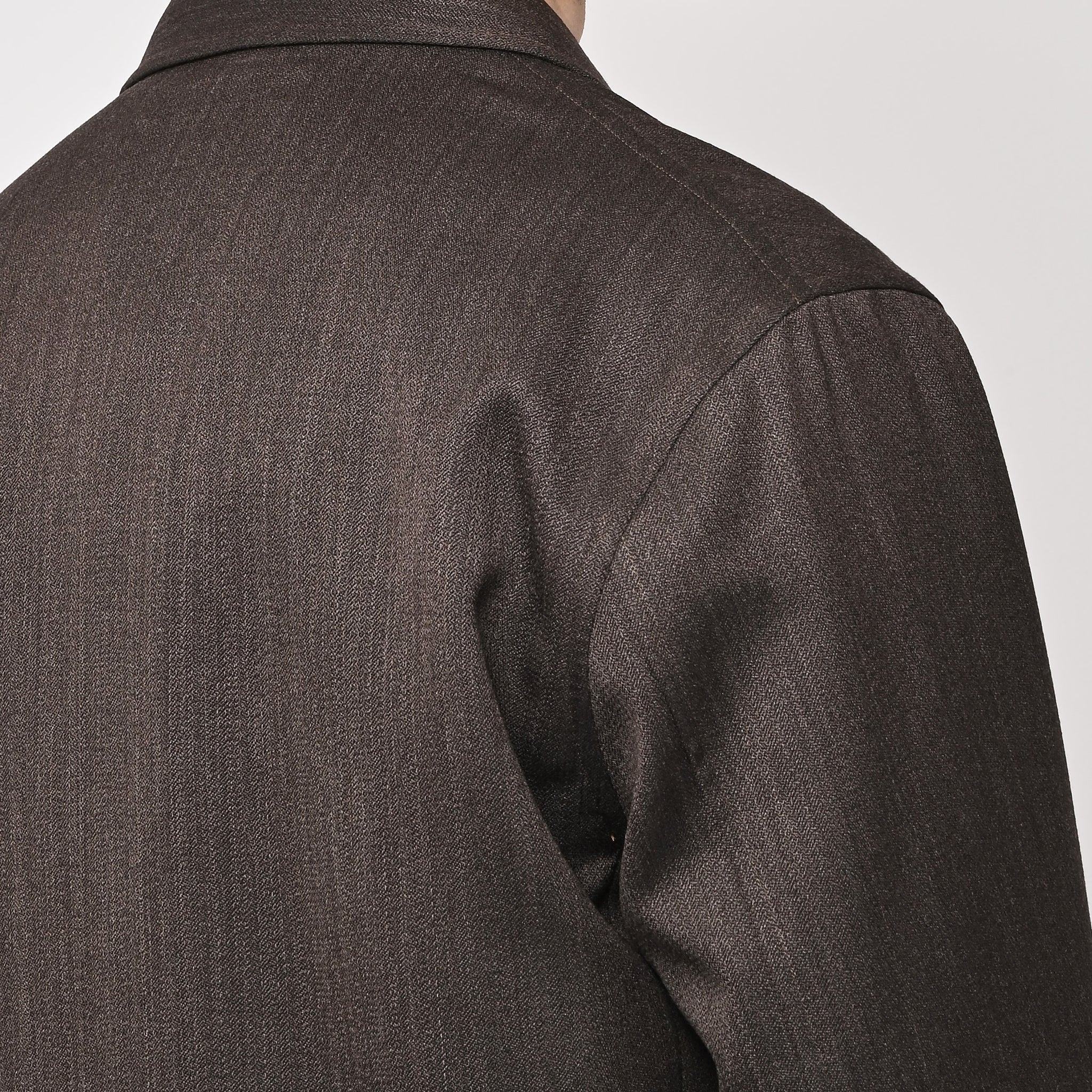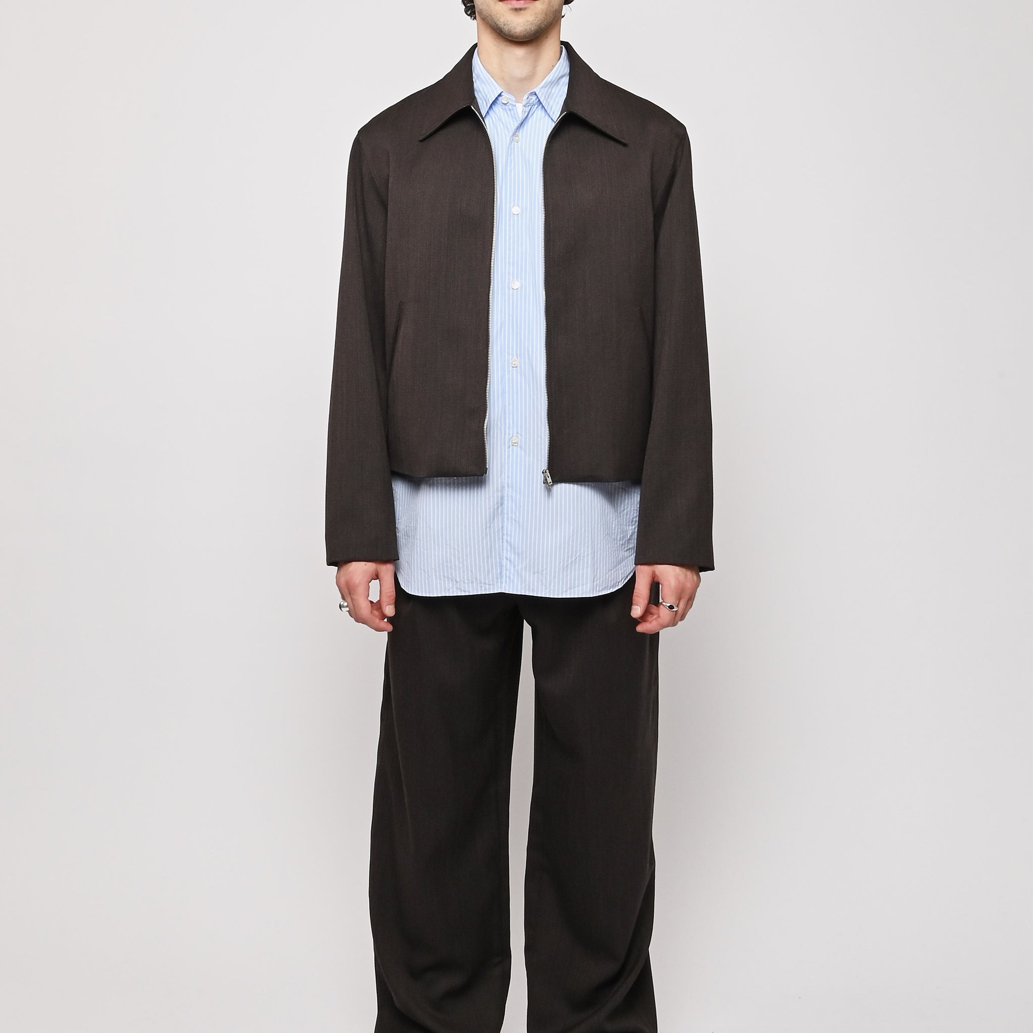 Our Legacy's Mini Jacket in Havana Brown Chain Wool. Produced in Italian suiting fabric made from virgin wool, the men's Mini Jacket has a minimalist, boxy fit and features full lining, a RiRi two way zip and jet front pockets.