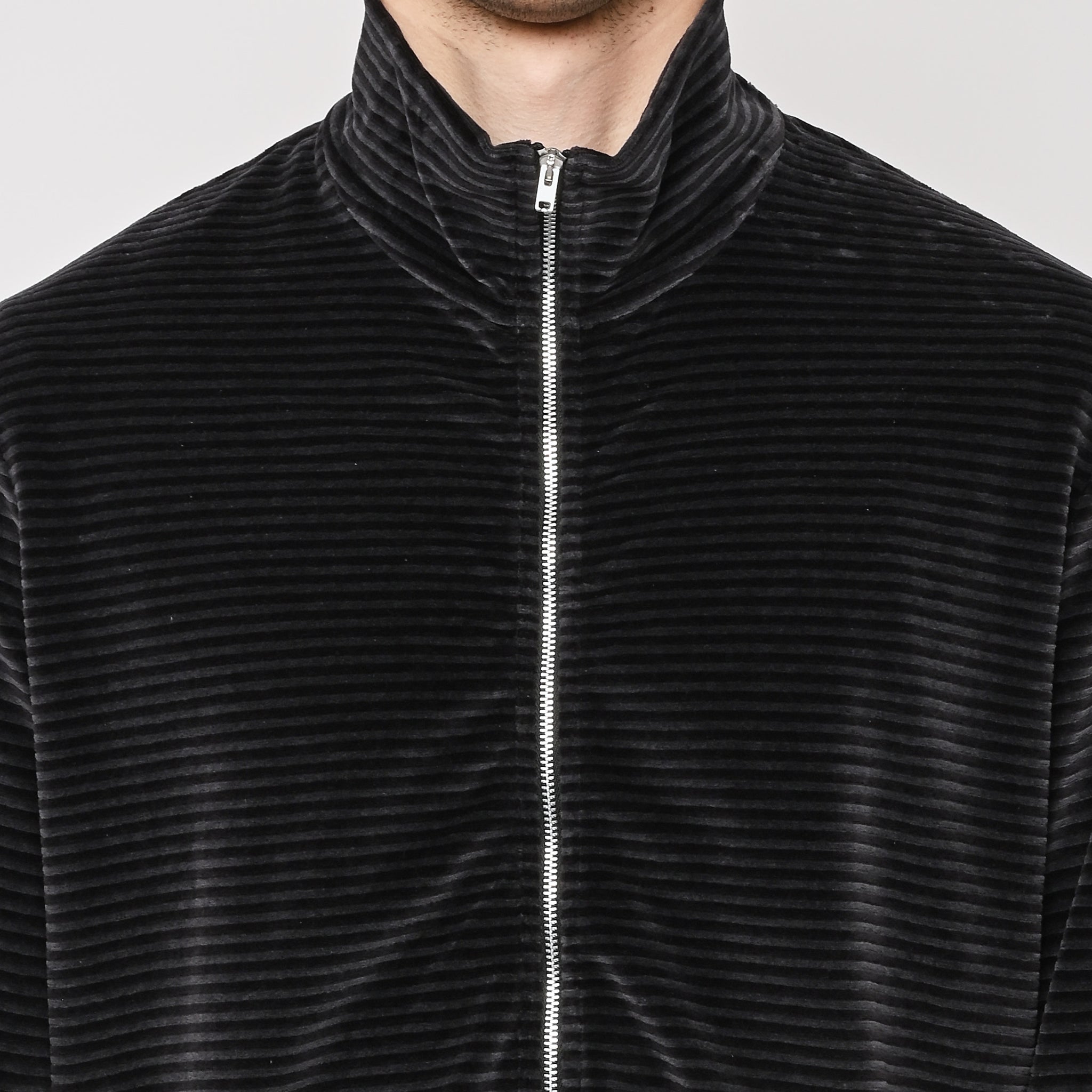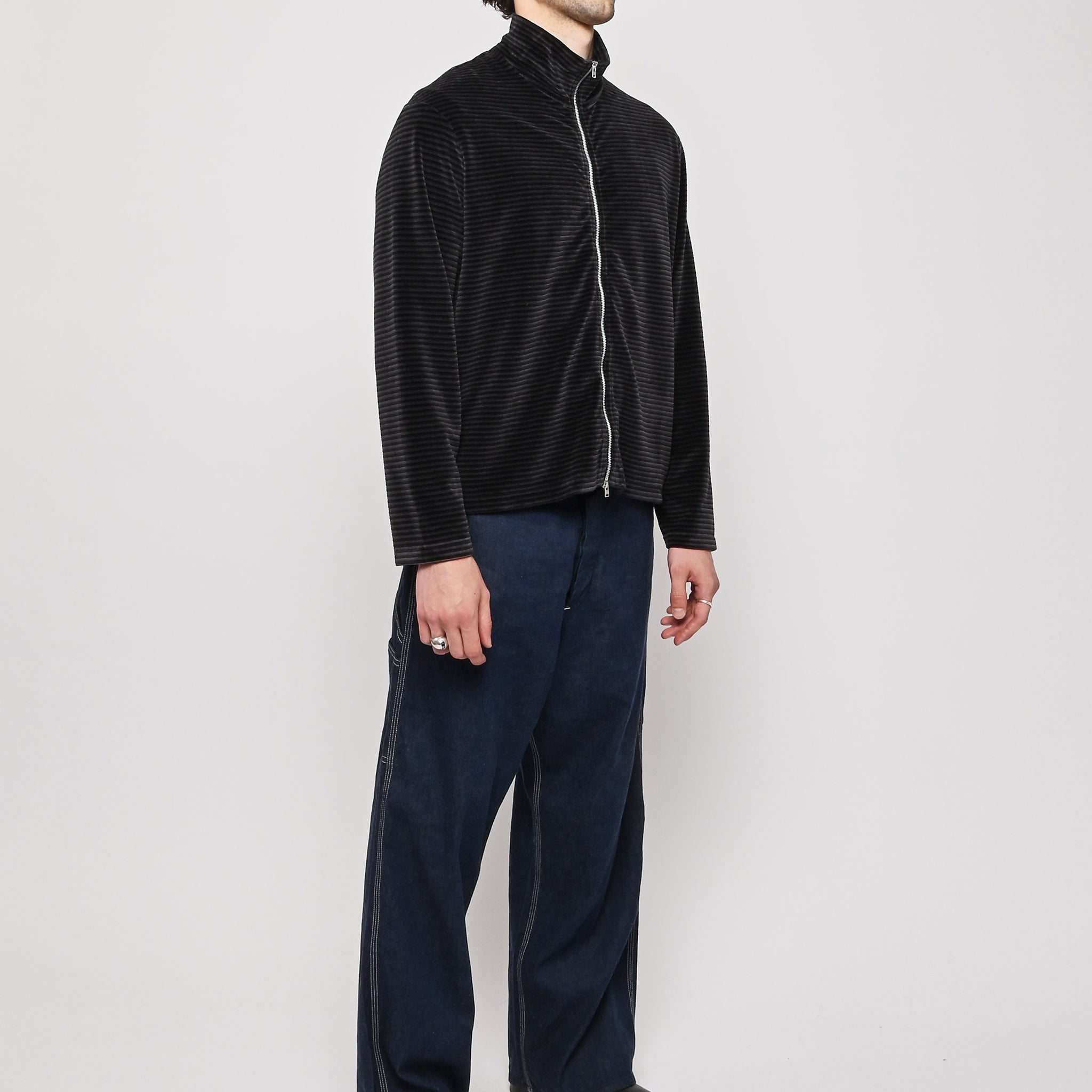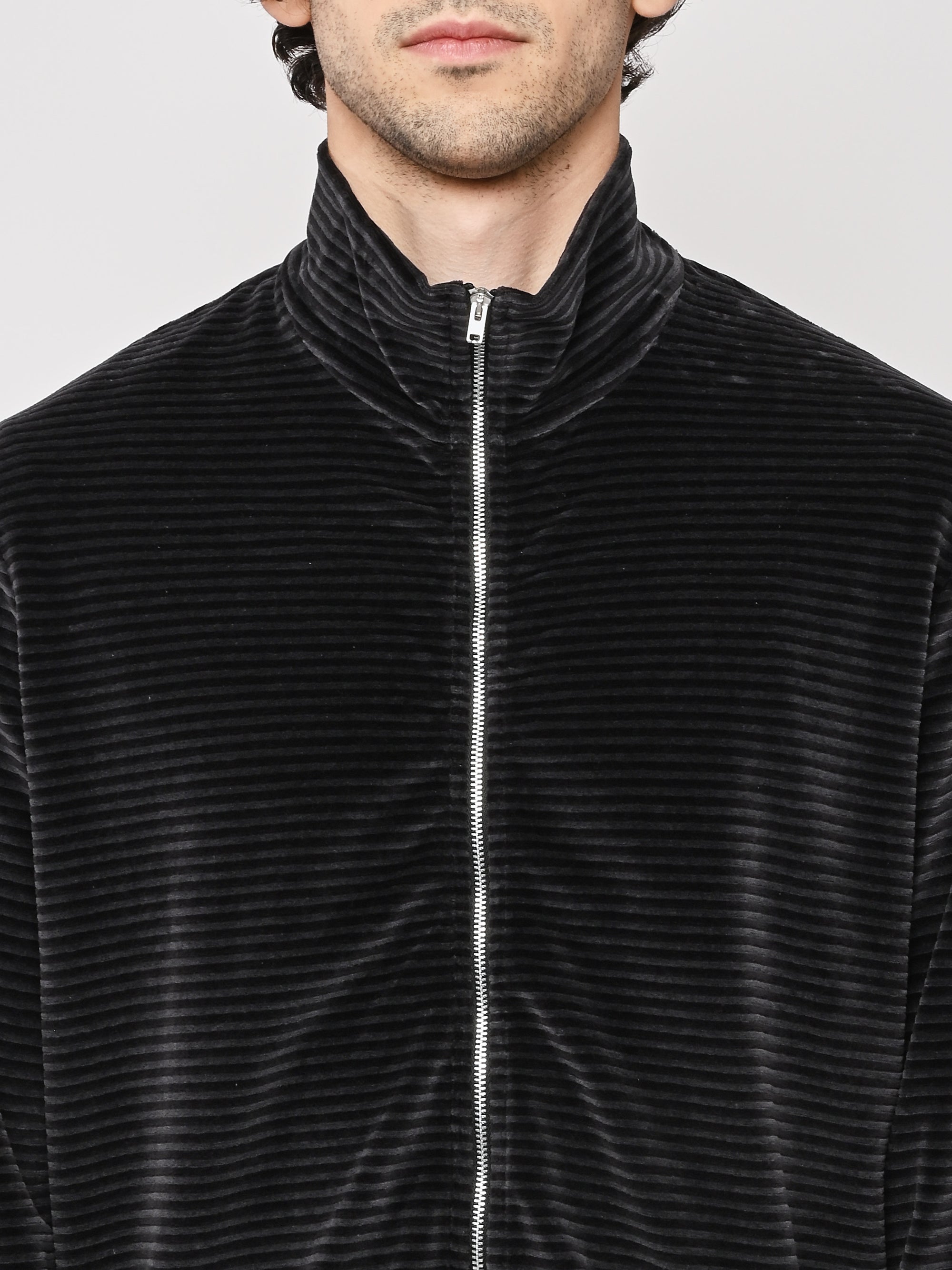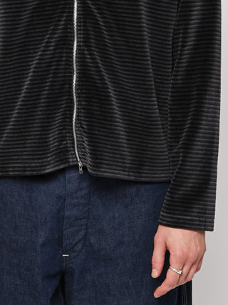 Our Legacy Shrunken Fullzip Polo in Phantom Stripe Velour. Produced in a soft textured Portuguese cotton blend velour fabric, the men's striped Shrunken Fullzip Polo has a regular, short boxy fit and features a Lampo two way zip, long sleeves and a straight hem.