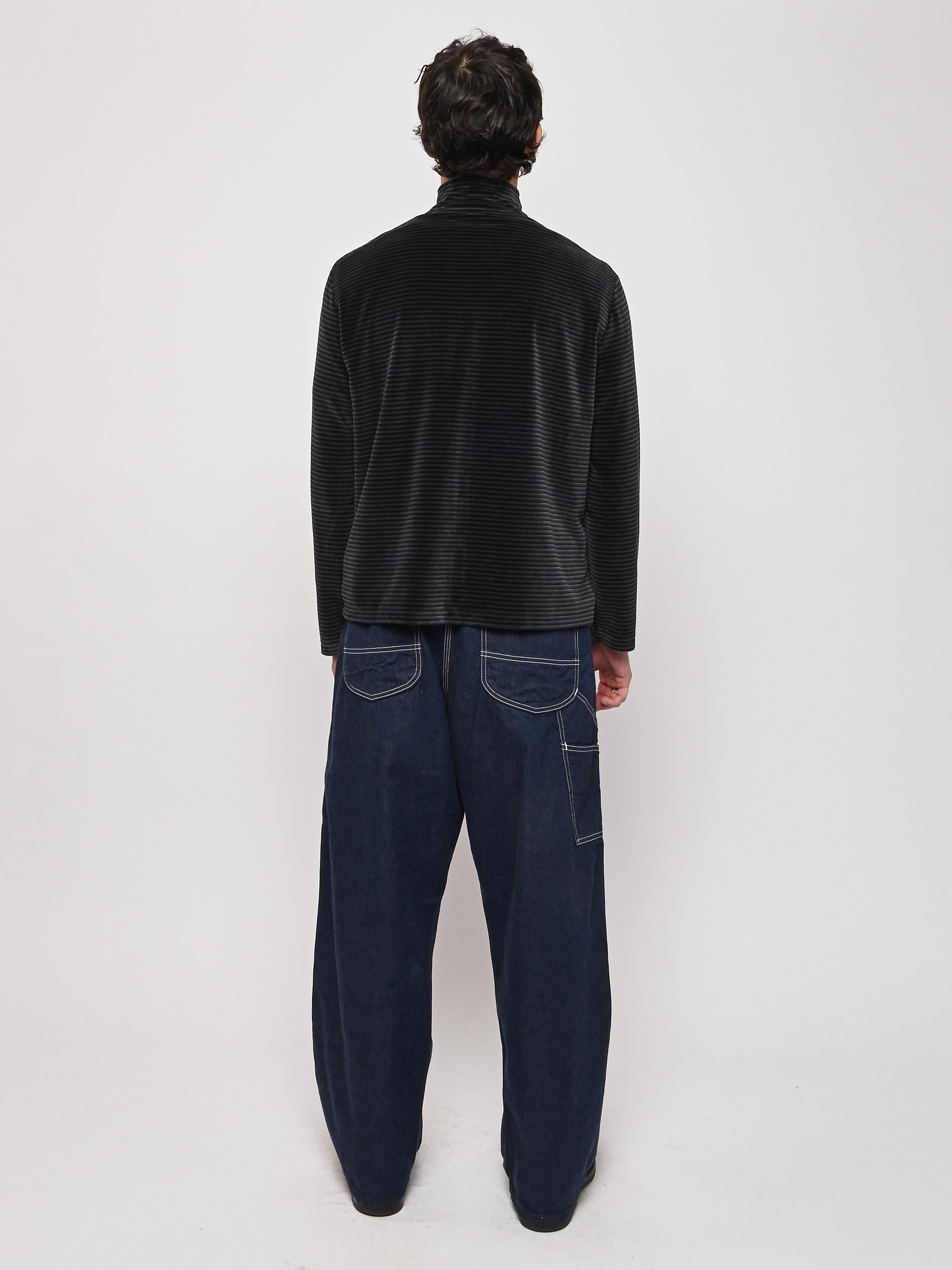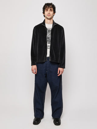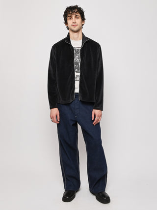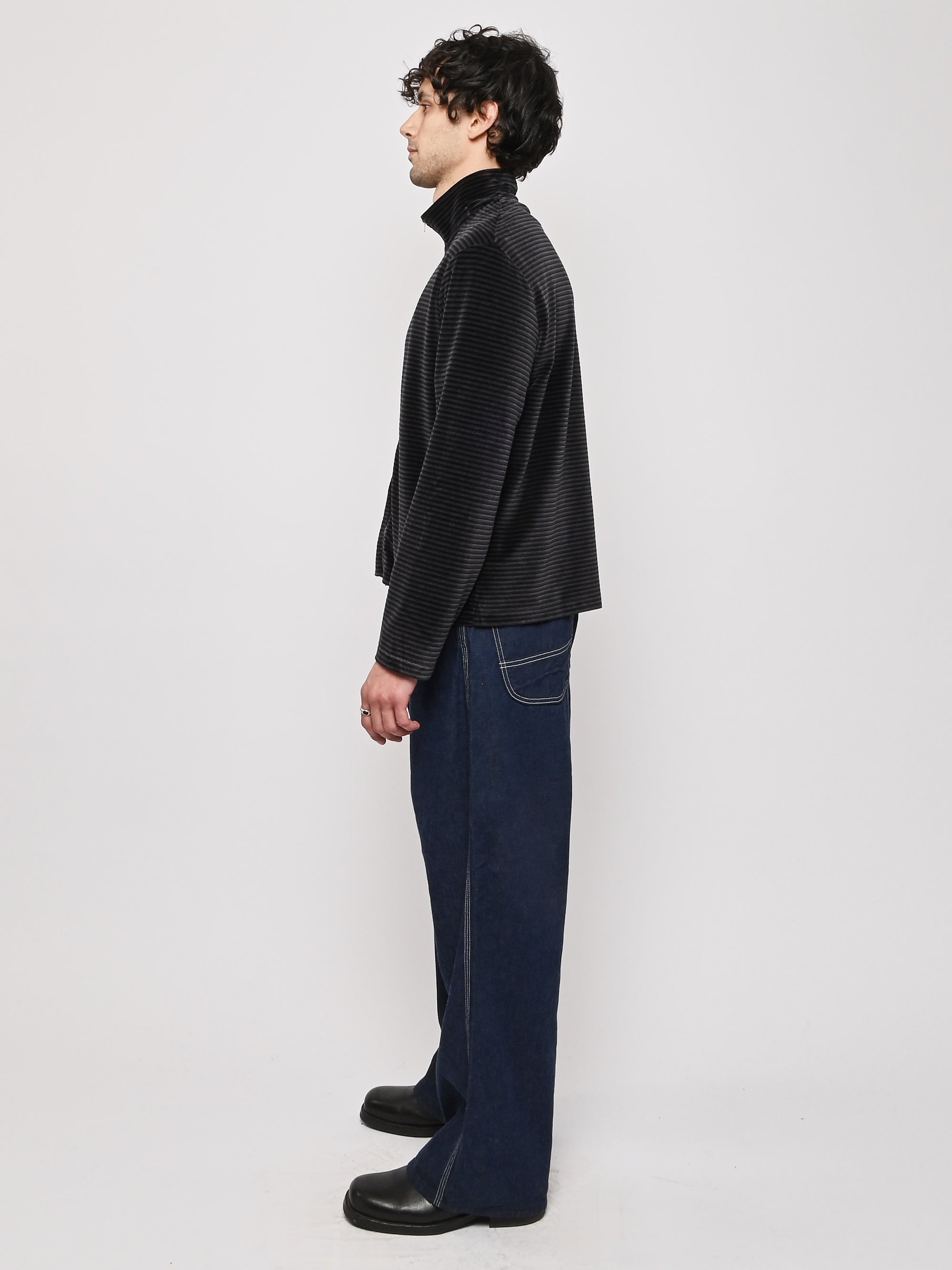Our Legacy Shrunken Fullzip Polo in Phantom Stripe Velour. Produced in a soft textured Portuguese cotton blend velour fabric, the men's striped Shrunken Fullzip Polo has a regular, short boxy fit and features a Lampo two way zip, long sleeves and a straight hem.