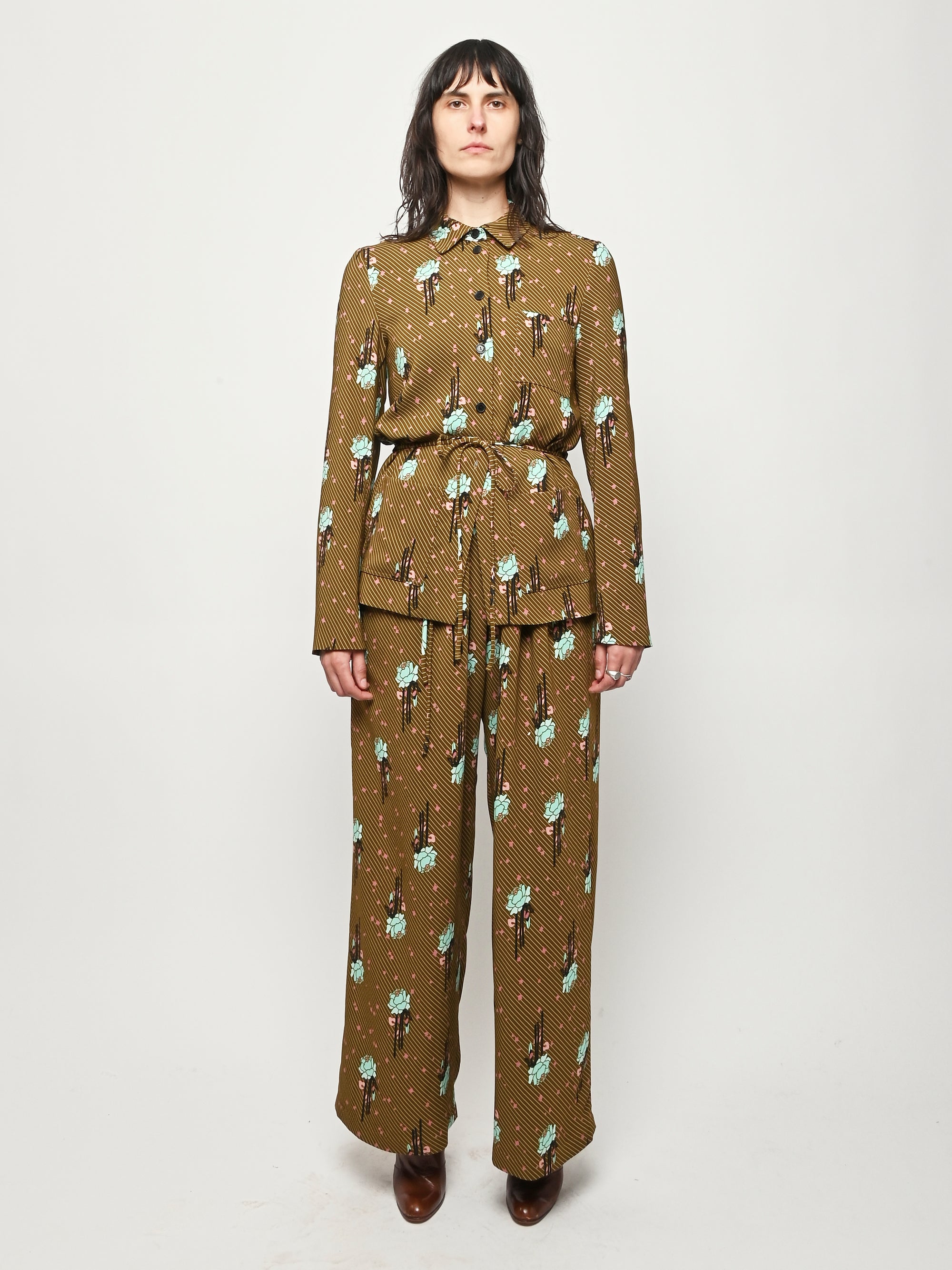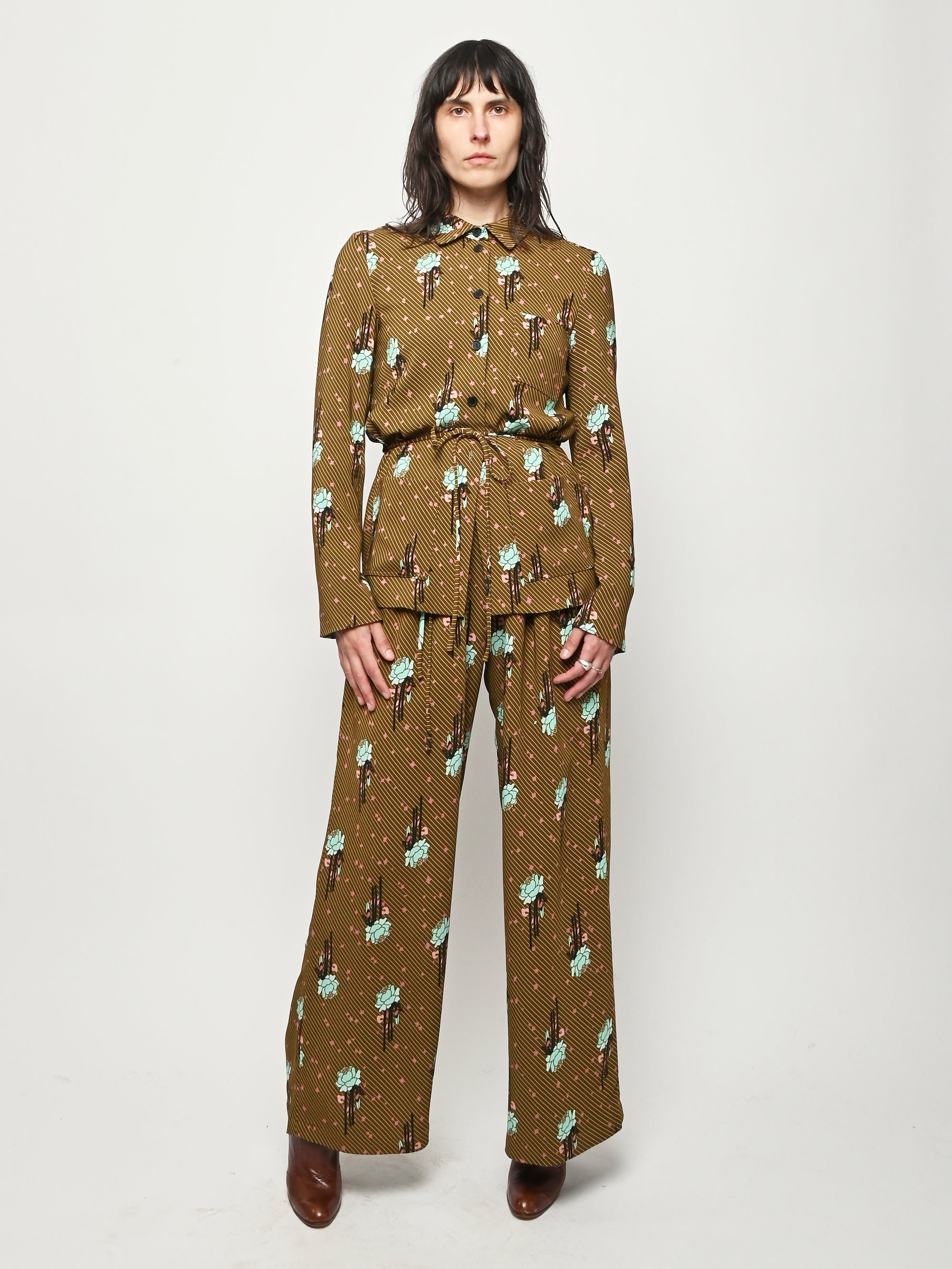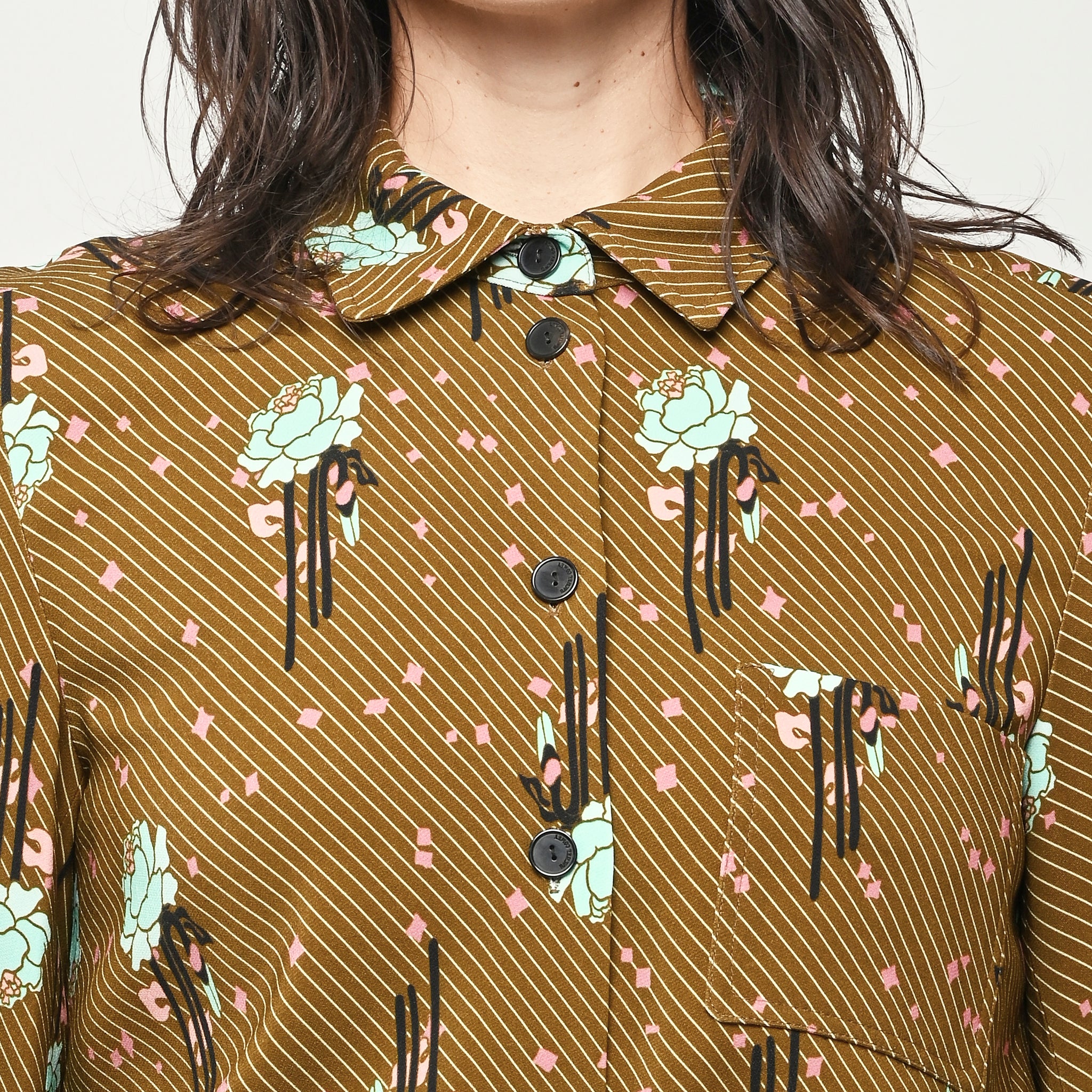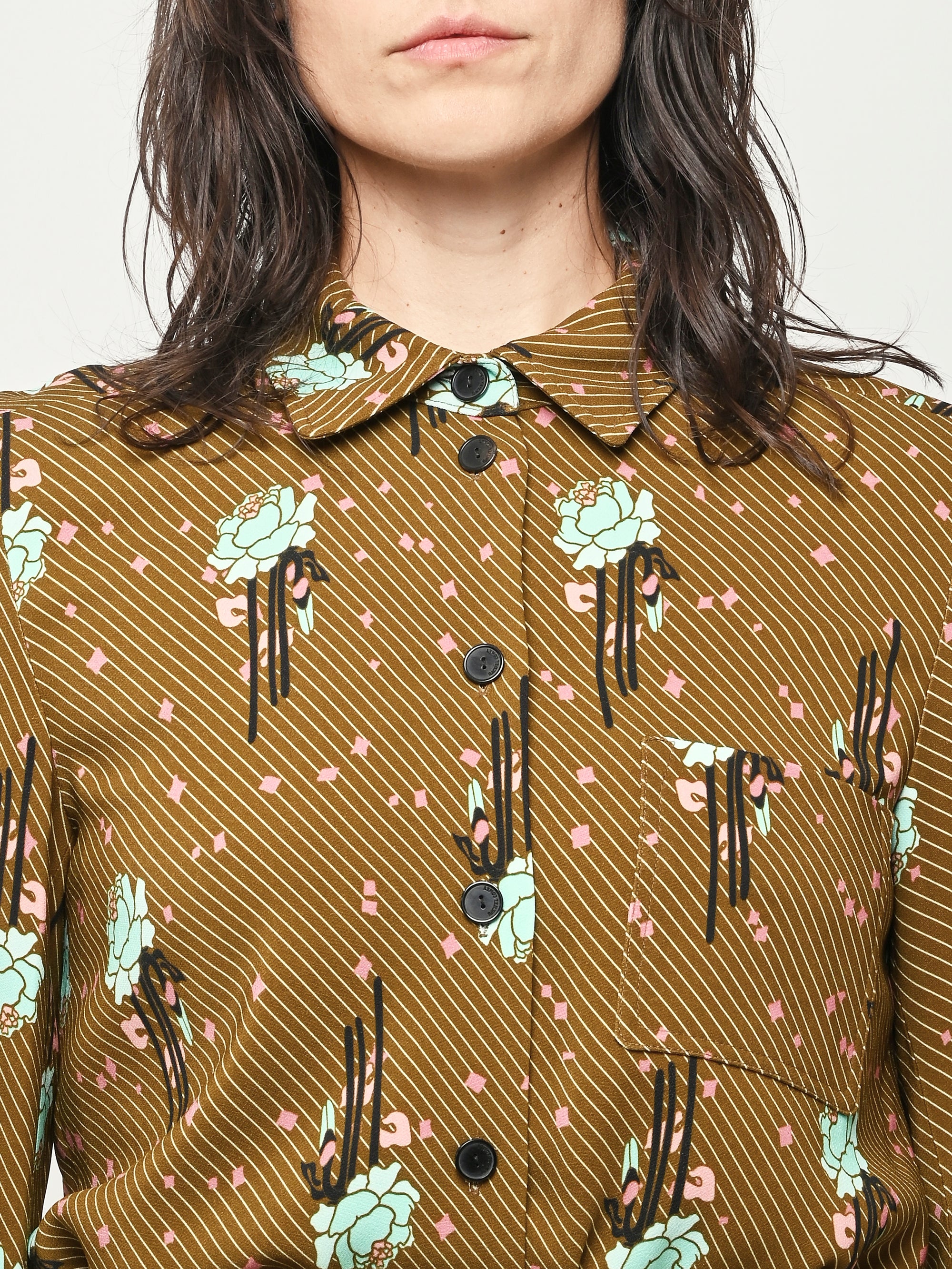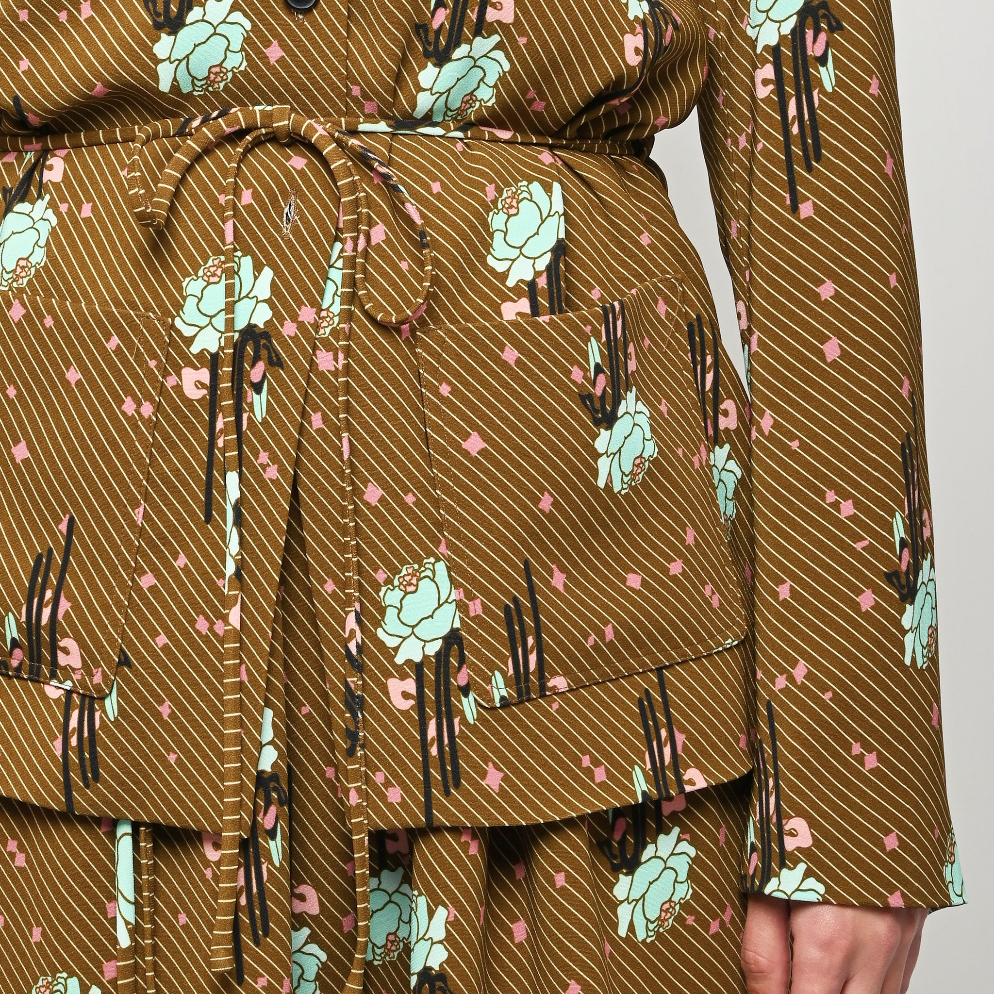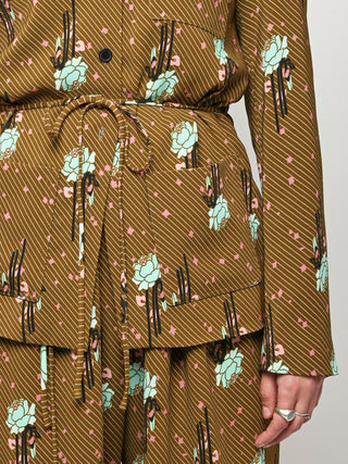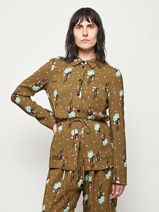 The Bronze Ana Jacket by Rachel Comey is a slightly fitted, buttoning top, which can be worn alone as a blouse, or as a light outer layer. It features a tie at the waist, and patch pockets on the hips and chest.