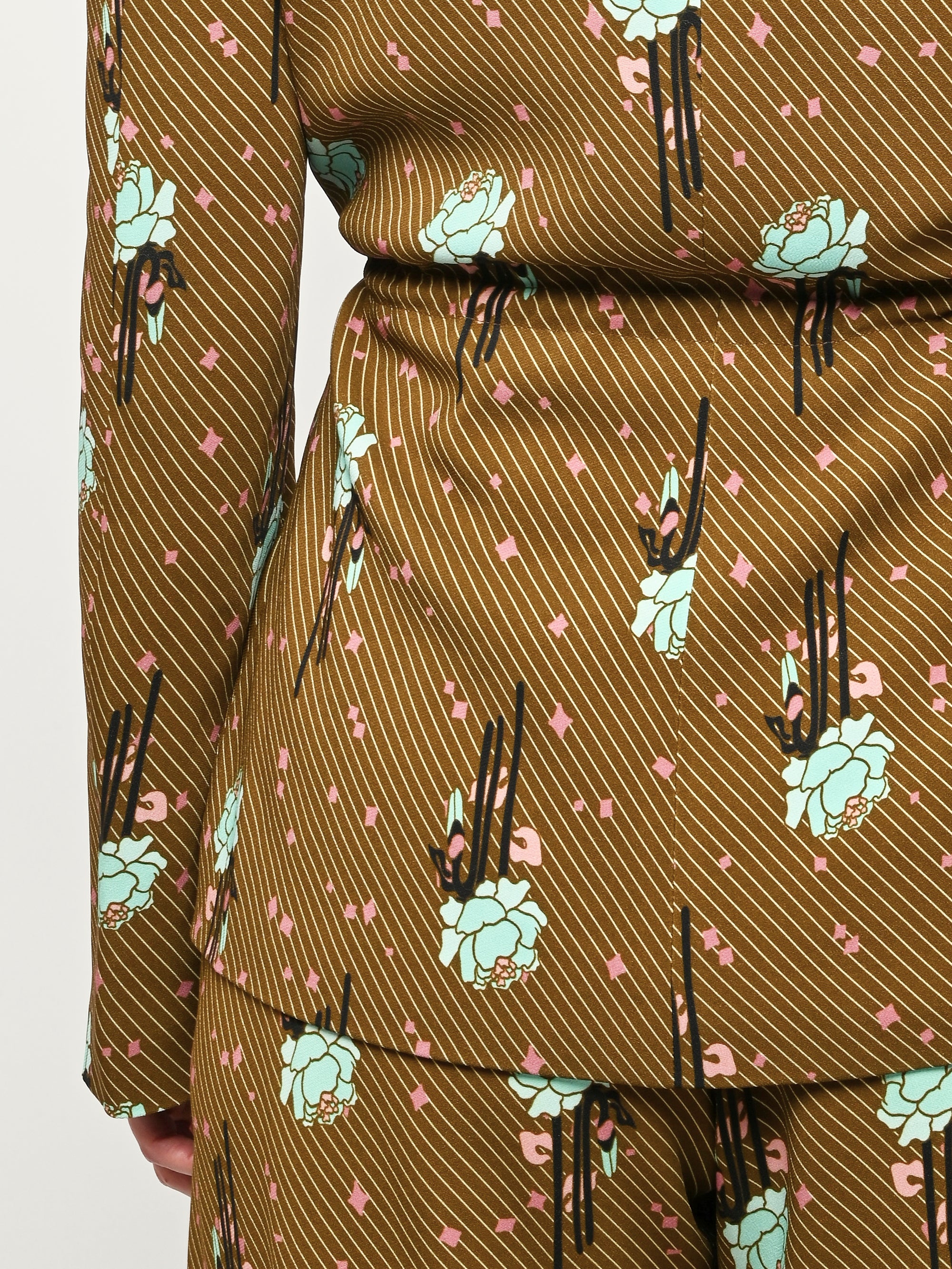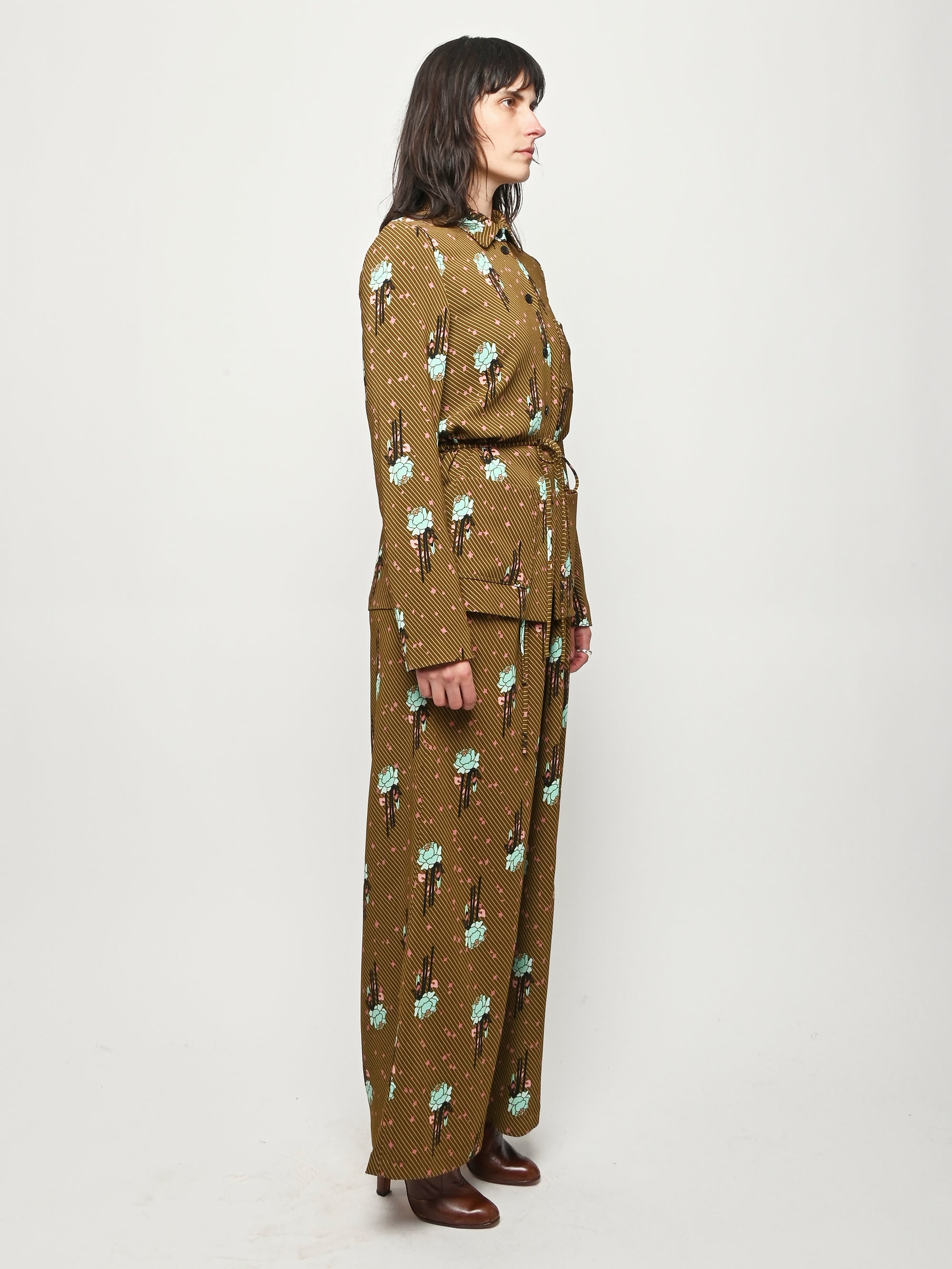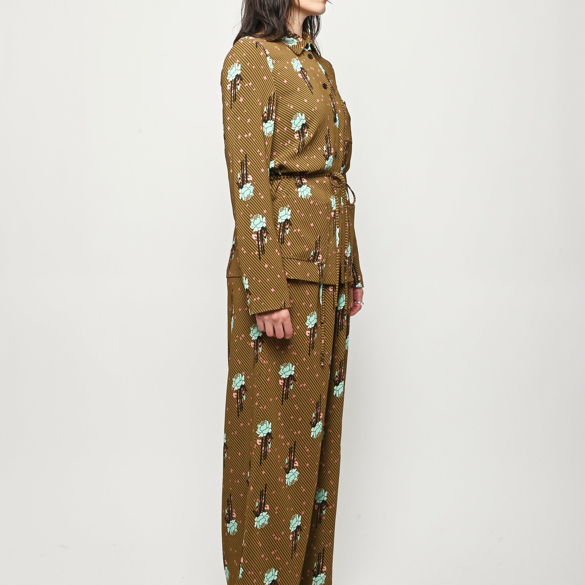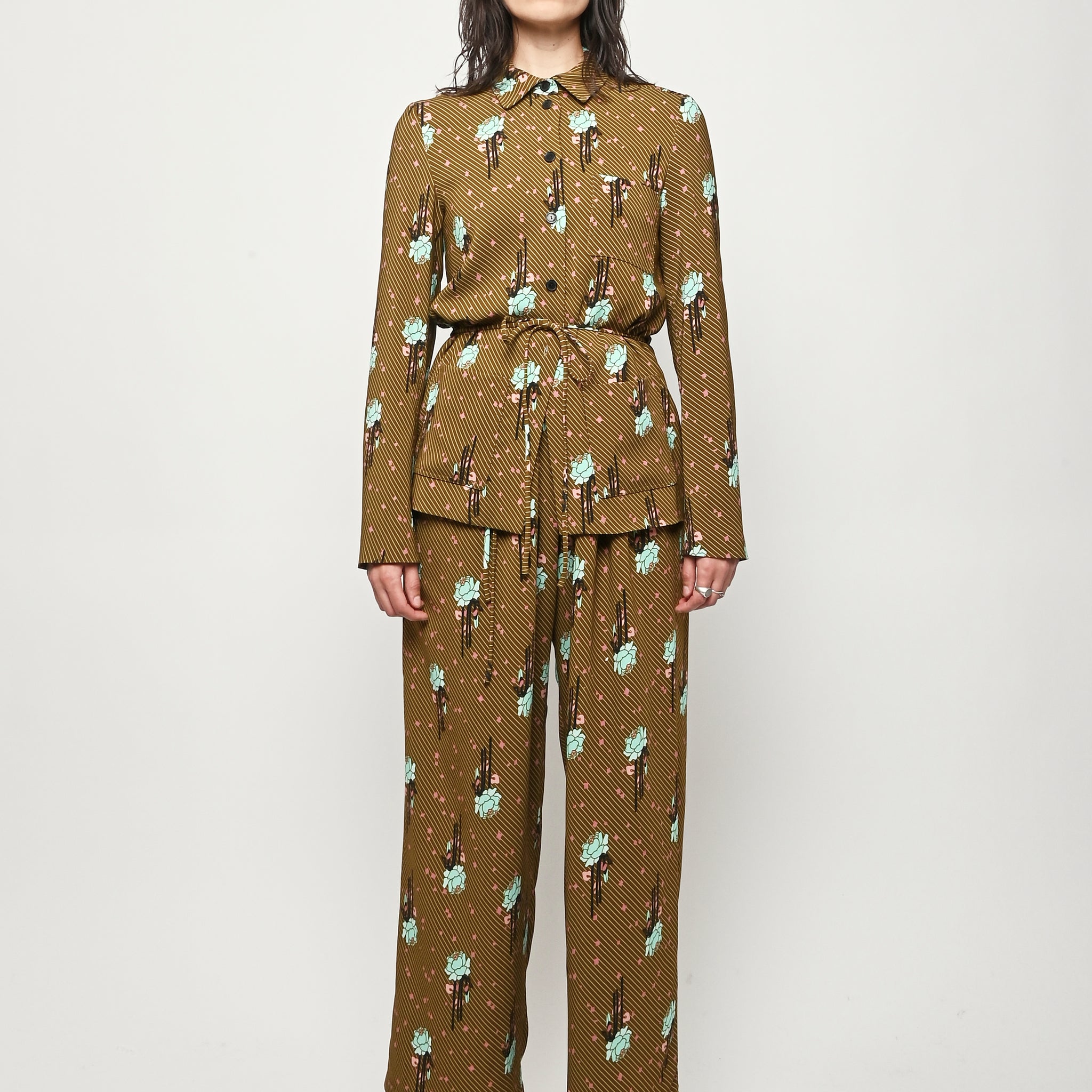 The Bronze Ana Jacket by Rachel Comey is a slightly fitted, buttoning top, which can be worn alone as a blouse, or as a light outer layer. It features a tie at the waist, and patch pockets on the hips and chest.