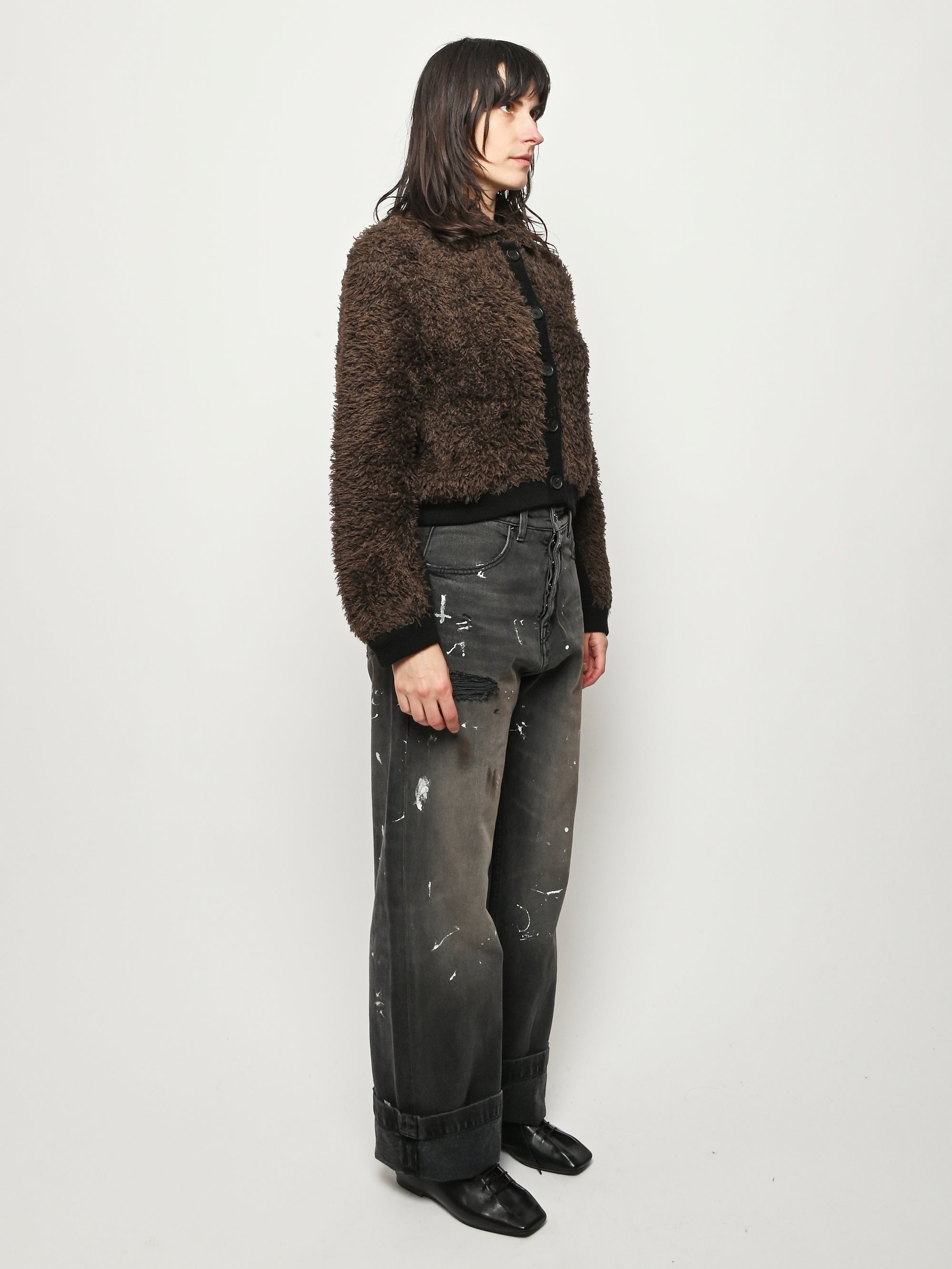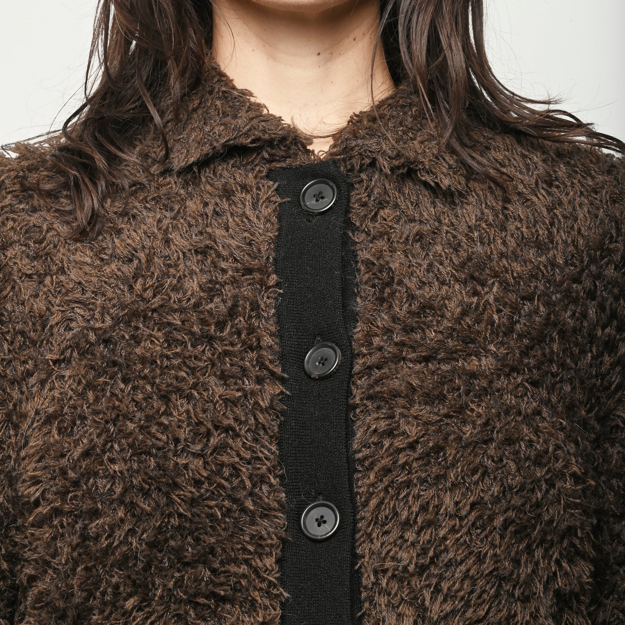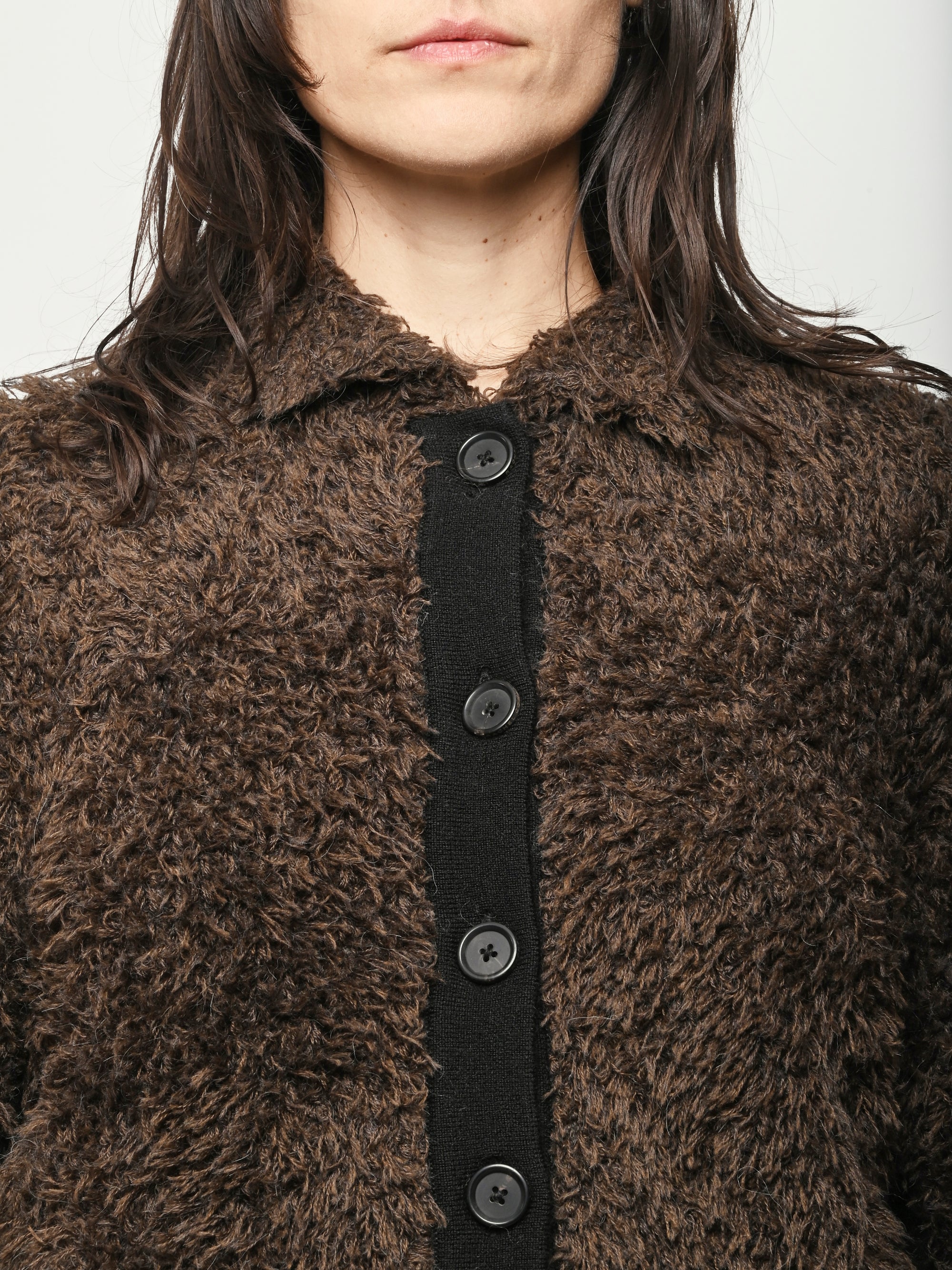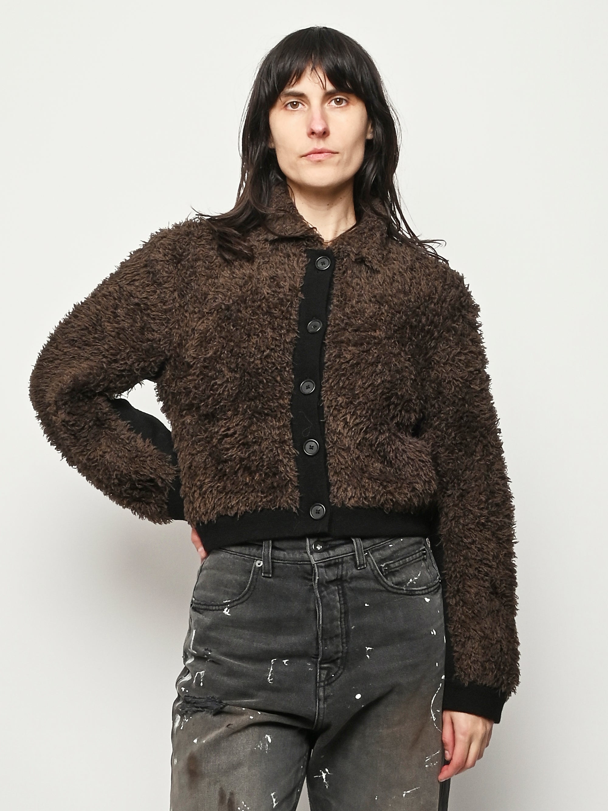 Brown furry textured cardigan by Rachel Comey with contrast ribbing at the placket, cuffs and hem.
