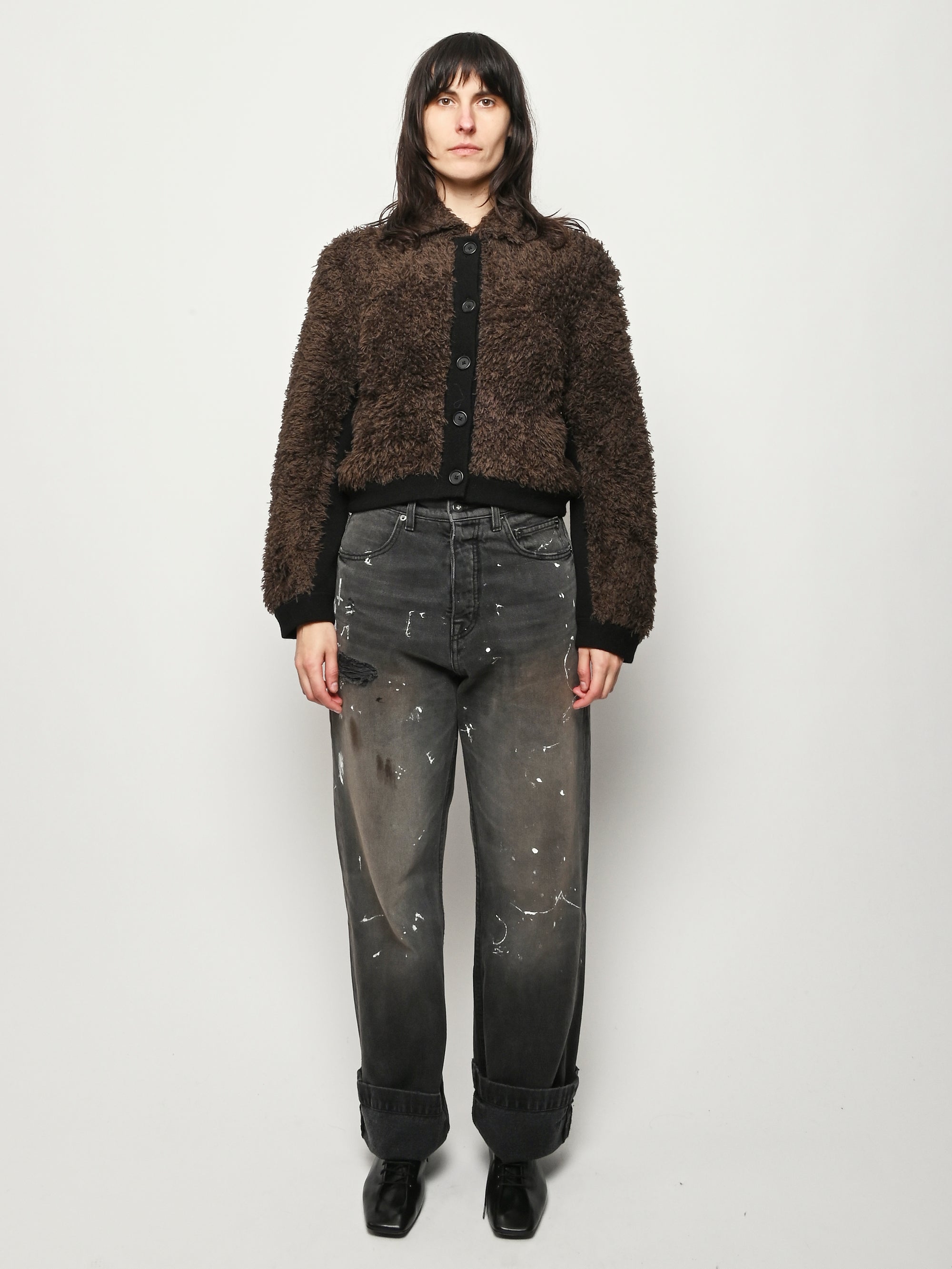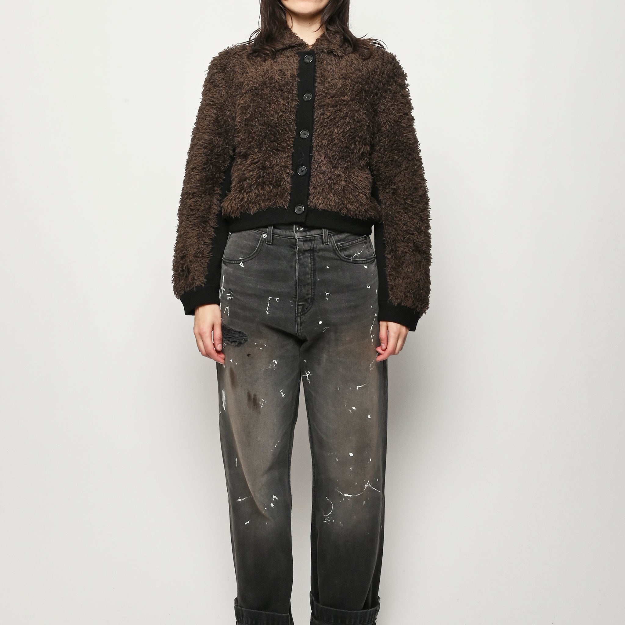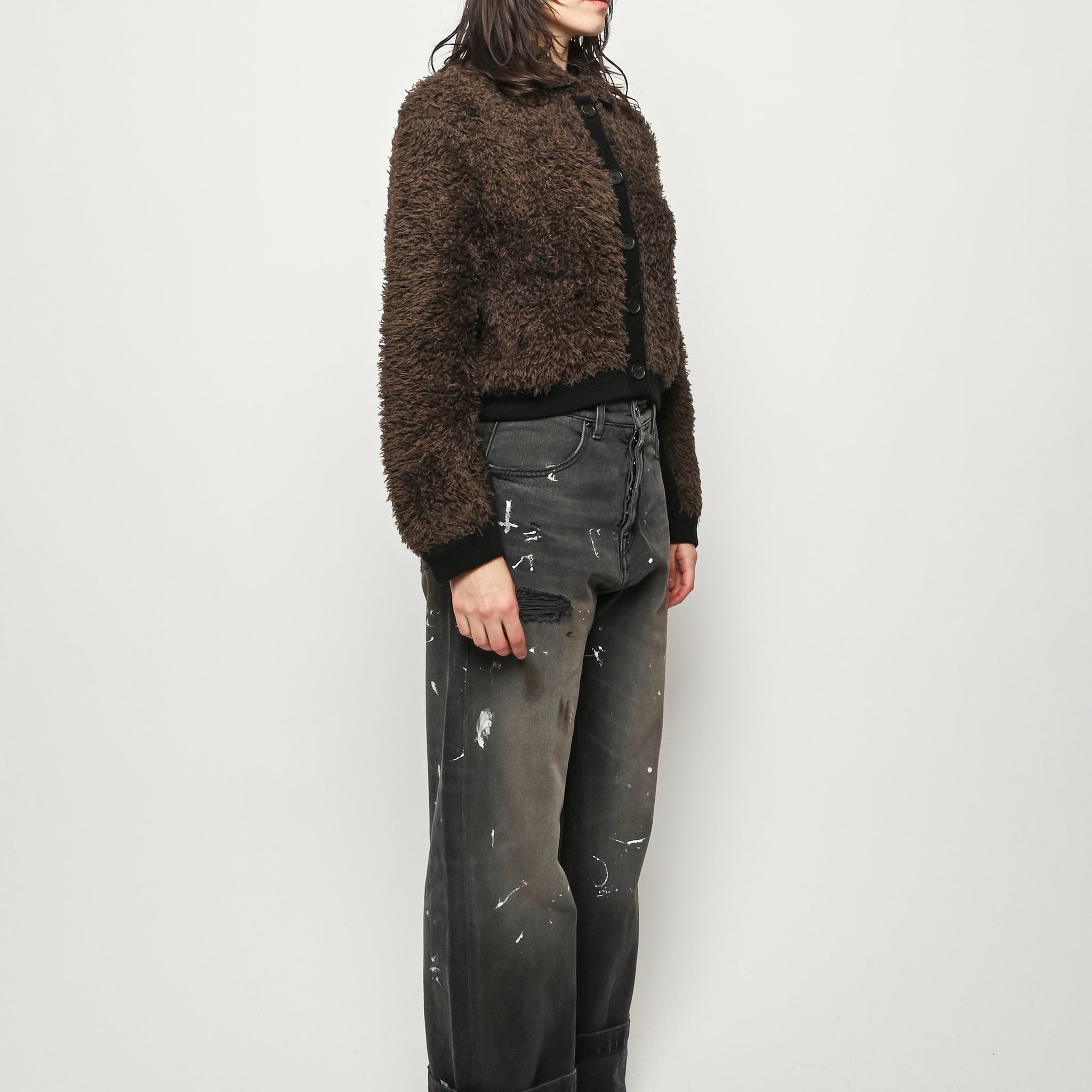 Brown furry textured cardigan by Rachel Comey with contrast ribbing at the placket, cuffs and hem.