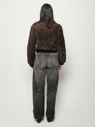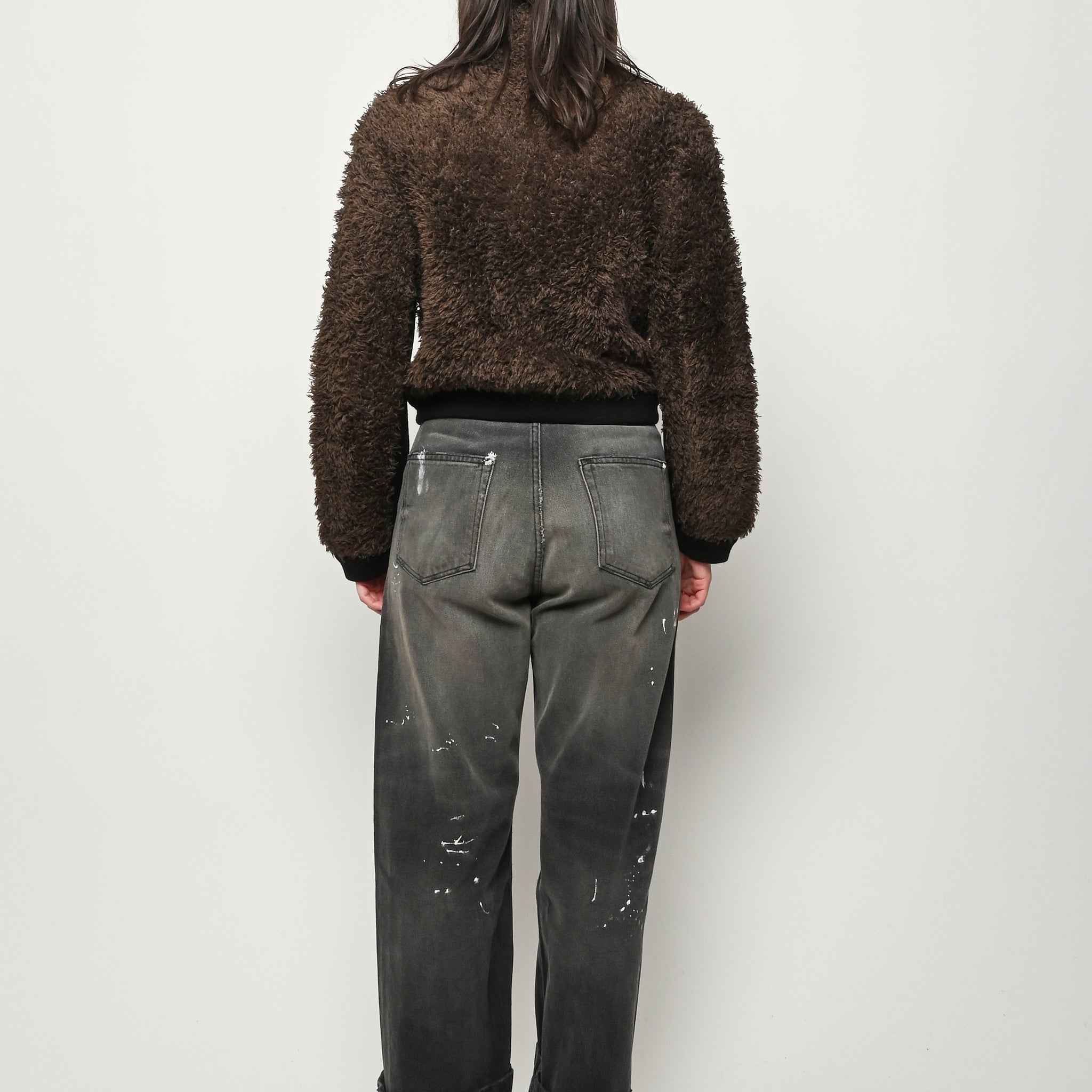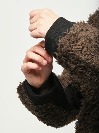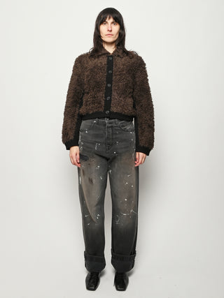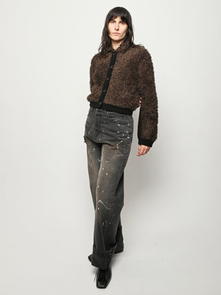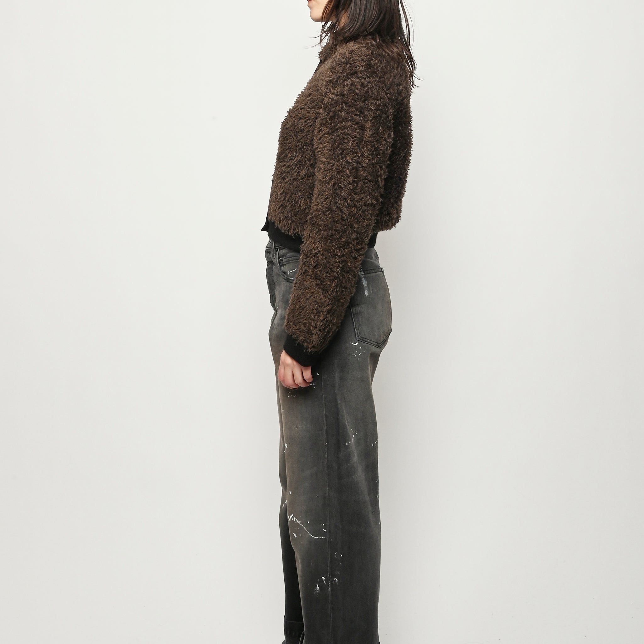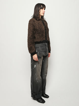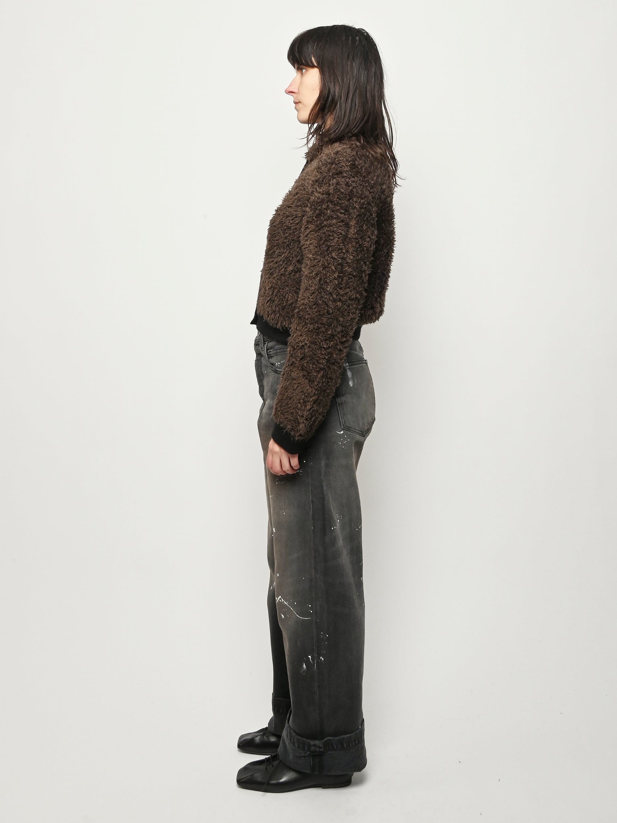 Brown furry textured cardigan by Rachel Comey with contrast ribbing at the placket, cuffs and hem.