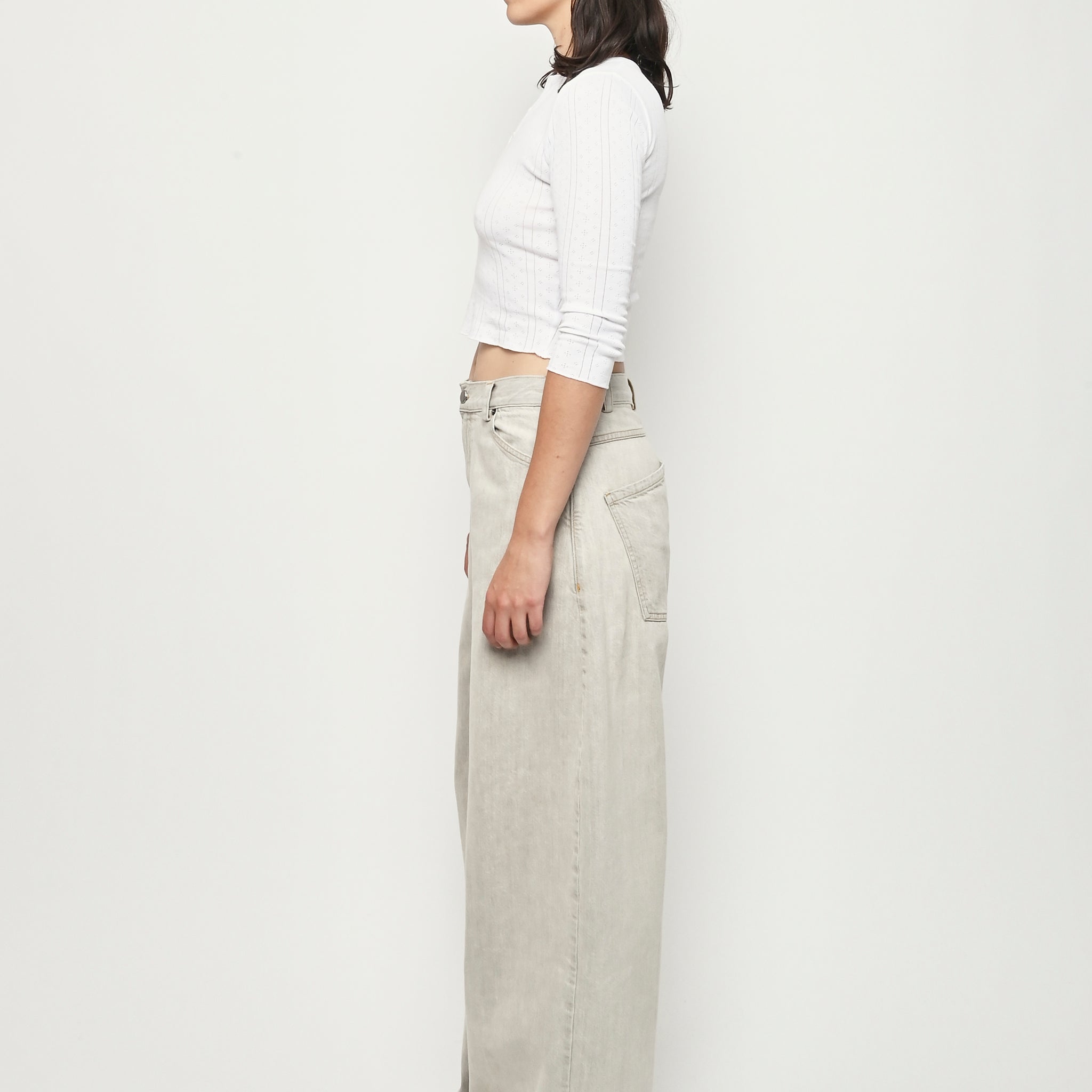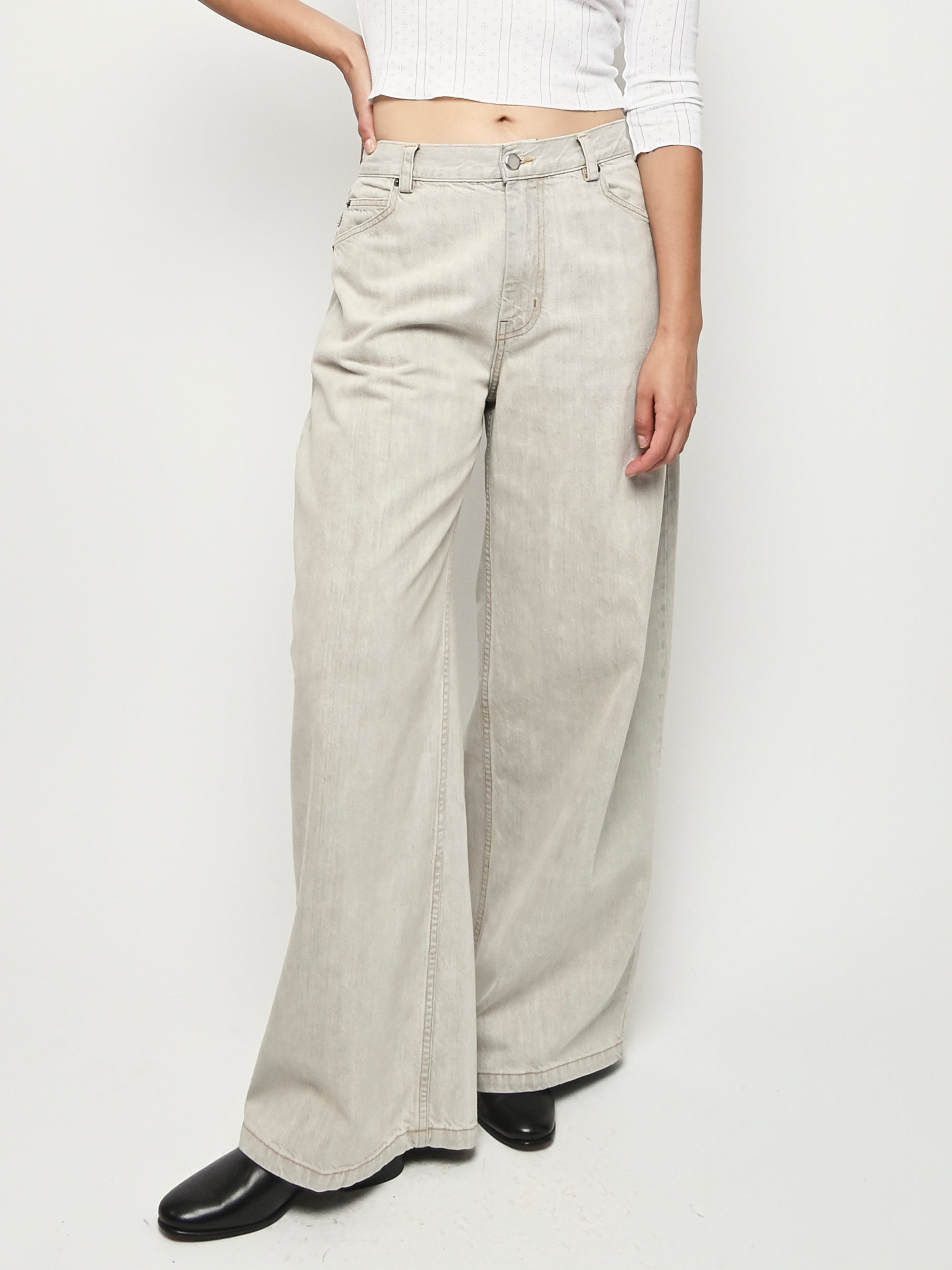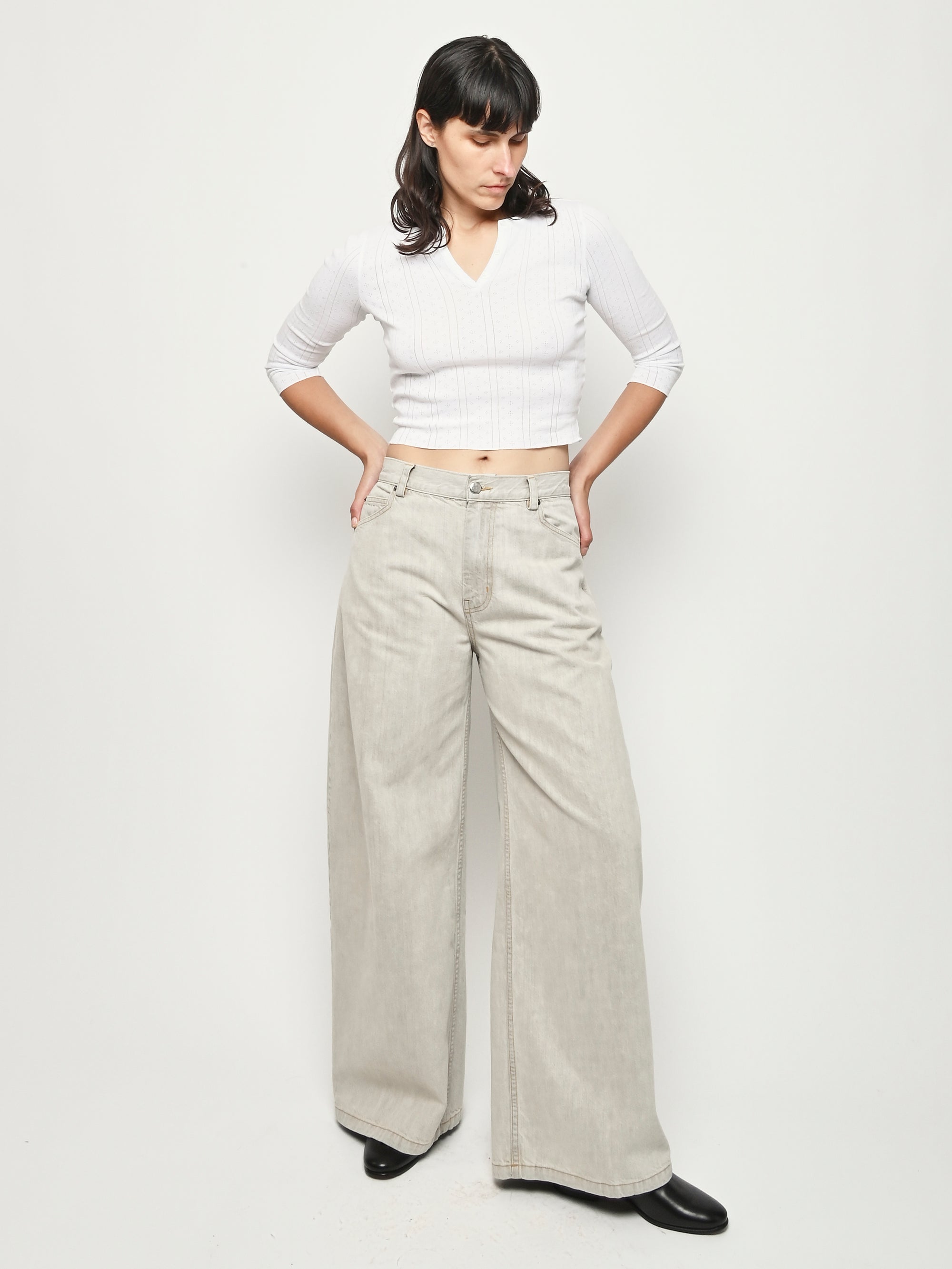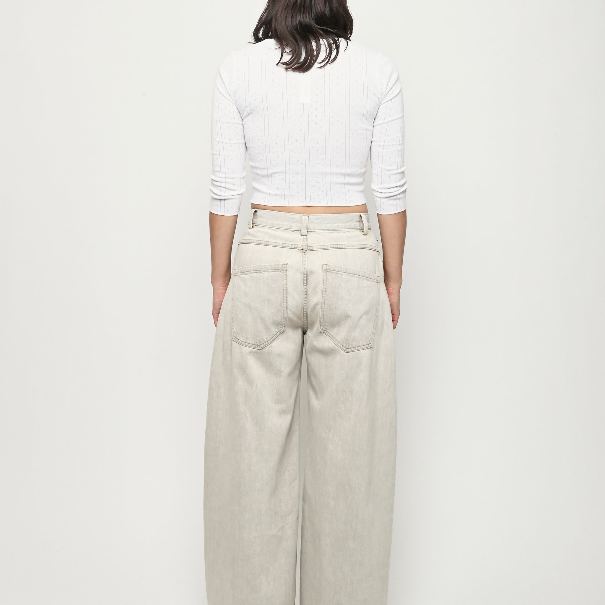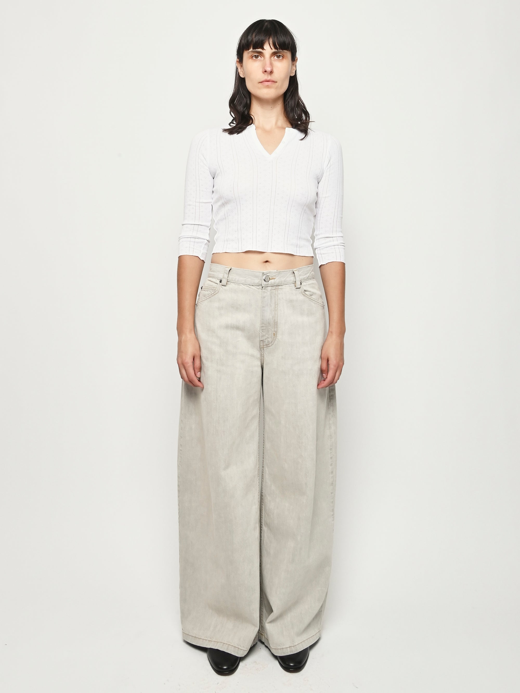 Oversized wide-leg jeans in Washed Salinas Denim by Rachel Comey, with five-pocket styling. Features a zipper and button fly closure. Made in Los Angeles using premium Japanese denim.