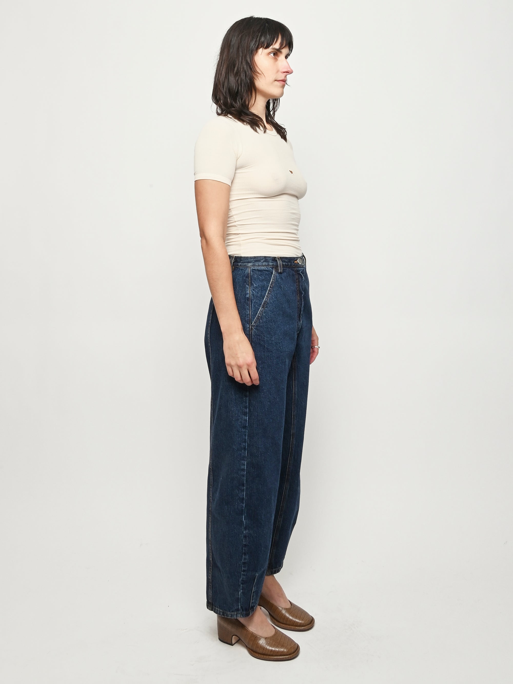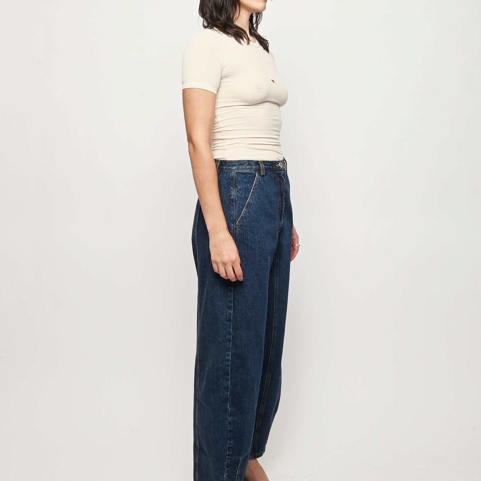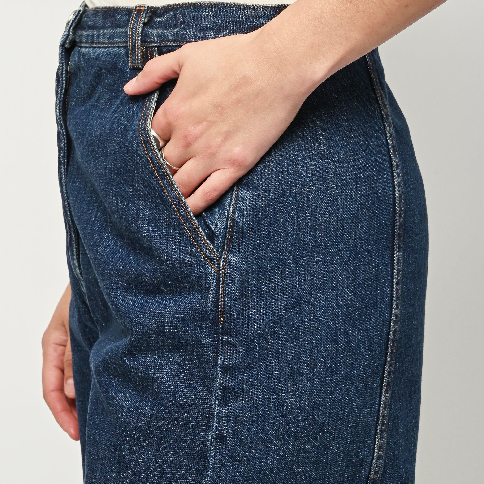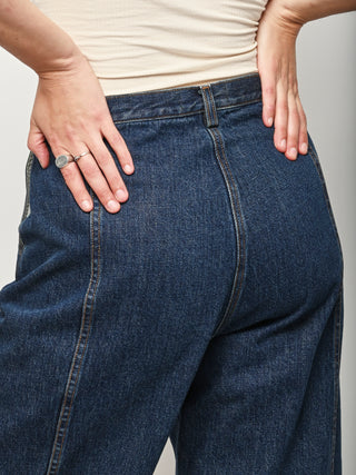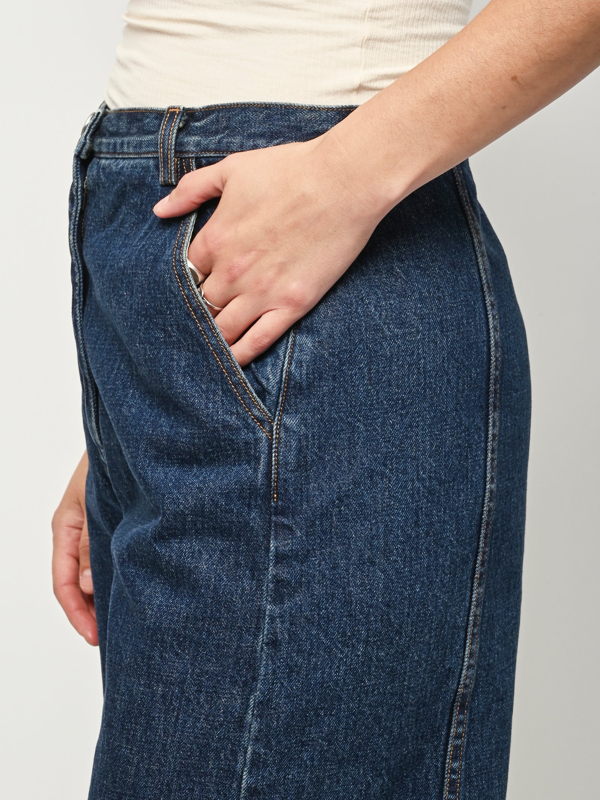 Straight leg jeans in indigo denim, designed with a high-rise waist and a distinctive side panel along the legs to create an elongating effect.