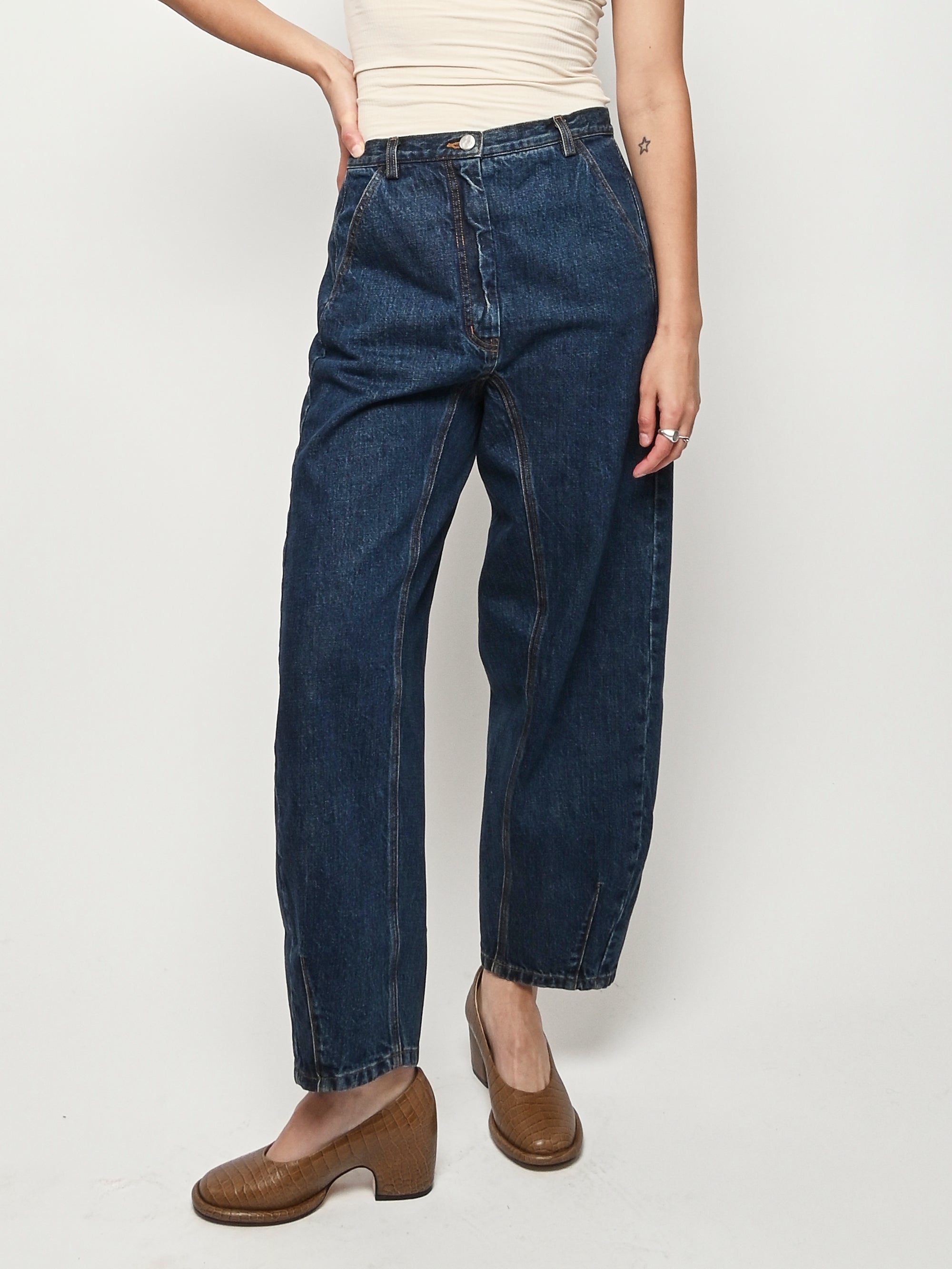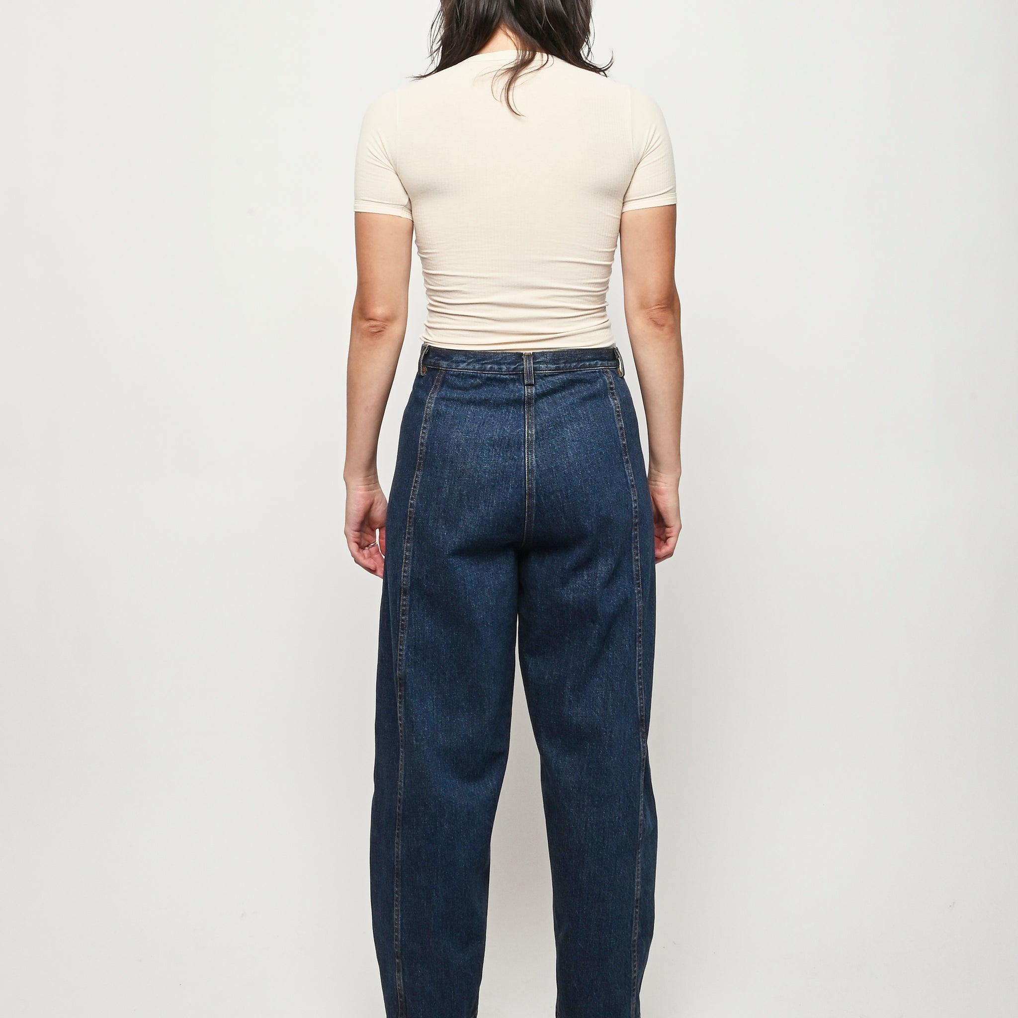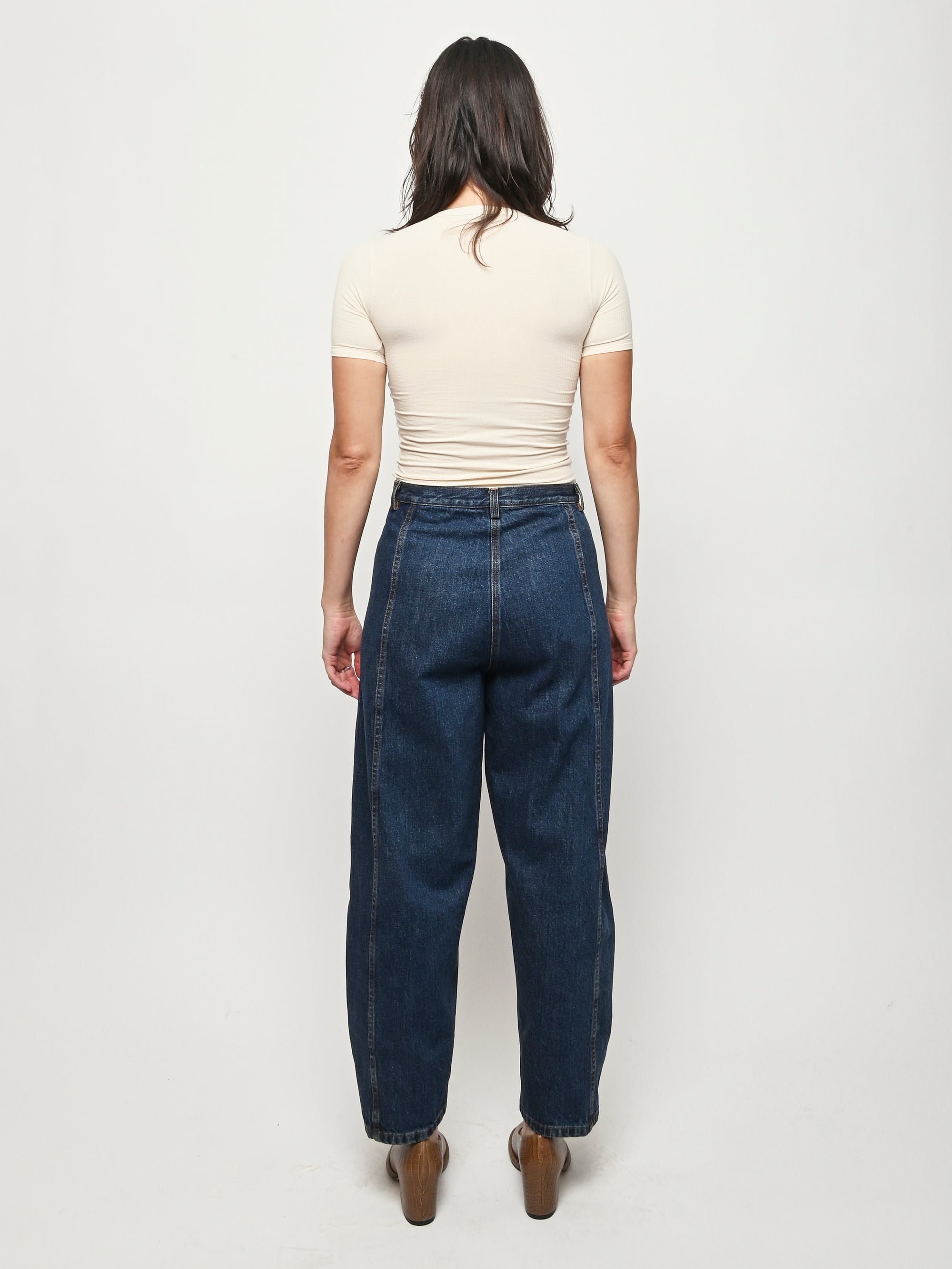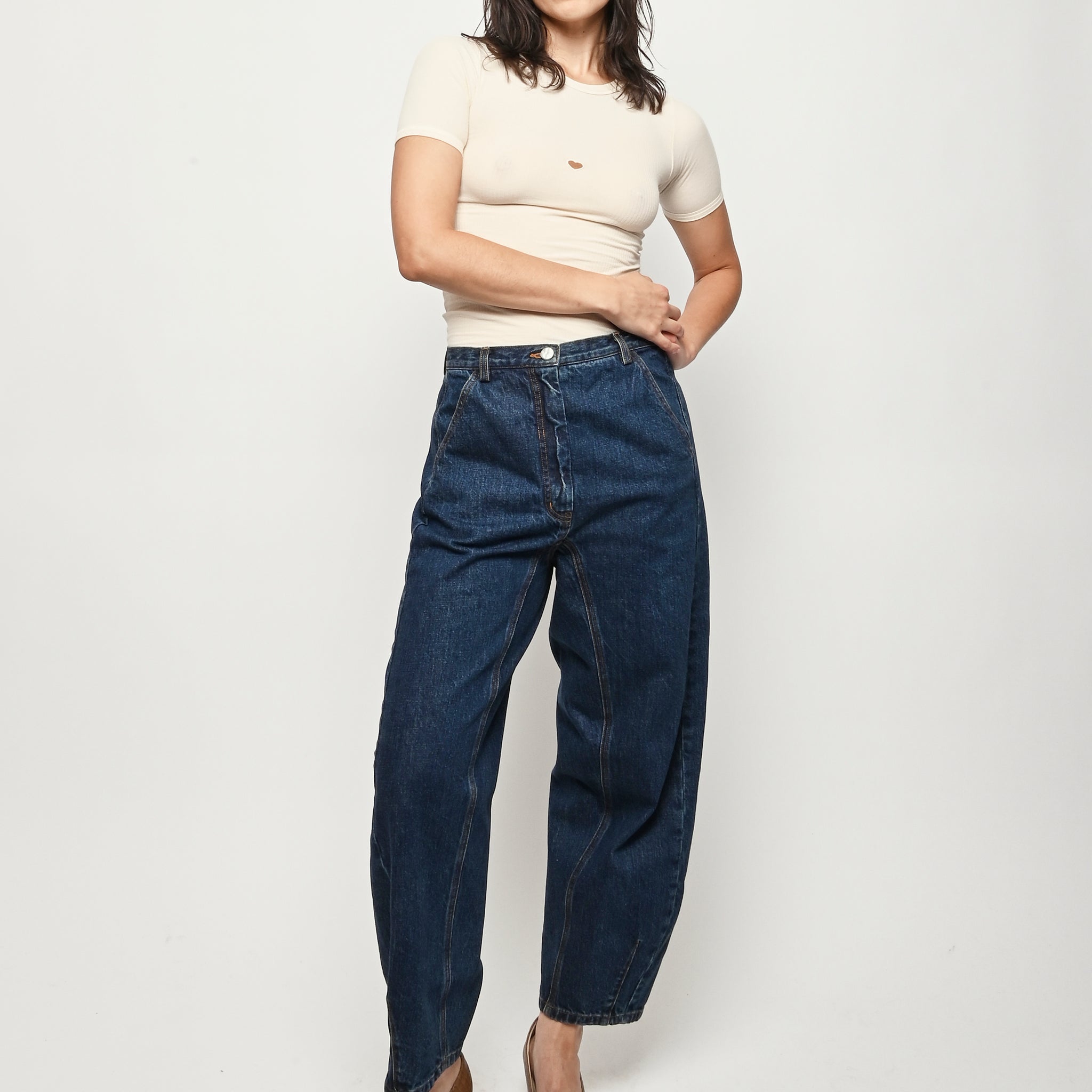 Straight leg jeans in indigo denim, designed with a high-rise waist and a distinctive side panel along the legs to create an elongating effect.