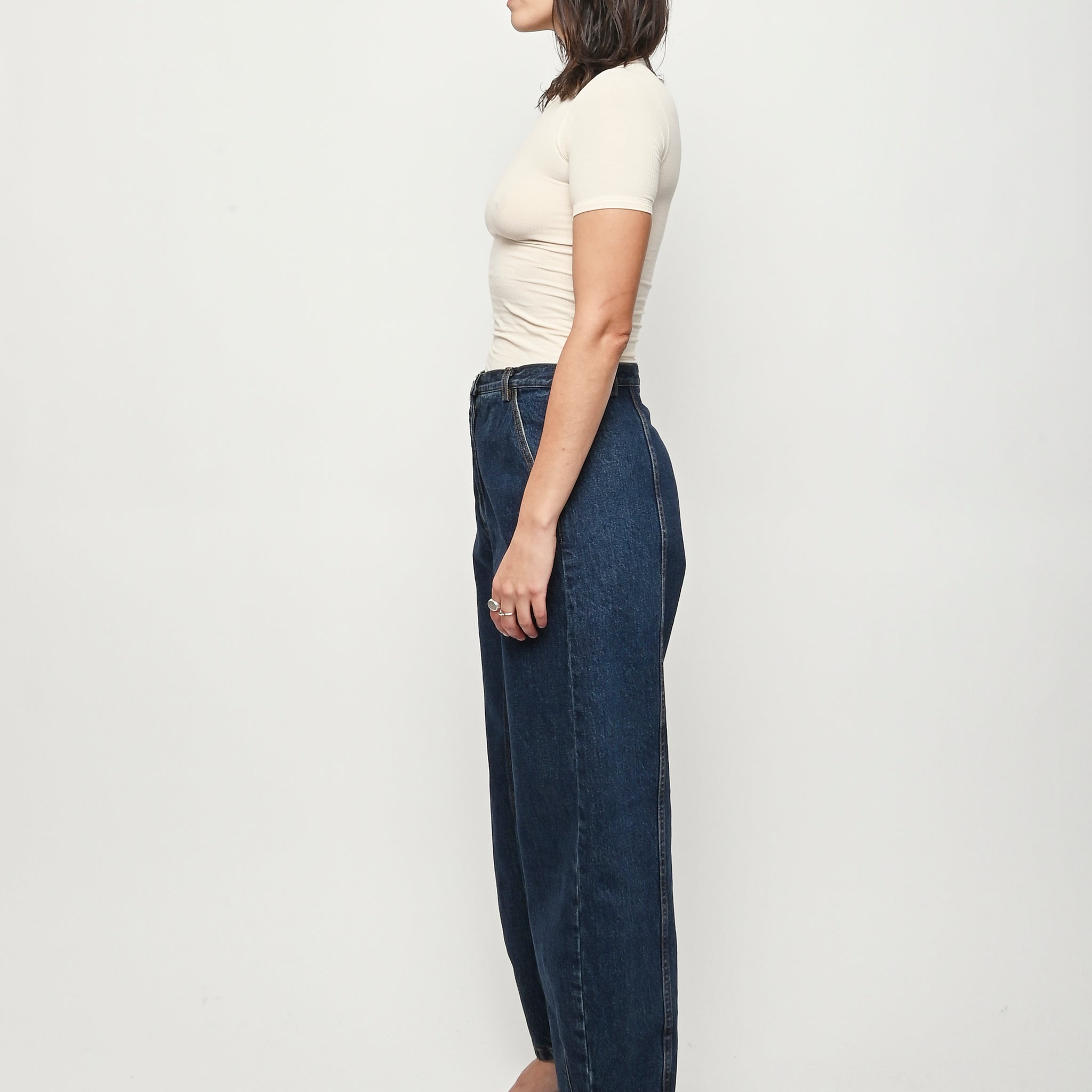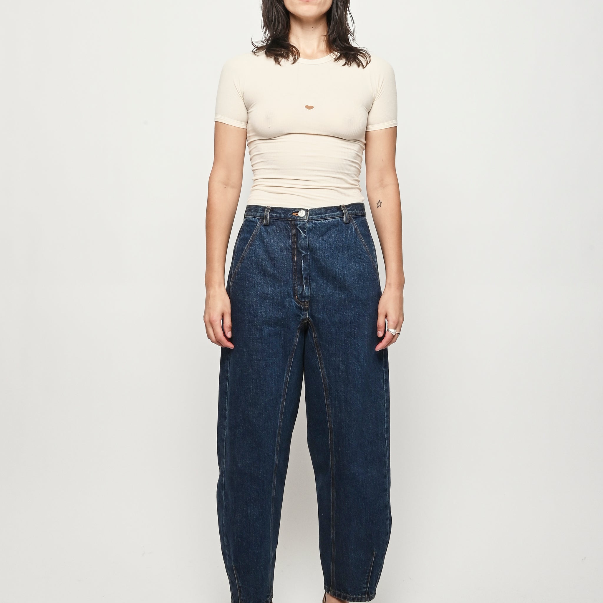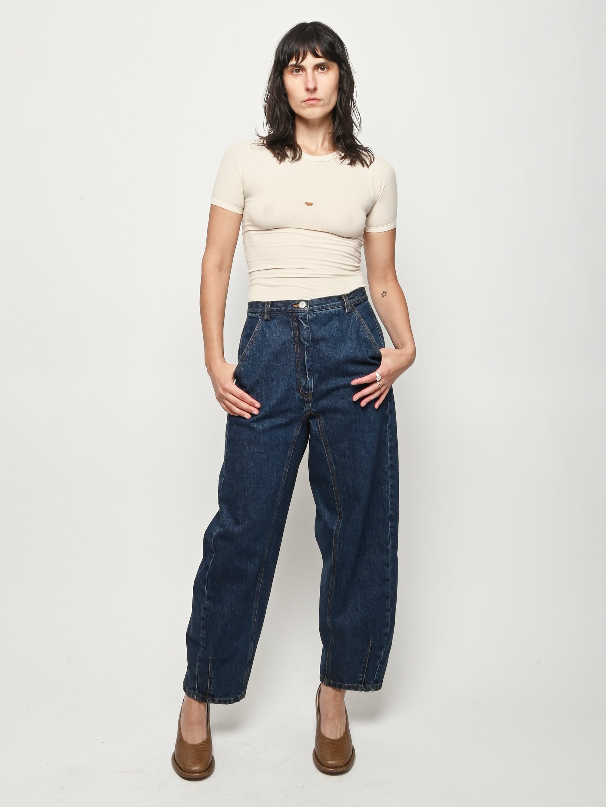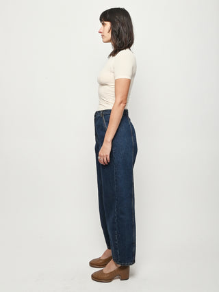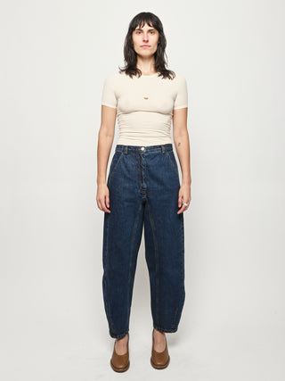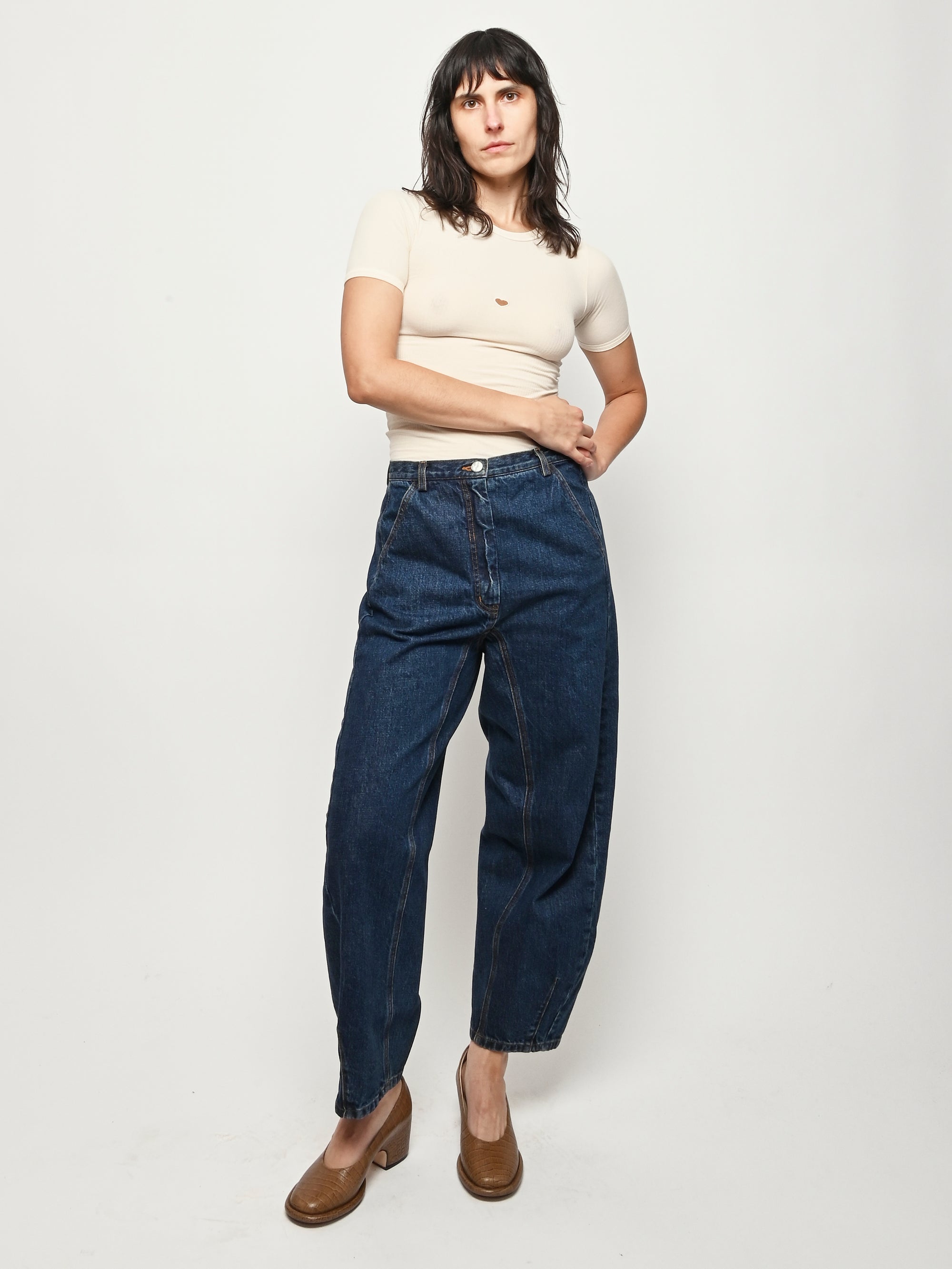 Straight leg jeans in indigo denim, designed with a high-rise waist and a distinctive side panel along the legs to create an elongating effect.