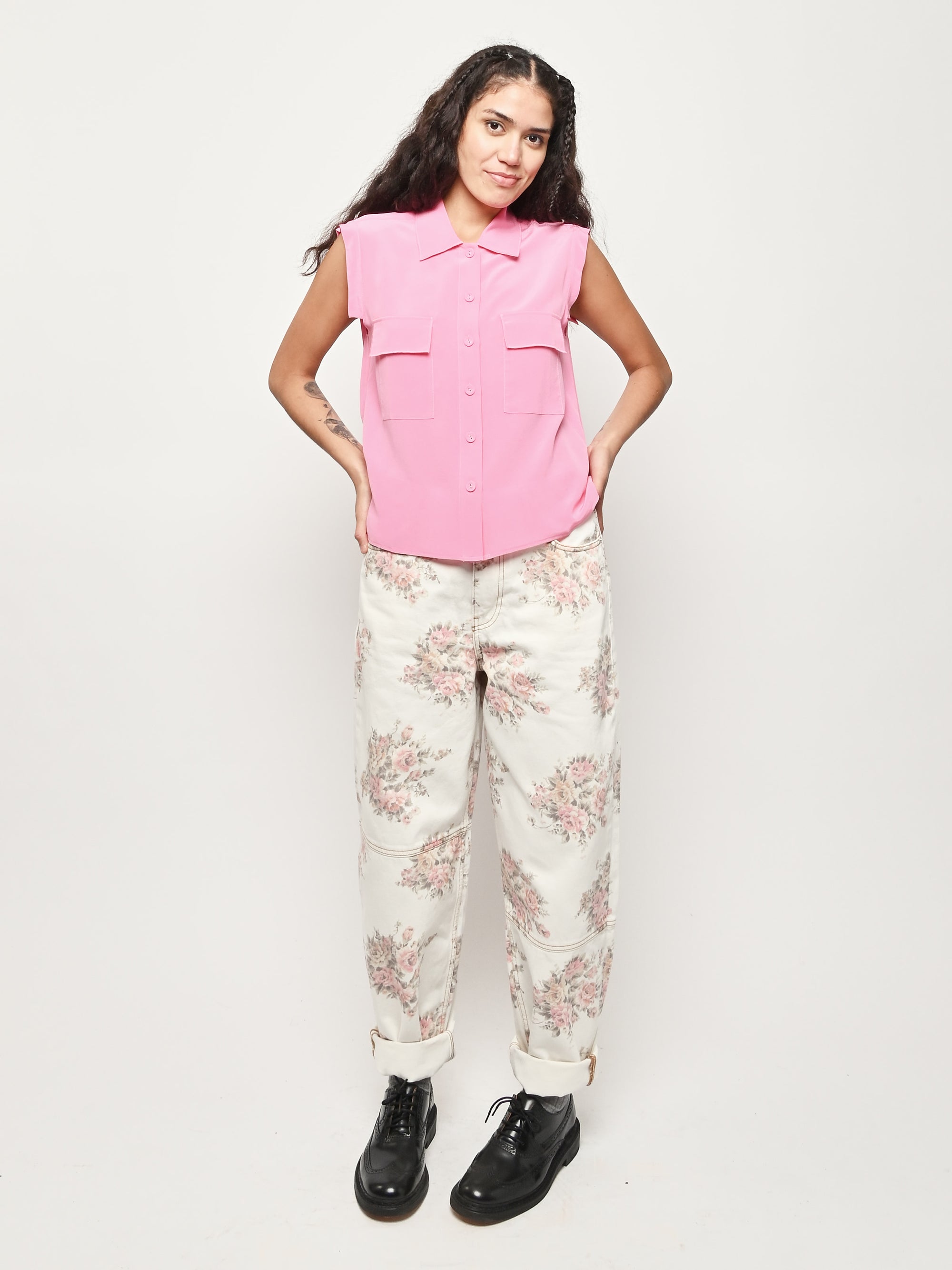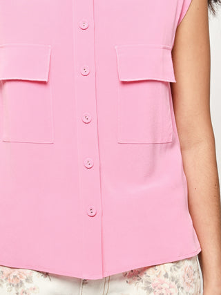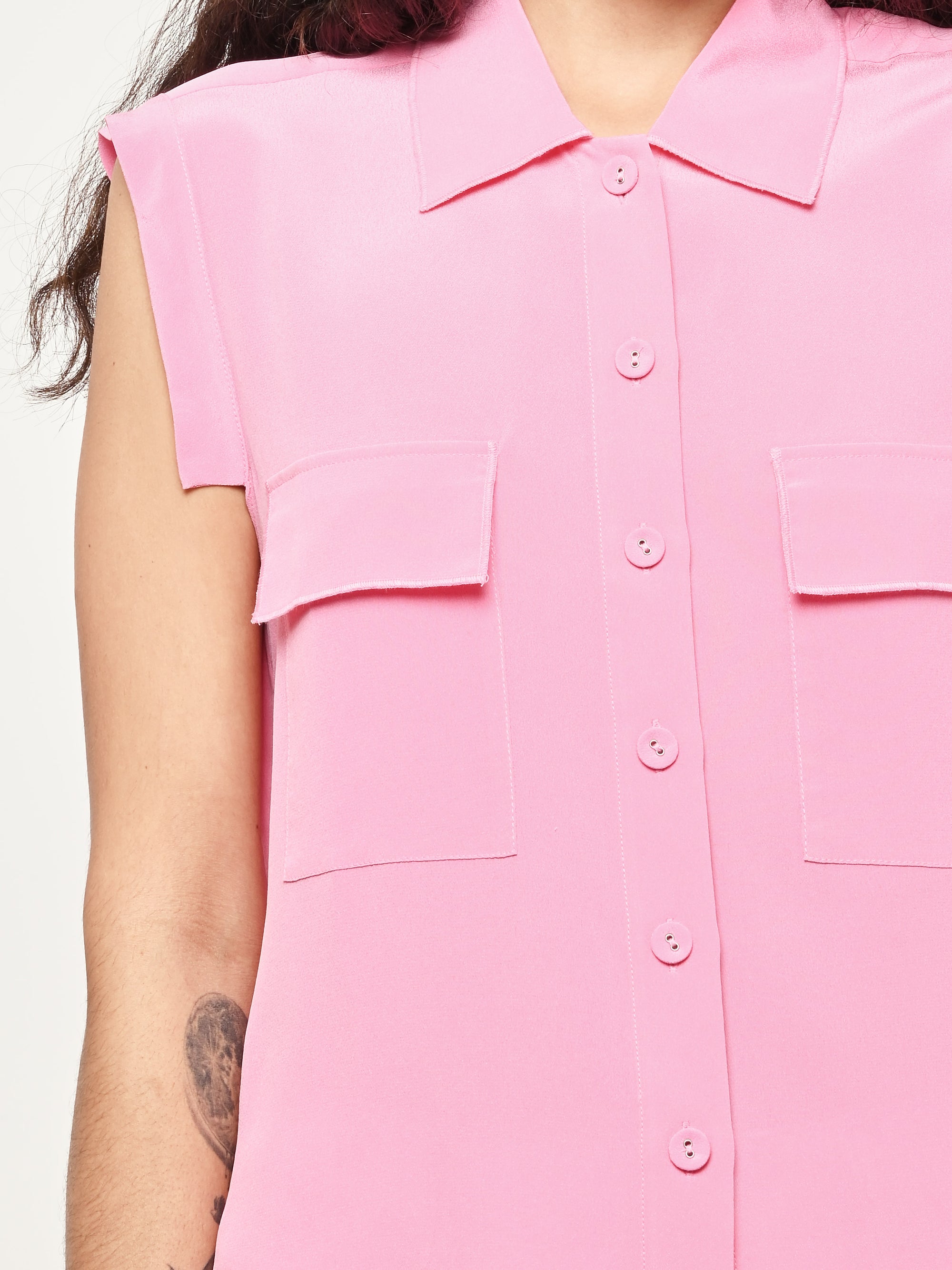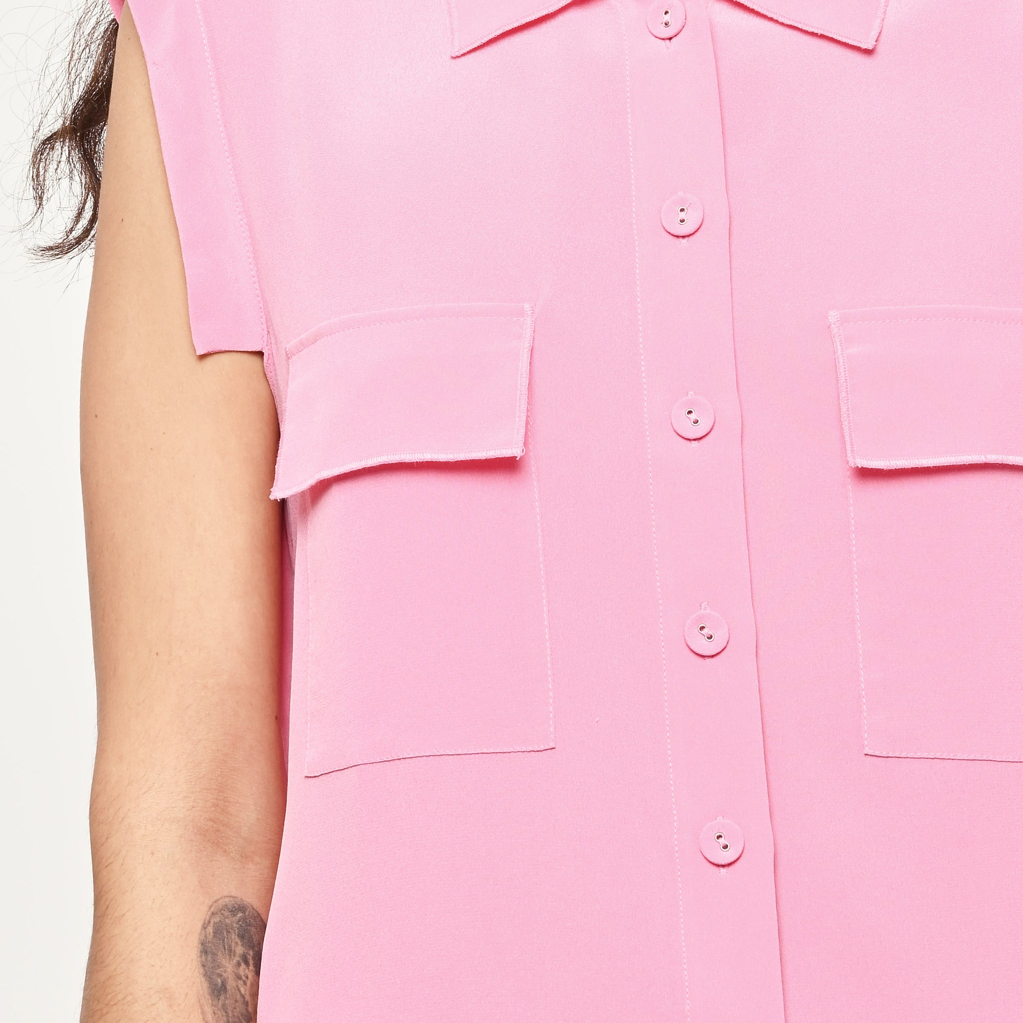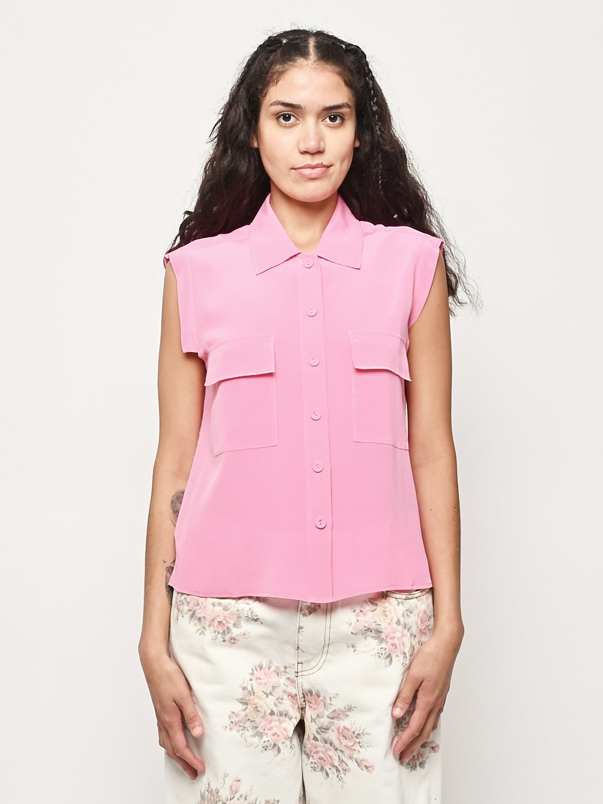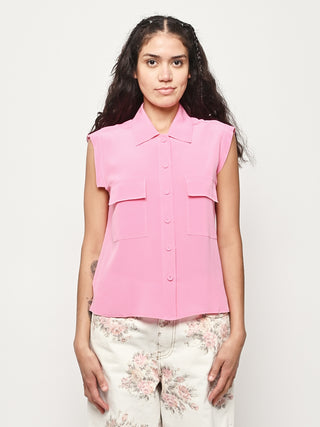 Open-sleeved button-up top by Rachel Comey cut from pink sandwashed silk. Features a classic collar and two front patch pockets.