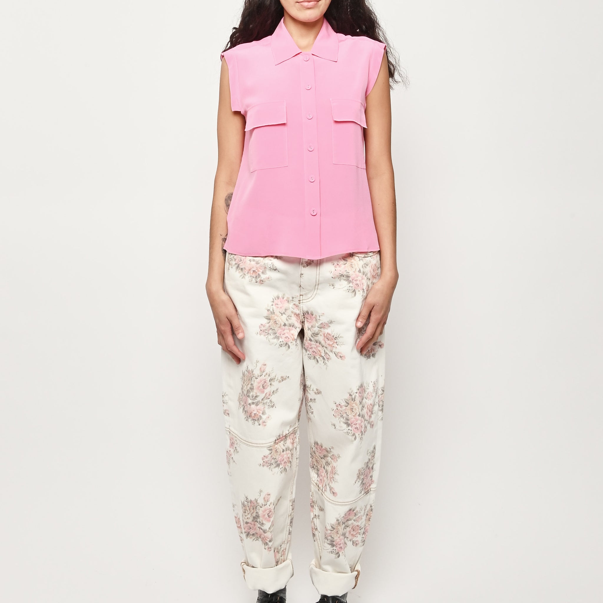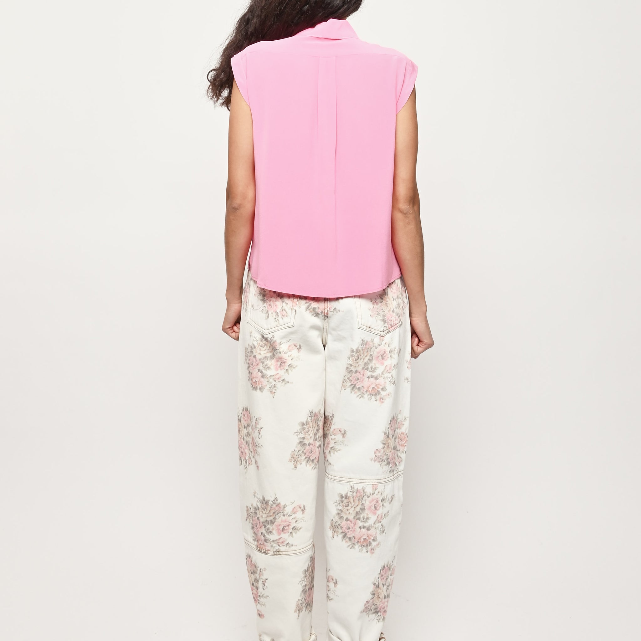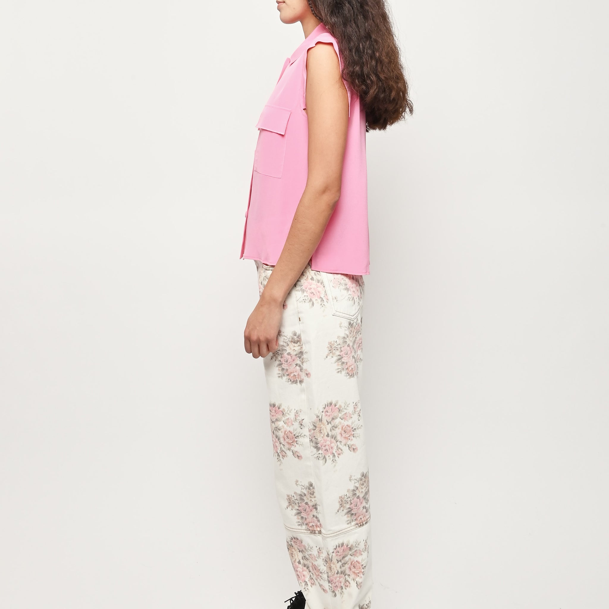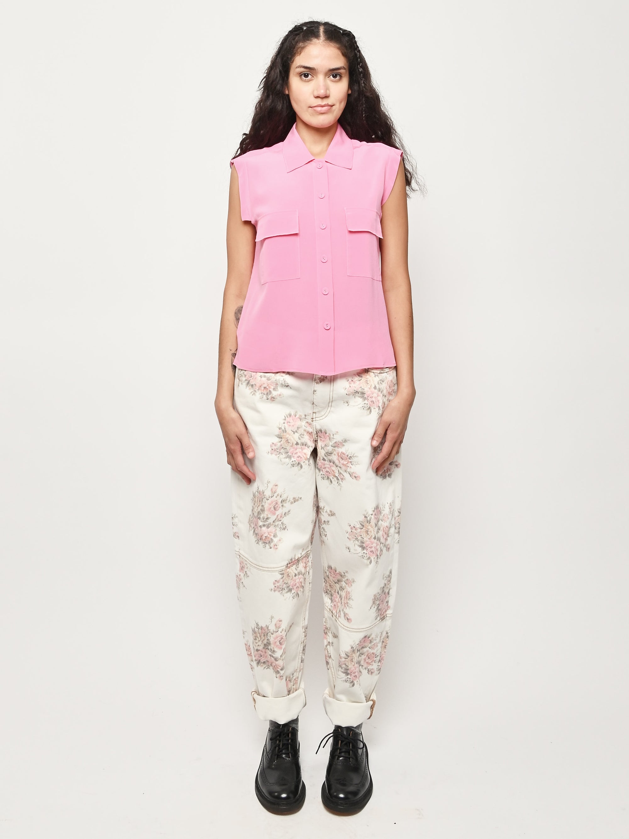 Open-sleeved button-up top by Rachel Comey cut from pink sandwashed silk. Features a classic collar and two front patch pockets.