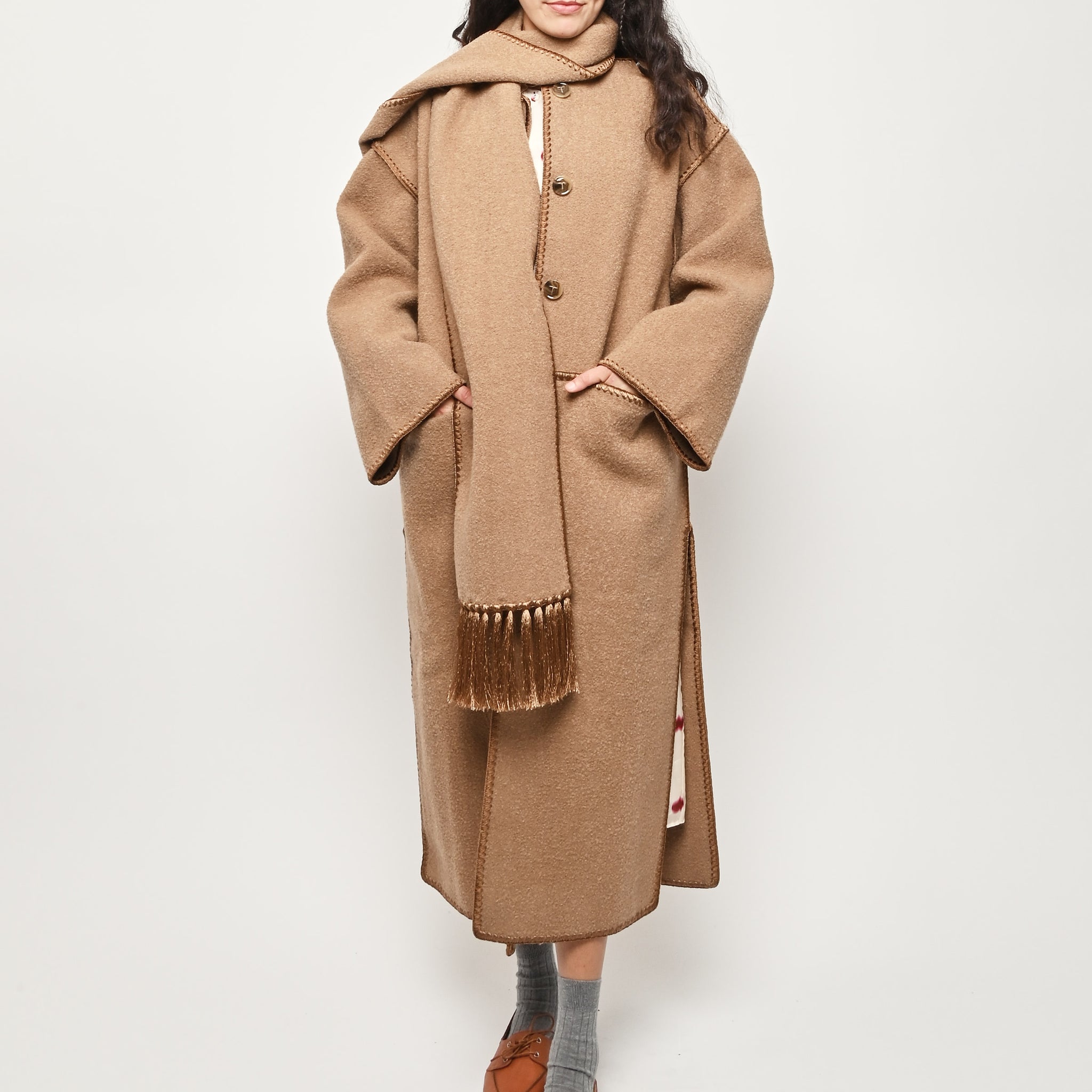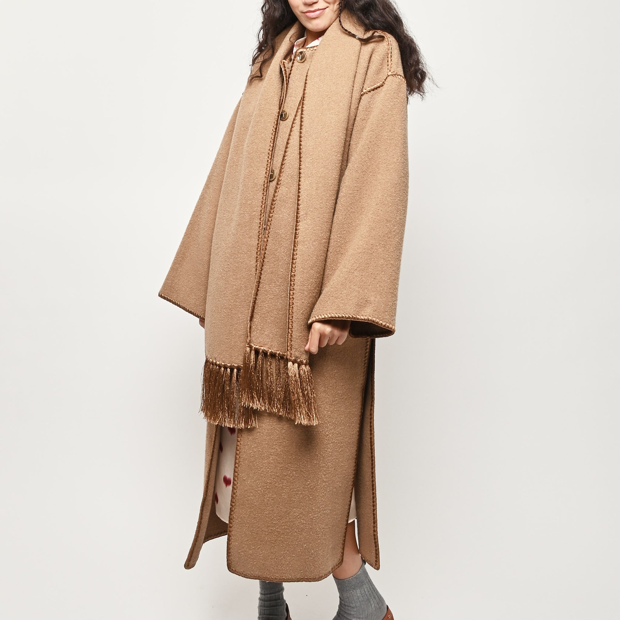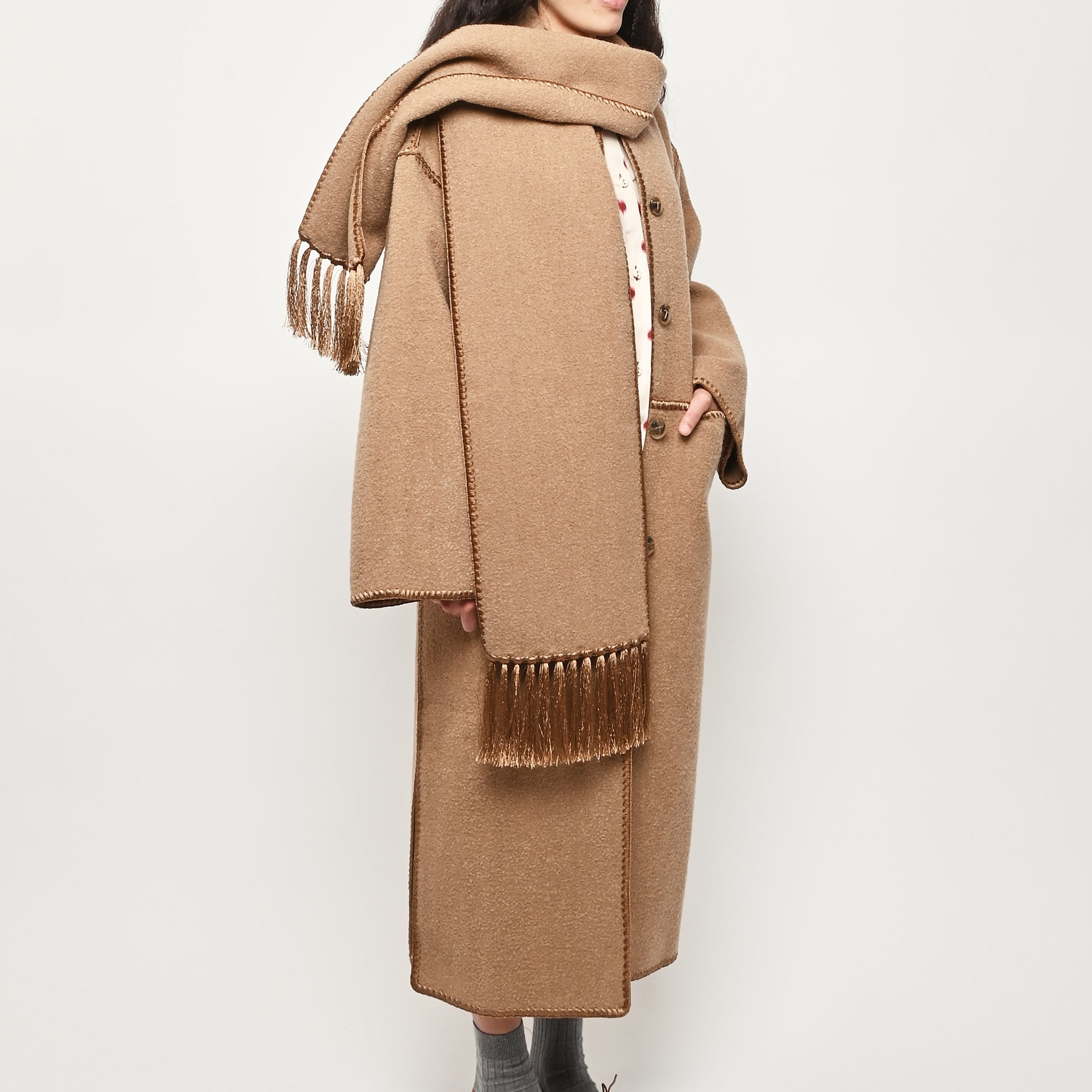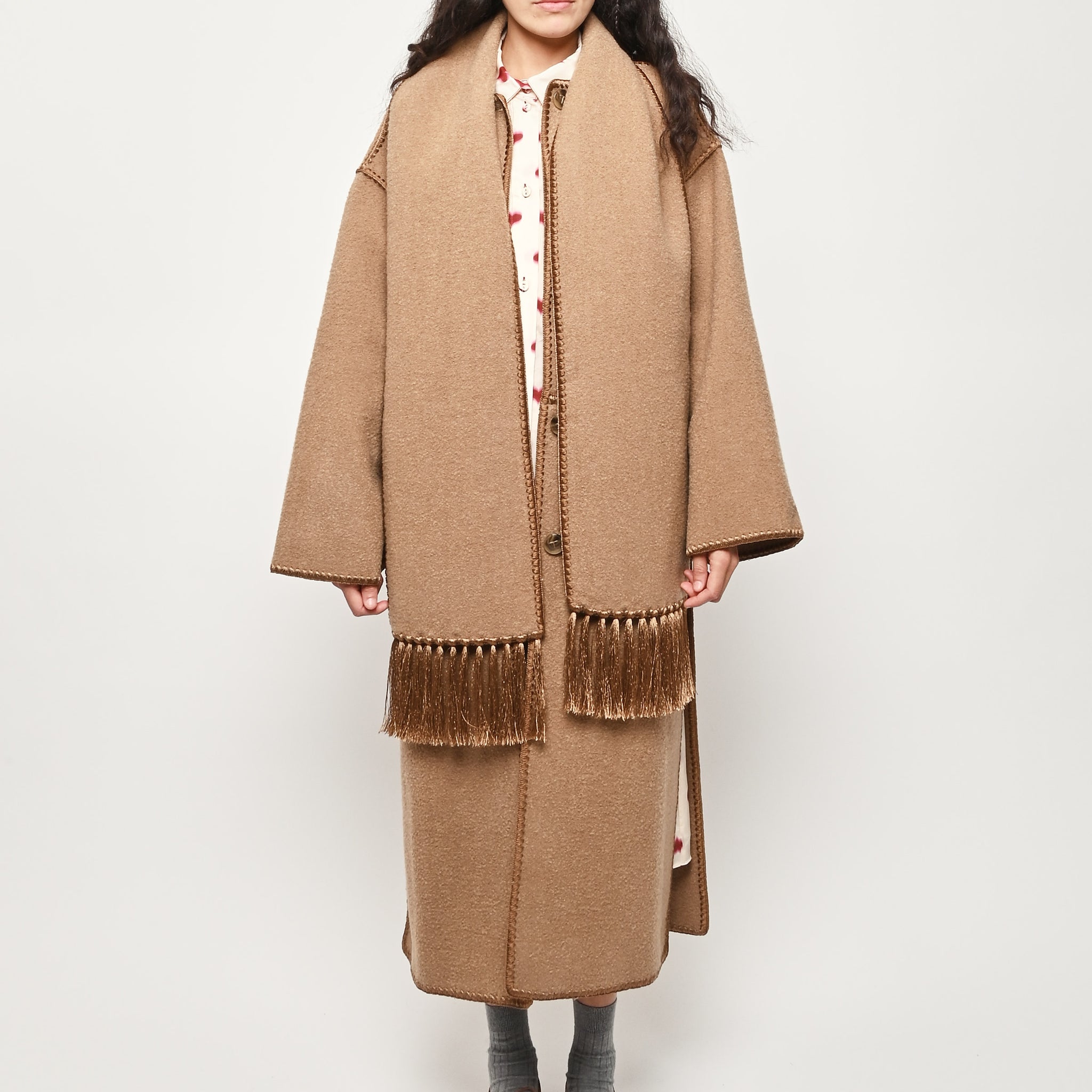 TOTEME Embroidered scarf jacket reworked into an oversized coat with an attached scarf that wraps elegantly around the neck. It is made from a heavyweight wool blend with artisanal blanket stitching and lustrous tassels, then complete with spacious pockets and a buttoned front.