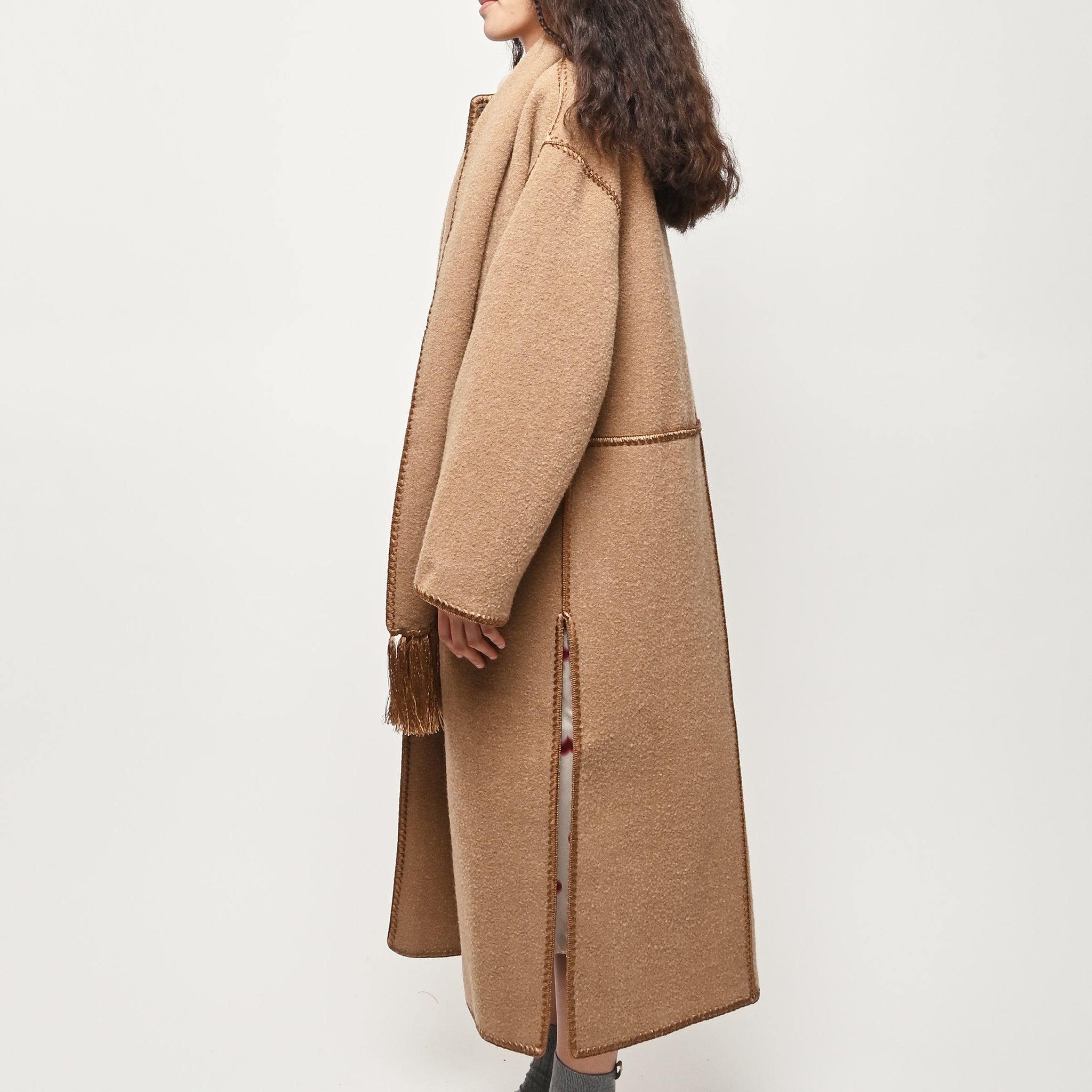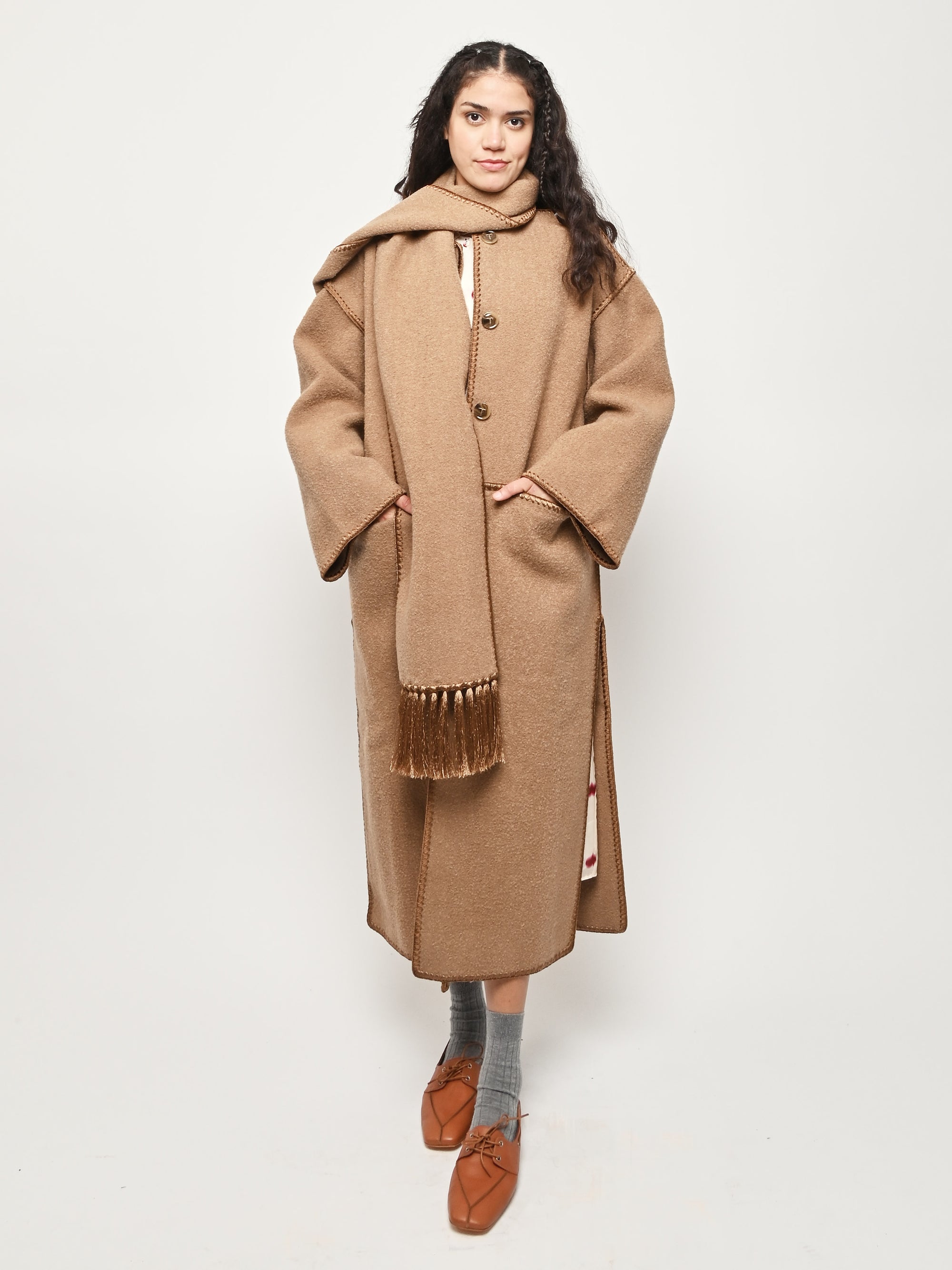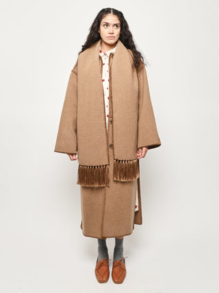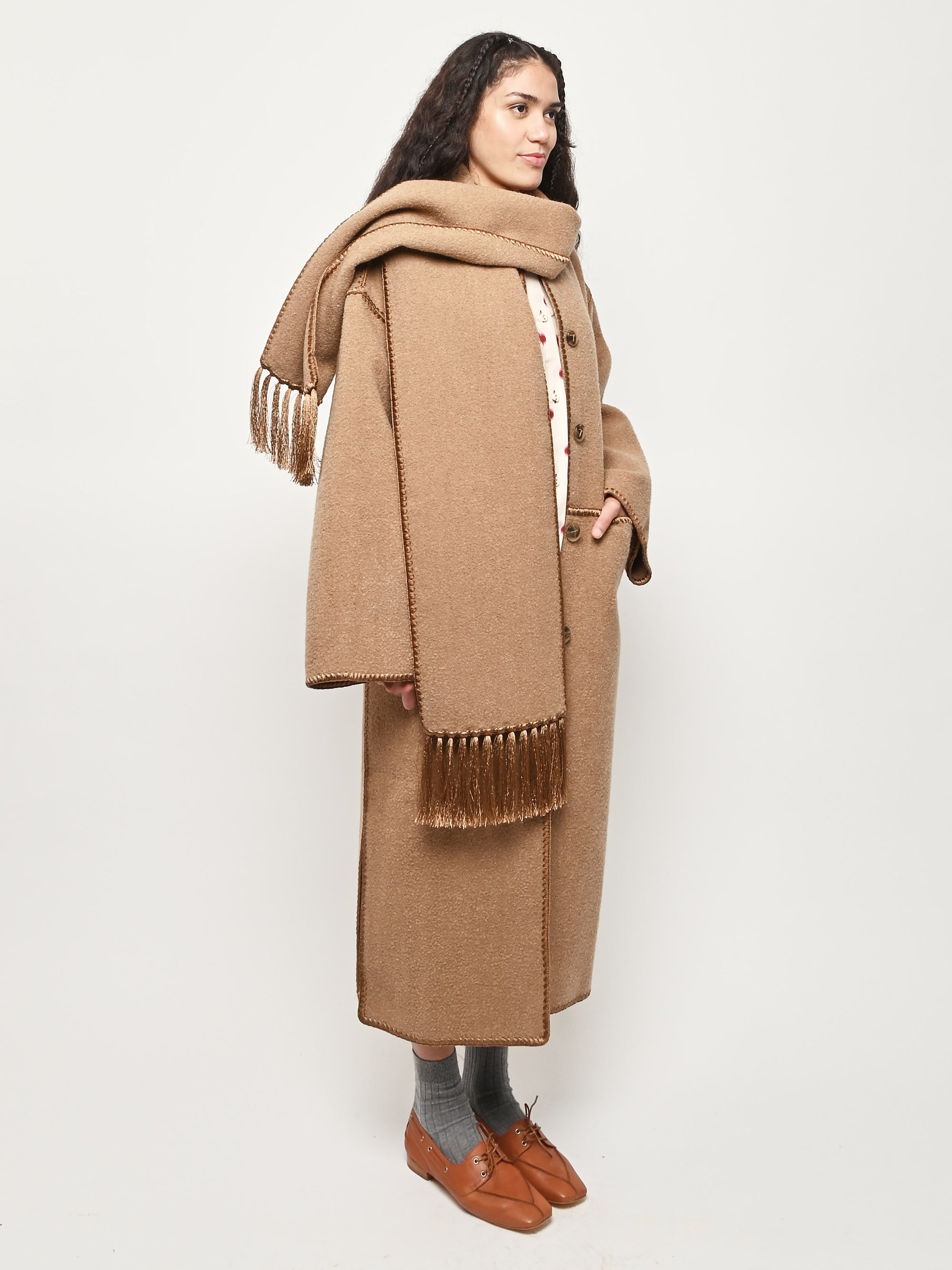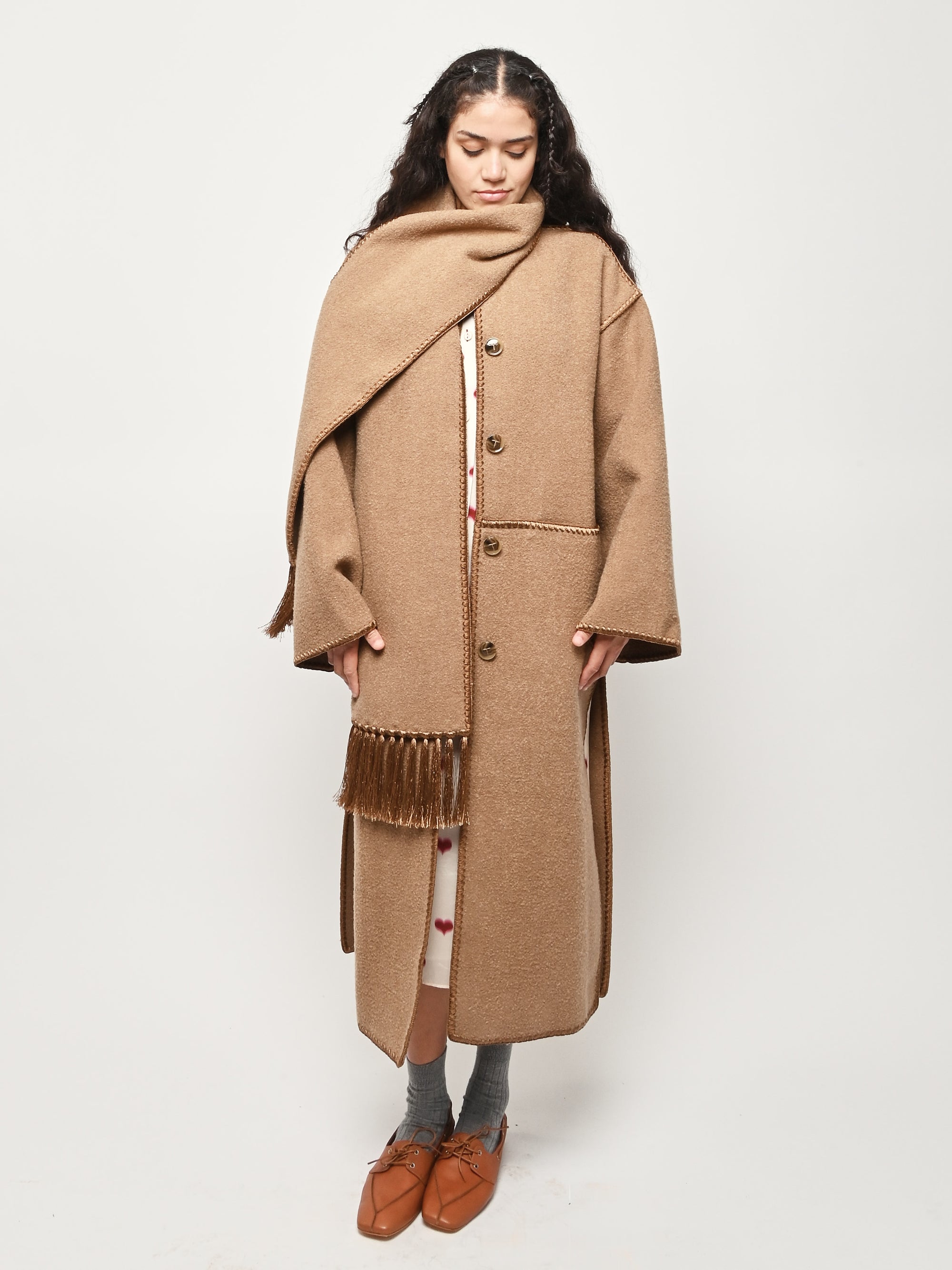 TOTEME Embroidered scarf jacket reworked into an oversized coat with an attached scarf that wraps elegantly around the neck. It is made from a heavyweight wool blend with artisanal blanket stitching and lustrous tassels, then complete with spacious pockets and a buttoned front.