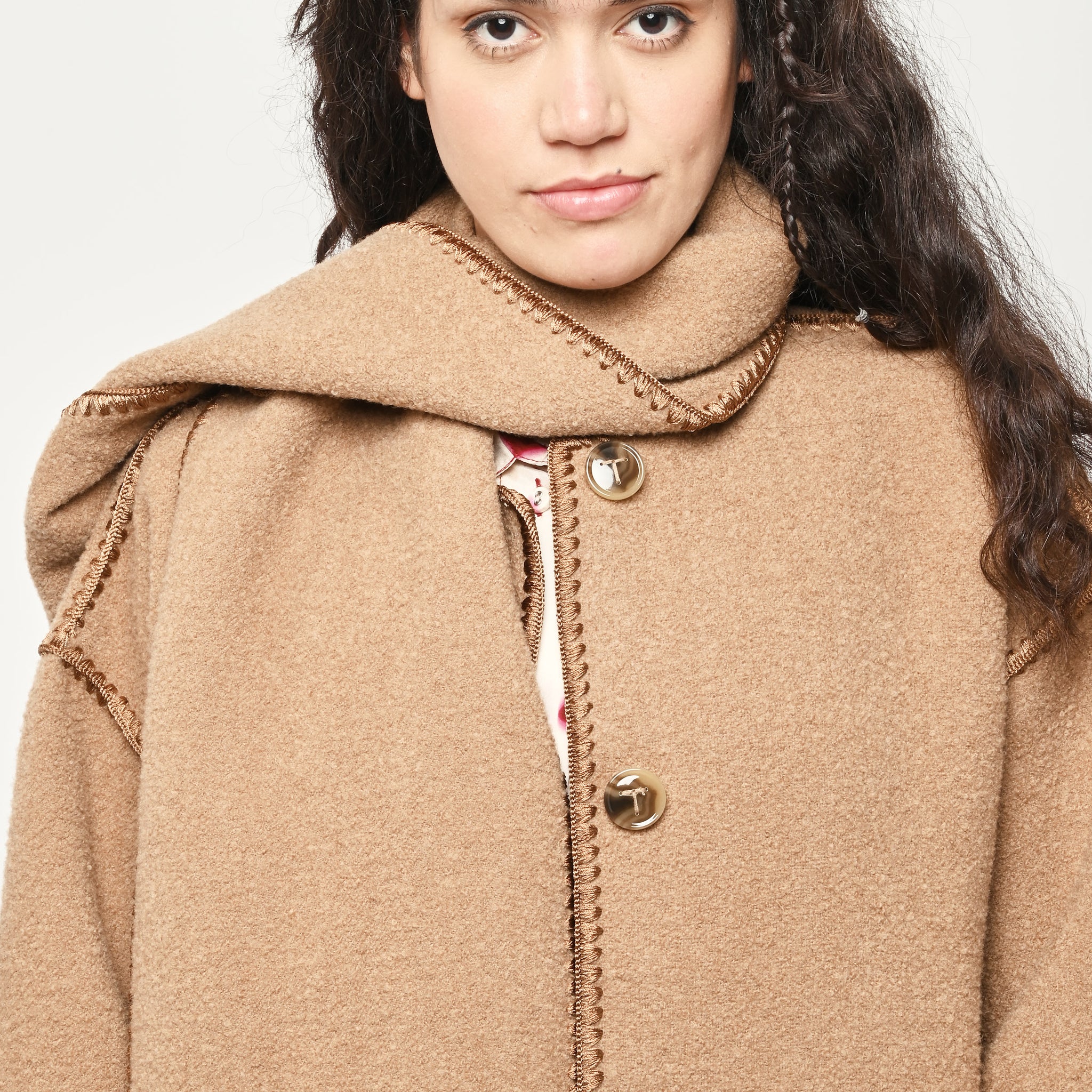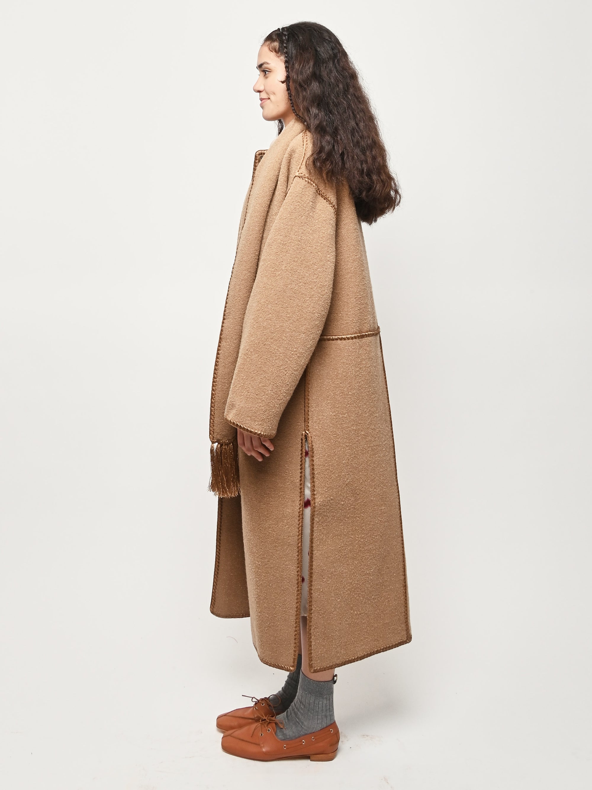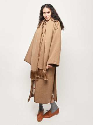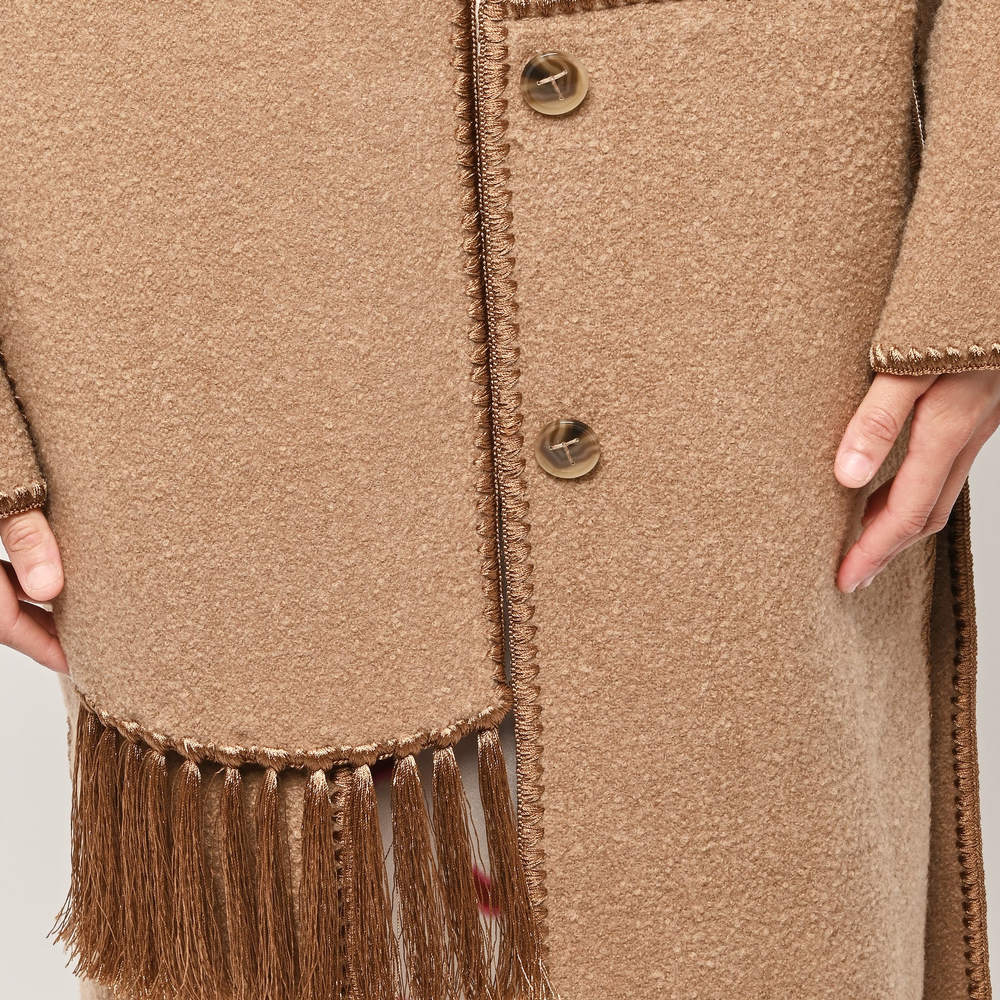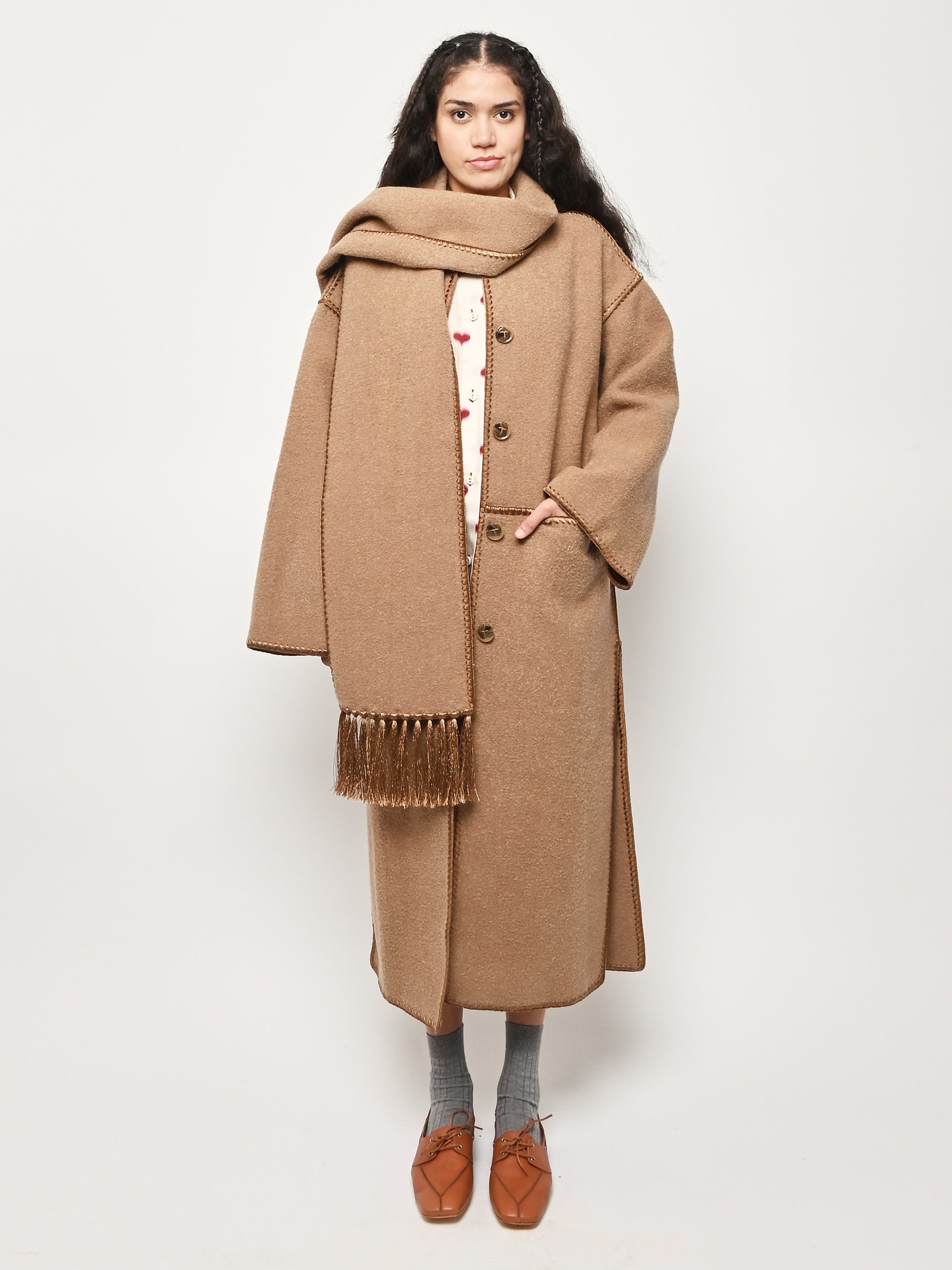 TOTEME Embroidered scarf jacket reworked into an oversized coat with an attached scarf that wraps elegantly around the neck. It is made from a heavyweight wool blend with artisanal blanket stitching and lustrous tassels, then complete with spacious pockets and a buttoned front.