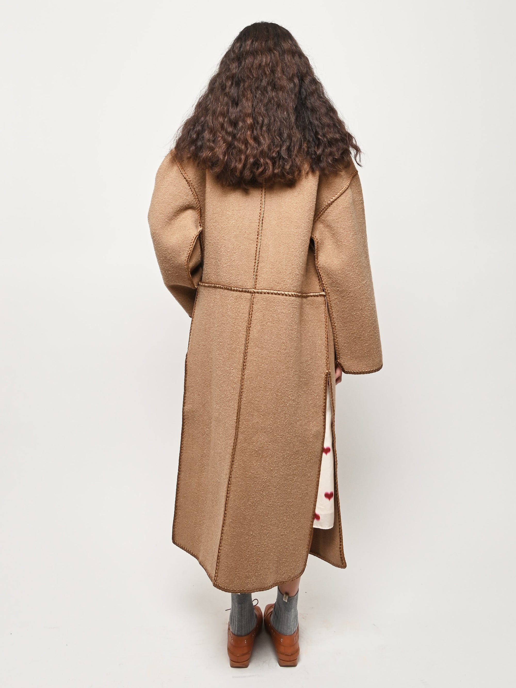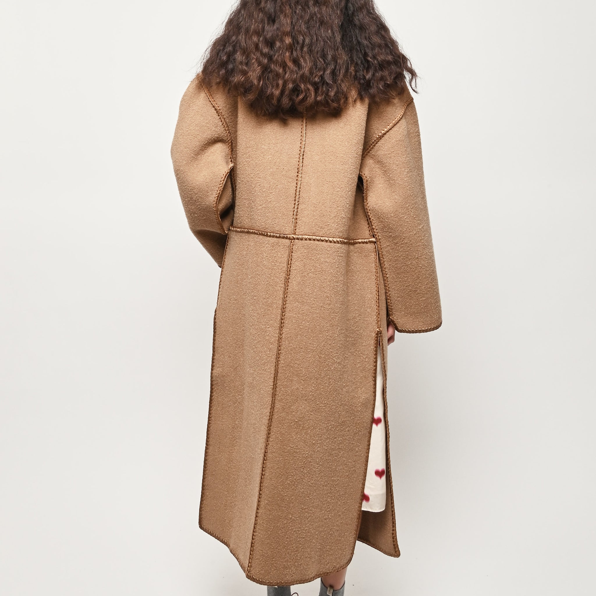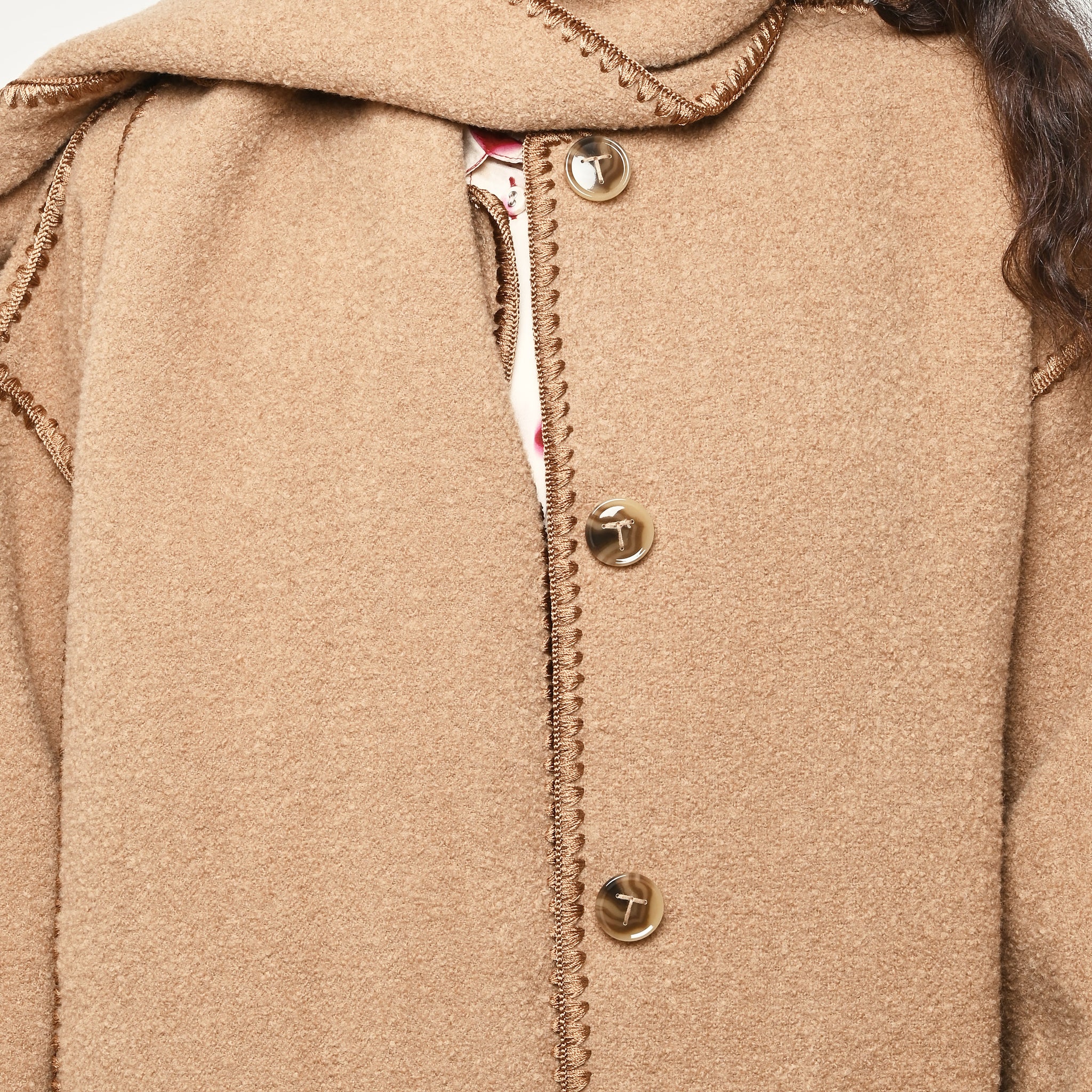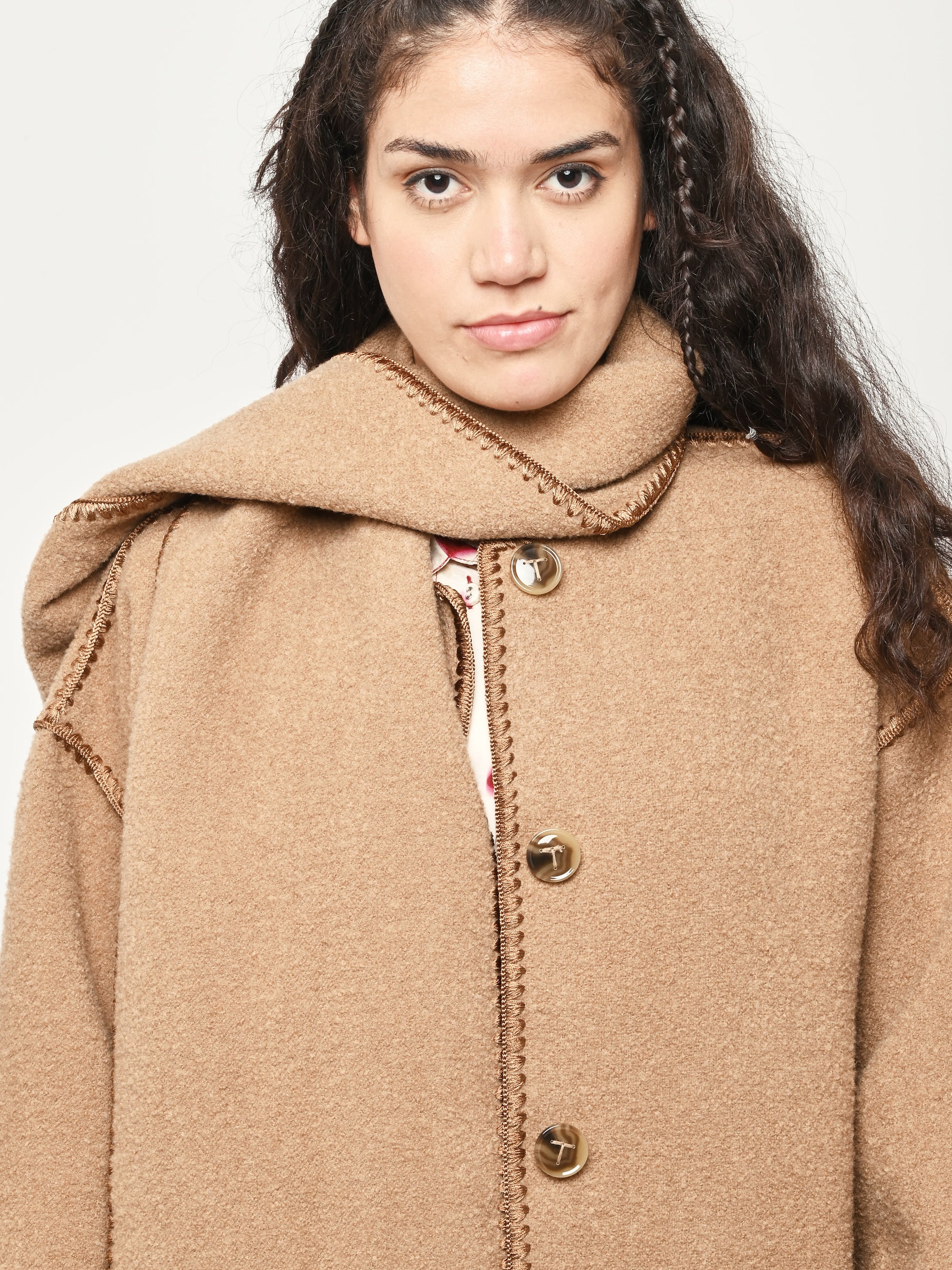 TOTEME Embroidered scarf jacket reworked into an oversized coat with an attached scarf that wraps elegantly around the neck. It is made from a heavyweight wool blend with artisanal blanket stitching and lustrous tassels, then complete with spacious pockets and a buttoned front.