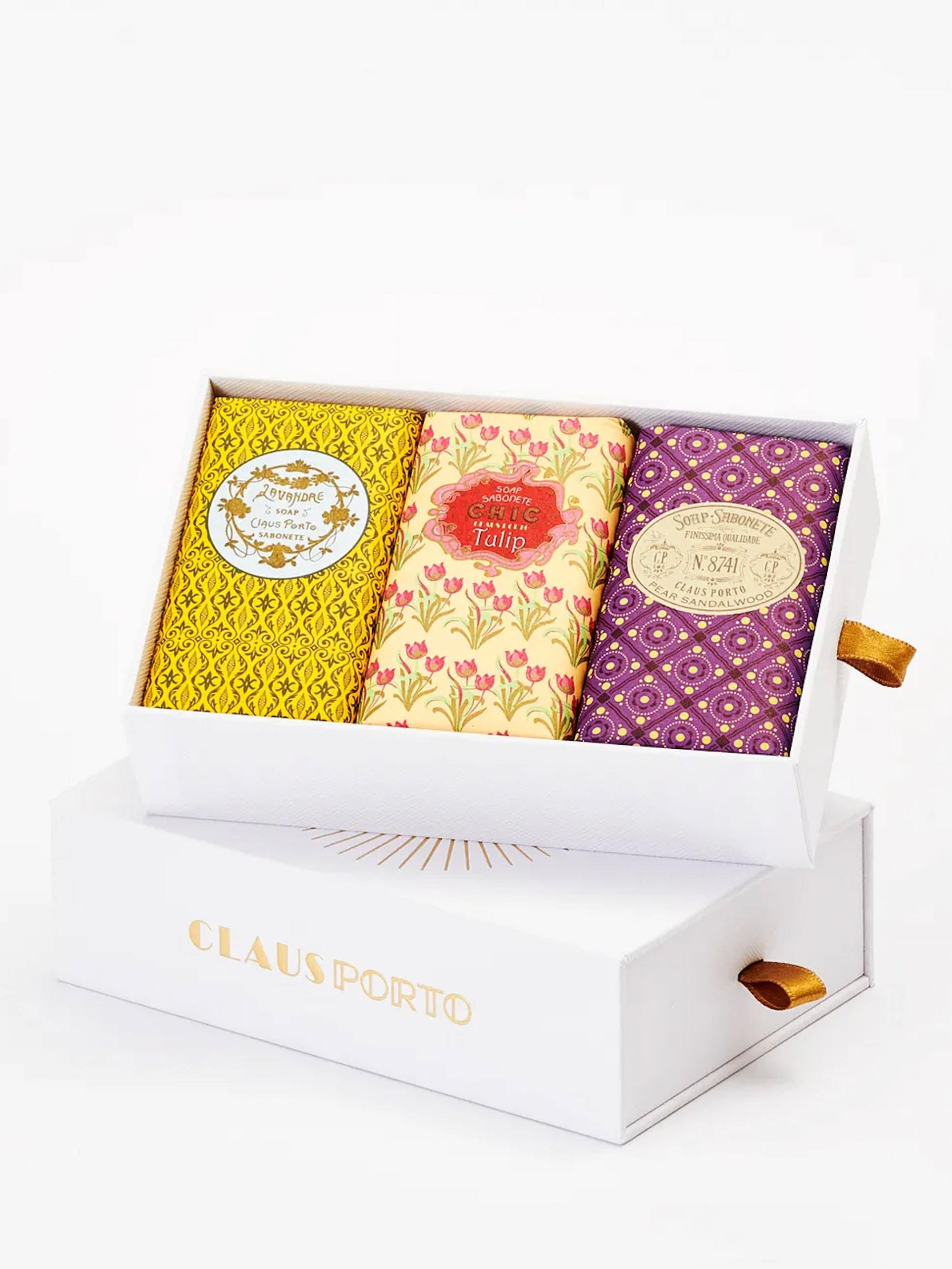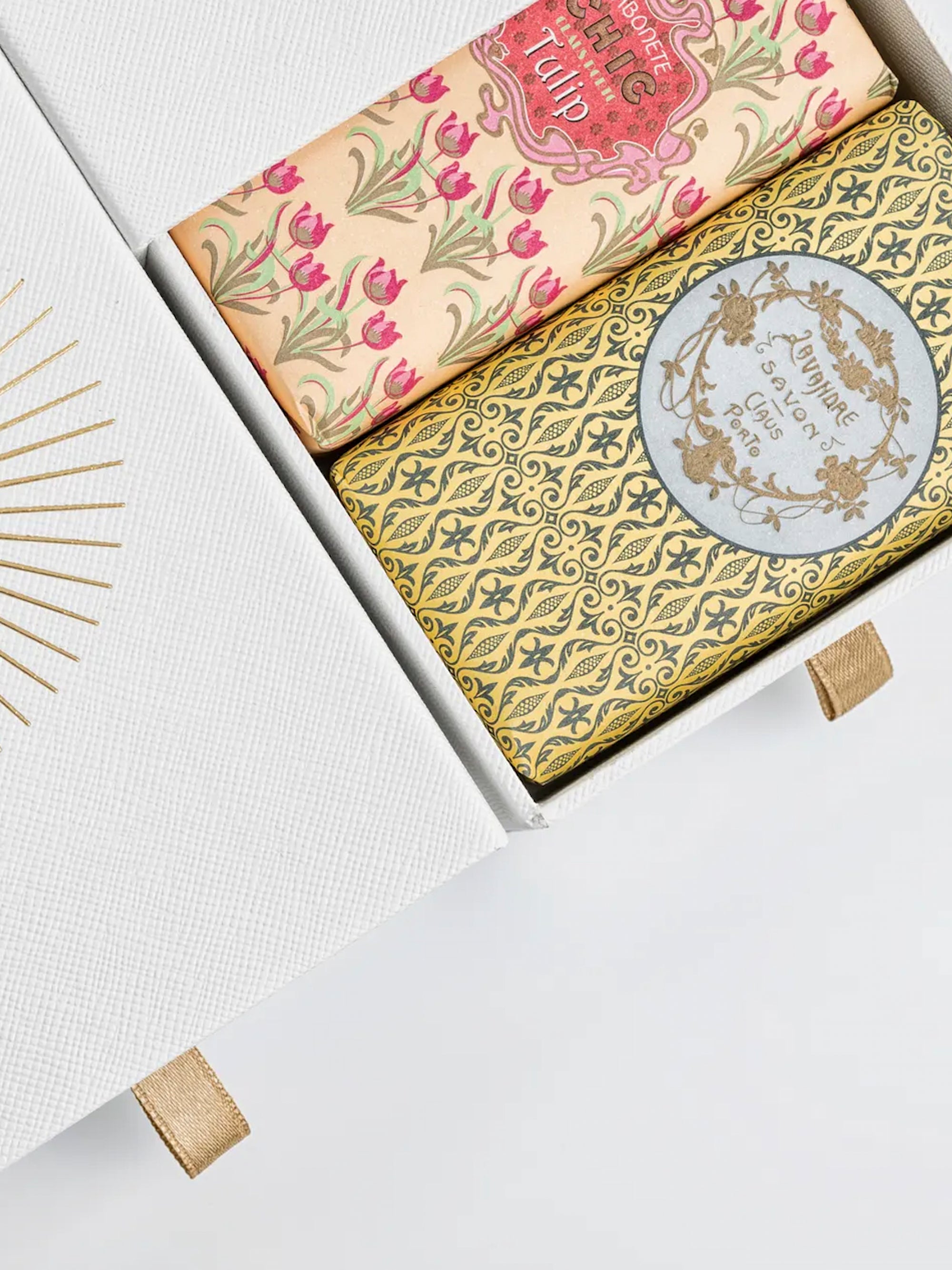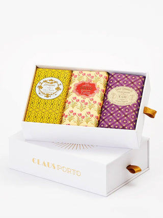 The assortment in this gift box features a selection of three soaps of the Classico range. Blended with mango and pistachio seed oil, these colourful soaps will allow for you to have a glimpse of the glamour of the Belle Époque era, on which its packaging is based. Each soap has a manually placed wax seal, with the brand’s logo. 8741, Chic and Lavandre are the soaps presented in this coffret.
