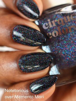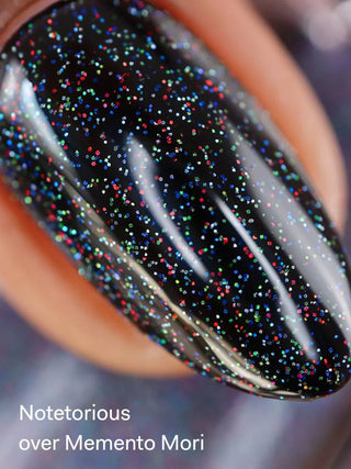Notetorious is a rainbow holographic glitter nail polish topper in a clear base. Please note glitter polishes dry slightly textured. We recommend applying 2 layers of top coat to smooth out the finish.