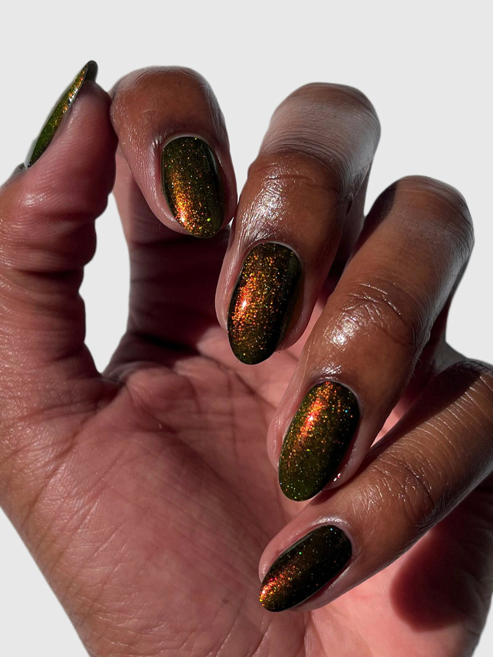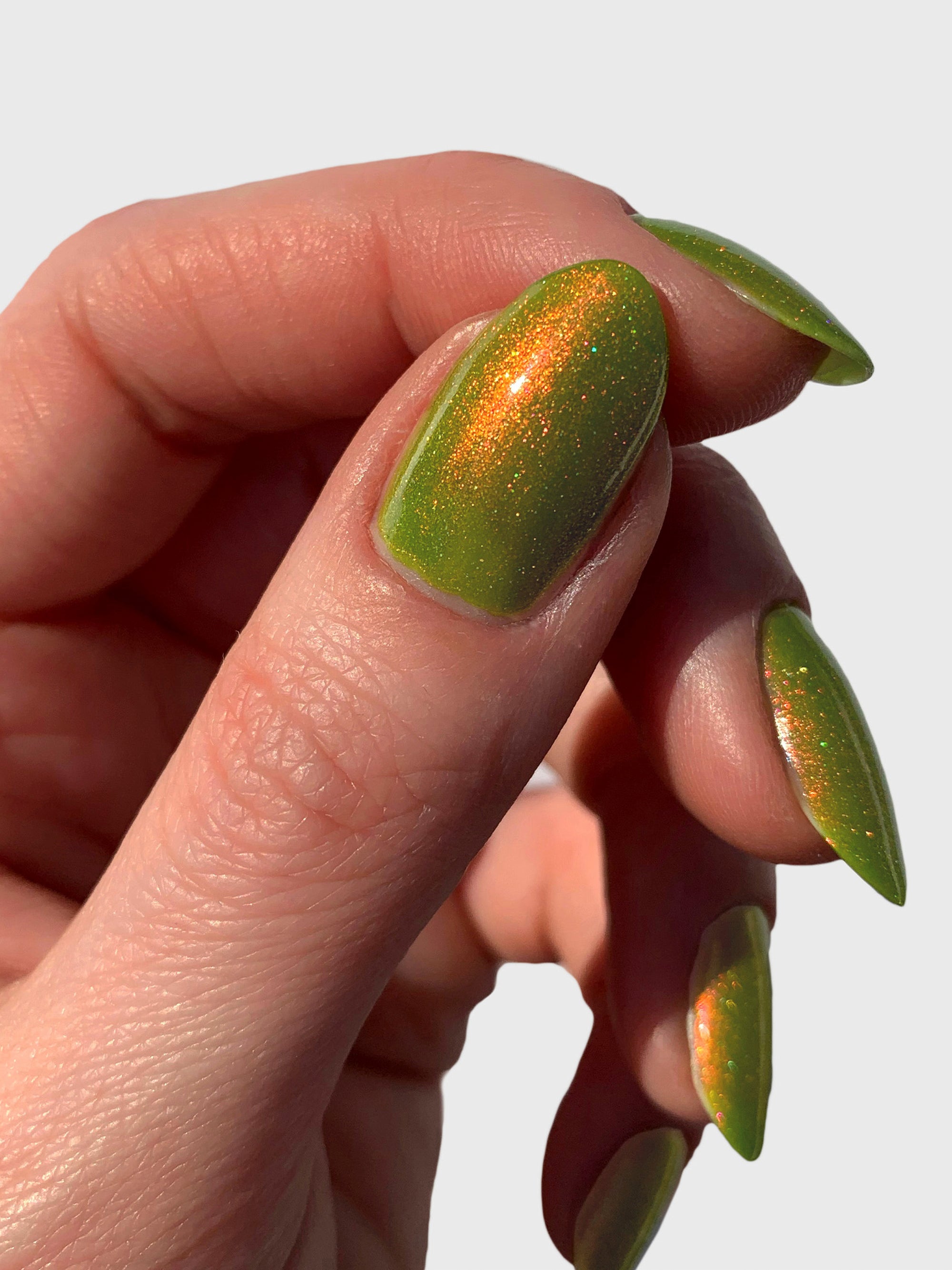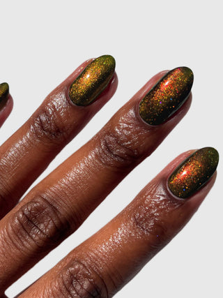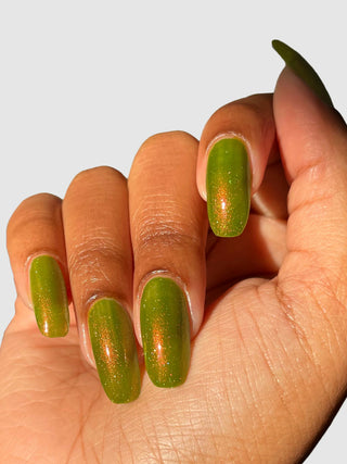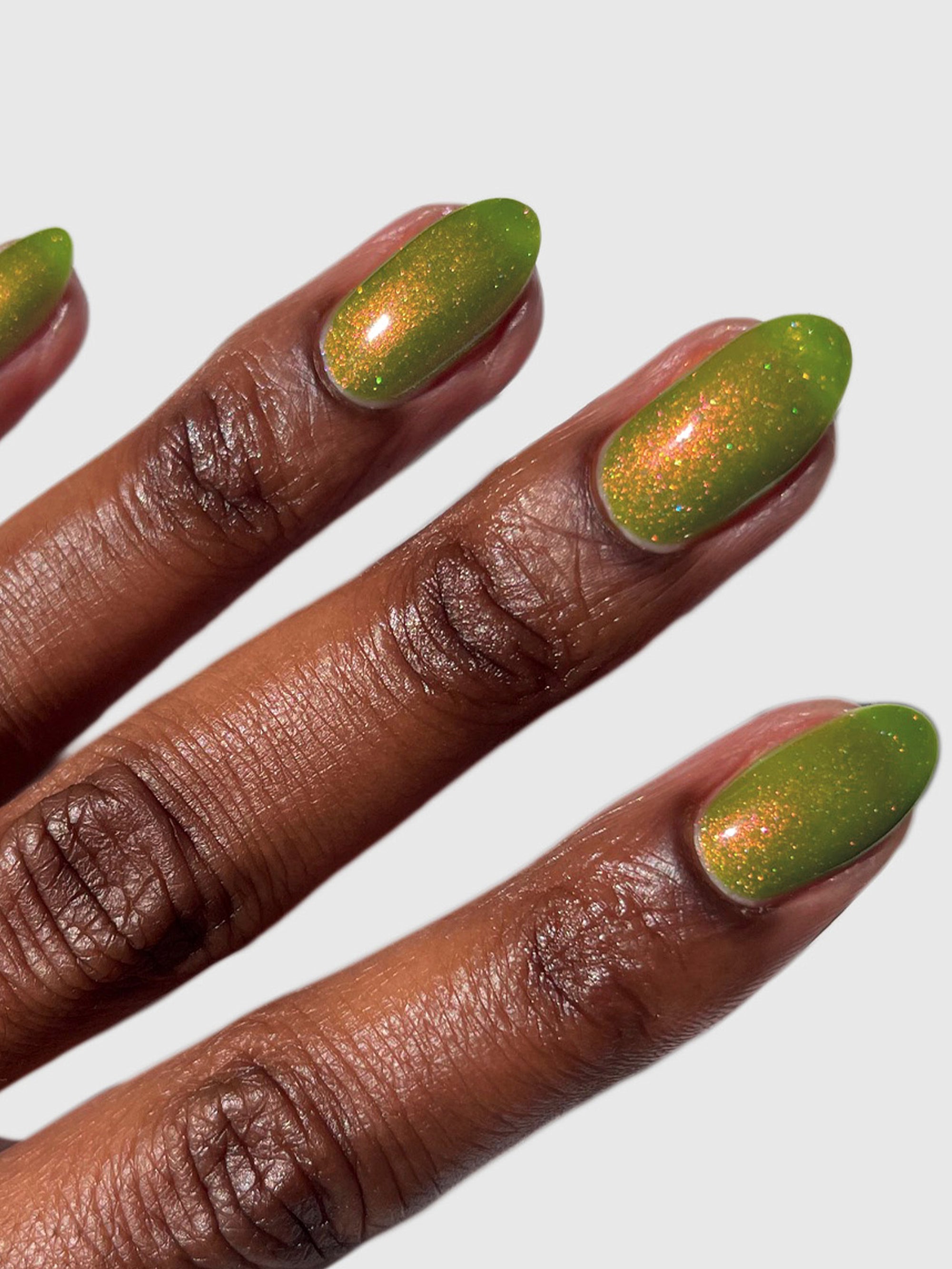 Groove Thing is a chartreuse green nail polish with dazzling red-gold-green color-shifting shimmer and delicate holographic sparkle.