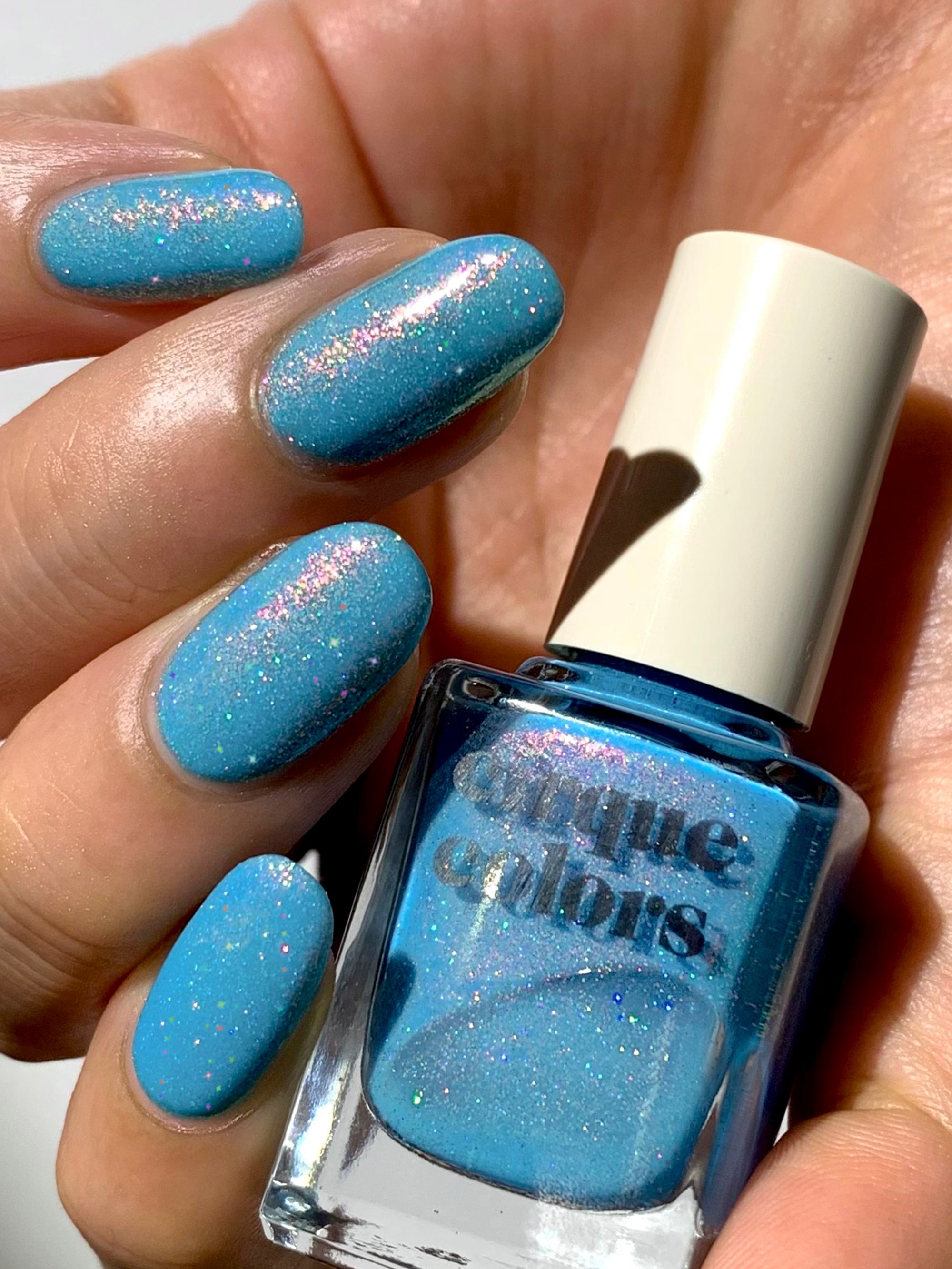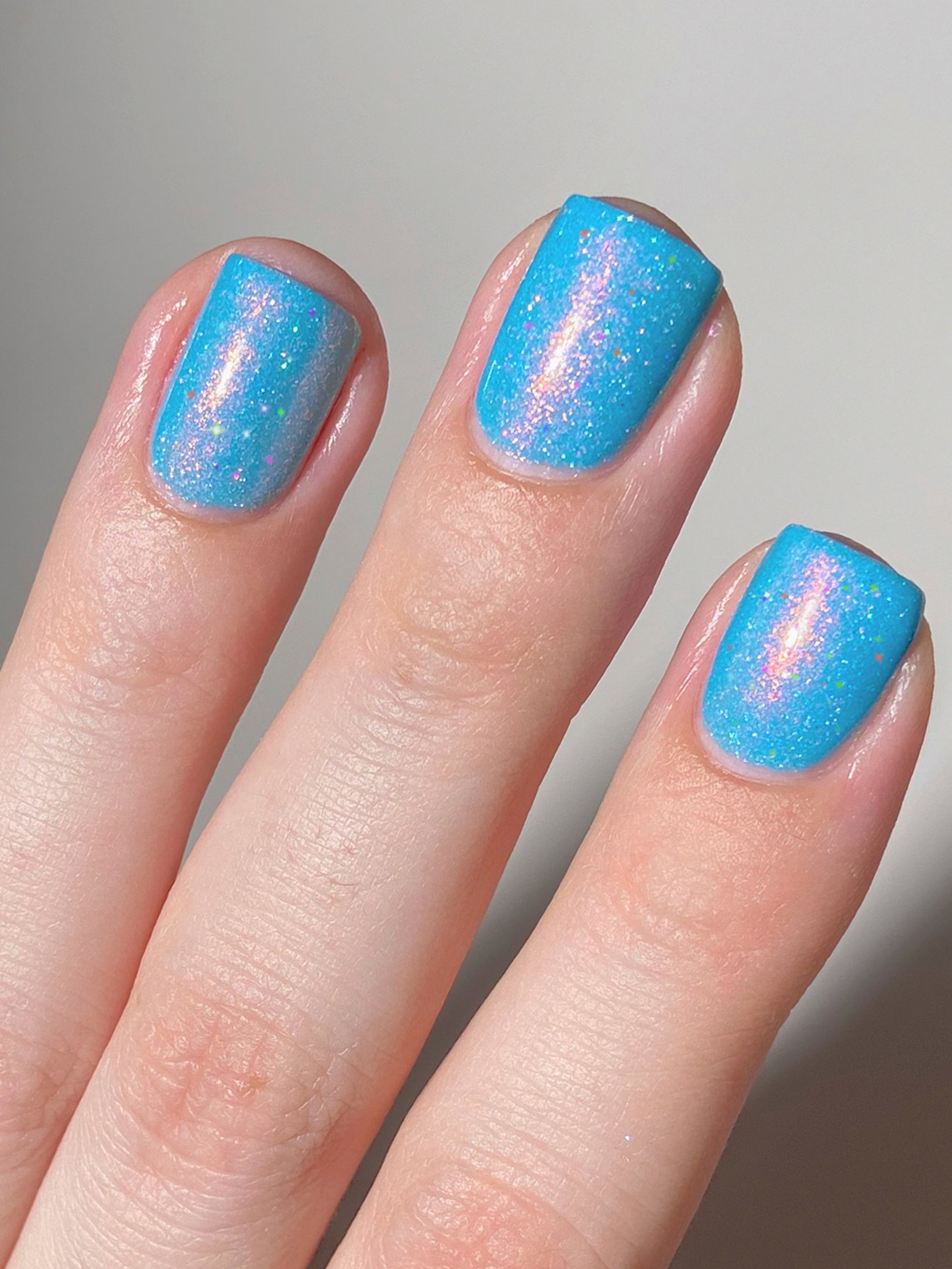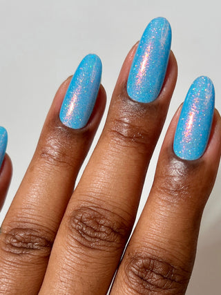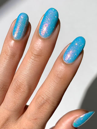 Tipsy Turvy is a robin egg blue jelly Shimmergraphic™ nail polish with a red-orange-green color shifting aurora shimmer and an intense scattered holographic effect.