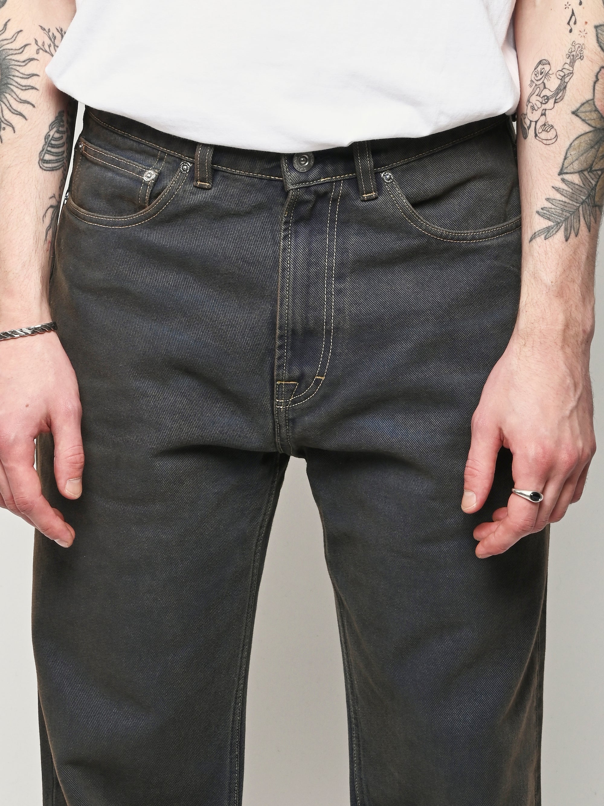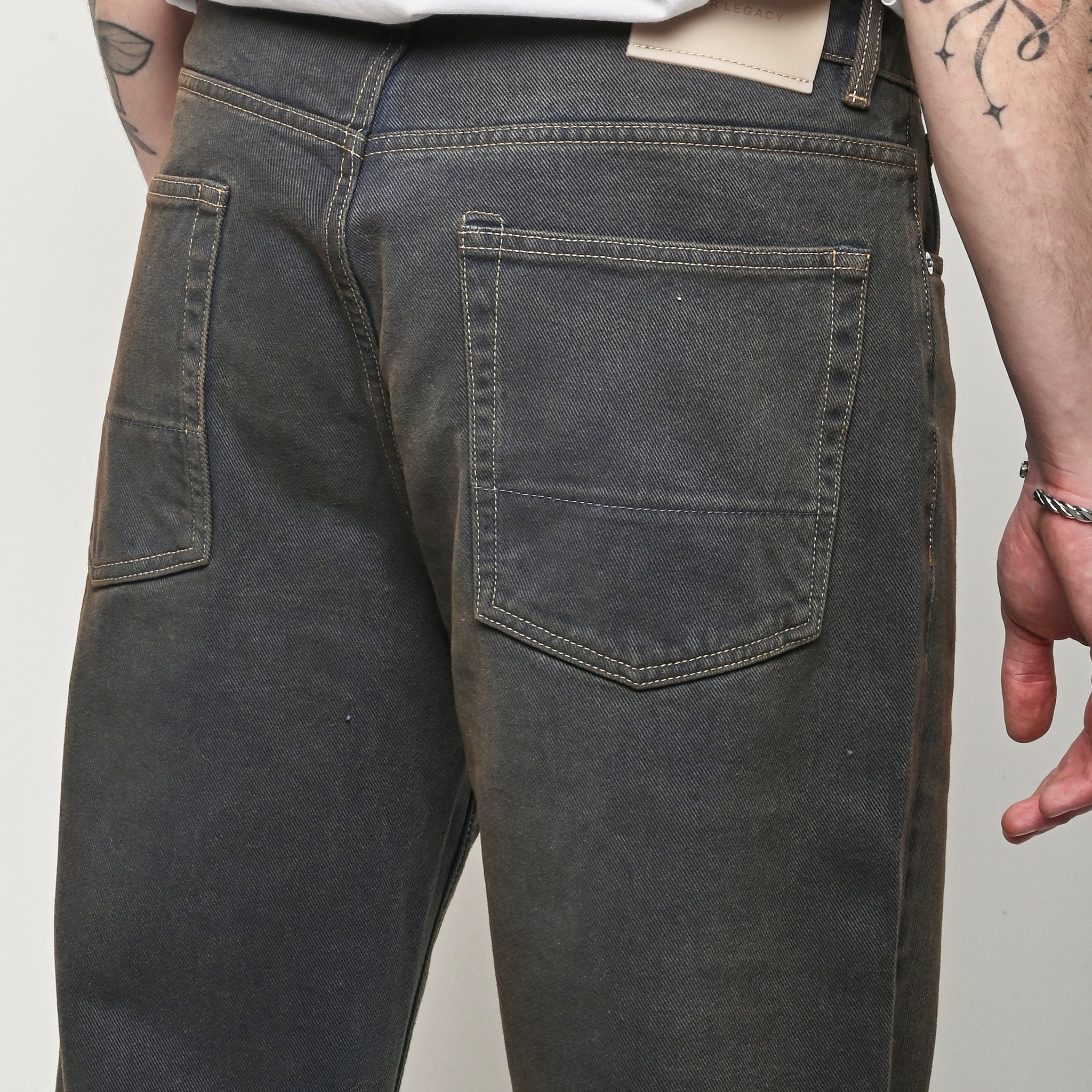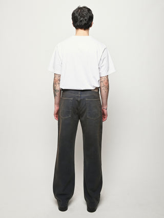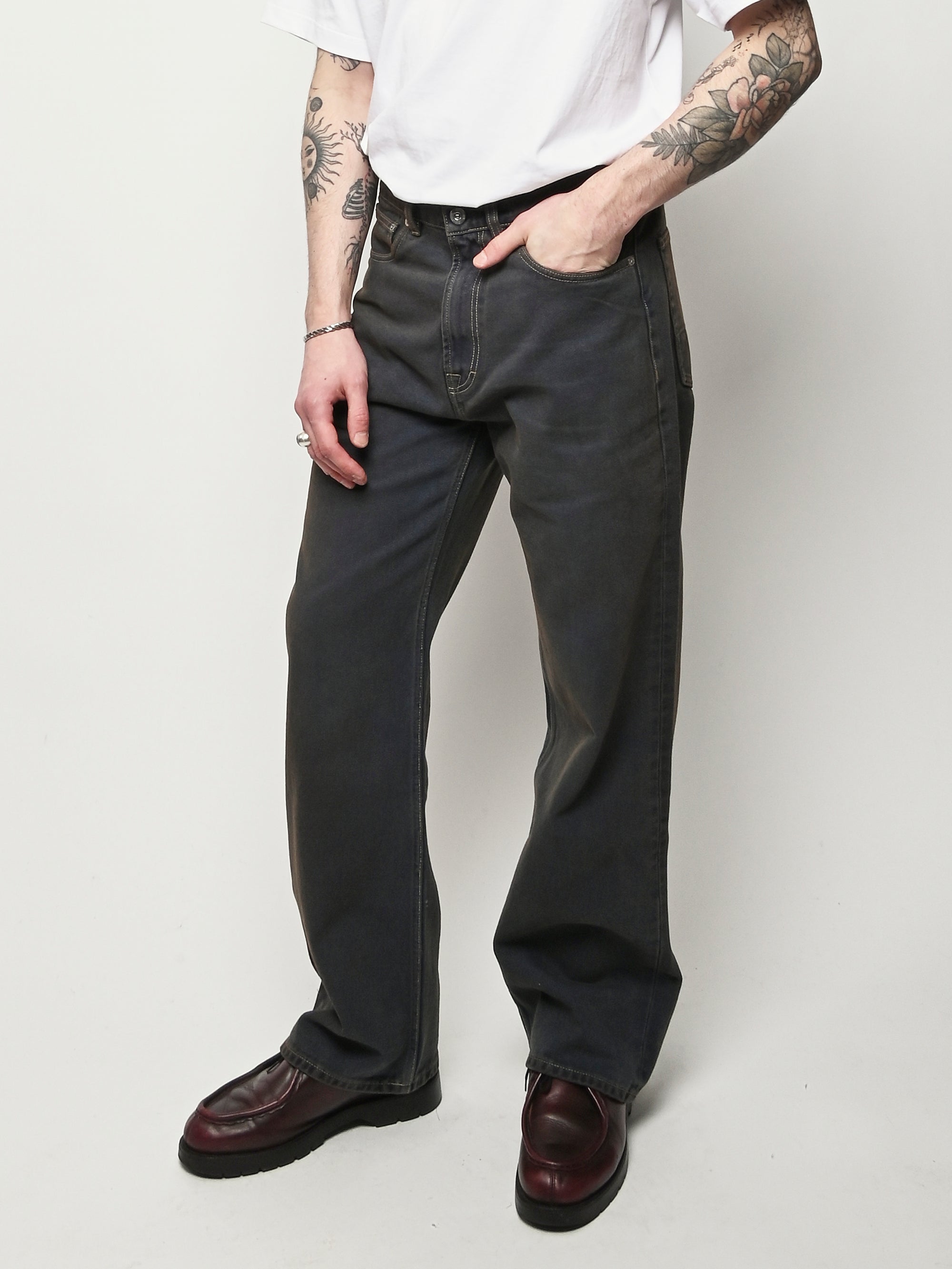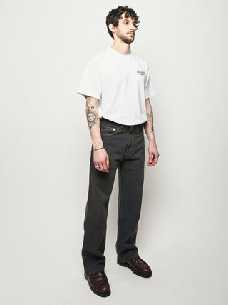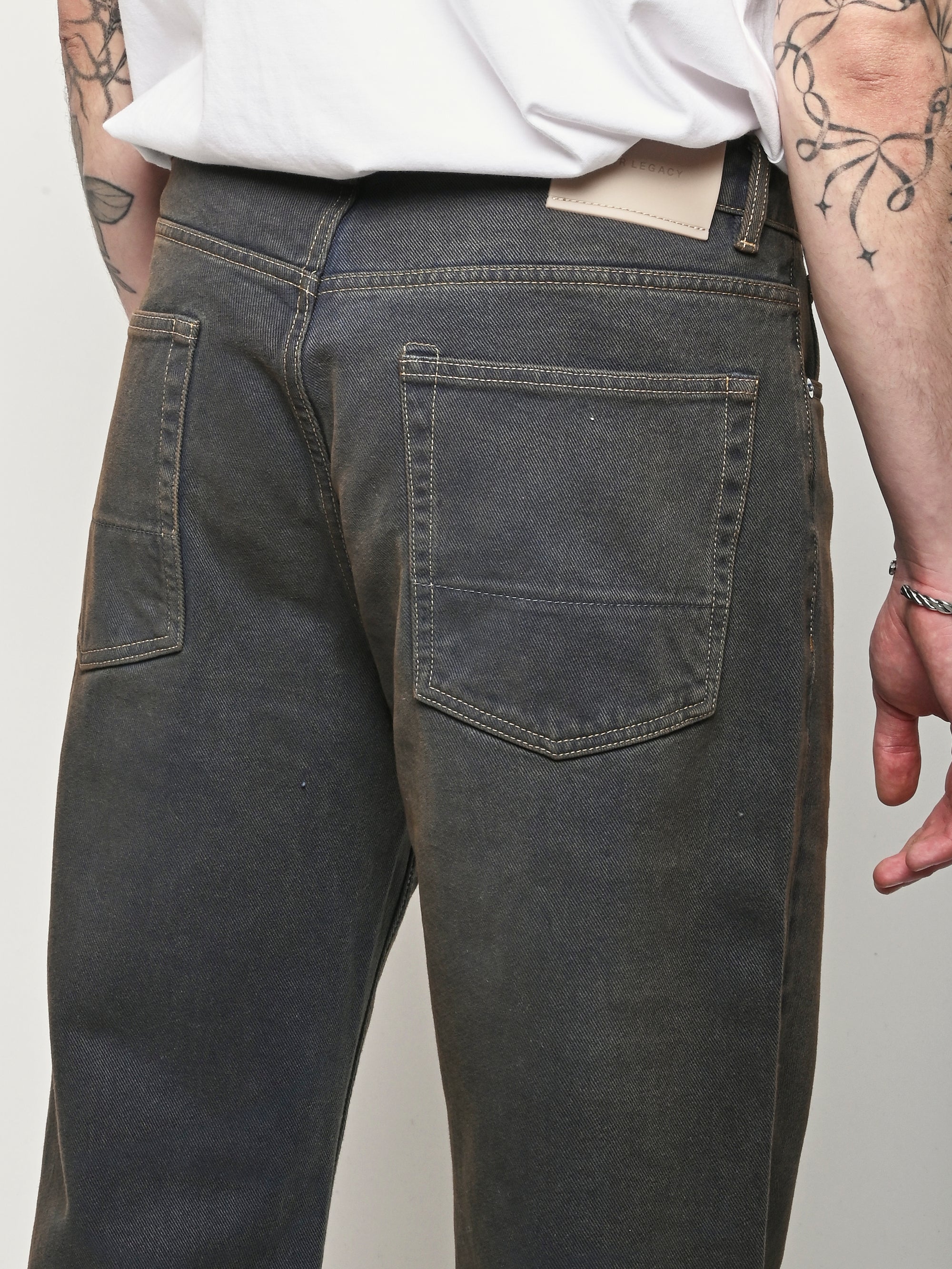 Our Legacy Third Cut in Dusty Phantom. Produced in Italian cotton fabric, the men's Third Cut has a relaxed fit with wide straight legs and features indigo dyeing, hand-distressed wash process, YKK zip fly, metal rivets, five pockets with reinforced back pockets, and the Our Legacy rubber patch. This fabric is crafted by overdyeing ecru material with indigo, using a newly invented, fully sustainable synthetic indigo. Following the overdyeing process, artisanal treatments and fades were applied, resulting in a distinctive dirty blue tone. The aesthetic draws inspiration from vintage, distressed, and almost antique workwear, yet reimagined with a contemporary, post-apocalyptic edge. This garment is manufactured using carefully sourced material with a unique treatment process that will give each garment an individual shade and appearance. This technique could result in some color bleed onto lighter garments or surfaces. The garment shall be shaped by its wearer and naturally distress over time to finish the design process.