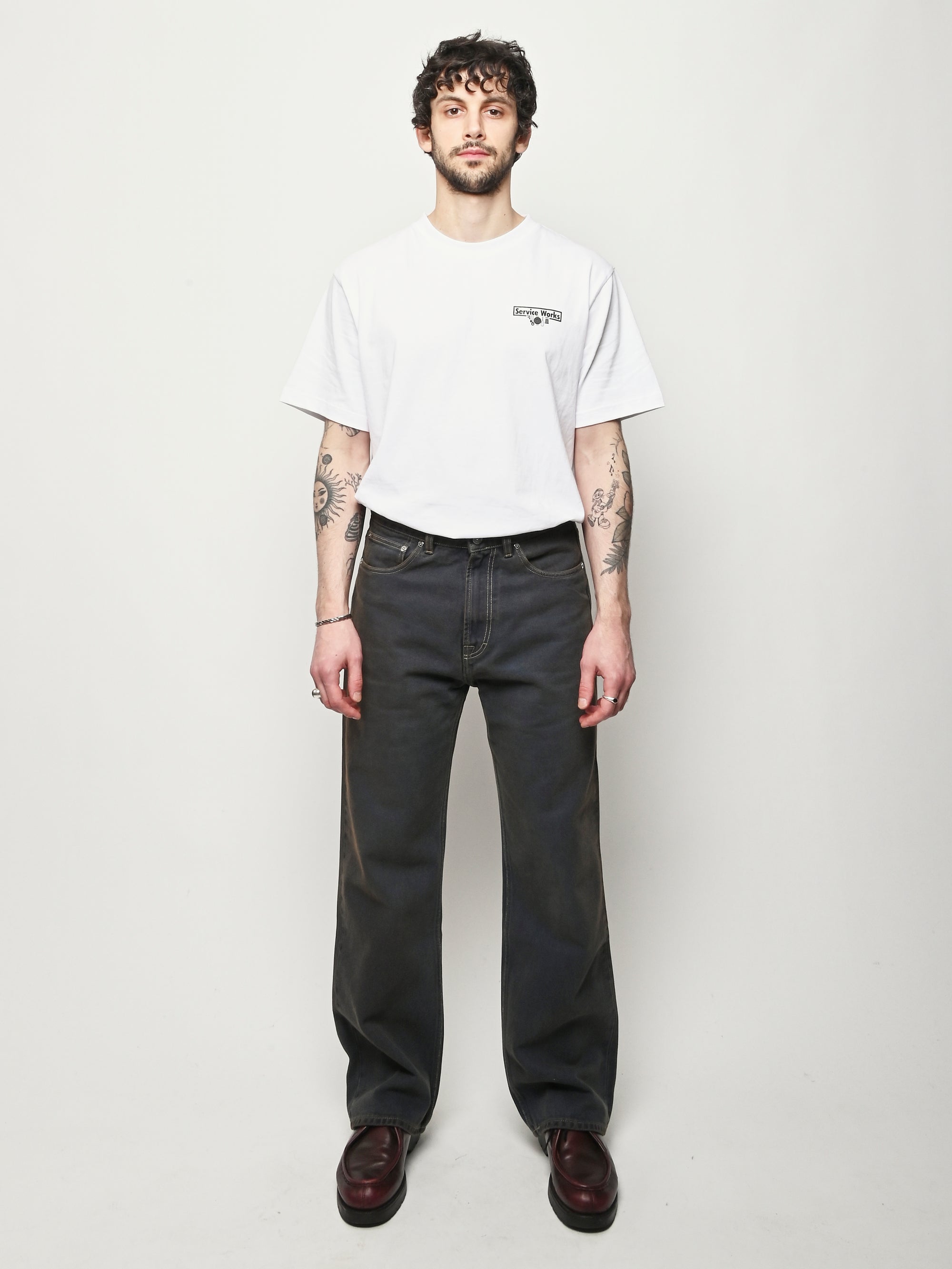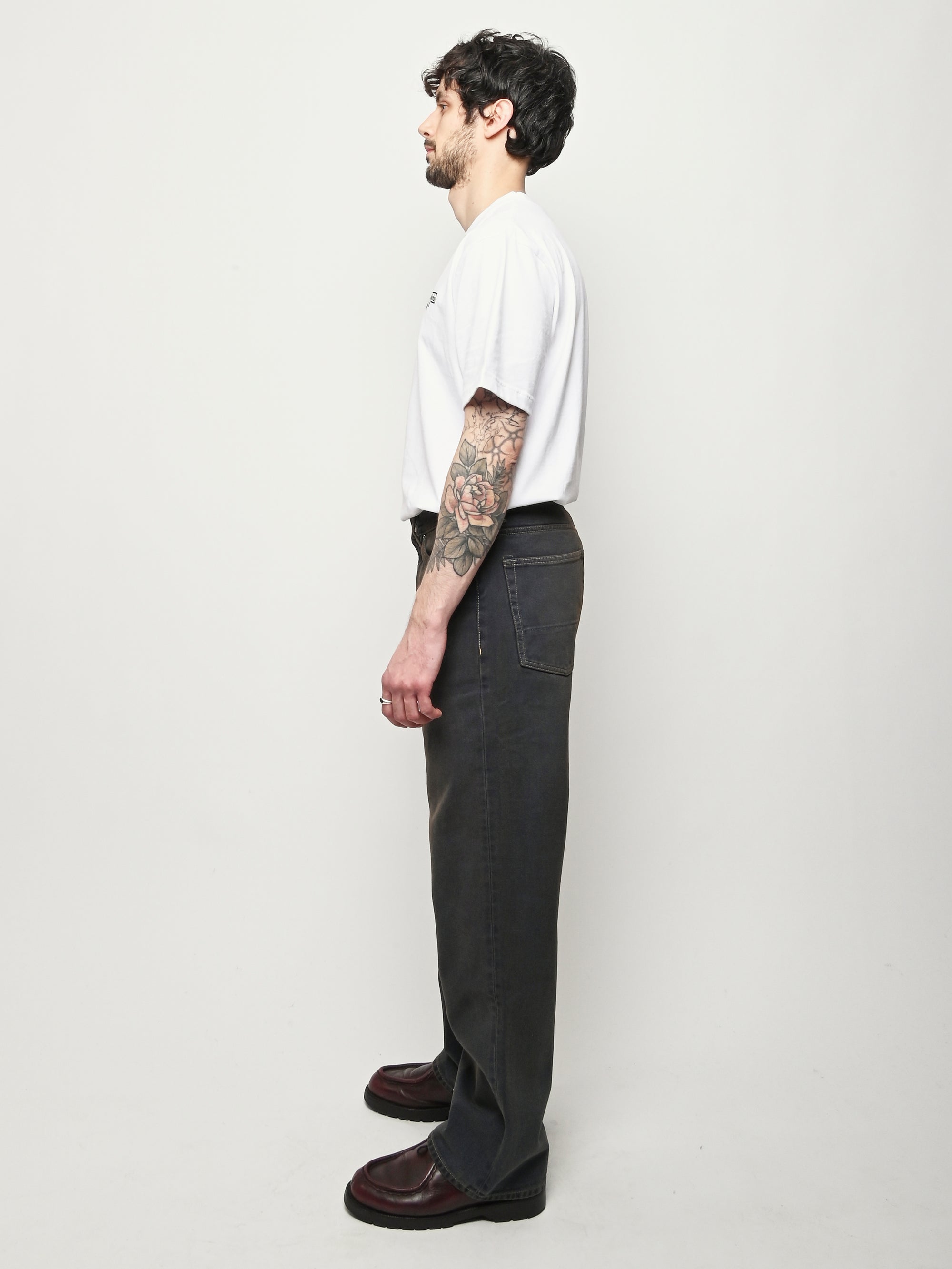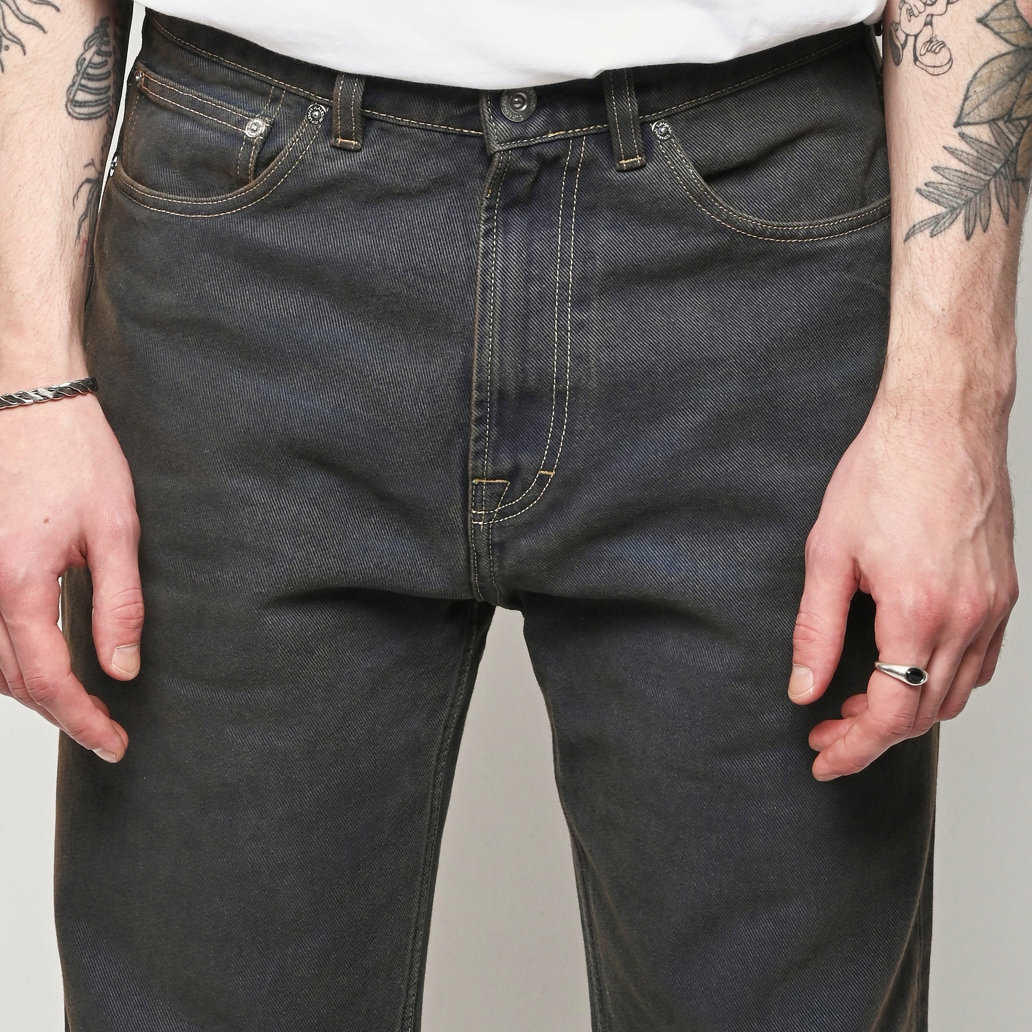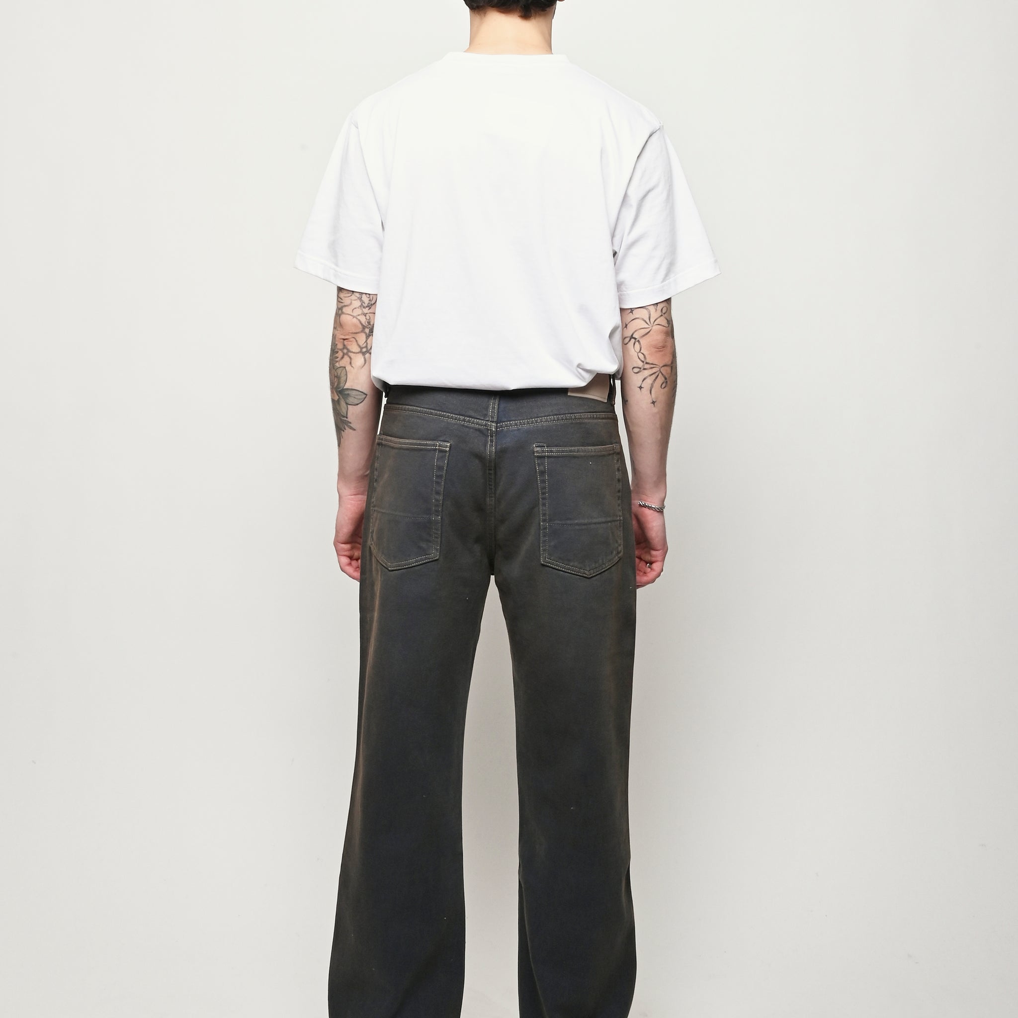 Our Legacy Third Cut in Dusty Phantom. Produced in Italian cotton fabric, the men's Third Cut has a relaxed fit with wide straight legs and features indigo dyeing, hand-distressed wash process, YKK zip fly, metal rivets, five pockets with reinforced back pockets, and the Our Legacy rubber patch. This fabric is crafted by overdyeing ecru material with indigo, using a newly invented, fully sustainable synthetic indigo. Following the overdyeing process, artisanal treatments and fades were applied, resulting in a distinctive dirty blue tone. The aesthetic draws inspiration from vintage, distressed, and almost antique workwear, yet reimagined with a contemporary, post-apocalyptic edge. This garment is manufactured using carefully sourced material with a unique treatment process that will give each garment an individual shade and appearance. This technique could result in some color bleed onto lighter garments or surfaces. The garment shall be shaped by its wearer and naturally distress over time to finish the design process.