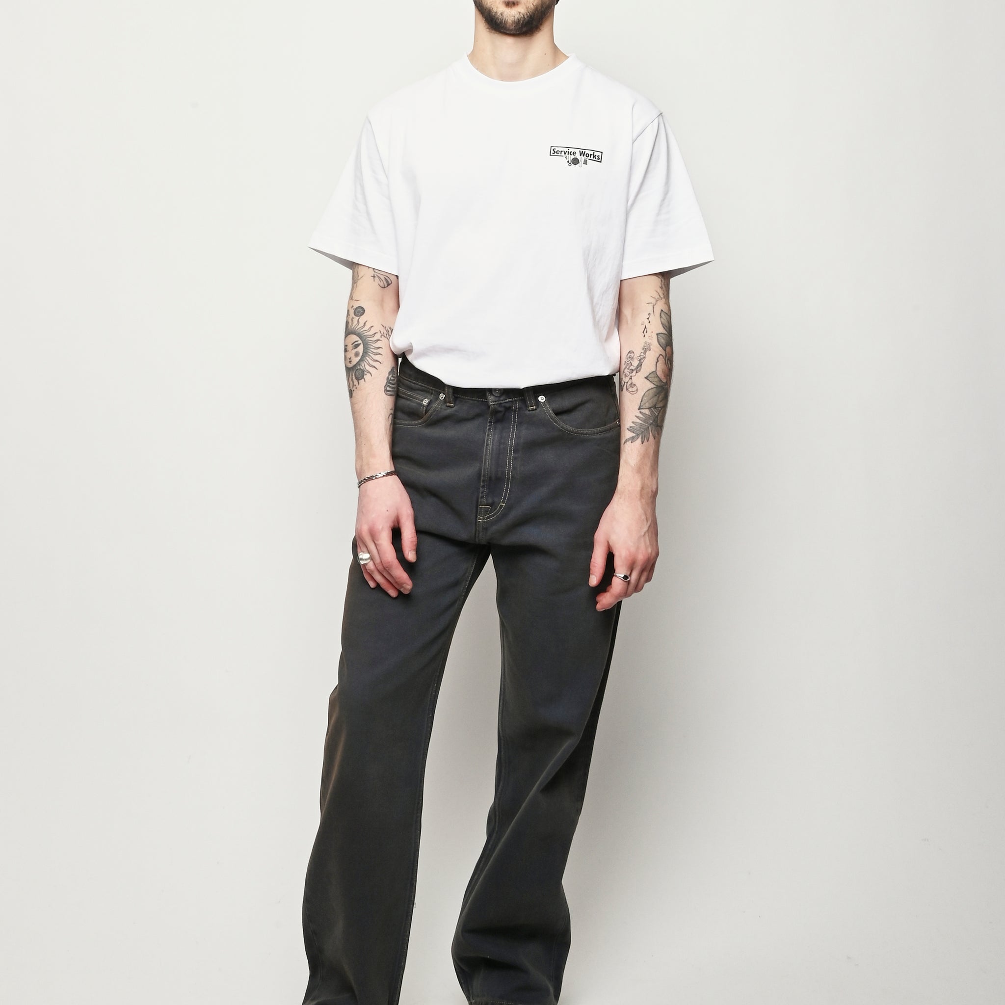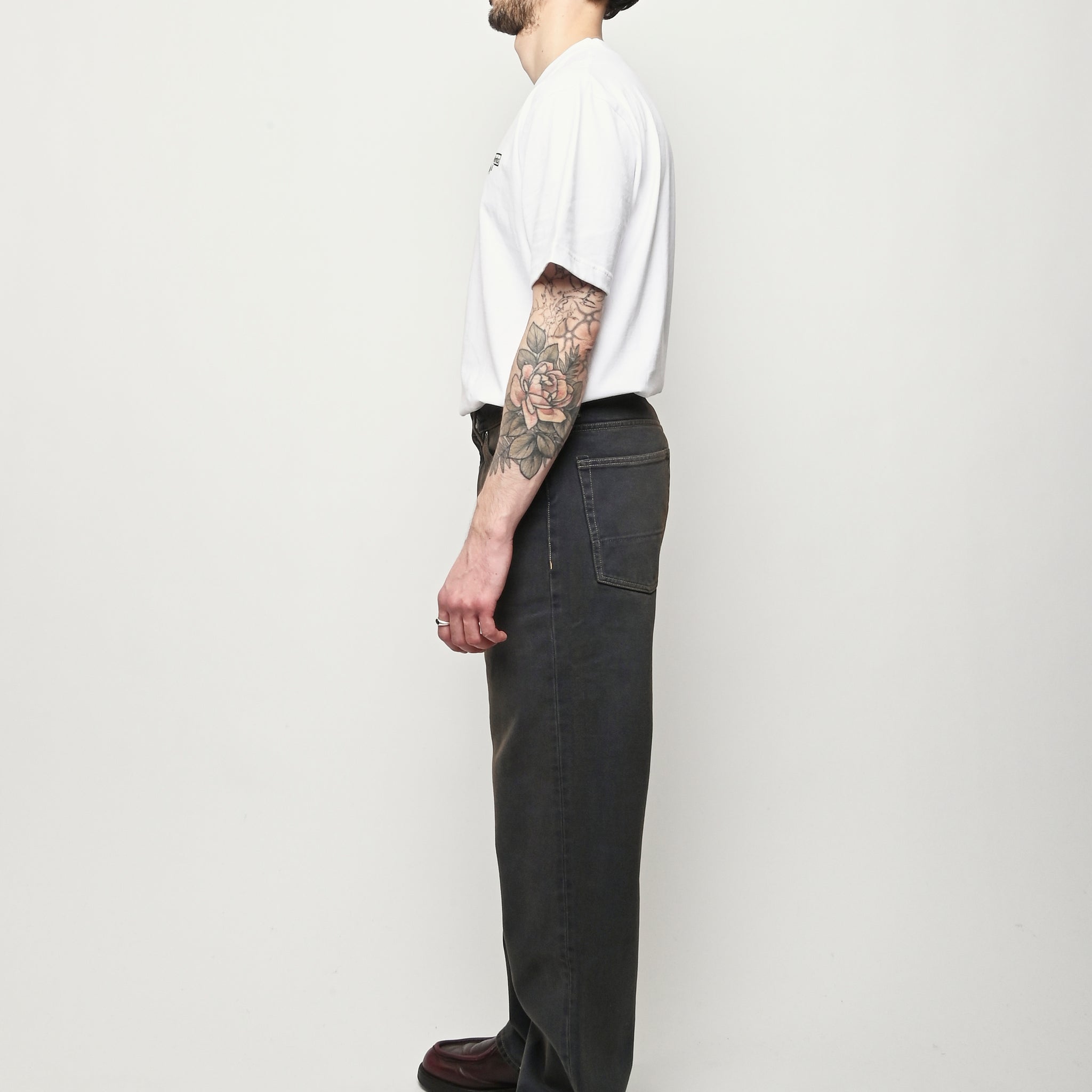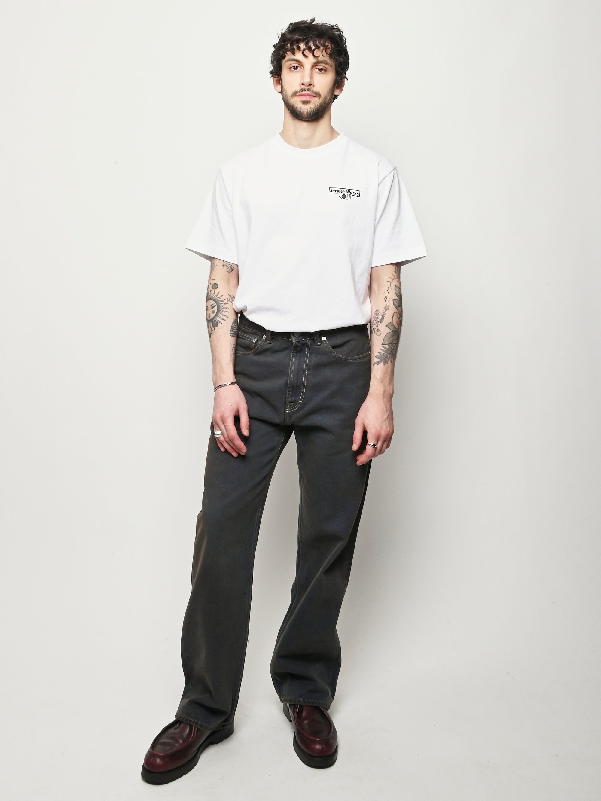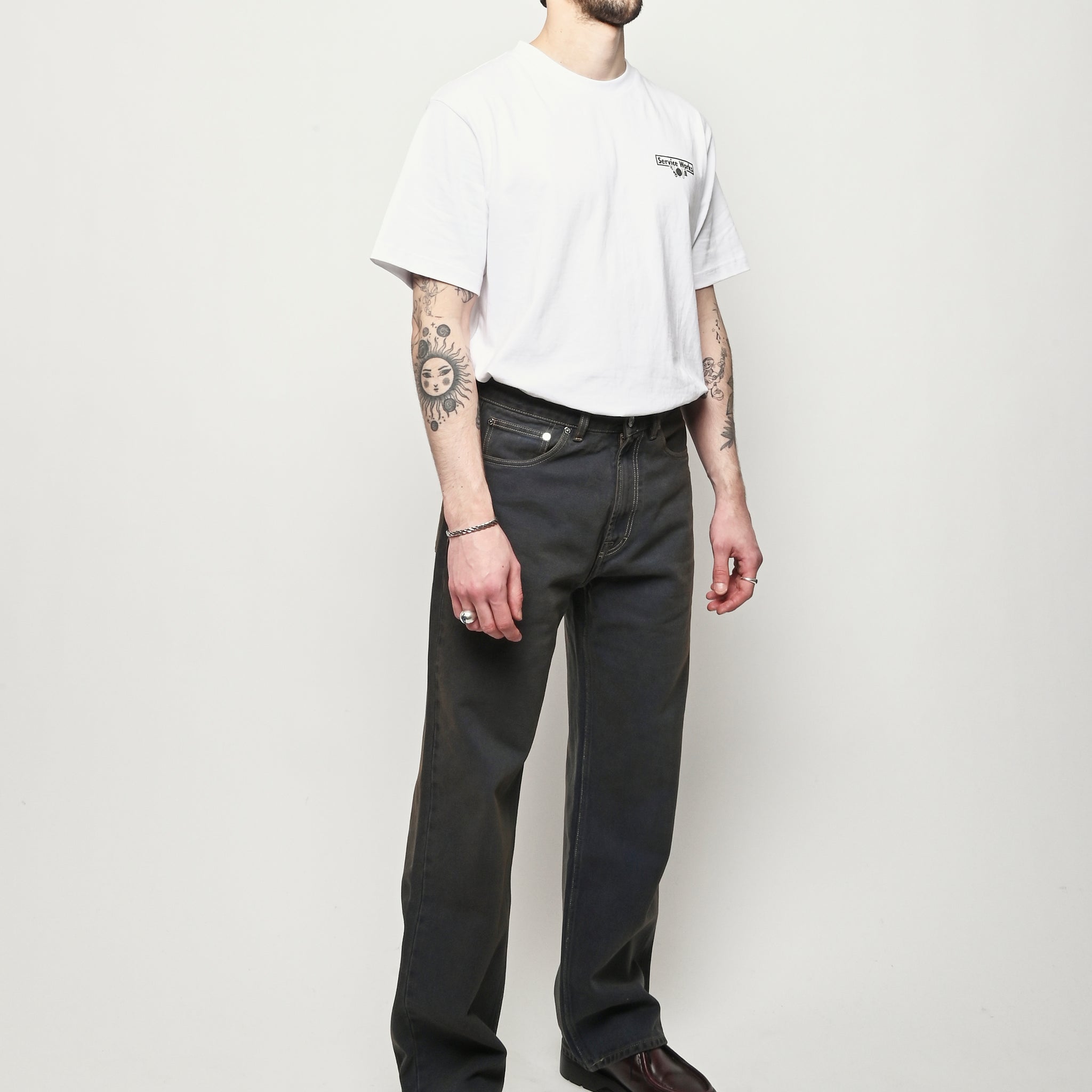 Our Legacy Third Cut in Dusty Phantom. Produced in Italian cotton fabric, the men's Third Cut has a relaxed fit with wide straight legs and features indigo dyeing, hand-distressed wash process, YKK zip fly, metal rivets, five pockets with reinforced back pockets, and the Our Legacy rubber patch. This fabric is crafted by overdyeing ecru material with indigo, using a newly invented, fully sustainable synthetic indigo. Following the overdyeing process, artisanal treatments and fades were applied, resulting in a distinctive dirty blue tone. The aesthetic draws inspiration from vintage, distressed, and almost antique workwear, yet reimagined with a contemporary, post-apocalyptic edge. This garment is manufactured using carefully sourced material with a unique treatment process that will give each garment an individual shade and appearance. This technique could result in some color bleed onto lighter garments or surfaces. The garment shall be shaped by its wearer and naturally distress over time to finish the design process.