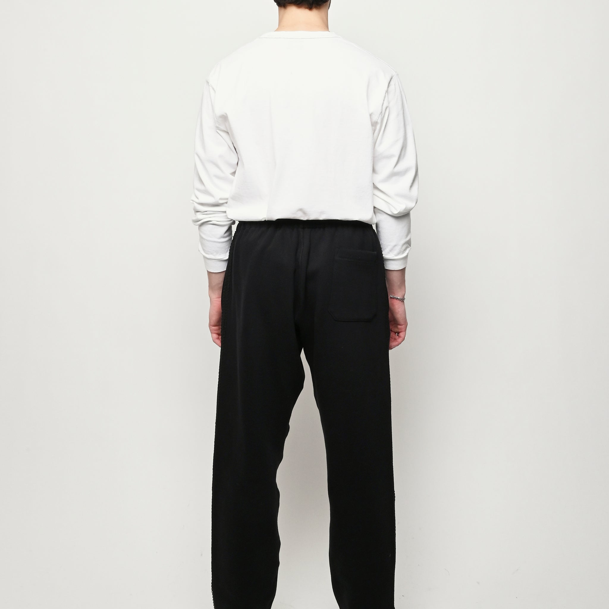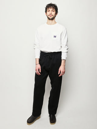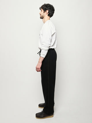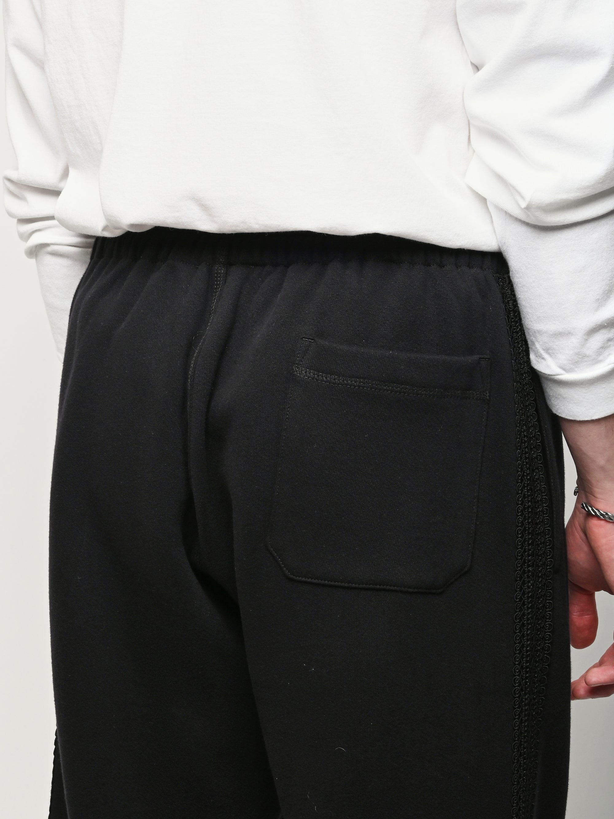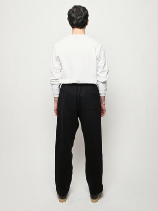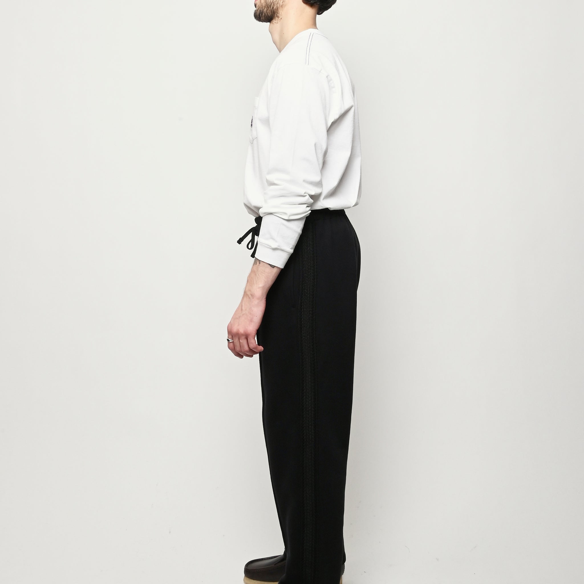 S.K. Manor Hill elastic waist pant w/ string tie, two side seam pockets, single right back patch pocket, pintuck stitch down center front of legs, w/ natural trim running on the outer seam.