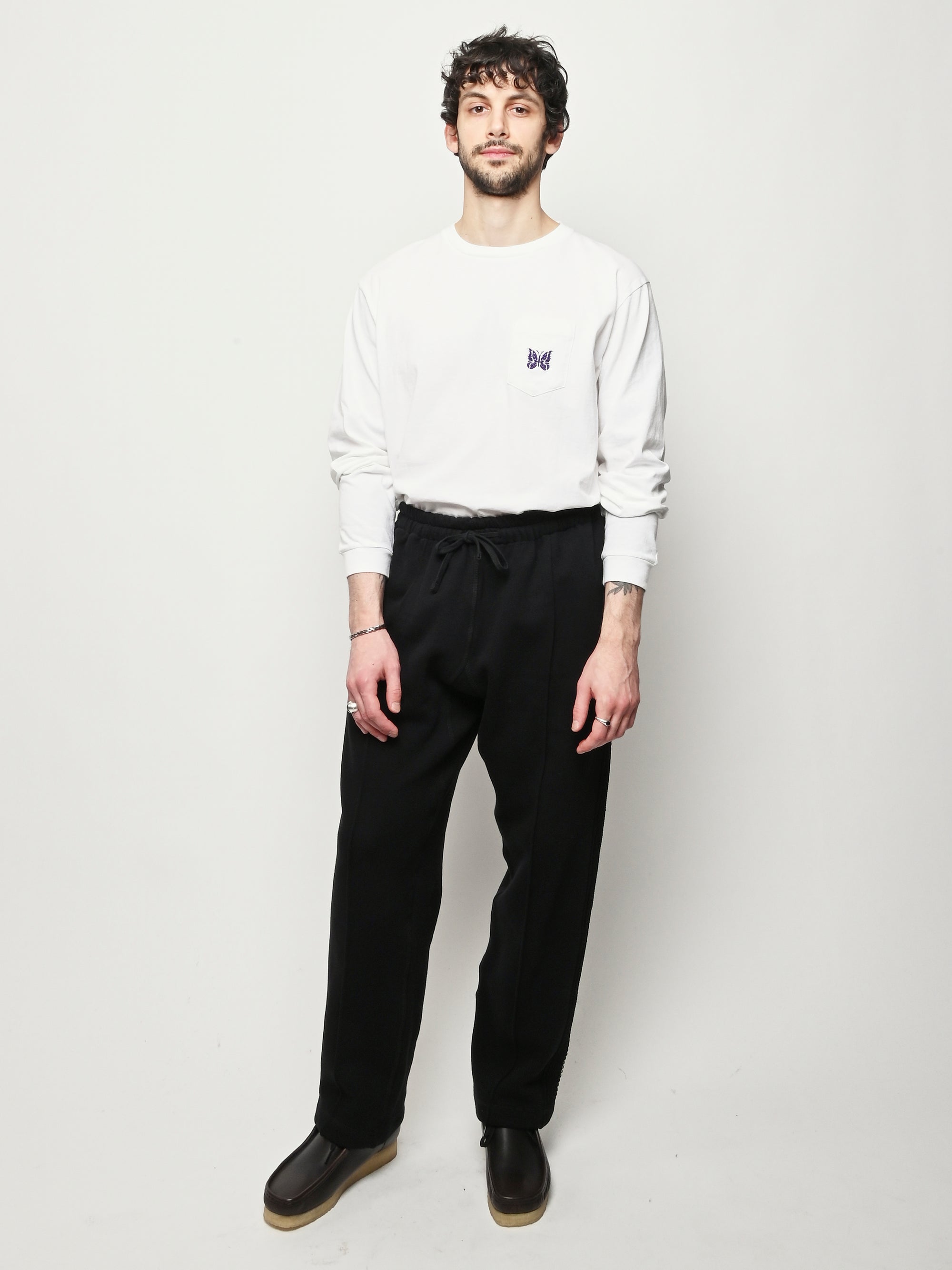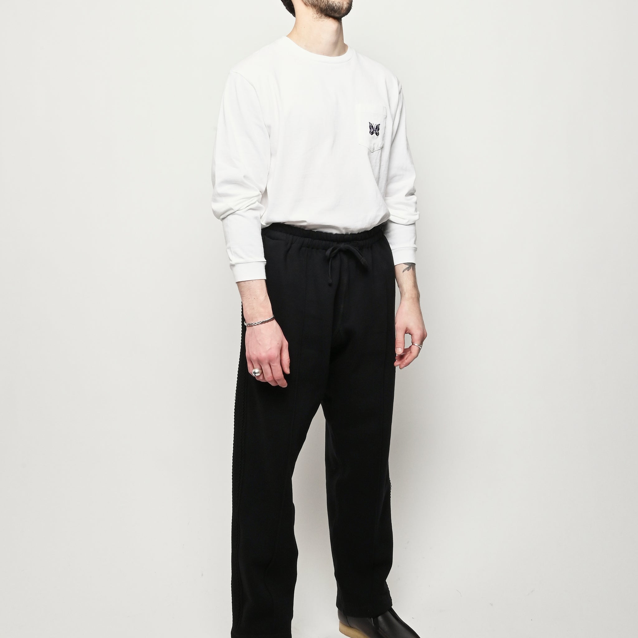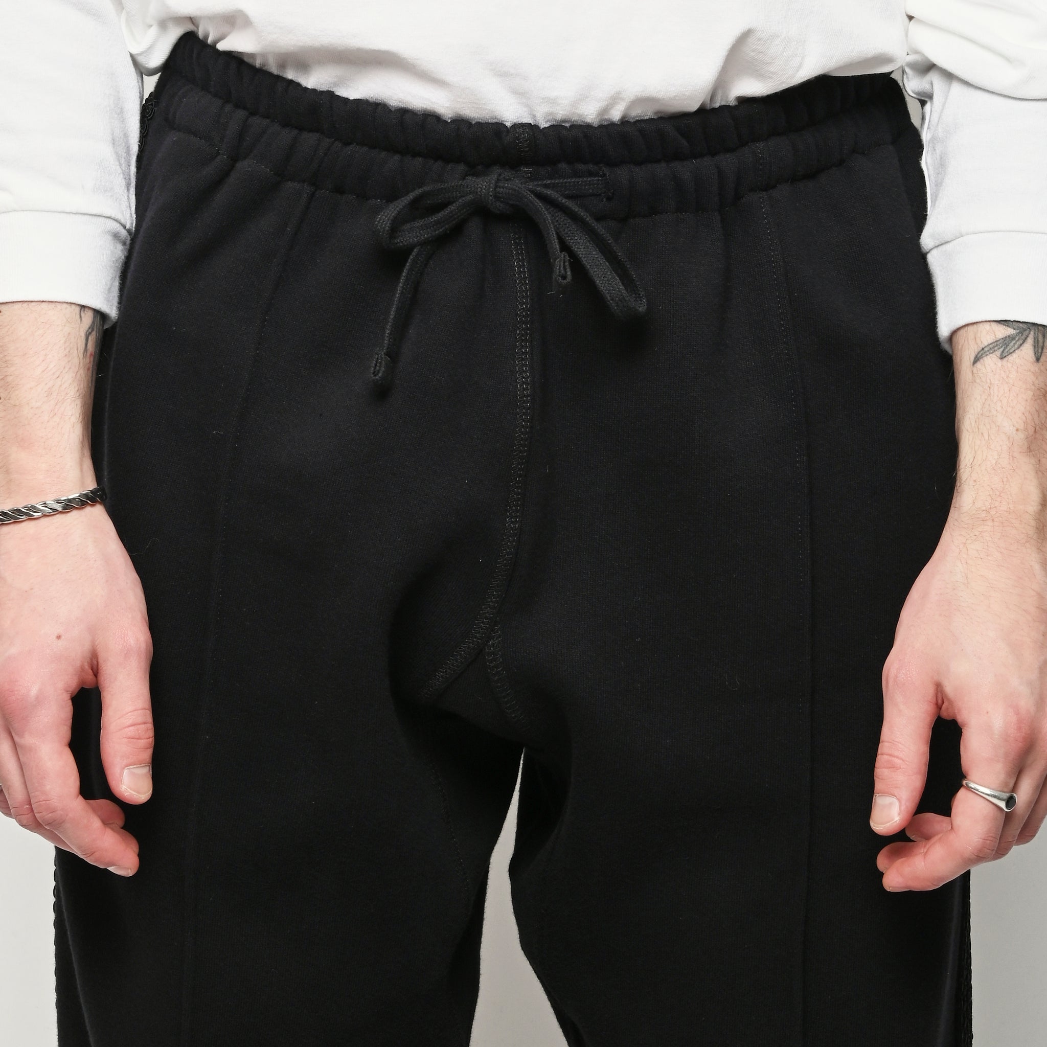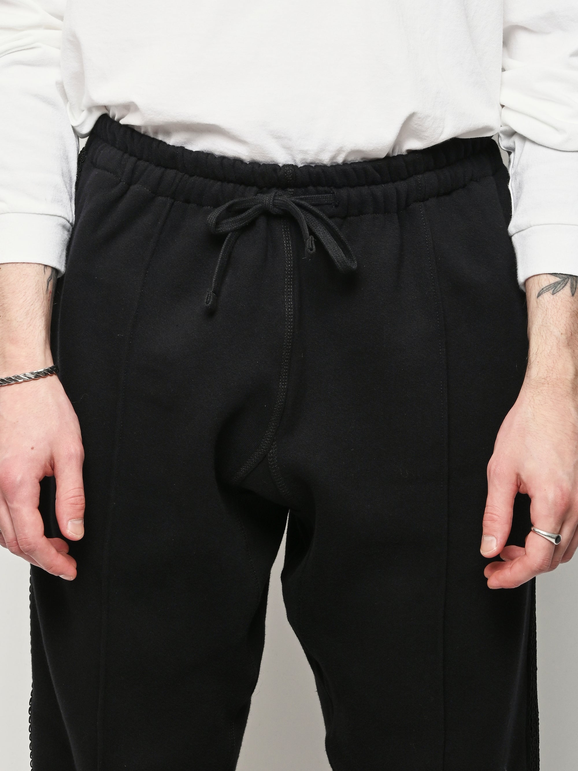 S.K. Manor Hill elastic waist pant w/ string tie, two side seam pockets, single right back patch pocket, pintuck stitch down center front of legs, w/ natural trim running on the outer seam.