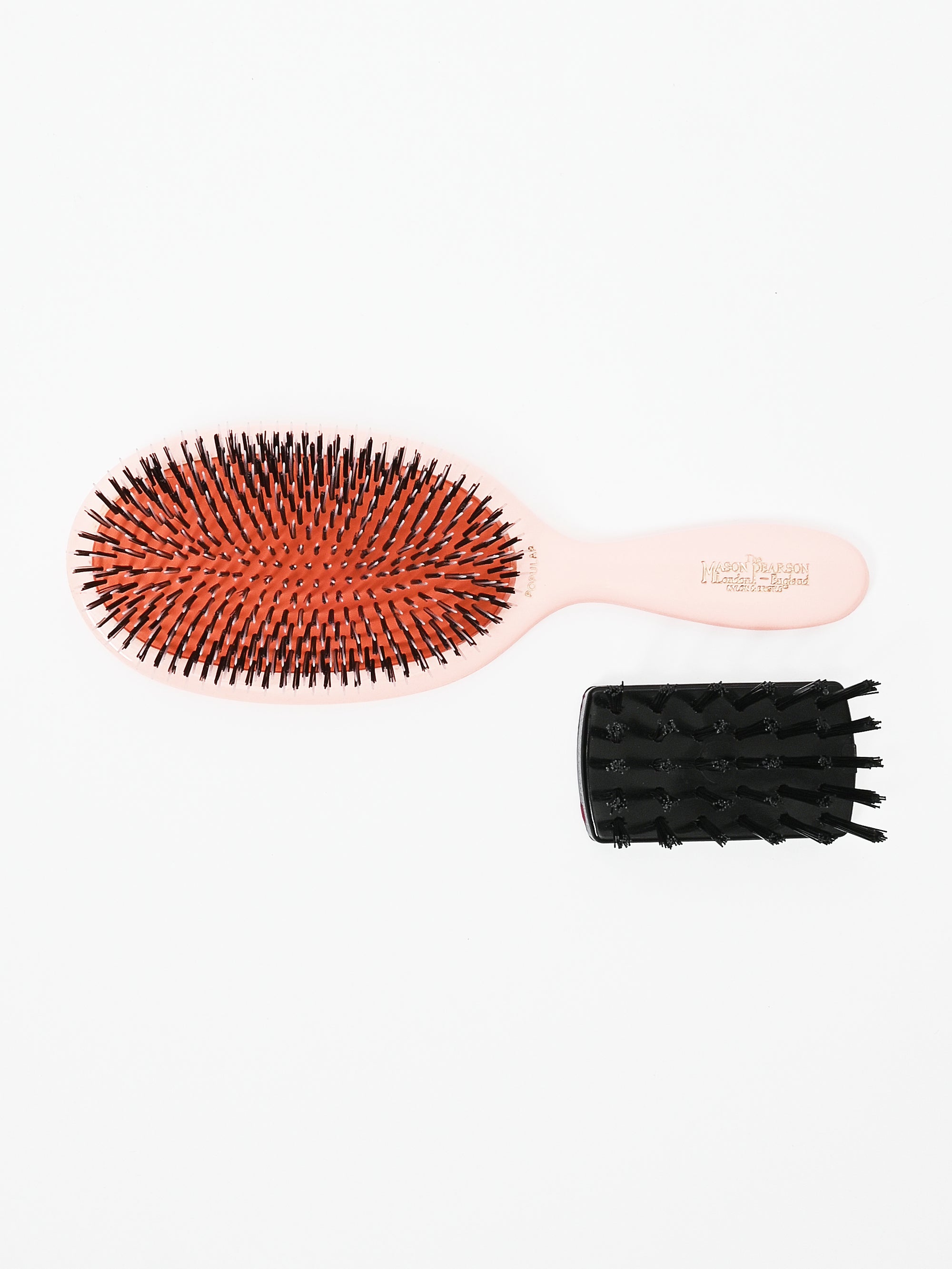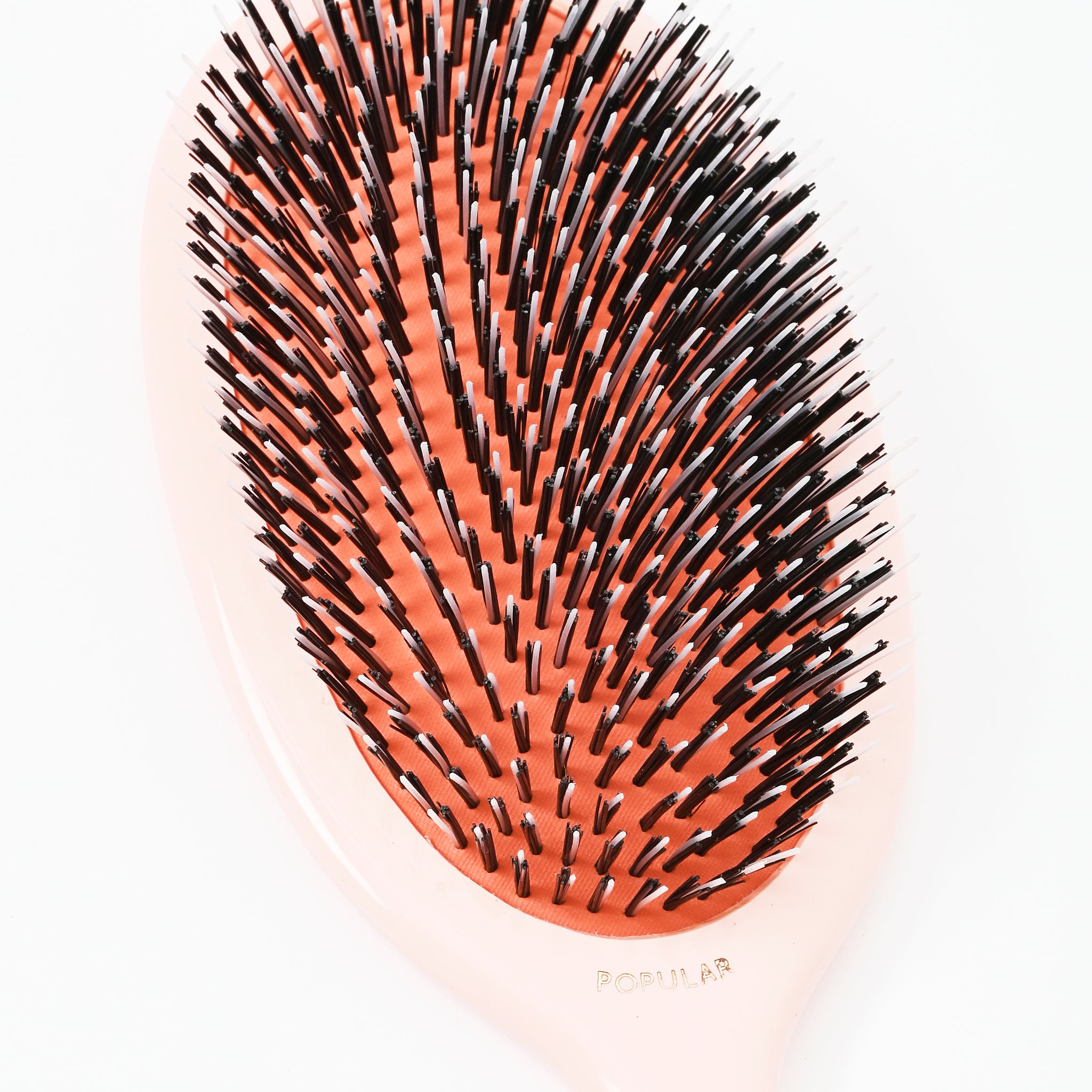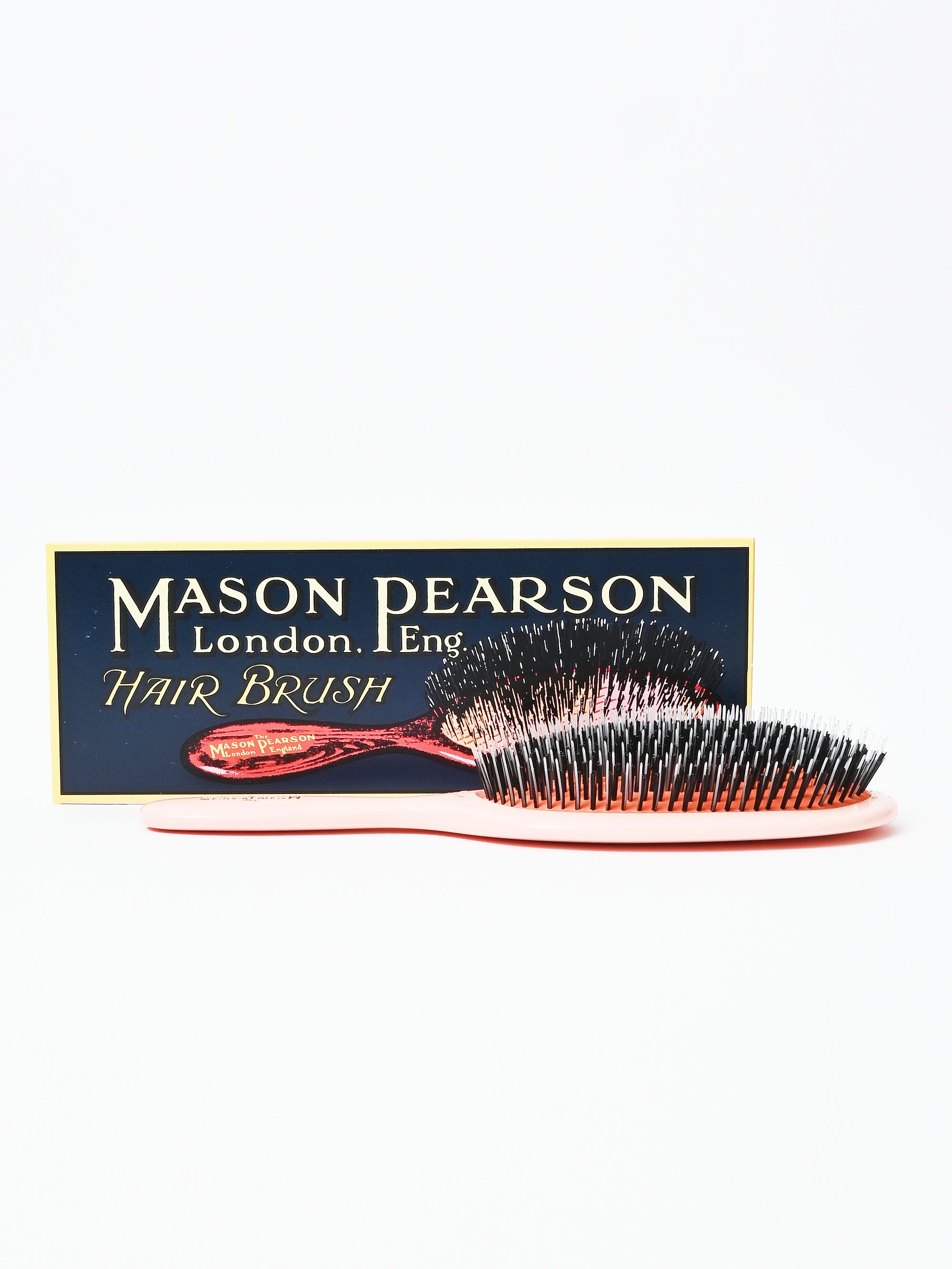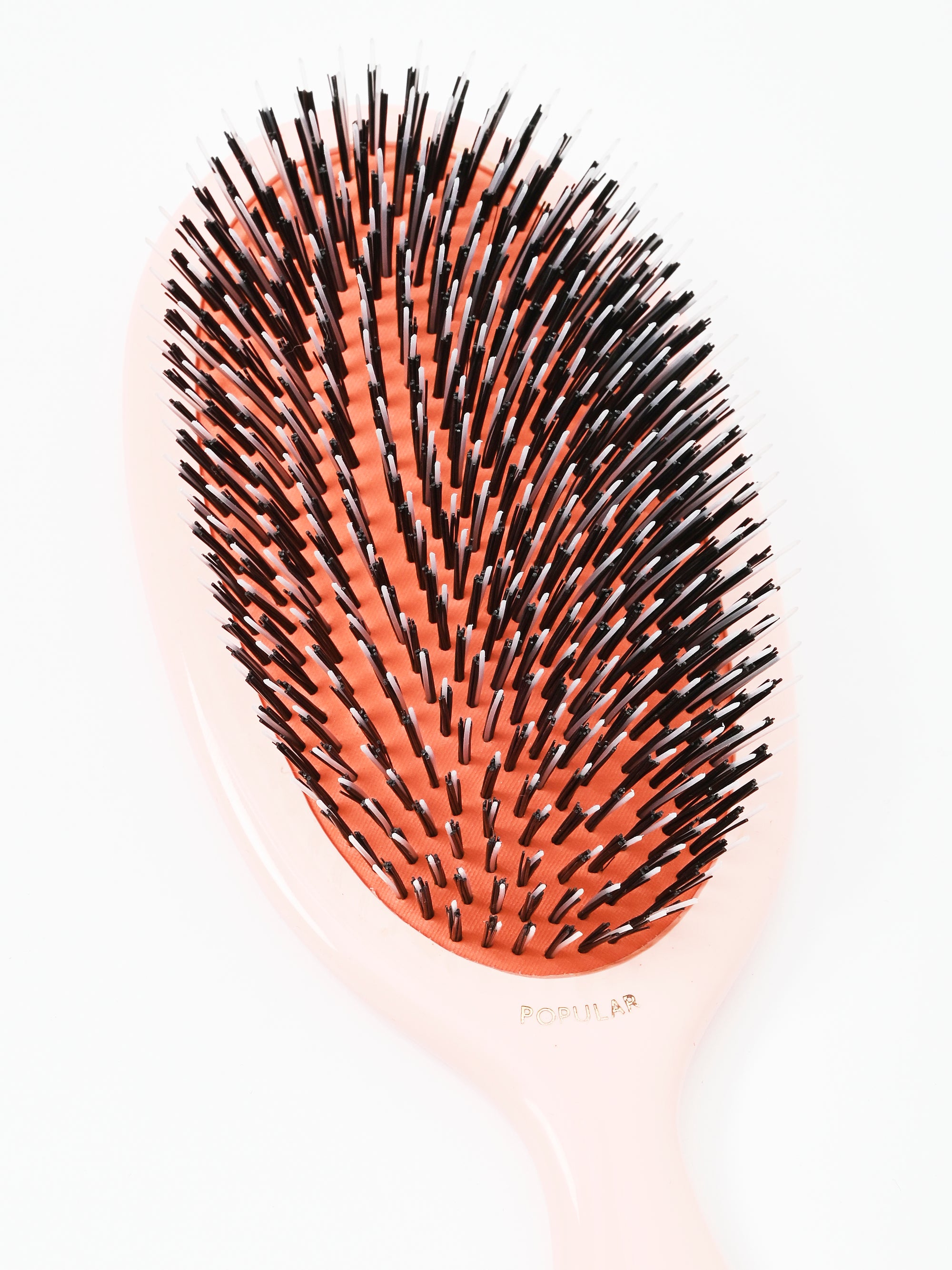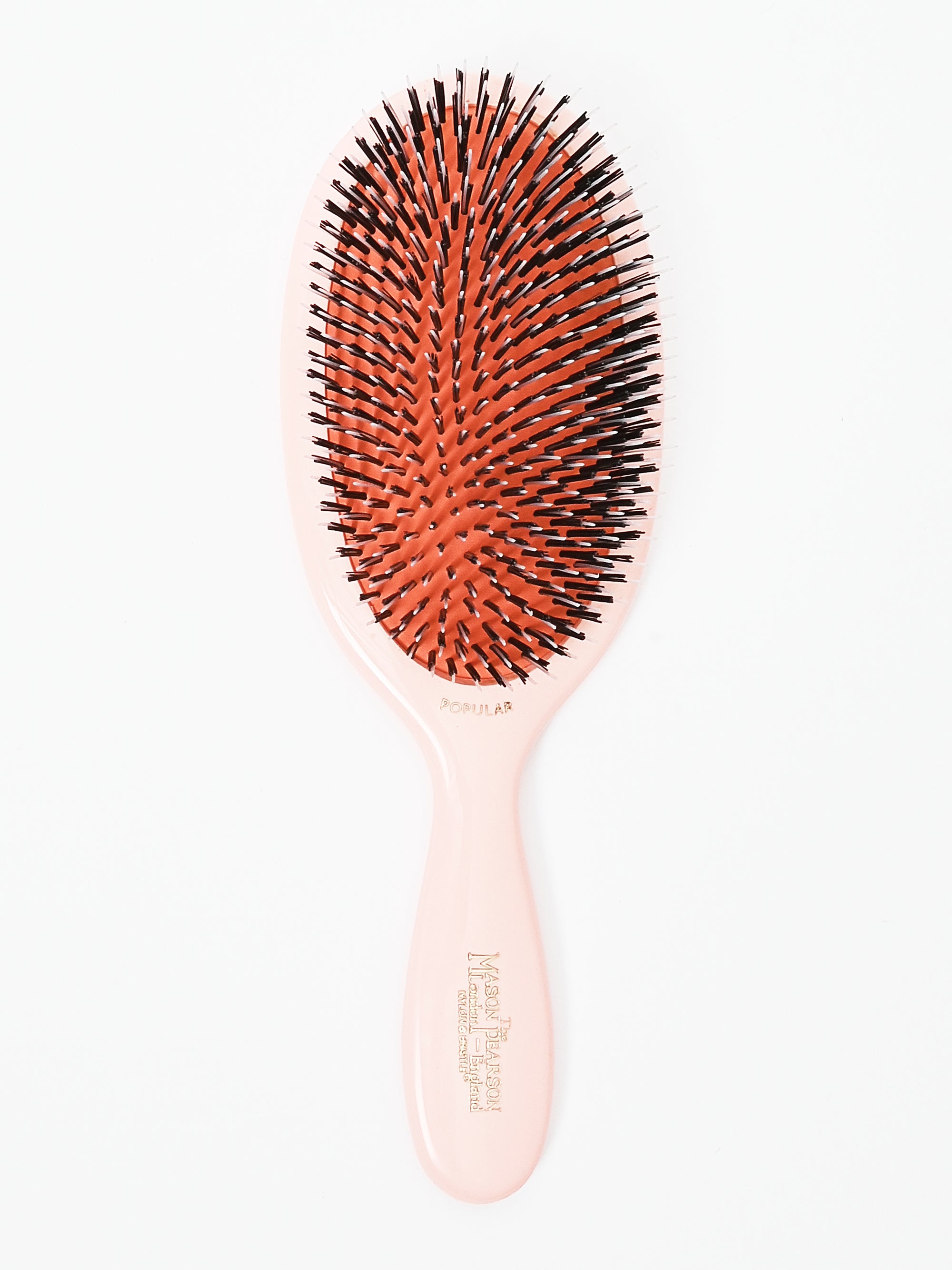 Brush the renowned Mason Pearson shine into your hair. This much-loved Popular Bristle and Nylon hairbrush combines boar bristles, to distribute natural oils, with hardy nylon tufts, to detangle hair, for a silky-smooth finish. The large hairbrush is ergonomically designed with eight rings of tufts, ideal for managing very long locks.